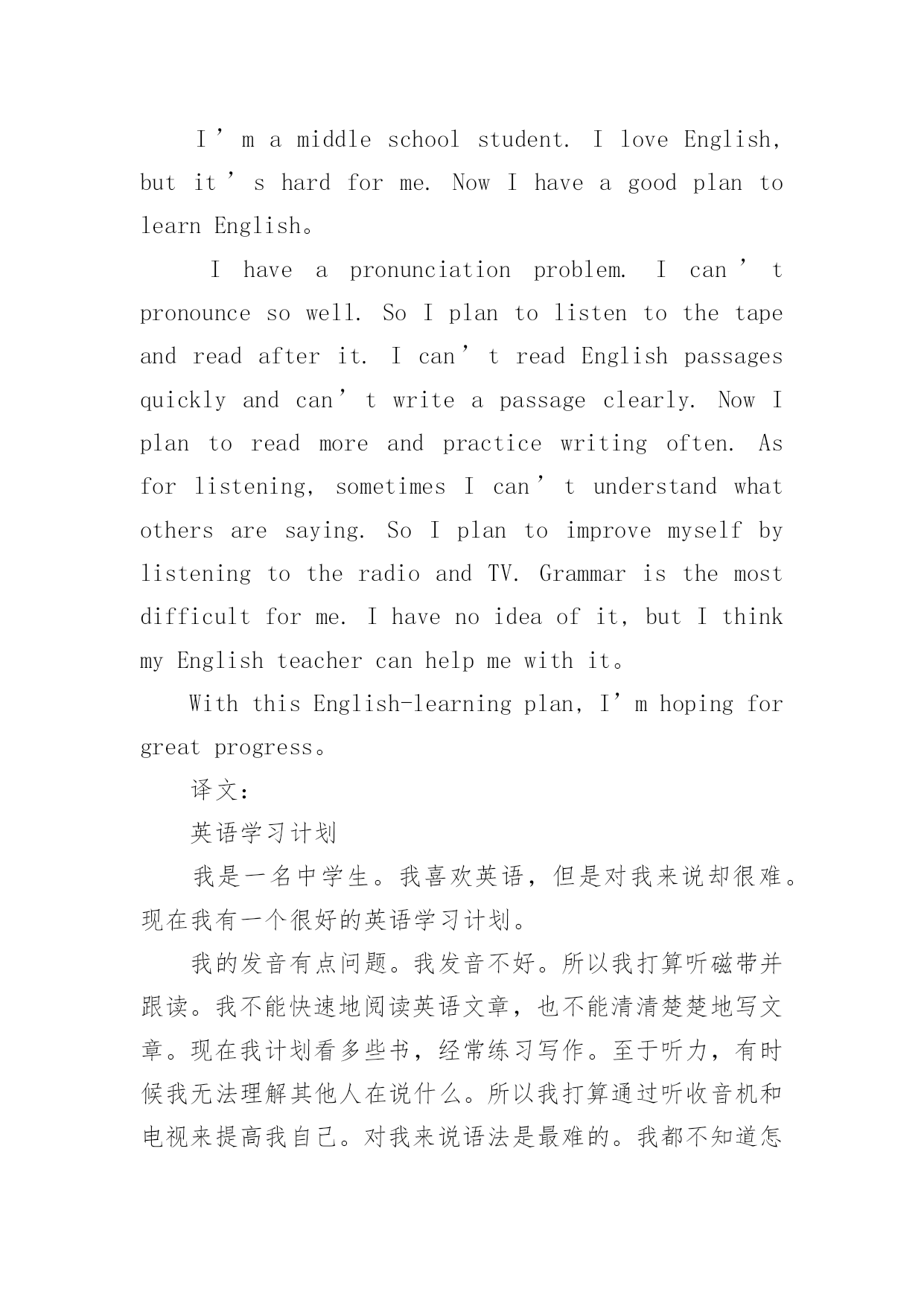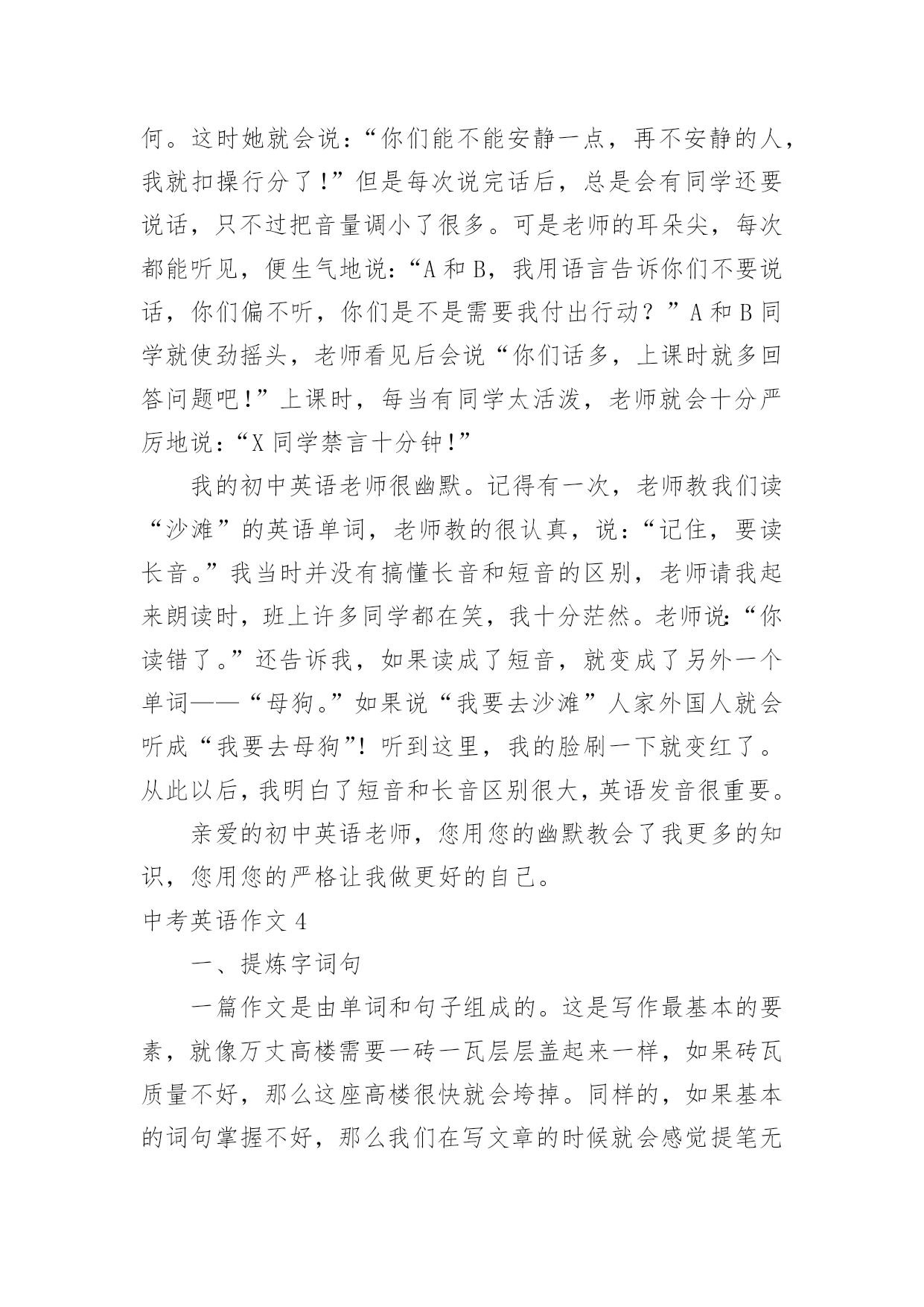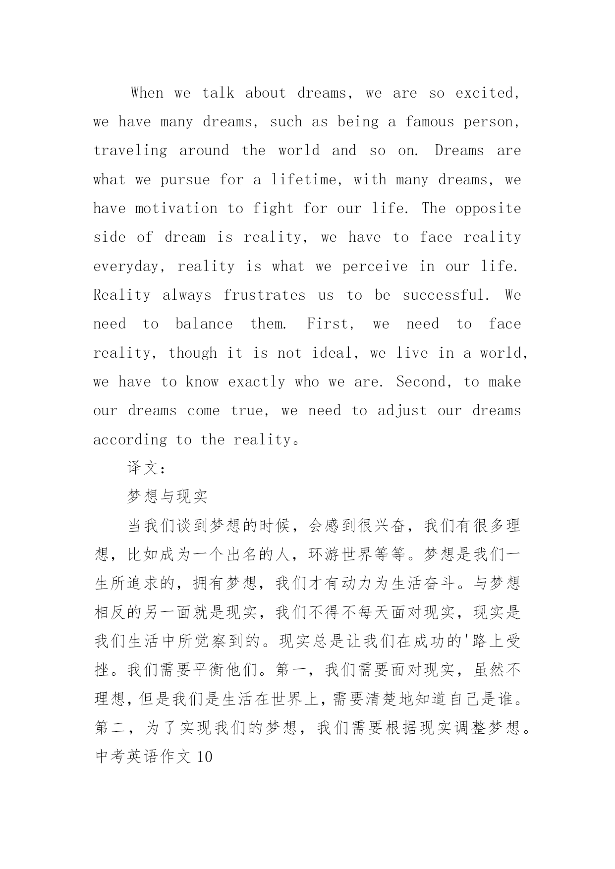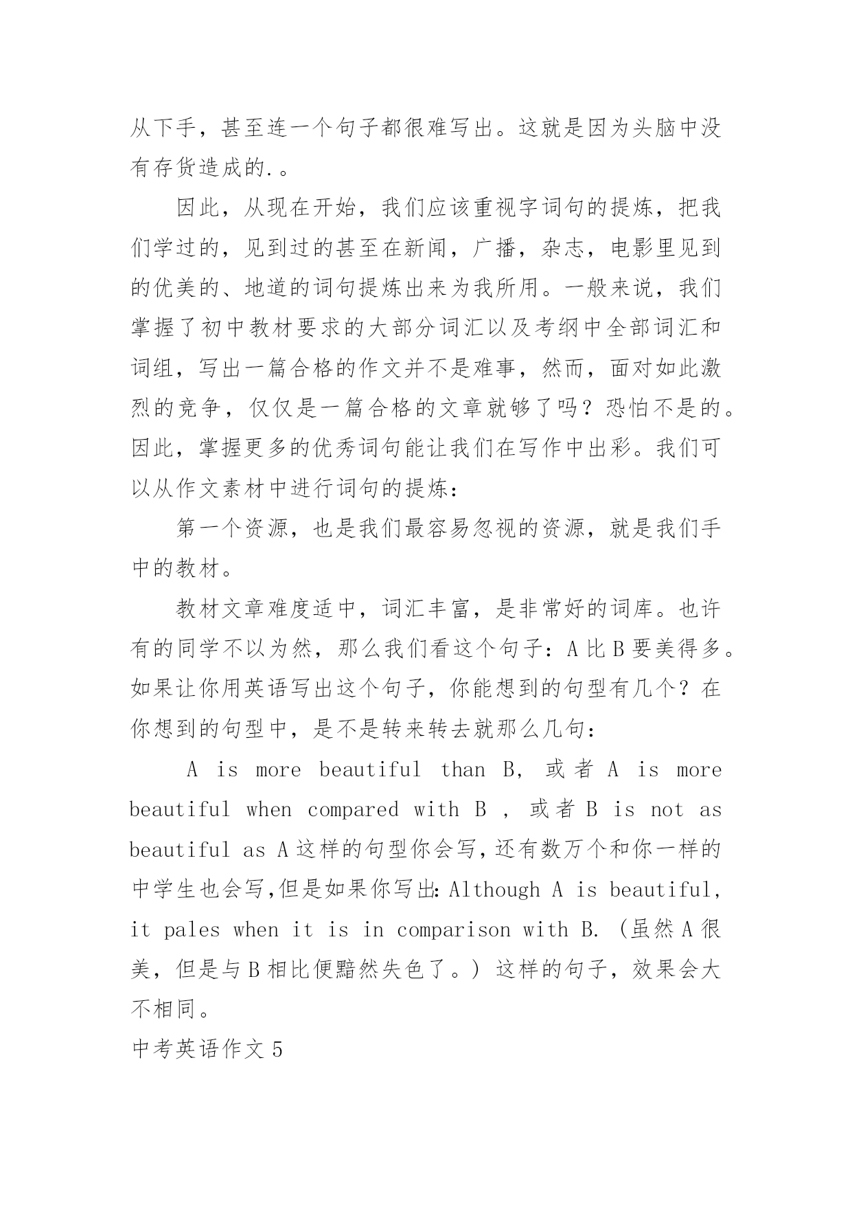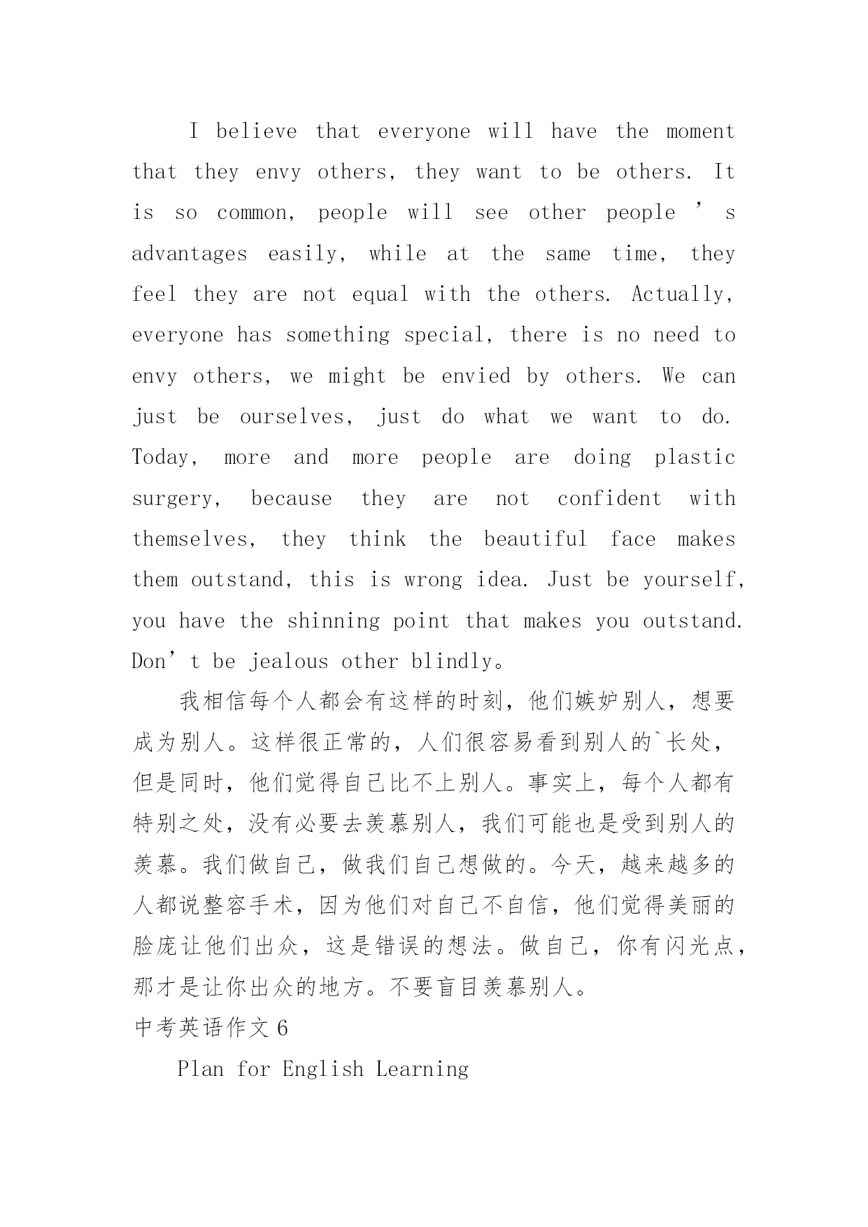 中考英语作文中考英语作文在学习、工作、生活中,大家都尝试过写作文吧,借助作文人们可以实现文化交流的目的。你写作文时总是无从下笔?下面是小编为大家收集的中考英语作文,仅供参考,希望能够帮助到大家。中考英语作文1命题作文就是我们依据所给题目,确定中心,选择材料,写出符合题意,内容表达具体、充分的文章。写命题作文通常要注意以下几点:一、审准题目:文章的中心要对题目的分析来确定,一定要弄清主题的内涵,确立与文章联系的主题思想,表达不能游离于主题,否则即使内容再精彩,也是跑题作文,得分将会大打折扣,因此,写命题作文最重要的是先审清题目,确立要表现的中心。二、构思结构:就是开放思路,启动联想,构想表现形式,勾勒出文章的结构层次,依次写出引言段,主题句,发展段和结尾句,努力使之新颖,别致。三、选择材料:这一点很重要,一定要围绕想表现的`中心去选择组织材料,所选的材料必须典型精要。四、表达:就是用最确切明了的语言贯穿材料,表达自己的思想,力争用符合英语语法规则。英语表达习惯,最顺畅自然的词,句,段去表达中心思想,与表现中心无关的话即使再生动形象也不要去写。就写作的目的表现形式来看,命题作文分为三种形式:1、记叙文类;2、说明文类;3、议论文类。下面就谈一谈记叙文的写作记叙文就是以记叙人物的经历或事物发展变化过程为主的一种文章。在初中写作训练中,记叙文是最基本,最常见,最重要的书面表达形式。记叙文有六要素即指时间,地点,人物和事件的起因,经过和结果。一篇记叙文只要把这些要素写清楚,文章就会内容具体,眉目清晰,中心意思明确。一般情况下,这六要素中的人物,时间,地点作为开端,要写在文章的开头。事件,原因常作为记叙文的段落发展,又称为文章的主体部分,应该放在文章的中间。结果作为记叙文的结局常放在文章的末尾处。中考英语作文2Hello,everyone!Thewholeworldisshortofenergy.Savingtheenergyisveryimportant.Asastudent,wecandoalotinourdailylife.Forexample,weshouldkeepthelightoffwhenwedon'tuseit.Weshouldtakeashowerinsteadofbathtosavewater.Don'tkeepthetaprunningwhenyouwashyourfaceorbrushyourteeth.Whenwegoshopping,wecantakeclothbagsinsteadofusingplasticbags.Manypeoplewriteononlyonesideoftheirpaper.Whynottryusingboth?Tosavetheenergy,weshouldalsoreducepollution.Recyclingoldnewspapers,glasses,cansandwastepaperisalsoagoodidea.Let'sworkhardtogethertosavetheenergy!你好,各位!整个世界能源短缺的。节约能源是非常重要的`。作为一名学生,我们可以做很多在我们的日常生活中。例如,我们应该关灯当我们不使用它。我们应该淋浴代替沐浴节约用水。不要让水龙头当你洗脸或刷牙。当我们去购物的时候,我们可以用布袋代替塑料袋。许多人只写在纸的一面。为什么不试着用这两个?节约能源,我们应该减少污染。回收旧报纸、眼镜、罐和废纸也是一个好主意。让我们一起努力节约能源!中考英语作文3在我的眼中,我的初中英语老师是一个穿梭于课堂之中幽默的化身。我的初中英语老师身材瘦小,一头卷发,头发上总是喜欢戴发夹。夏天,她喜欢穿休闲裙,下面往往搭配一双阿迪达斯的板鞋。我的.初中英语老师很严格。每当早读时,她一走进教室,我们便知道今天要听写英语单词了。我们拿本子的速度很慢,她就会说:“快点嘛!真的是,叫你们不把自己的听写本放好。”单词听写完后,我们总是要讨论自己听写得如何。这时她就会说:“你们能不能安静一点,再不安静的人,我就扣操行分了!”但是每次说完话后,总是会有同学还要说话,只不过把音量调小了很多。可是老师的耳朵尖,每次都能听见,便生气地说:“A和B,我用语言告诉你们不要说话,你们偏不听,你们是不是需要我付出行动?”A和B同学就使劲摇头,老师看见后会说“你们话多,上课时就多回答问题吧!”上课时,每当有同学太活泼,老师就会十分严厉地说:“X同学禁言十分钟!”我的初中英语老师很幽默。记得有一次,老师教我们读“沙滩”的英语单词,老师教的很认真,说:“记住,要读长音。”我当时并没有搞懂长音和短音的区别,老师请我起来朗读时,班上许多同学都在笑,我十分茫然。老师说:“你读错了。”还告诉我,如果读成了短音,