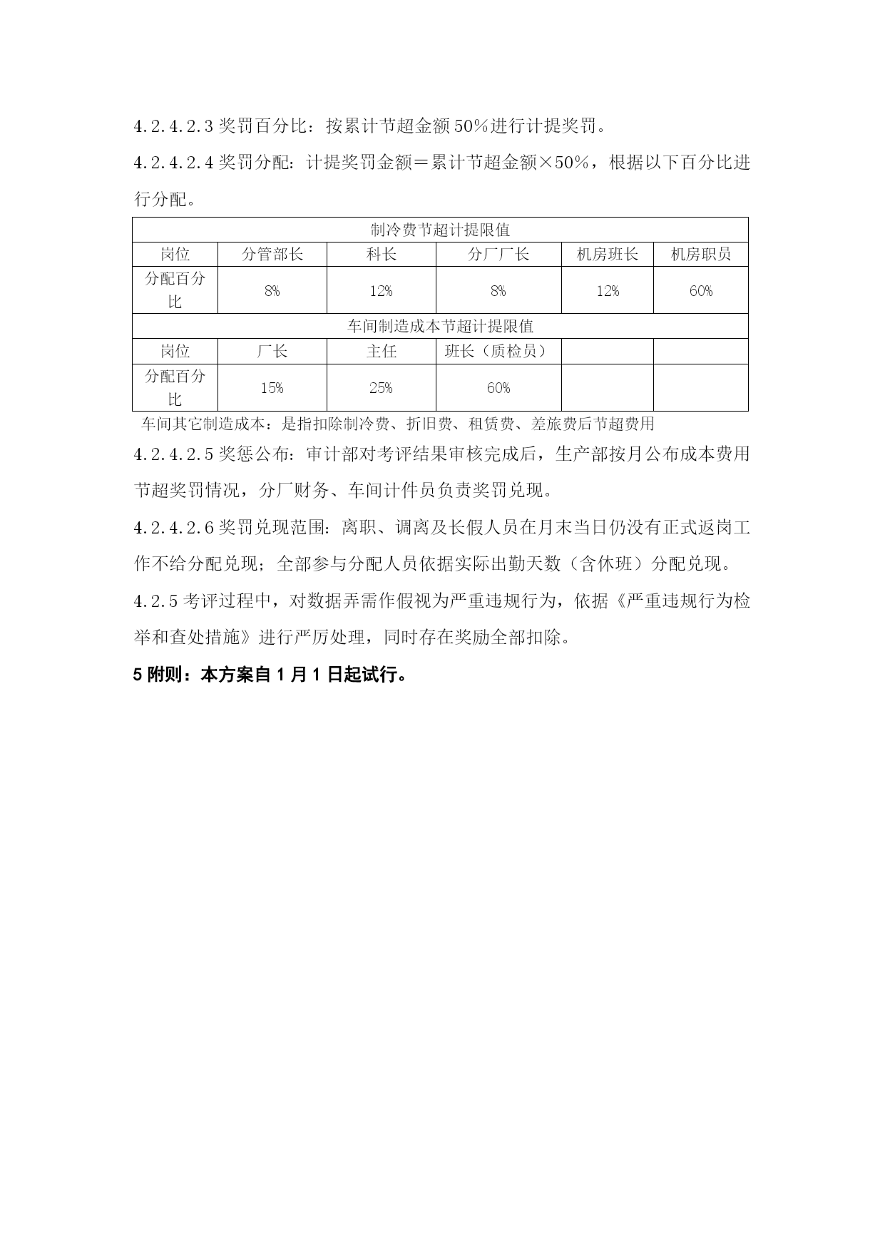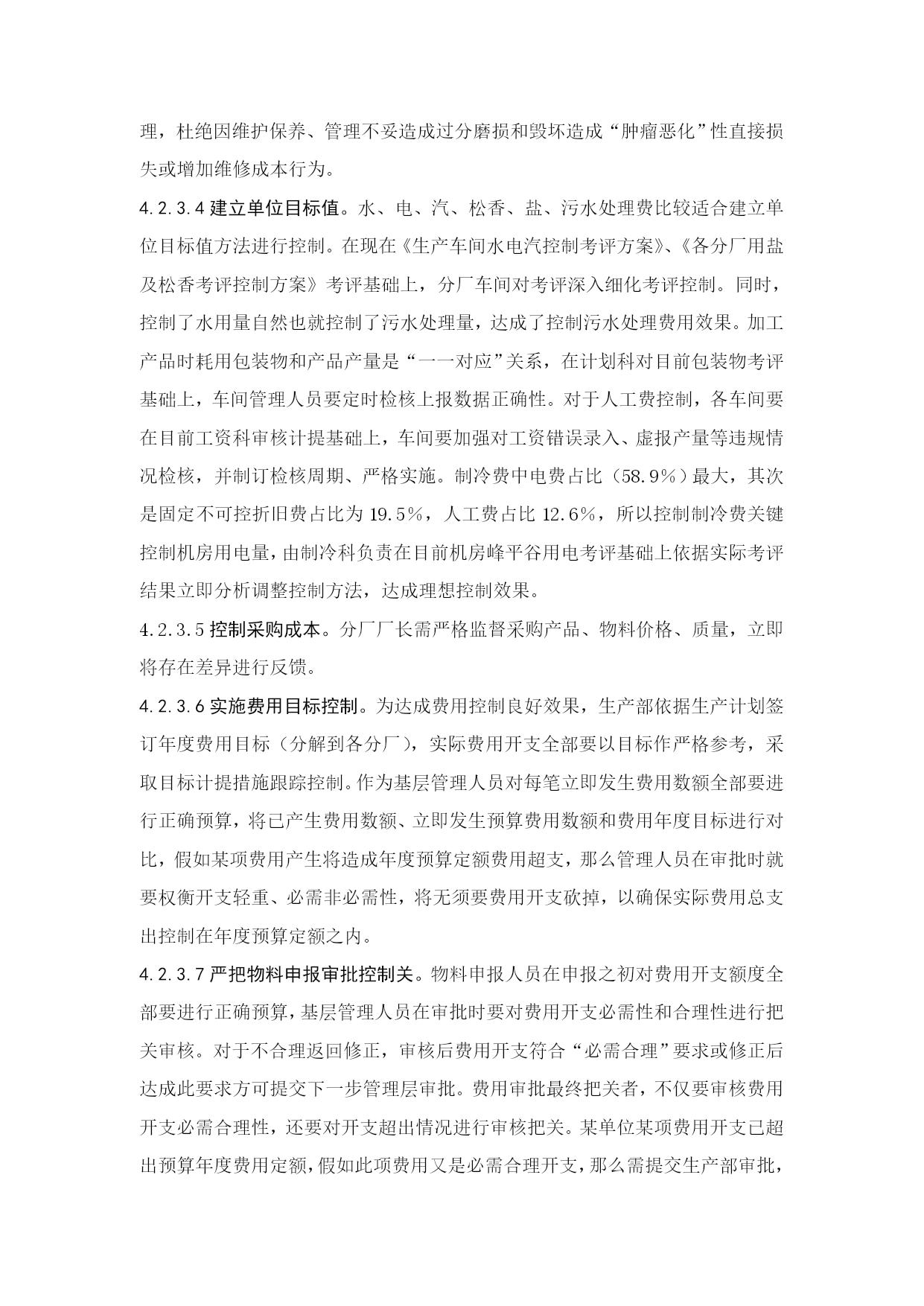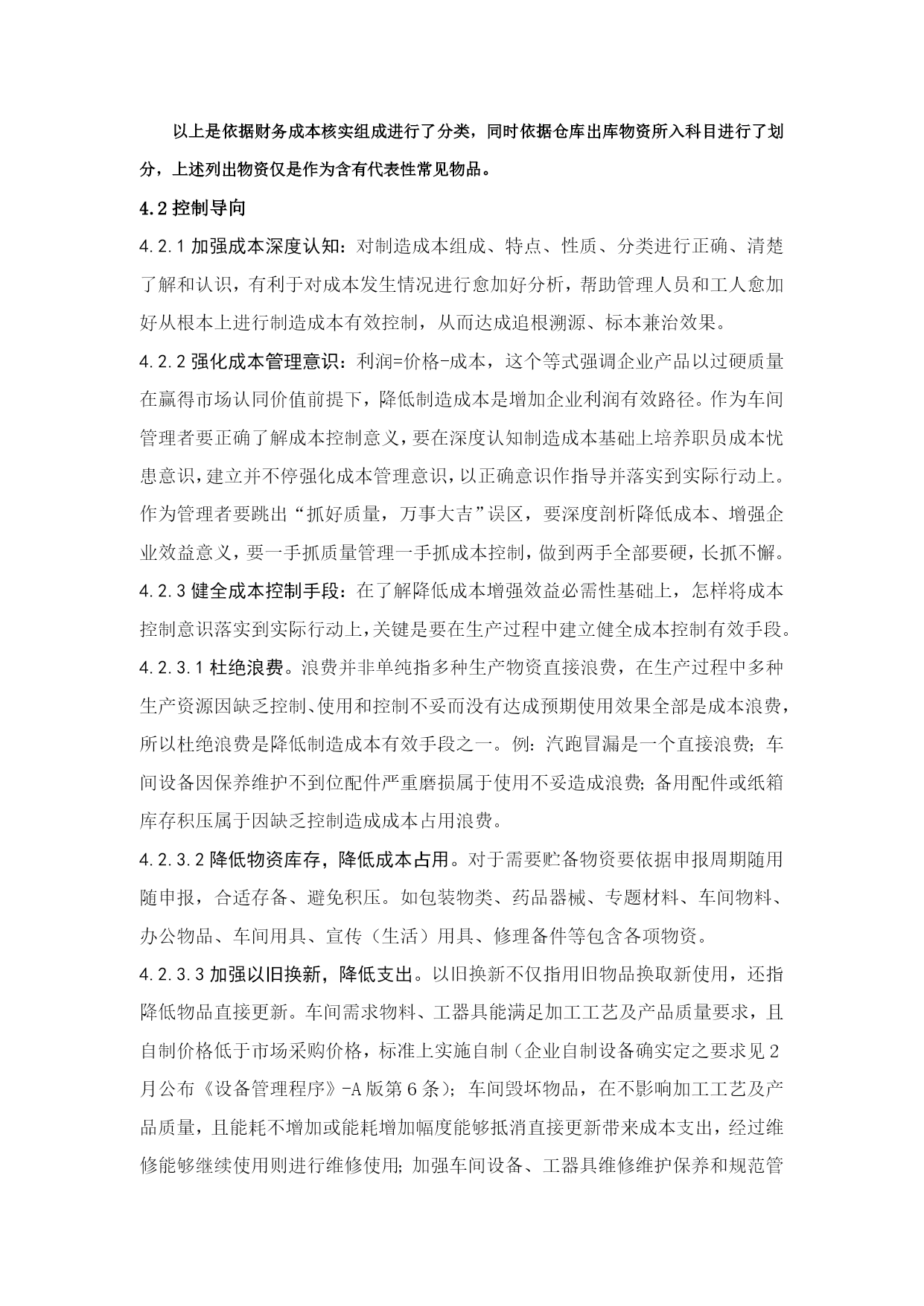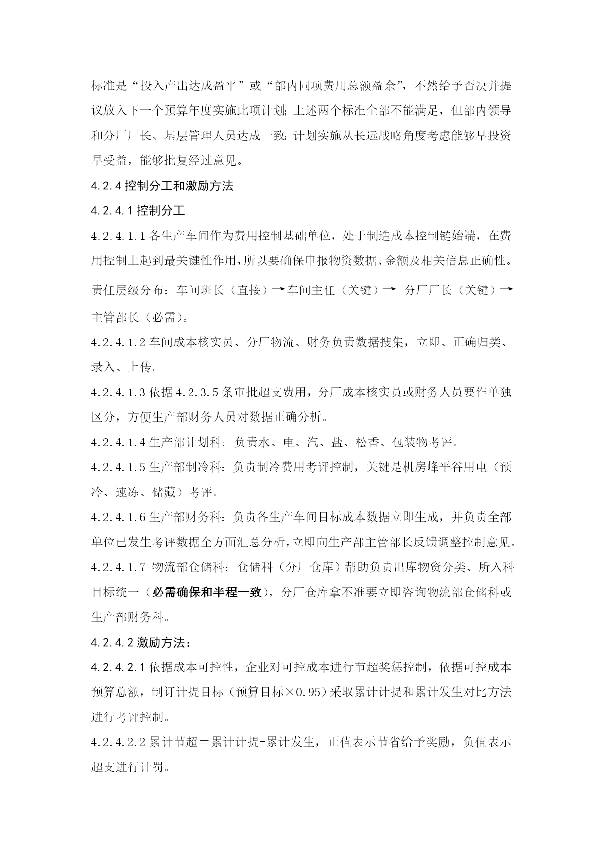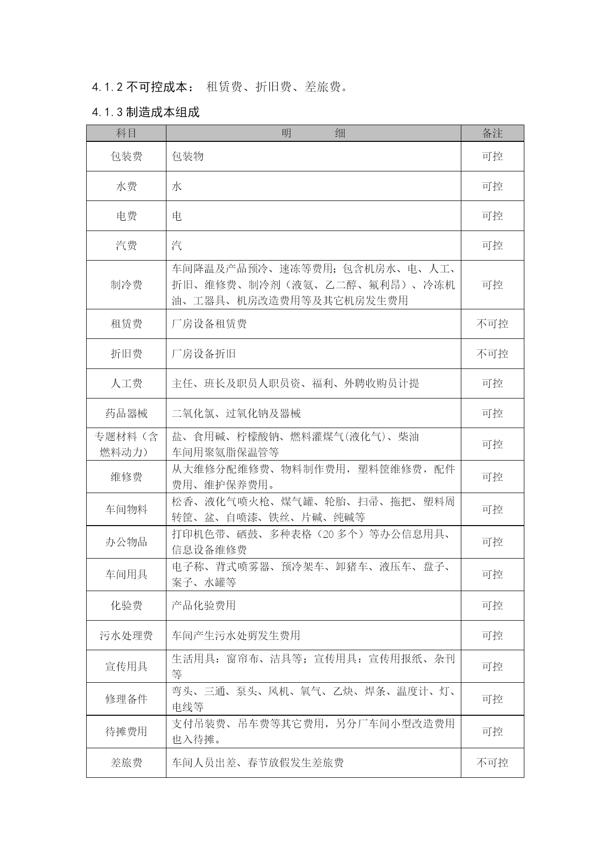 心愿食品加工车间制造成本控制方案1、目标强化管理人员及职员成本节省意识,提升车间整体管理水平,降低生产成本,提升产品竞争力。2、适用范围本方案适适用于各生产制品车间。3、职责3.1生产部负责方案制订、完善、修订。3.2各生产车间负责实施,并依据实际实施情况反馈合理意见。3.3生产部财务负责考评并进行数据汇总分析,调整制订有效控制方案。3.4审计部负责审核考评结果真实性、正确性,并将审核情况反馈生产部,生产部负责对违规行为进行处理。4、内容4.1制造成本:依据生产车间制造成本可控性,分为可控成本和不可控成本。4.1.1可控成本:包装费、水、电、汽、制冷费、人工费、药品器械、专题材料、维修费、车间物料、办公物品、车间用具、化验费、污水处理费、宣传(生活)用具、修理备件、待摊费用。4.1.2不可控成本:租赁费、折旧费、差旅费。4.1.3制造成本组成科目明细备注包装费包装物可控水费水可控电费电可控汽费汽可控制冷费车间降温及产品预冷、速冻等费用;包含机房水、电、人工、折旧、维修费、制冷剂(液氨、乙二醇、氟利昂)、冷冻机油、工器具、机房改造费用等及其它机房发生费用可控租赁费厂房设备租赁费不可控折旧费厂房设备折旧不可控人工费主任、班长及职员人职员资、福利、外聘收购员计提可控药品器械二氧化氯、过氧化钠及器械可控专题材料(含燃料动力)盐、食用碱、柠檬酸钠、燃料灌煤气(液化气)、柴油车间用聚氨脂保温管等可控维修费从大维修分配维修费、物料制作费用,塑料筐维修费,配件费用、维护保养费用。可控车间物料松香、液化气喷火枪、煤气罐、轮胎、扫帚、拖把、塑料周转筐、盆、自喷漆、铁丝、片碱、纯碱等可控办公物品打印机色带、硒鼓、多种表格(20多个)等办公信息用具、信息设备维修费可控车间用具电子称、背式喷雾器、预冷架车、卸猪车、液压车、盘子、案子、水罐等可控化验费产品化验费用可控污水处理费车间产生污水处剪发生费用可控宣传用具生活用具:窗帘布、洁具等;宣传用具:宣传用报纸、杂刊等可控修理备件弯头、三通、泵头、风机、氧气、乙炔、焊条、温度计、灯、电线等可控待摊费用支付吊装费、吊车费等其它费用,另分厂车间小型改造费用也入待摊。可控差旅费车间人员出差、春节放假发生差旅费不可控以上是依据财务成本核实组成进行了分类,同时依据仓库出库物资所入科目进行了划分,上述列出物资仅是作为含有代表性常见物品。4.2控制导向4.2.1加强成本深度认知:对制造成本组成、特点、性质、分类进行正确、清楚了解和认识,有利于对成本发生情况进行愈加好分析,帮助管理人员和工人愈加好从根本上进行制造成本有效控制,从而达成追根溯源、标本兼治效果。4.2.2强化成本管理意识:利润=价格-成本,这个等式强调企业产品以过硬质量在赢得市场认同价值前提下,降低制造成本是增加企业利润有效路径。作为车间管理者要正确了解成本控制意义,要在深度认知制造成本基础上培养职员成本忧患意识,建立并不停强化成本管理意识,以正确意识作指导并落实到实际行动上。作为管理者要跳出“抓好质量,万事大吉”误区,要深度剖析降低成本、增强企业效益意义,要一手抓质量管理一手抓成本控制,做到两手全部要硬,长抓不懈。4.2.3健全成本控制手段:在了解降低成本增强效益必需性基础上,怎样将成本控制意识落实到实际行动上,关键是要在生产过程中建立健全成本控制有效手段。4.2.3.1杜绝浪费。浪费并非单纯指多种生产物资直接浪费,在生产过程中多种生产资源因缺乏控制、使用和控制不妥而没有达成预期使用效果全部是成本浪费,所以杜绝浪费是降低制造成本有效手段之一。例:汽跑冒漏是一个直接浪费;车间设备因保养维护不到位配件严重磨损属于使用不妥造成浪费;备用配件或纸箱库存积压属于因缺乏控制造成成本占用浪费。4.2.3.2降低物资库存,降低成本占用。对于需要贮备物资要依据申报周期随用随申报,合适存备、避免积压。如包装物类、药品器械、专题材料、车间物料、办公物品、车间用具、宣传(生活)用具、修理备件等包含各项物资。4.2.3.3加强以旧换新,降低支出。以旧换新不仅指用旧物品换取新使用,还指降低物品直接更新。车间需求物料、工器具能满足加工工艺及产品质量要求,且自制价格低于市场采购价格,标准上实施自制(企业自制设备确实定之要求见2月公布《设备管理程序》-A版第6条);车间毁坏物品,在不影响加工工艺及产品质量,且能耗不增加或能耗增加幅度能够抵消直接更新带来成本支出,经过维修能够继续使用则进行维修使用;加强车间设备、工器具维修维护保养和规范管理,杜绝因维护保养、管理不妥造成过分磨损和毁坏造成“肿瘤恶化”性直接损失或增加维修成本行为。4.2.3.4建立单位目标值。水、电、汽、松香、盐、污水处理费比较适合建立单位目标值方法进行控制。在现在《生产车