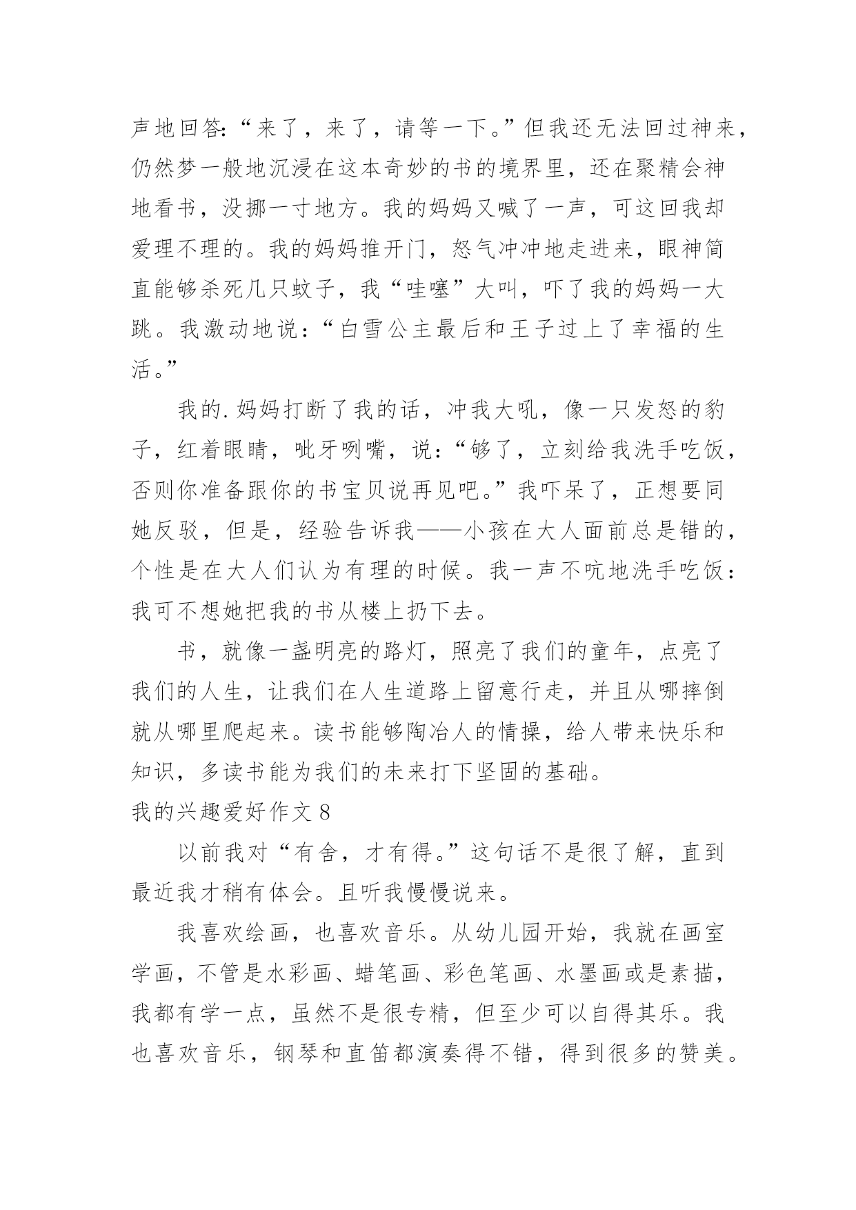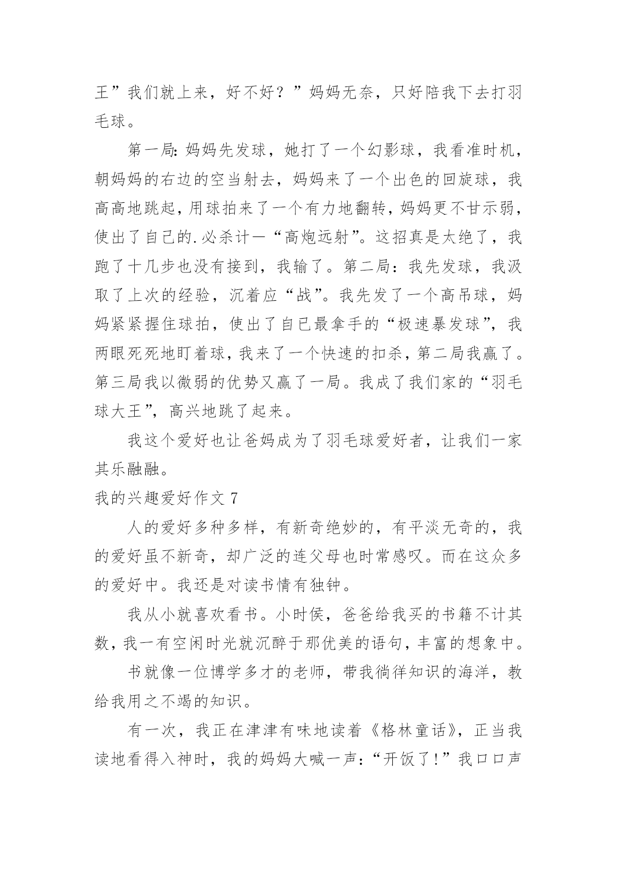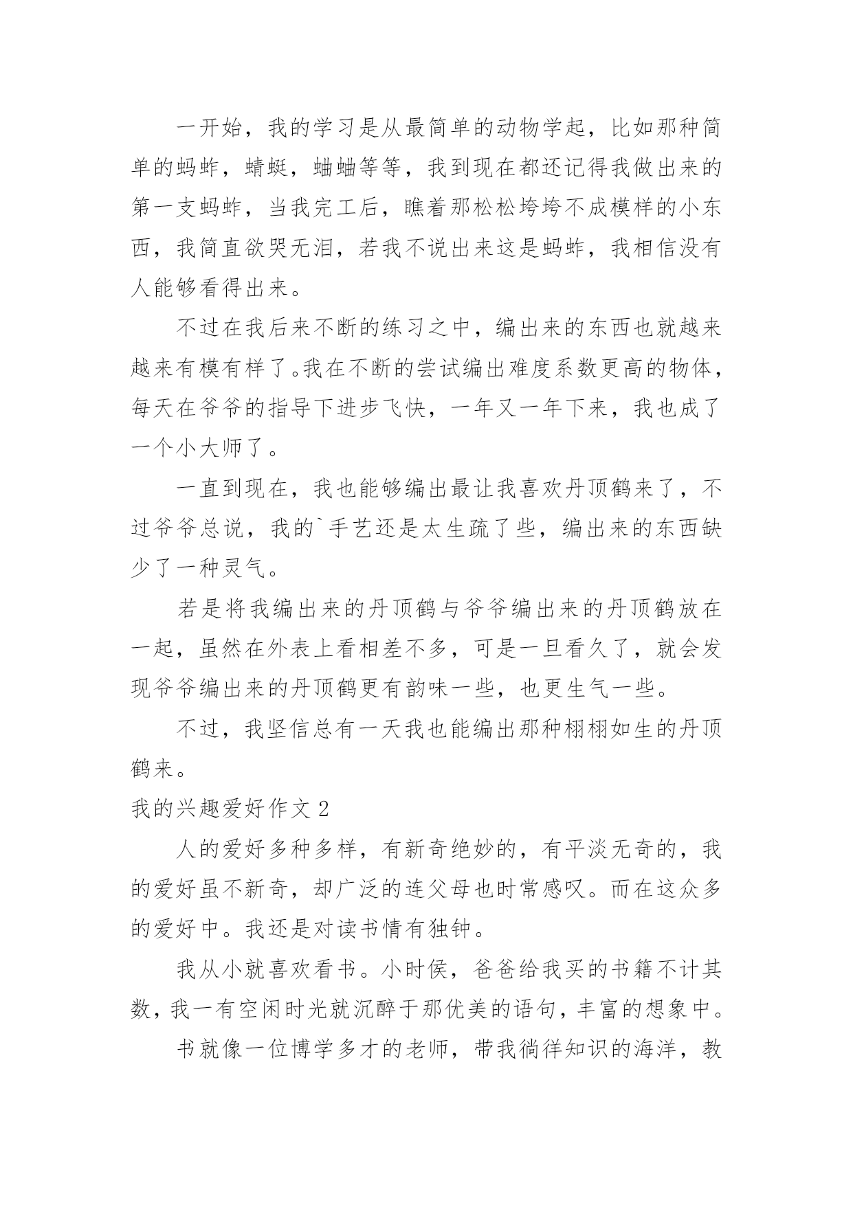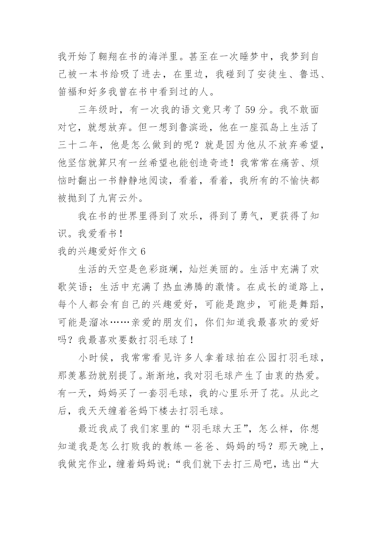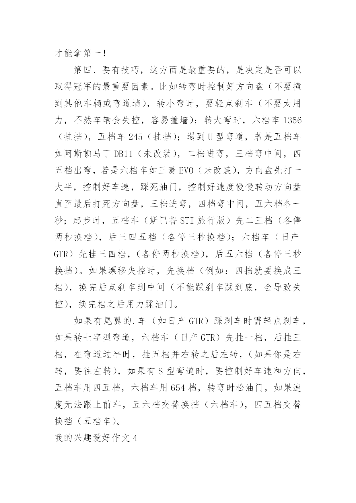 我的兴趣爱好作文(荐)我的兴趣爱好作文15篇在现实生活或工作学习中,大家都不可避免地要接触到作文吧,借助作文可以宣泄心中的情感,调节自己的心情。如何写一篇有思想、有文采的作文呢?以下是小编为大家整理的我的兴趣爱好作文,供大家参考借鉴,希望可以帮助到有需要的朋友。我的兴趣爱好作文1我的兴趣爱好与大多数人都不同,我不说出来肯定没人猜得到,因为这可是一种少见的民间手艺,那就是棕编。我喜欢棕编主要是受到了爷爷的影响,爷爷是一个棕编大师。我从小就跟在爷爷身后,时不时的就会去自家的园地采棕叶,爷爷是一个棕编高手,什么模样的棕编都不在话下,我经常瞧着爷爷的手艺,每天里都佩服得五体投地。爷爷的棕编里面编得最好的是丹顶鹤,它纹理分明的翅膀,用细钢丝支撑着的修长双腿,丹顶鹤的颜色是褪去了棕叶褐绿色的白色,这种白色并不纯粹,还带上一点点淡黄。丹顶鹤看起来栩栩如生,就像要展翅起飞了一般。自从小时候亲眼见着爷爷用棕叶将一只只丹顶鹤编出来后,我就对棕编这种手艺充满着兴趣,打从那时候起就一直囔囔着要爷爷教我。一开始,我的学习是从最简单的动物学起,比如那种简单的蚂蚱,蜻蜓,蛐蛐等等,我到现在都还记得我做出来的第一支蚂蚱,当我完工后,瞧着那松松垮垮不成模样的小东西,我简直欲哭无泪,若我不说出来这是蚂蚱,我相信没有人能够看得出来。不过在我后来不断的练习之中,编出来的东西也就越来越来有模有样了。我在不断的尝试编出难度系数更高的物体,每天在爷爷的指导下进步飞快,一年又一年下来,我也成了一个小大师了。一直到现在,我也能够编出最让我喜欢丹顶鹤来了,不过爷爷总说,我的`手艺还是太生疏了些,编出来的东西缺少了一种灵气。若是将我编出来的丹顶鹤与爷爷编出来的丹顶鹤放在一起,虽然在外表上看相差不多,可是一旦看久了,就会发现爷爷编出来的丹顶鹤更有韵味一些,也更生气一些。不过,我坚信总有一天我也能编出那种栩栩如生的丹顶鹤来。我的兴趣爱好作文2人的爱好多种多样,有新奇绝妙的,有平淡无奇的,我的爱好虽不新奇,却广泛的连父母也时常感叹。而在这众多的爱好中。我还是对读书情有独钟。我从小就喜欢看书。小时侯,爸爸给我买的书籍不计其数,我一有空闲时光就沉醉于那优美的语句,丰富的想象中。书就像一位博学多才的老师,带我徜徉知识的海洋,教给我用之不竭的知识。有一次,我正在津津有味地读着《格林童话》,正当我读地看得入神时,妈妈大喊一声:“开饭了!”我口口声声地回答:“来了,来了,请等一下。”但我还无法回过神来,仍然梦一般地沉浸在这本奇妙的书的境界里,还在聚精会神地看书,没挪一寸地方。妈妈又喊了一声,可这回我却爱理不理的。妈妈推开门,怒气冲冲地走进来,眼神简直能够杀死几只蚊子,我“哇噻”大叫,吓了妈妈一大跳。我激动地说:“白雪公主最后和王子过上了幸福的生活。。。。。。”妈妈打断了我的'话,冲我大吼,像一只发怒的豹子,红着眼睛,呲牙咧嘴,说:“够了,立刻给我洗手吃饭,否则你准备跟你的书宝贝说再见吧。”我吓呆了,正想要同她反驳,但是,经验告诉我——小孩在大人面前总是错的,个性是在大人们认为有理的时候。我一声不吭地洗手吃饭:我可不想她把我的书从楼上扔下去。书,就像一盏明亮的路灯,照亮了我们的童年,点亮了我们的人生,让我们在人生道路上留意行走,并且从哪摔倒就从哪里爬起来。读书能够陶冶人的情操,给人带来快乐和知识,多读书能为我们的未来打下坚固的基础。我的兴趣爱好作文3第一、兴趣是促使我能全身心投入,会去思考和研究。第二、多练习,从中不断总结经验,一次次比赛中,吸取教训。也有和高手讨论技巧,这些都让我不断进步!第三、要有足够经验才能打败对手,还有足够的自信,才能拿第一!第四、要有技巧,这方面是最重要的,是决定是否可以取得冠军的最重要因素。比如转弯时控制好方向盘(不要撞到其他车辆或弯道墙),转小弯时,要轻点刹车(不要太用力,不然车辆会失控,容易撞墙);转大弯时,六档车1356(挂挡),五档车245(挂挡);遇到U型弯道,若是五档车如阿斯顿马丁DB11(未改装),二档进弯,三档弯中间,四五档出弯,若是六档车如三菱EVO(未改装),方向盘先打一大半,控制好车速,踩死油门,控制好速度慢慢转动方向盘直至最后打死方向盘,三档进弯,四档弯中间,五六档各一秒;起步时,五档车(斯巴鲁STI旅行版)先二三档(各停两秒换档),后三四五档(各停三秒换档);六档车(日产GTR)先挂三四档,(各停两秒换档),后五六档(各停三秒换挡)。如果漂移失控时,先换档(例如:四挡就要换成三档),换完后点刹车到中间(不能踩刹车踩到底,会导致失控),换完档之后用力踩油门。如果有尾翼的.车(如日产GTR)踩刹车时需轻点刹车,如果转七字型弯道,六档车(日产GTR)先挂一档,后挂三档,在弯道过半时,挂五档并右转之后左转,(如果你是右转,要往左转),如果有S型弯道时