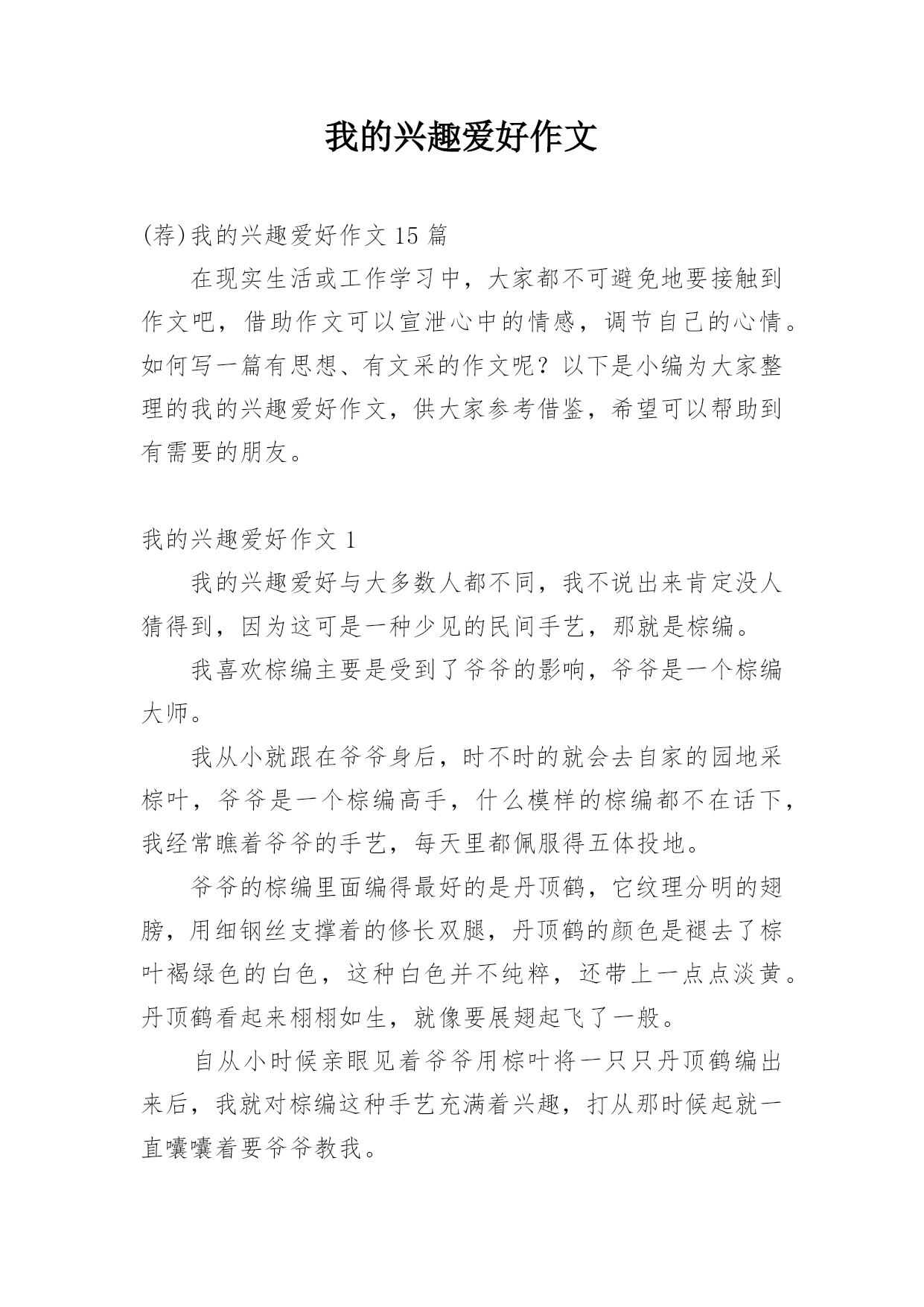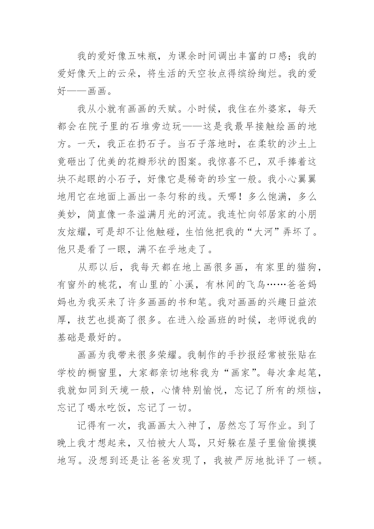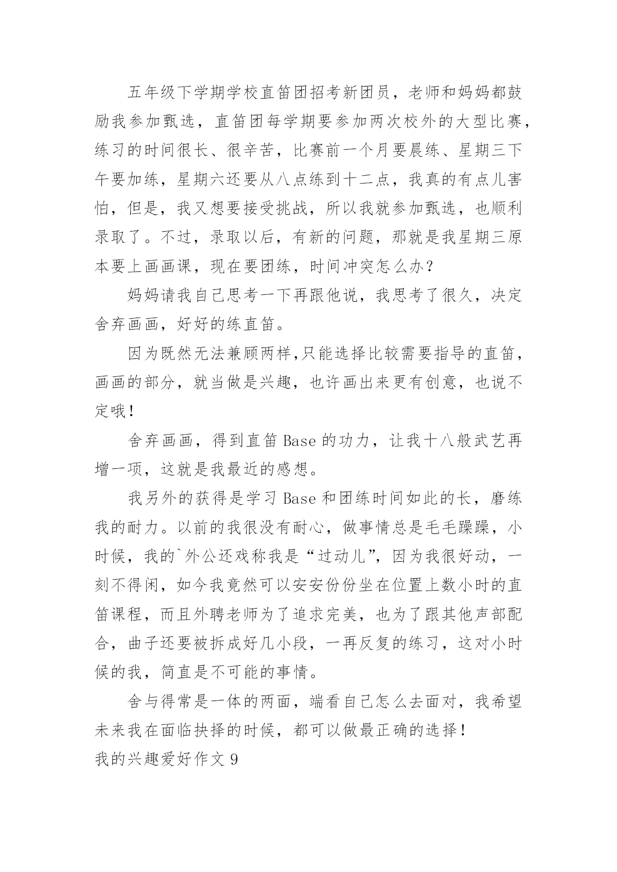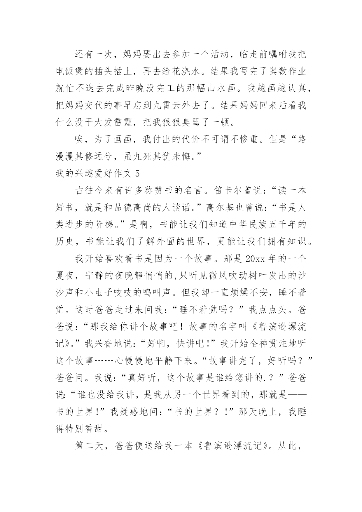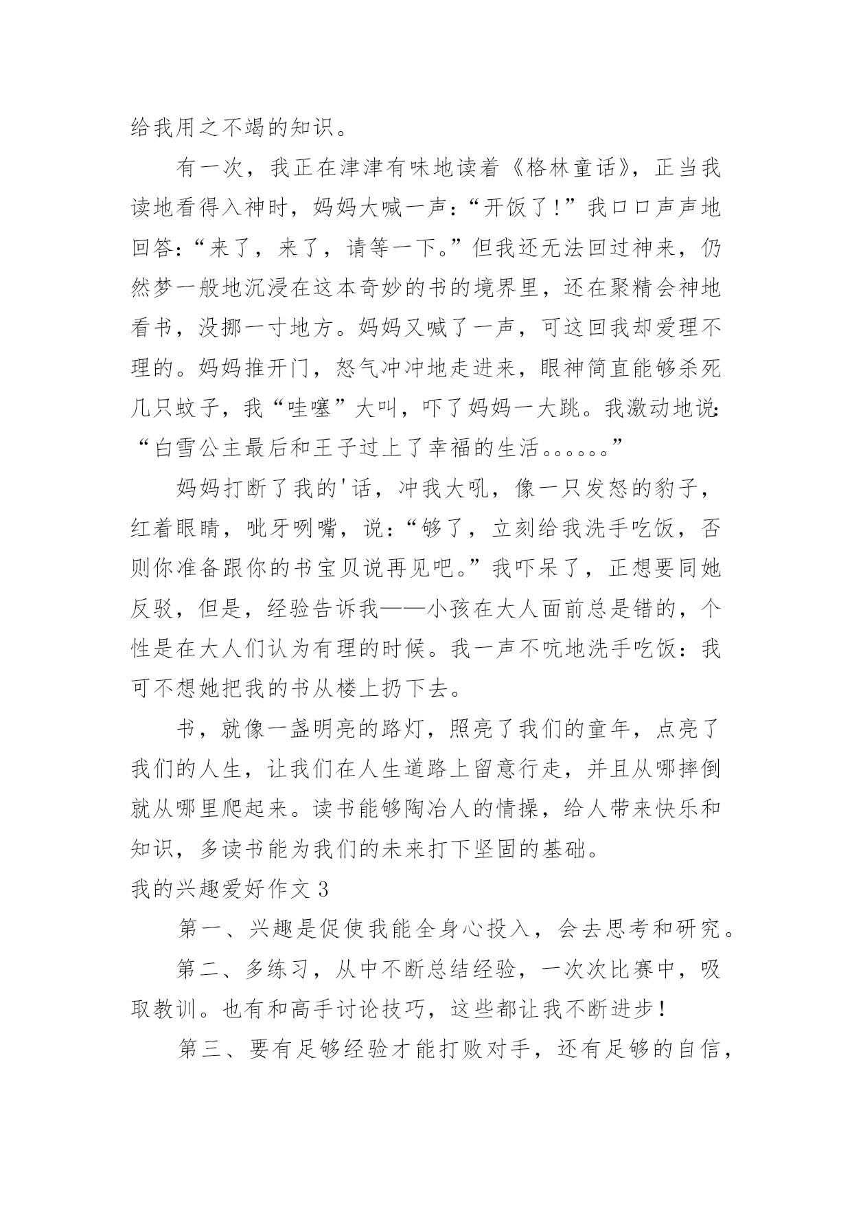 我的兴趣爱好作文(荐)我的兴趣爱好作文15篇在现实生活或工作学习中,大家都不可避免地要接触到作文吧,借助作文可以宣泄心中的情感,调节自己的心情。如何写一篇有思想、有文采的作文呢?以下是小编为大家整理的我的兴趣爱好作文,供大家参考借鉴,希望可以帮助到有需要的朋友。我的兴趣爱好作文1我的兴趣爱好与大多数人都不同,我不说出来肯定没人猜得到,因为这可是一种少见的民间手艺,那就是棕编。我喜欢棕编主要是受到了爷爷的影响,爷爷是一个棕编大师。我从小就跟在爷爷身后,时不时的就会去自家的园地采棕叶,爷爷是一个棕编高手,什么模样的棕编都不在话下,我经常瞧着爷爷的手艺,每天里都佩服得五体投地。爷爷的棕编里面编得最好的是丹顶鹤,它纹理分明的翅膀,用细钢丝支撑着的修长双腿,丹顶鹤的颜色是褪去了棕叶褐绿色的白色,这种白色并不纯粹,还带上一点点淡黄。丹顶鹤看起来栩栩如生,就像要展翅起飞了一般。自从小时候亲眼见着爷爷用棕叶将一只只丹顶鹤编出来后,我就对棕编这种手艺充满着兴趣,打从那时候起就一直囔囔着要爷爷教我。一开始,我的学习是从最简单的动物学起,比如那种简单的蚂蚱,蜻蜓,蛐蛐等等,我到现在都还记得我做出来的第一支蚂蚱,当我完工后,瞧着那松松垮垮不成模样的小东西,我简直欲哭无泪,若我不说出来这是蚂蚱,我相信没有人能够看得出来。不过在我后来不断的练习之中,编出来的东西也就越来越来有模有样了。我在不断的尝试编出难度系数更高的物体,每天在爷爷的指导下进步飞快,一年又一年下来,我也成了一个小大师了。一直到现在,我也能够编出最让我喜欢丹顶鹤来了,不过爷爷总说,我的`手艺还是太生疏了些,编出来的东西缺少了一种灵气。若是将我编出来的丹顶鹤与爷爷编出来的丹顶鹤放在一起,虽然在外表上看相差不多,可是一旦看久了,就会发现爷爷编出来的丹顶鹤更有韵味一些,也更生气一些。不过,我坚信总有一天我也能编出那种栩栩如生的丹顶鹤来。我的兴趣爱好作文2人的爱好多种多样,有新奇绝妙的,有平淡无奇的,我的爱好虽不新奇,却广泛的连父母也时常感叹。而在这众多的爱好中。我还是对读书情有独钟。我从小就喜欢看书。小时侯,爸爸给我买的书籍不计其数,我一有空闲时光就沉醉于那优美的语句,丰富的想象中。书就像一位博学多才的老师,带我徜徉知识的海洋,教给我用之不竭的知识。有一次,我正在津津有味地读着《格林童话》,正当我读地看得入神时,妈妈大喊一声:“开饭了!”我口口声声地回答:“来了,来了,请等一下。”但我还无法回过神来,仍然梦一般地沉浸在这本奇妙的书的境界里,还在聚精会神地看书,没挪一寸地方。妈妈又喊了一声,可这回我却爱理不理的。妈妈推开门,怒气冲冲地走进来,眼神简直能够杀死几只蚊子,我“哇噻”大叫,吓了妈妈一大跳。我激动地说:“白雪公主最后和王子过上了幸福的生活。。。。。。”妈妈打断了我的'话,冲我大吼,像一只发怒的豹子,红着眼睛,呲牙咧嘴,说:“够了,立刻给我洗手吃饭,否则你准备跟你的书宝贝说再见吧。”我吓呆了,正想要同她反驳,但是,经验告诉我——小孩在大人面前总是错的,个性是在大人们认为有理的时候。我一声不吭地洗手吃饭:我可不想她把我的书从楼上扔下去。书,就像一盏明亮的路灯,照亮了我们的童年,点亮了我们的人生,让我们在人生道路上留意行走,并且从哪摔倒就从哪里爬起来。读书能够陶冶人的情操,给人带来快乐和知识,多读书能为我们的未来打下坚固的基础。我的兴趣爱好作文3第一、兴趣是促使我能全身心投入,会去思考和研究。第二、多练习,从中不断总结经验,一次次比赛中,吸取教训。也有和高手讨论技巧,这些都让我不断进步!第三、要有足够经验才能打败对手,还有足够的自信,才能拿第一!第四、要有技巧,这方面是最重要的,是决定是否可以取得冠军的最重要因素。比如转弯时控制好方向盘(不要撞到其他车辆或弯道墙),转小弯时,要轻点刹车(不要太用力,不然车辆会失控,容易撞墙);转大弯时,六档车1356(挂挡),五档车245(挂挡);遇到U型弯道,若是五档车如阿斯顿马丁DB11(未改装),二档进弯,三档弯中间,四五档出弯,若是六档车如三菱EVO(未改装),方向盘先打一大半,控制好车速,踩死油门,控制好速度慢慢转动方向盘直至最后打死方向盘,三档进弯,四档弯中间,五六档各一秒;起步时,五档车(斯巴鲁STI旅行版)先二三档(各停两秒换档),后三四五档(各停三秒换档);六档车(日产GTR)先挂三四档,(各停两秒换档),后五六档(各停三秒换挡)。如果漂移失控时,先换档(例如:四挡就要换成三档),换完后点刹车到中间(不能踩刹车踩到底,会导致失控),换完档之后用力踩油门。如果有尾翼的.车(如日产GTR)踩刹车时需轻点刹车,如果转七字型弯道,六档车(日产GTR)先挂一档,后挂三档,在弯道过半时,挂五档并右转之后左转,(如果你是右转,要往左转),如果有S型弯道时