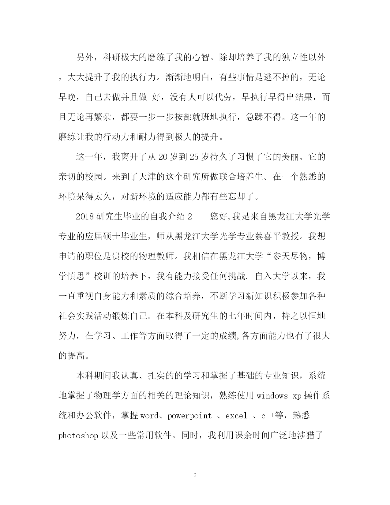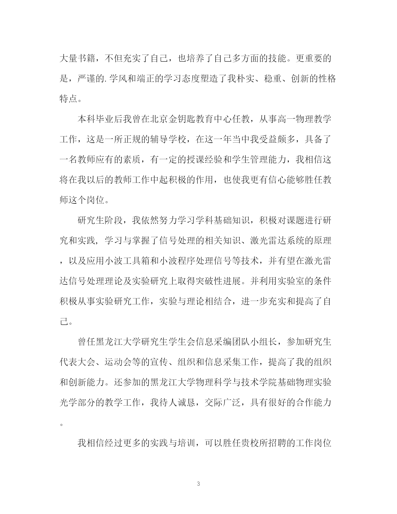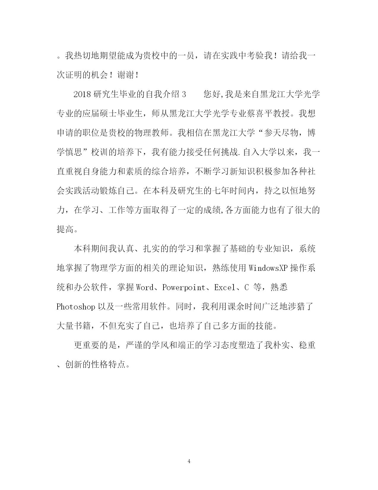 此资料由网络收集而来,如有侵权请告知上传者立即删除。资料共分享,我们负责传递知识。PAGEPAGE4研究生毕业的自我介绍2018研究生毕业的自我介绍自我介绍要有自信,自信的人有更强大的气场,也更能够赢得考官的青睐。小编整理了研究生毕业的自我介绍,欢迎欣赏与借鉴。2018研究生毕业的自我介绍1这一年,也就是硕士二年级,我们结束了长达15年的教师教授学生自学的学习模式,开始了科研的初步探索。这是一种与单纯汲取知识完全不同的模式,需要很多的主观能动性的创新。这种转变是一个痛苦的过程,唯有经历过这种痛苦,才会渐渐成长起来。我们渐渐地对搞科研入了门,却马上面临着毕业了。说实话,很是不舍。不舍自己破茧重生后积累的经验迅速的贬值,封尘于人生的藏宝箱。幸好,做学问,学业亦或科研,上升到哲学的角度,与做其他事情都是有共性的。在这一年之中,我更大的收获是对自己性格方面、处理事情方面的历练。科研是需要独立完成的。从最初的无所适从,到现在的渐渐地适应自己给自己提出一个思路,然后当机立断的执行,并对自己的创意、自己的执行力负责。这种独立性的培养,这种责任心的培养,对整个人生是大有裨益的。另外,科研极大的磨练了我的心智。除却培养了我的独立性以外,大大提升了我的执行力。渐渐地明白,有些事情是逃不掉的,无论早晚,自己去做并且做好,没有人可以代劳,早执行早得出结果,而且无论再繁杂,都要一步一步按部就班地执行,急躁不得。这一年的磨练让我的行动力和耐力得到极大的提升。这一年,我离开了从20岁到25岁待久了习惯了它的美丽、它的亲切的校园。来到了天津的这个研究所做联合培养生。在一个熟悉的环境呆得太久,对新环境的适应能力都有些忘却了。2018研究生毕业的自我介绍2您好,我是来自黑龙江大学光学专业的应届硕士毕业生,师从黑龙江大学光学专业蔡喜平教授。我想申请的职位是贵校的物理教师。我相信在黑龙江大学“参天尽物,博学慎思”校训的培养下,我有能力接受任何挑战.自入大学以来,我一直重视自身能力和素质的综合培养,不断学习新知识积极参加各种社会实践活动锻炼自己。在本科及研究生的七年时间内,持之以恒地努力,在学习、工作等方面取得了一定的成绩,各方面能力也有了很大的提高。本科期间我认真、扎实的的学习和掌握了基础的专业知识,系统地掌握了物理学方面的相关的理论知识,熟练使用windowsxp操作系统和办公软件,掌握word、powerpoint、excel、c++等,熟悉photoshop以及一些常用软件。同时,我利用课余时间广泛地涉猎了大量书籍,不但充实了自己,也培养了自己多方面的技能。更重要的是,严谨的.学风和端正的学习态度塑造了我朴实、稳重、创新的性格特点。本科毕业后我曾在北京金钥匙教育中心任教,从事高一物理教学工作,这是一所正规的辅导学校,在这一年当中我受益颇多,具备了一名教师应有的素质,有一定的授课经验和学生管理能力,我相信这将在我以后的教师工作中起积极的作用,也使我更有信心能够胜任教师这个岗位。研究生阶段,我依然努力学习学科基础知识,积极对课题进行研究和实践,学习与掌握了信号处理的相关知识、激光雷达系统的原理,以及应用小波工具箱和小波程序处理信号等技术,并有望在激光雷达信号处理理论及实验研究上取得突破性进展。并利用实验室的条件积极从事实验研究工作,实验与理论相结合,进一步充实和提高了自己。曾任黑龙江大学研究生学生会信息采编团队小组长,参加研究生代表大会、运动会等的宣传、组织和信息采集工作,提高了我的组织和创新能力。还参加的黑龙江大学物理科学与技术学院基础物理实验光学部分的教学工作,我待人诚恳,交际广泛,具有很好的合作能力。我相信经过更多的实践与培训,可以胜任贵校所招聘的工作岗位。我热切地期望能成为贵校中的一员,请在实践中考验我!请给我一次证明的机会!谢谢!2018研究生毕业的自我介绍3您好,我是来自黑龙江大学光学专业的应届硕士毕业生,师从黑龙江大学光学专业蔡喜平教授。我想申请的职位是贵校的物理教师。我相信在黑龙江大学“参天尽物,博学慎思”校训的培养下,我有能力接受任何挑战.自入大学以来,我一直重视自身能力和素质的综合培养,不断学习新知识积极参加各种社会实践活动锻炼自己。在本科及研究生的七年时间内,持之以恒地努力,在学习、工作等方面取得了一定的成绩,各方面能力也有了很大的提高。本科期间我认真、扎实的的学习和掌握了基础的专业知识,系统地掌握了物理学方面的相关的理论知识,熟练使用WindowsXP操作系统和办公软件,掌握Word、Powerpoint、Excel、C等,熟悉Photoshop以及一些常用软件。同时,我利用课余时间广泛地涉猎了大量书籍,不但充实了自己,也培养了自己多方面的技能。更重要的是,严谨的学风和端正的学习态度