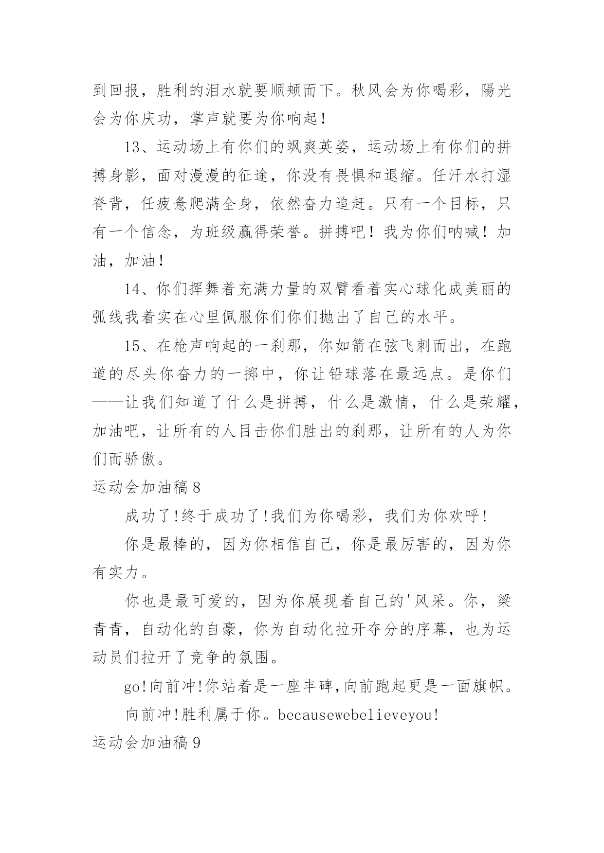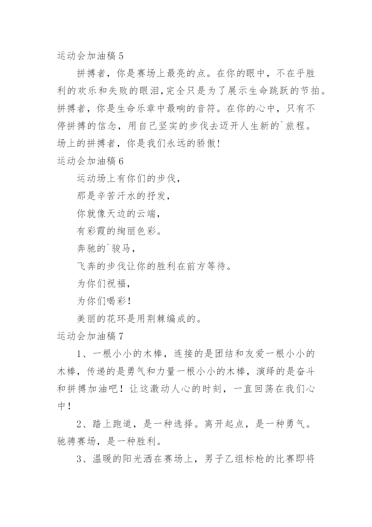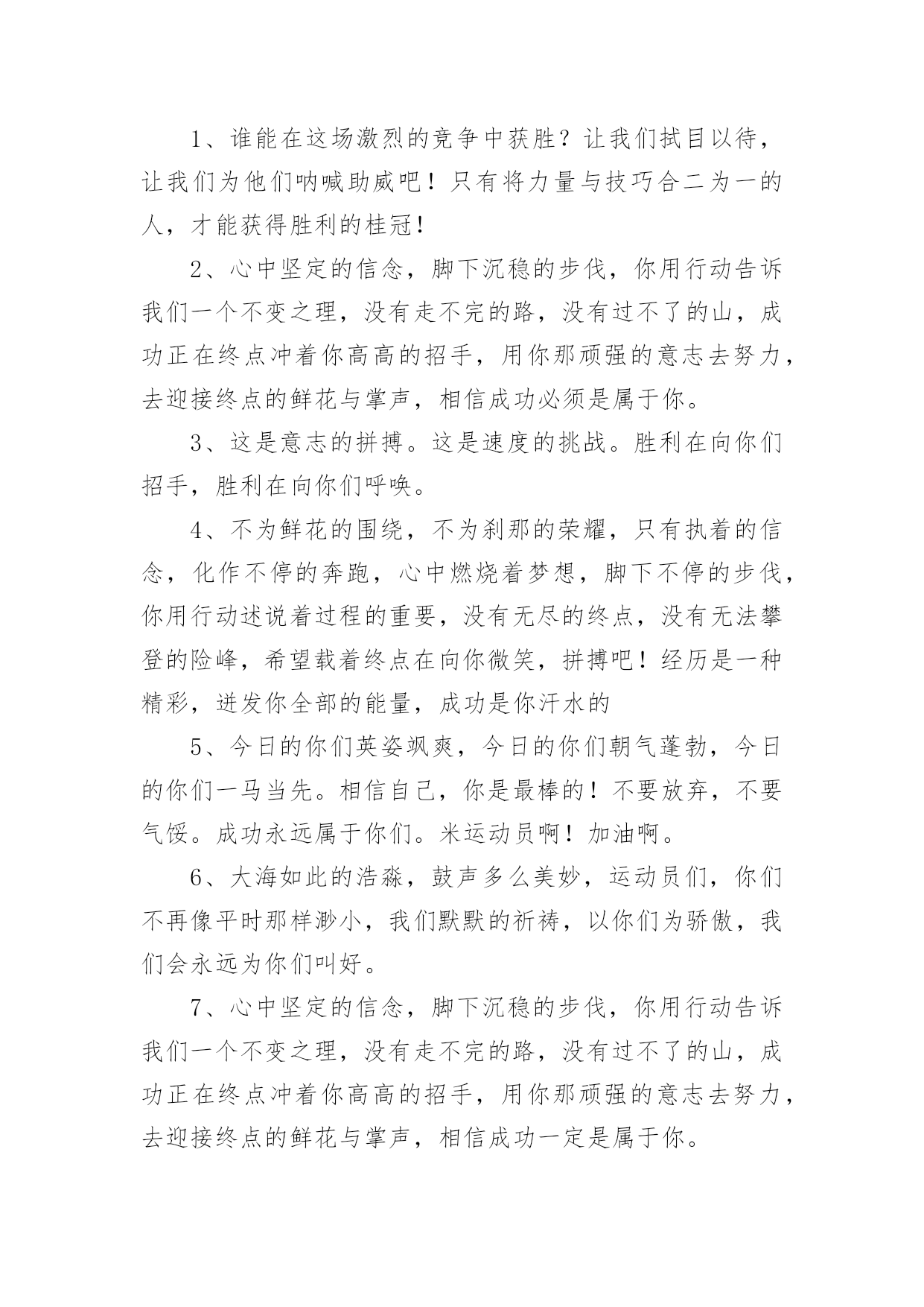 运动会加油稿运动会加油稿在社会发展不断提速的今天,越来越多人会去使用加油稿,加油稿可以起到活跃气氛的作用。相信写加油稿是一个让许多人都头痛的问题,下面是小编为大家整理的运动会加油稿,仅供参考,欢迎大家阅读。运动会加油稿1你赢得十分精彩,无需掩饰你的微笑,流露在你脸上。但我相信,你心中十分明白,征途刚刚开始,漫漫长路刚刚开头。加油啊,朋友,只有不断的拼搏,才能够不断战胜自己,战胜一切!向前向前向前!。百米跑道虽不长,运动健儿志高扬。磨拳擦掌跃欲试,分秒必争勇夺魁。巾帼岂将须眉让。古有木兰冲杀场,今有跑百米。立志创新校记录,勇夺信管第一金。运动会加油稿2宝剑锋从磨砺出,梅花香自苦寒来。在经过一个月的辛苦的训练,今天,你终于站在了跑道上,通过不断的自我加压,练习中不断的超越自我,挑战极限,你自信满满,甚至在长跑的'过程中不慎跌倒,你也毫不犹豫地爬起,继续。看着你那坚定的步伐,我们不禁想送你一首诗。常记朝朝暮暮,天天不忘跑步。苦练为参赛,长征一里路,加速,加速!昂首挺胸阔步。努力吧,运动健将们,在终点,我们等着你。运动会加油稿3成功了!终于成功了!我们为你喝彩,我们为你欢呼!你是最棒的,因为你相信自己,你是最厉害的,因为你有实力。你也是最可爱的.,因为你展现着自己的风采。你,梁青青,自动化的自豪,你为自动化拉开夺分的序幕,也为运动员们拉开了竞争的氛围。GO!向前冲!你站着是一座丰碑,向前跑起更是一面旗帜。向前冲!胜利属于你。Becausewebelieveyou!运动会加油稿4掌声依然为你响起,鲜花依然为你献上一时的输赢不代表终生的成败!擦干泪水,振作精神,新的'冲锋号已经吹响!谁说天空没有鸟的痕迹而鸟已飞过?鸟飞过的痕迹已刻在天空的心中你的精神也刻在了所有人的心中不论结果如何我们不会忘记你这只在天空努力飞过的小鸟,那瞬间的美丽将成为我们心中的永恒!运动会加油稿5拼搏者,你是赛场上最亮的点。在你的眼中,不在乎胜利的欢乐和失败的眼泪,完全只是为了展示生命跳跃的节拍。拼搏者,你是生命乐章中最响的音符。在你的心中,只有不停拼搏的信念,用自己坚实的步伐去迈开人生新的`旅程。场上的拼搏者,你是我们永远的骄傲!运动会加油稿6运动场上有你们的步伐,那是辛苦汗水的抒发,你就像天边的云端,有彩霞的绚丽色彩。奔驰的`骏马,飞奔的步伐让你的胜利在前方等待。为你们祝福,为你们喝彩!美丽的花环是用荆棘编成的。运动会加油稿71、一根小小的木棒,连接的是团结和友爱一根小小的木棒,传递的是勇气和力量一根小小的木棒,演绎的是奋斗和拼搏加油吧!让这激动人心的时刻,一直回荡在我们心中!2、踏上跑道,是一种选择。离开起点,是一种勇气。驰骋赛场,是一种胜利。3、温暖的阳光洒在赛场上,男子乙组标枪的比赛即将开始。赛场上,一道道优美的弧线将轻盈地划过天空。健儿们用手中的标枪向距离的权限发起一轮又一轮的挑战。标枪在空中轻盈的姿态,是健儿们强健的力量和熟练的技巧的结合。谁能在这场激烈的竞争中获胜?让我们拭目以待,让我们为他们呐喊、助威吧!只有将力量与技巧合二为一的人,才能获得胜利的桂冠!4、你的汗水洒在跑道,浇灌着成功的花朵开放。你的欢笑飞扬在赛场,为班争光数你最棒。跑吧,追吧!在这广阔的赛场上,你似骏马似离铉的箭。跑吧,追吧!你比虎猛比豹强。5、“沙场秋点兵”的壮阔,想必给了我们难以言喻的激情。于是,我放下手中的笔,去感受脉搏与心跳的激烈。在期盼中,在意料中,是悲是喜,是欢是狂,都未可知,但可知的是我们拥有这样一场运动盛会。6、奥林匹克精神佳,运动健将拼搏强。在运动场上的运动健儿们,发挥你们的特长,展示你们的风采,让你们的身影在运动场上留下优美的风景线,让你们的雄心壮志在运动场上发挥的淋漓尽致。7、青春是不老的誓言,飞扬是年轻的梦想,金色的十月,让我们在这长长的跑道上青春飞扬,现出飒爽的风姿,亮出真我的风采,带上同学们的热情,载着同伴们的期望,背负老师的嘱托,在这活力四射的校园里,放飞你的青春活力和运动激情。8、在同一片晴空下,我们相聚一齐,或欢乐、或失落、或兴奋、或悲伤,尽数写在我们的脸旁。我们曾一齐悲伤,在那个败北的沙坑上;我们也一齐击掌,在这红色的跑道上。在同一片晴空下,我们拼搏,为美丽的目标;我们奋斗,为班级的辉煌。这就是团结、奋进、礼貌的03企管班。9、运动员们,你们就像一只飞鸟一样,为自己的目标而不放下任何一点期望。在这么闷热的时候,在这么激动的时刻,我们为你们而欢呼,你们是最棒的,要相信自己,不管结果如何,只要你们努力拼搏,努力为自己的目标而奋斗,我们相信,胜利的'结果永远属于你们,努力地向前冲吧!10、山不在高,有仙则名;水不在深,有龙则灵;人不在多,有你则行。运动员们,你们那英姿飒爽、豪迈的步履,深深地牵引着我们这些观众的心,让我们不分班级情不自禁的为你们呐喊