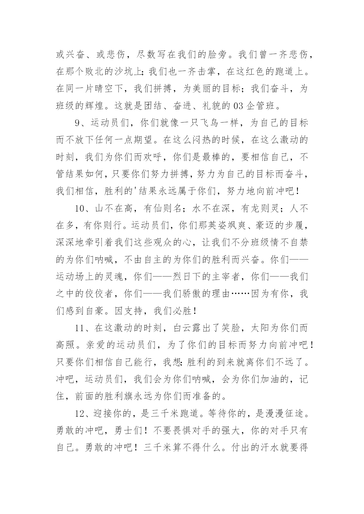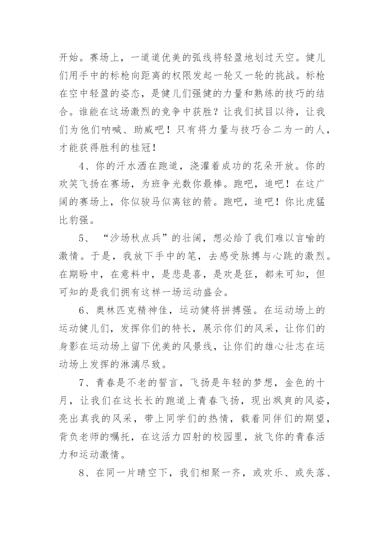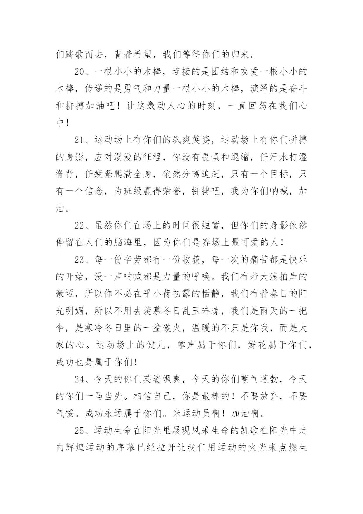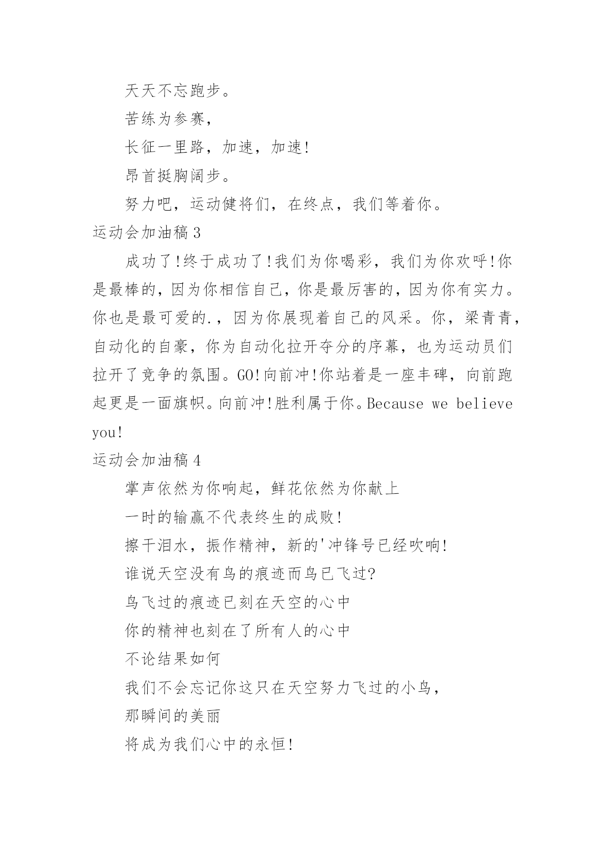 运动会加油稿运动会加油稿在社会发展不断提速的今天,越来越多人会去使用加油稿,加油稿可以起到活跃气氛的作用。相信写加油稿是一个让许多人都头痛的问题,下面是小编为大家整理的运动会加油稿,仅供参考,欢迎大家阅读。运动会加油稿1你赢得十分精彩,无需掩饰你的微笑,流露在你脸上。但我相信,你心中十分明白,征途刚刚开始,漫漫长路刚刚开头。加油啊,朋友,只有不断的拼搏,才能够不断战胜自己,战胜一切!向前向前向前!。百米跑道虽不长,运动健儿志高扬。磨拳擦掌跃欲试,分秒必争勇夺魁。巾帼岂将须眉让。古有木兰冲杀场,今有跑百米。立志创新校记录,勇夺信管第一金。运动会加油稿2宝剑锋从磨砺出,梅花香自苦寒来。在经过一个月的辛苦的训练,今天,你终于站在了跑道上,通过不断的自我加压,练习中不断的超越自我,挑战极限,你自信满满,甚至在长跑的'过程中不慎跌倒,你也毫不犹豫地爬起,继续。看着你那坚定的步伐,我们不禁想送你一首诗。常记朝朝暮暮,天天不忘跑步。苦练为参赛,长征一里路,加速,加速!昂首挺胸阔步。努力吧,运动健将们,在终点,我们等着你。运动会加油稿3成功了!终于成功了!我们为你喝彩,我们为你欢呼!你是最棒的,因为你相信自己,你是最厉害的,因为你有实力。你也是最可爱的.,因为你展现着自己的风采。你,梁青青,自动化的自豪,你为自动化拉开夺分的序幕,也为运动员们拉开了竞争的氛围。GO!向前冲!你站着是一座丰碑,向前跑起更是一面旗帜。向前冲!胜利属于你。Becausewebelieveyou!运动会加油稿4掌声依然为你响起,鲜花依然为你献上一时的输赢不代表终生的成败!擦干泪水,振作精神,新的'冲锋号已经吹响!谁说天空没有鸟的痕迹而鸟已飞过?鸟飞过的痕迹已刻在天空的心中你的精神也刻在了所有人的心中不论结果如何我们不会忘记你这只在天空努力飞过的小鸟,那瞬间的美丽将成为我们心中的永恒!运动会加油稿5拼搏者,你是赛场上最亮的点。在你的眼中,不在乎胜利的欢乐和失败的眼泪,完全只是为了展示生命跳跃的节拍。拼搏者,你是生命乐章中最响的音符。在你的心中,只有不停拼搏的信念,用自己坚实的步伐去迈开人生新的`旅程。场上的拼搏者,你是我们永远的骄傲!运动会加油稿6运动场上有你们的步伐,那是辛苦汗水的抒发,你就像天边的云端,有彩霞的绚丽色彩。奔驰的`骏马,飞奔的步伐让你的胜利在前方等待。为你们祝福,为你们喝彩!美丽的花环是用荆棘编成的。运动会加油稿71、一根小小的木棒,连接的是团结和友爱一根小小的木棒,传递的是勇气和力量一根小小的木棒,演绎的是奋斗和拼搏加油吧!让这激动人心的时刻,一直回荡在我们心中!2、踏上跑道,是一种选择。离开起点,是一种勇气。驰骋赛场,是一种胜利。3、温暖的阳光洒在赛场上,男子乙组标枪的比赛即将开始。赛场上,一道道优美的弧线将轻盈地划过天空。健儿们用手中的标枪向距离的权限发起一轮又一轮的挑战。标枪在空中轻盈的姿态,是健儿们强健的力量和熟练的技巧的结合。谁能在这场激烈的竞争中获胜?让我们拭目以待,让我们为他们呐喊、助威吧!只有将力量与技巧合二为一的人,才能获得胜利的桂冠!4、你的汗水洒在跑道,浇灌着成功的花朵开放。你的欢笑飞扬在赛场,为班争光数你最棒。跑吧,追吧!在这广阔的赛场上,你似骏马似离铉的箭。跑吧,追吧!你比虎猛比豹强。5、“沙场秋点兵”的壮阔,想必给了我们难以言喻的激情。于是,我放下手中的笔,去感受脉搏与心跳的激烈。在期盼中,在意料中,是悲是喜,是欢是狂,都未可知,但可知的是我们拥有这样一场运动盛会。6、奥林匹克精神佳,运动健将拼搏强。在运动场上的运动健儿们,发挥你们的特长,展示你们的风采,让你们的身影在运动场上留下优美的风景线,让你们的雄心壮志在运动场上发挥的淋漓尽致。7、青春是不老的誓言,飞扬是年轻的梦想,金色的十月,让我们在这长长的跑道上青春飞扬,现出飒爽的风姿,亮出真我的风采,带上同学们的热情,载着同伴们的期望,背负老师的嘱托,在这活力四射的校园里,放飞你的青春活力和运动激情。8、在同一片晴空下,我们相聚一齐,或欢乐、或失落、或兴奋、或悲伤,尽数写在我们的脸旁。我们曾一齐悲伤,在那个败北的沙坑上;我们也一齐击掌,在这红色的跑道上。在同一片晴空下,我们拼搏,为美丽的目标;我们奋斗,为班级的辉煌。这就是团结、奋进、礼貌的03企管班。9、运动员们,你们就像一只飞鸟一样,为自己的目标而不放下任何一点期望。在这么闷热的时候,在这么激动的时刻,我们为你们而欢呼,你们是最棒的,要相信自己,不管结果如何,只要你们努力拼搏,努力为自己的目标而奋斗,我们相信,胜利的'结果永远属于你们,努力地向前冲吧!10、山不在高,有仙则名;水不在深,有龙则灵;人不在多,有你则行。运动员们,你们那英姿飒爽、豪迈的步履,深深地牵引着我们这些观众的心,让我们不分班级情不自禁的为你们呐喊