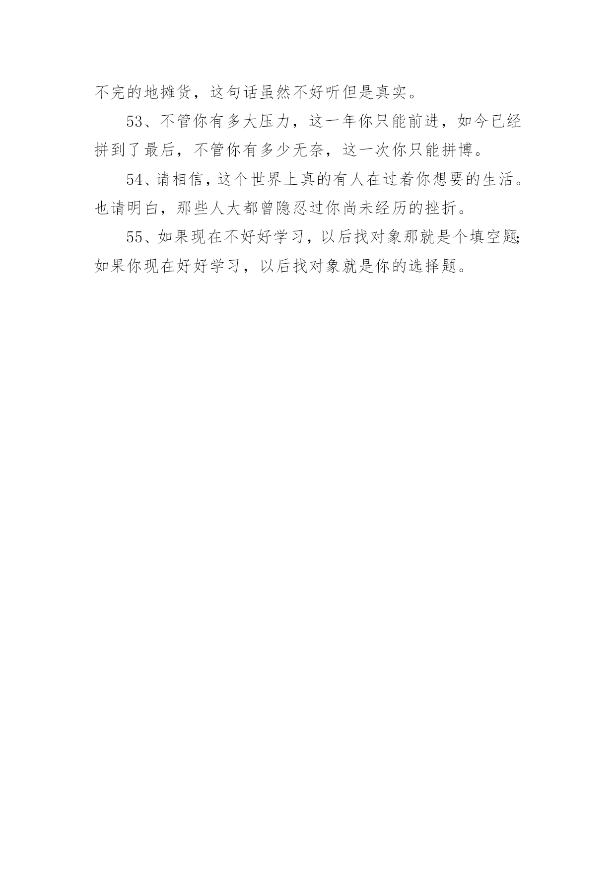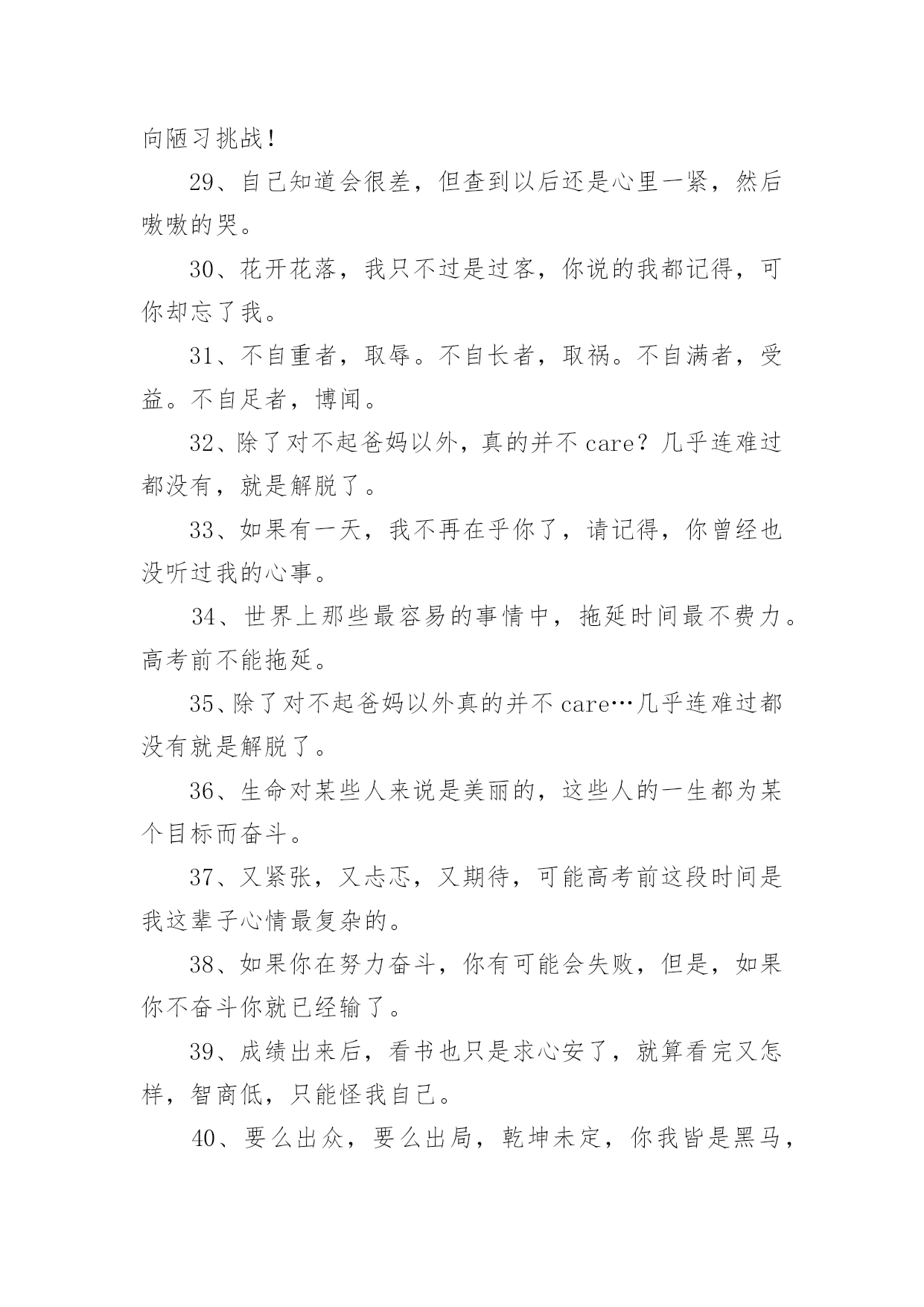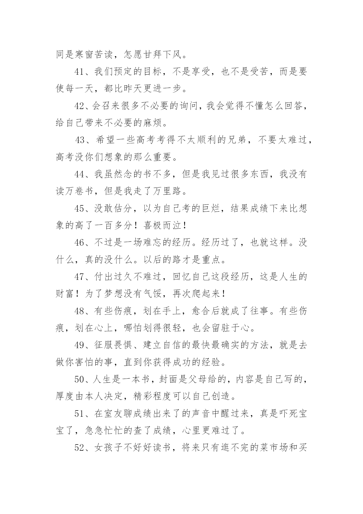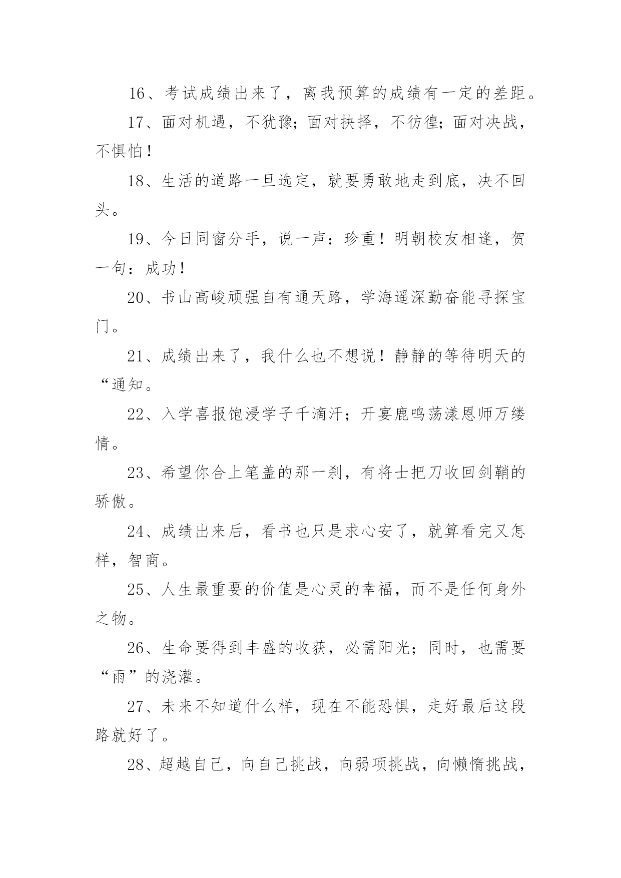 高考成绩公布后的说说随着网络社交蓬勃发展,越来越多人习惯于在线上发布说说,用于跟亲朋好友分享个人生活情况。朋友圈发什么样的说说才受欢迎呢?以下是小编为大家收集的高考成绩公布后的说说,供大家参考借鉴,希望可以帮助到有需要的朋友。1、原本预计着350分,结果也是高一百分左右?2、高考!去年我是观众,今年我是演员。加油!3、崩溃,然后想了想能上啥,就准备报志愿了。4、高考成绩出来的那一刻,无悔了,喜极而泣!5、送走的人不会相见,也不怀念,我是我,你是谁。6、查完分:哈!我有书读了!填志愿:为什么不要我。7、接下来的时间都不要打扰我,我要准备复习了。8、觉得不应该是这样,又觉得好像应该就是这样。9、可能也是因为考得不是很好,没有勇气晒出来。10、感觉非常神奇!居然跟我梦里的分数一模一样,624。11、向月亮出发,即使不能到达,也要站在群星之中。12、高考成绩出来了,我只想静静,什么都不要问,好吗?13、因为努力不是白费的哦!相信自己,努力做好自己。14、在同学家里,不好意思当她爸妈面哭,回她房间哭。15、不必每分钟都学习,但求学习中每分钟都有收获!16、考试成绩出来了,离我预算的成绩有一定的差距。17、面对机遇,不犹豫;面对抉择,不彷徨;面对决战,不惧怕!18、生活的道路一旦选定,就要勇敢地走到底,决不回头。19、今日同窗分手,说一声:珍重!明朝校友相逢,贺一句:成功!20、书山高峻顽强自有通天路,学海遥深勤奋能寻探宝门。21、成绩出来了,我什么也不想说!静静的等待明天的“通知。22、入学喜报饱浸学子千滴汗;开宴鹿鸣荡漾恩师万缕情。23、希望你合上笔盖的那一刹,有将士把刀收回剑鞘的骄傲。24、成绩出来后,看书也只是求心安了,就算看完又怎样,智商。25、人生最重要的价值是心灵的幸福,而不是任何身外之物。26、生命要得到丰盛的收获,必需阳光;同时,也需要“雨”的浇灌。27、未来不知道什么样,现在不能恐惧,走好最后这段路就好了。28、超越自己,向自己挑战,向弱项挑战,向懒惰挑战,向陋习挑战!29、自己知道会很差,但查到以后还是心里一紧,然后嗷嗷的哭。30、花开花落,我只不过是过客,你说的我都记得,可你却忘了我。31、不自重者,取辱。不自长者,取祸。不自满者,受益。不自足者,博闻。32、除了对不起爸妈以外,真的并不care?几乎连难过都没有,就是解脱了。33、如果有一天,我不再在乎你了,请记得,你曾经也没听过我的心事。34、世界上那些最容易的事情中,拖延时间最不费力。高考前不能拖延。35、除了对不起爸妈以外真的并不care…几乎连难过都没有就是解脱了。36、生命对某些人来说是美丽的,这些人的一生都为某个目标而奋斗。37、又紧张,又忐忑,又期待,可能高考前这段时间是我这辈子心情最复杂的。38、如果你在努力奋斗,你有可能会失败,但是,如果你不奋斗你就已经输了。39、成绩出来后,看书也只是求心安了,就算看完又怎样,智商低,只能怪我自己。40、要么出众,要么出局,乾坤未定,你我皆是黑马,同是寒窗苦读,怎愿甘拜下风。41、我们预定的目标,不是享受,也不是受苦,而是要使每一天,都比昨天更进一步。42、会召来很多不必要的询问,我会觉得不懂怎么回答,给自己带来不必要的麻烦。43、希望一些高考考得不太顺利的兄弟,不要太难过,高考没你们想象的那么重要。44、我虽然念的书不多,但是我见过很多东西,我没有读万卷书,但是我走了万里路。45、没敢估分,以为自己考的巨烂,结果成绩下来比想象的高了一百多分!喜极而泣!46、不过是一场难忘的经历。经历过了,也就这样。没什么,真的没什么。以后的路才是重点。47、付出过久不难过,回忆自己这段经历,这是人生的财富!为了梦想没有气馁,再次爬起来!48、有些伤痕,划在手上,愈合后就成了往事。有些伤痕,划在心上,哪怕划得很轻,也会留驻于心。49、征服畏惧、建立自信的最快最确实的方法,就是去做你害怕的事,直到你获得成功的经验。50、人生是一本书,封面是父母给的,内容是自己写的,厚度由本人决定,精彩程度可以自己创造。51、在室友聊成绩出来了的声音中醒过来,真是吓死宝宝了,急急忙忙的查了成绩,心里更难过了。52、女孩子不好好读书,将来只有逛不完的菜市场和买不完的地摊货,这句话虽然不好听但是真实。53、不管你有多大压力,这一年你只能前进,如今已经拼到了最后,不管你有多少无奈,这一次你只能拼博。54、请相信,这个世界上真的有人在过着你想要的生活。也请明白,那些人大都曾隐忍过你尚未经历的挫折。55、如果现在不好好学习,以后找对象那就是个填空题;如果你现在好好学习,以后找对象就是你的选择题。