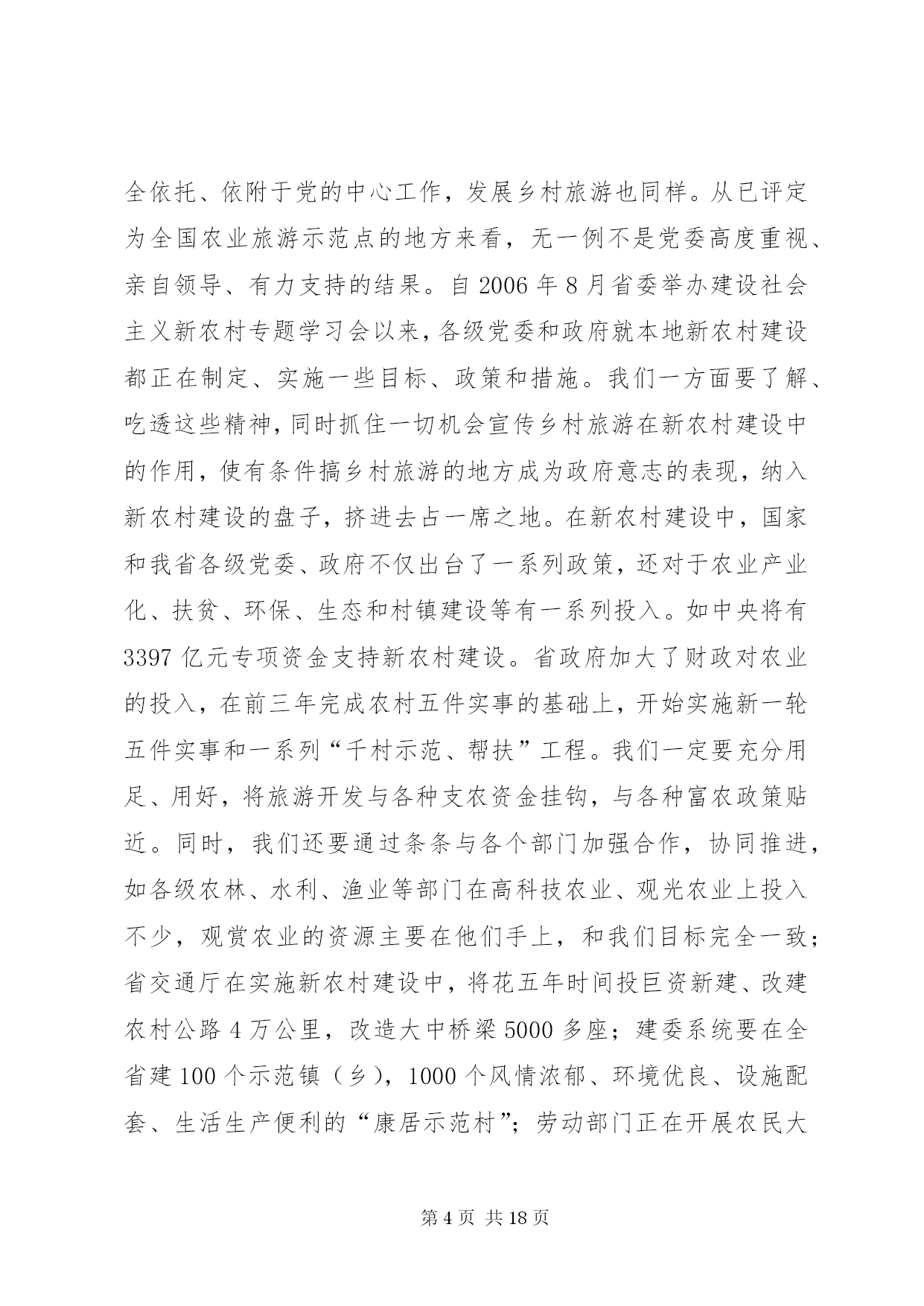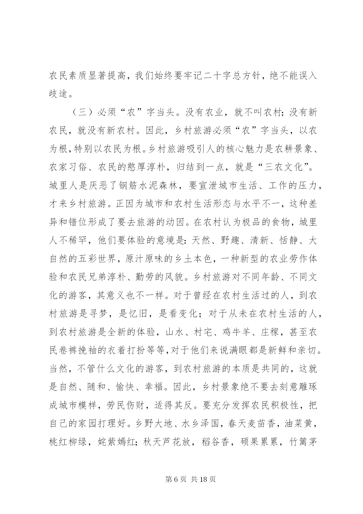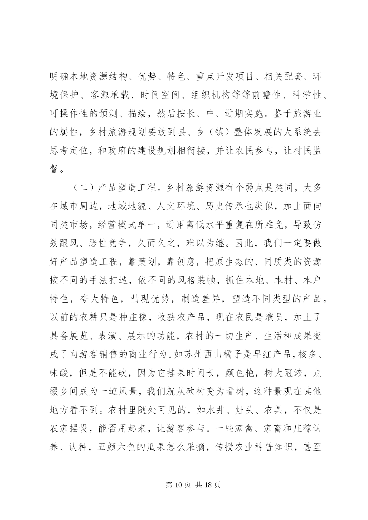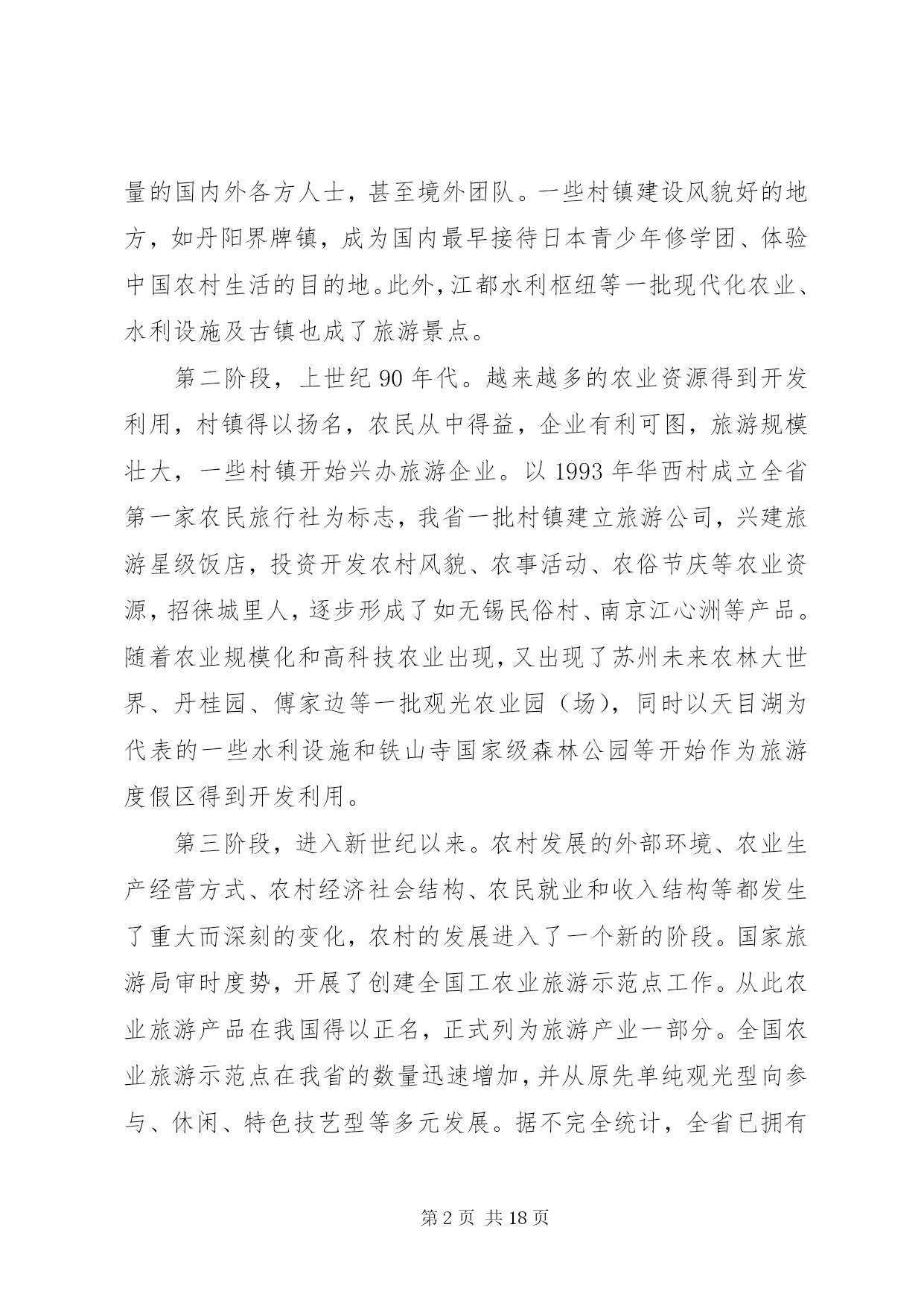 第PAGE\*Arabic\*MERGEFORMAT18页共NUMPAGES\*MERGEFORMAT18页乡村旅游发展思考近年来,XX省各级旅游部门在科学发展观的统领下,全面领会中央、省委、省政府社会主义新农村建设的战略决策,按照国家旅游局大力发展乡村旅游的工作部署,进一步明确以旅促农、富农的目标、思路和重点,着力发挥乡村旅游在社会主义新农村建设中所起的作用。在工作中抓好落实,把发展乡村旅游与坚持科学发展观、可持续发展战略结合起来,与旅游经济发展的规律结合起来,推动乡村旅游更快、更好、更健康地发展,使每个农业旅游示范点真正成为农村、农民、农业的“航标”。本文就如何加快发展江苏乡村旅游谈几点意见。一、从现状分析,把握乡村旅游发展的基本趋势我省是全国乡村旅游发展较早、产品和市场成长较成熟的地区之一。特别是“*”以来,省委、省政府关于加强“三农”工作的一系列方针政策,通过深化农村改革、调整农业结构、增加农户收入、推动城乡消费等,使农业旅游如淋甘露,如沐春风,蓬勃开展,呈现好态势,形成新亮点,迈上新台阶。回顾二十多年来我省乡村旅游的经历,大体分三个阶段。第一阶段,上世纪80年代。农村改革率先突破,特别是乡镇企业异军突起,开辟了农村由单一农业向农、工、商、游多元发展的道路,我省农业旅游开始崭露头角,最典型的是华西村和张家港等苏XX县区、市,作为农村工作的先进典型,接待了大量的国内外各方人士,甚至境外团队。一些村镇建设风貌好的地方,如丹阳界牌镇,成为国内最早接待日本青少年修学团、体验中国农村生活的目的地。此外,江都水利枢纽等一批现代化农业、水利设施及古镇也成了旅游景点。第二阶段,上世纪90年代。越来越多的农业资源得到开发利用,村镇得以扬名,农民从中得益,企业有利可图,旅游规模壮大,一些村镇开始兴办旅游企业。以1993年华西村成立全省第一家农民旅行社为标志,我省一批村镇建立旅游公司,兴建旅游星级饭店,投资开发农村风貌、农事活动、农俗节庆等农业资源,招徕城里人,逐步形成了如无锡民俗村、南京江心洲等产品。随着农业规模化和高科技农业出现,又出现了苏州未来农林大世界、丹桂园、傅家边等一批观光农业园(场),同时以天目湖为代表的一些水利设施和铁山寺国家级森林公园等开始作为旅游度假区得到开发利用。第三阶段,进入新世纪以来。农村发展的外部环境、农业生产经营方式、农村经济社会结构、农民就业和收入结构等都发生了重大而深刻的变化,农村的发展进入了一个新的阶段。国家旅游局审时度势,开展了创建全国工农业旅游示范点工作。从此农业旅游产品在我国得以正名,正式列为旅游产业一部分。全国农业旅游示范点在我省的数量迅速增加,并从原先单纯观光型向参与、休闲、特色技艺型等多元发展。据不完全统计,全省已拥有各类农业旅游区(点)近500处,全年接待量达到1500万人次,旅游收入30亿元,其中全国农业旅游示范点有43家,占全国的12%。预计在今后几年内农业旅游区(点)的数量还将有新的增长,产品质量上也在不断提高。这是一个好的趋势,说明发展乡村旅游对农民和农村基层组织有巨大的吸引力。按分布来讲,尽管我省南北经济状况很不平衡,但农业旅游的发展苏北、苏中力度很大,生态环境优越,农林基础丰厚,目前已拥有全国农业旅游示范点20处,数量近一半,为区域经济发展做出了应有的贡献。凡是全国农业旅游点的村民,每年来自旅游的收入快速增长,农民就地搞旅游服务,不离土、不离乡,幸福指数高。实践证明,农业旅游迅速成长为江苏旅游产业和农村经济发展新的增长点,靠旅游建设社会主义新农村已走出了一条重要的成功之路。二、从实际出发,明确发展乡村旅游的主要思路思路决定出路和成效。建设社会主义新农村是一项系统工程,它为乡村旅游大发展和上一个新的阶段提供了强大的政治、经济平台。同时,乡村旅游也为社会主义新农村建设提供了一条解决“三农”问题的理想、有效的途径。在发展乡村旅游工作中,我们必须抢抓这难得的机遇,结合我省实际,牢牢把握以下四点:(一)必须以党和政府的领导为核心。建设社会主义新农村是党中央提出的战略举措,是全党为之努力的当前和今后一段时期工作的主旋律。旅游业是个综合性产业,我们的生存、发展完全依托、依附于党的中心工作,发展乡村旅游也同样。从已评定为全国农业旅游示范点的地方来看,无一例不是党委高度重视、亲自领导、有力支持的结果。自2006年8月省委举办建设社会主义新农村专题学习会以来,各级党委和政府就本地新农村建设都正在制定、实施一些目标、政策和措施。我们一方面要了解、吃透这些精神,同时抓住一切机会宣传乡村旅游在新农村建设中的作用,使有条件搞乡村旅游的地方成为政府意志的表现,纳入新农村建设的盘子,挤进去占一席之地。在新农村建设中,国家和我省各级党委、政府不仅出台了一系列政策,还对于农业产业化、扶贫、