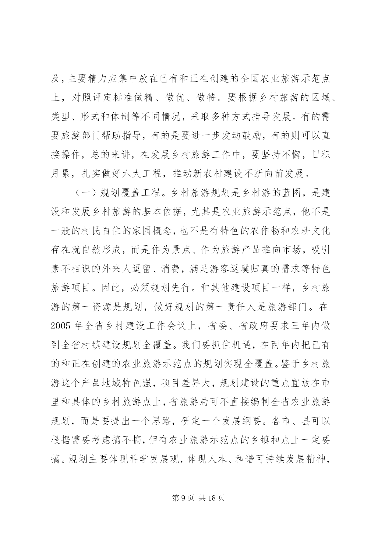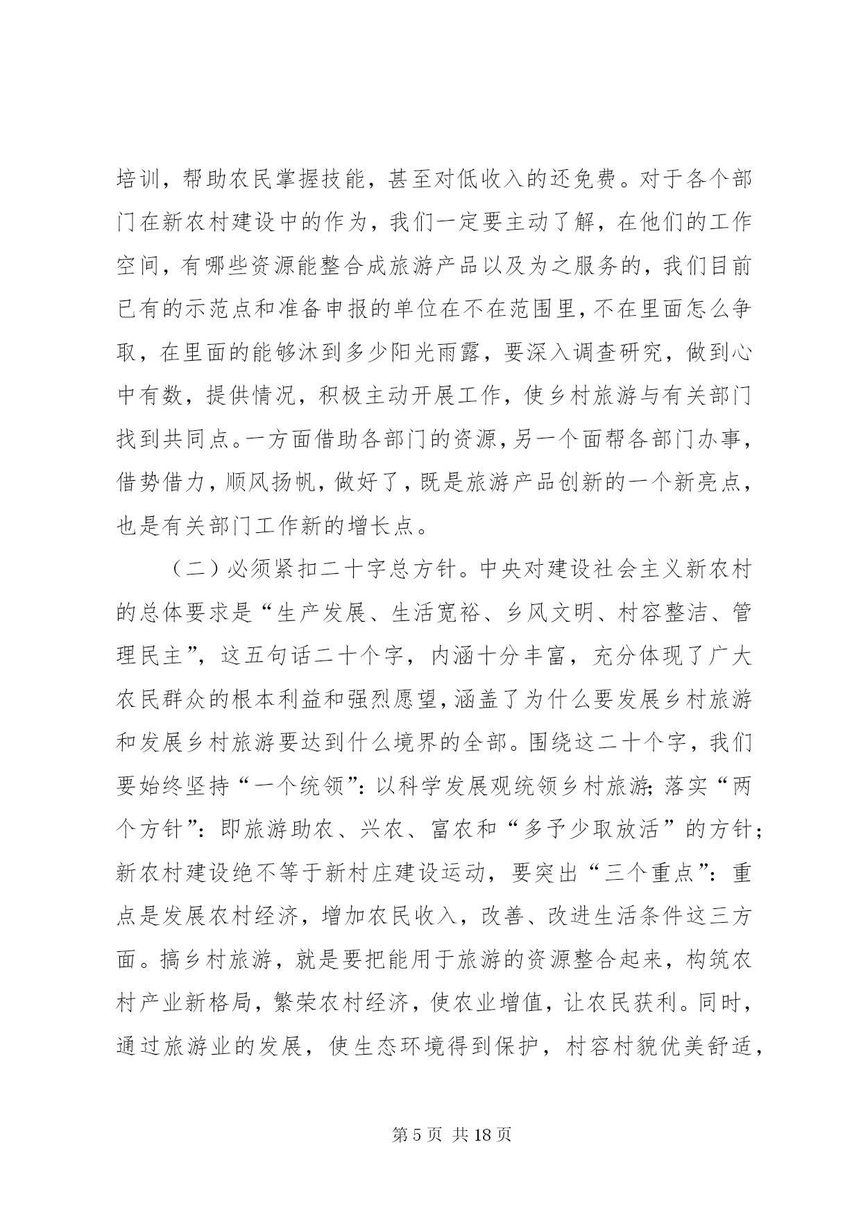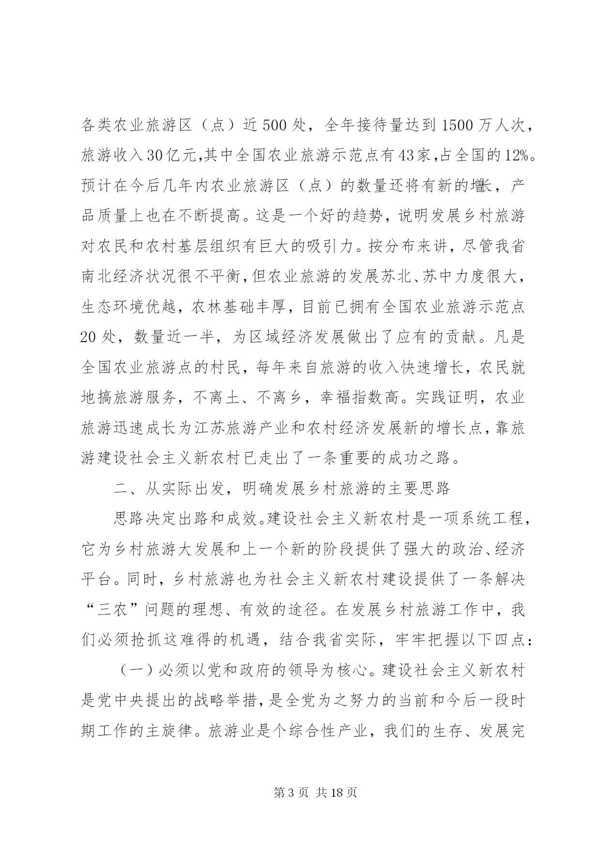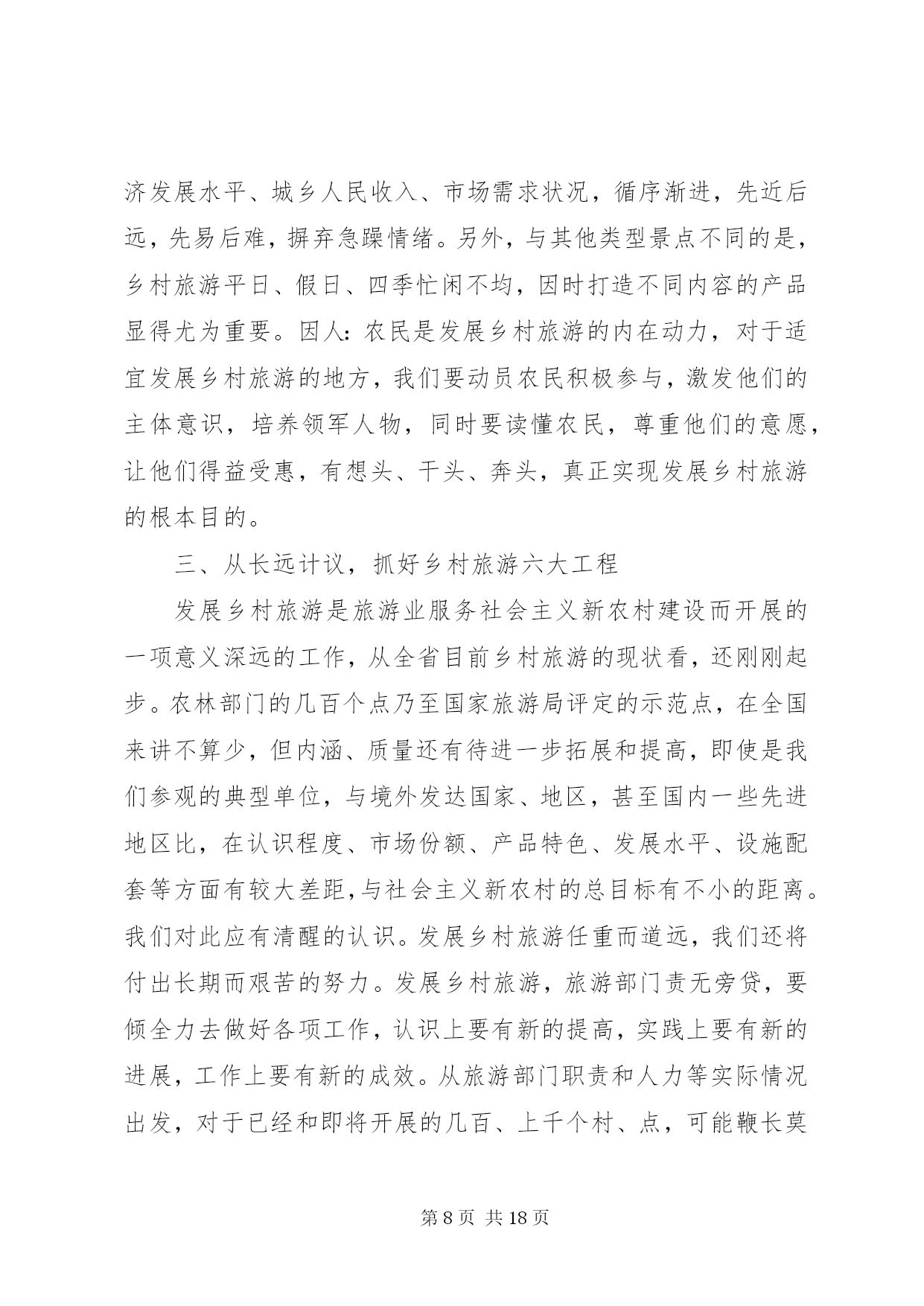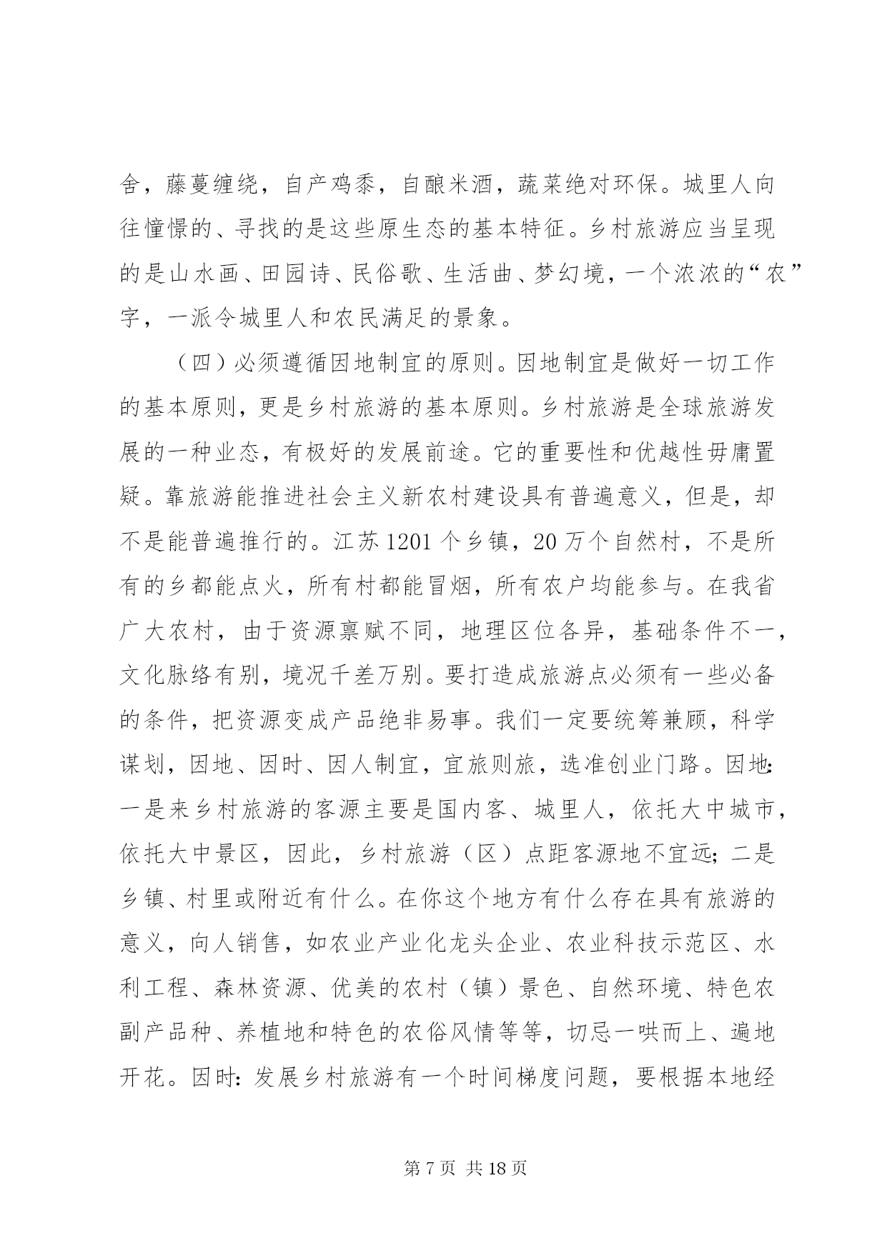 第PAGE\*Arabic\*MERGEFORMAT18页共NUMPAGES\*MERGEFORMAT18页乡村旅游发展思考近年来,XX省各级旅游部门在科学发展观的统领下,全面领会中央、省委、省政府社会主义新农村建设的战略决策,按照国家旅游局大力发展乡村旅游的工作部署,进一步明确以旅促农、富农的目标、思路和重点,着力发挥乡村旅游在社会主义新农村建设中所起的作用。在工作中抓好落实,把发展乡村旅游与坚持科学发展观、可持续发展战略结合起来,与旅游经济发展的规律结合起来,推动乡村旅游更快、更好、更健康地发展,使每个农业旅游示范点真正成为农村、农民、农业的“航标”。本文就如何加快发展江苏乡村旅游谈几点意见。一、从现状分析,把握乡村旅游发展的基本趋势我省是全国乡村旅游发展较早、产品和市场成长较成熟的地区之一。特别是“*”以来,省委、省政府关于加强“三农”工作的一系列方针政策,通过深化农村改革、调整农业结构、增加农户收入、推动城乡消费等,使农业旅游如淋甘露,如沐春风,蓬勃开展,呈现好态势,形成新亮点,迈上新台阶。回顾二十多年来我省乡村旅游的经历,大体分三个阶段。第一阶段,上世纪80年代。农村改革率先突破,特别是乡镇企业异军突起,开辟了农村由单一农业向农、工、商、游多元发展的道路,我省农业旅游开始崭露头角,最典型的是华西村和张家港等苏XX县区、市,作为农村工作的先进典型,接待了大量的国内外各方人士,甚至境外团队。一些村镇建设风貌好的地方,如丹阳界牌镇,成为国内最早接待日本青少年修学团、体验中国农村生活的目的地。此外,江都水利枢纽等一批现代化农业、水利设施及古镇也成了旅游景点。第二阶段,上世纪90年代。越来越多的农业资源得到开发利用,村镇得以扬名,农民从中得益,企业有利可图,旅游规模壮大,一些村镇开始兴办旅游企业。以1993年华西村成立全省第一家农民旅行社为标志,我省一批村镇建立旅游公司,兴建旅游星级饭店,投资开发农村风貌、农事活动、农俗节庆等农业资源,招徕城里人,逐步形成了如无锡民俗村、南京江心洲等产品。随着农业规模化和高科技农业出现,又出现了苏州未来农林大世界、丹桂园、傅家边等一批观光农业园(场),同时以天目湖为代表的一些水利设施和铁山寺国家级森林公园等开始作为旅游度假区得到开发利用。第三阶段,进入新世纪以来。农村发展的外部环境、农业生产经营方式、农村经济社会结构、农民就业和收入结构等都发生了重大而深刻的变化,农村的发展进入了一个新的阶段。国家旅游局审时度势,开展了创建全国工农业旅游示范点工作。从此农业旅游产品在我国得以正名,正式列为旅游产业一部分。全国农业旅游示范点在我省的数量迅速增加,并从原先单纯观光型向参与、休闲、特色技艺型等多元发展。据不完全统计,全省已拥有各类农业旅游区(点)近500处,全年接待量达到1500万人次,旅游收入30亿元,其中全国农业旅游示范点有43家,占全国的12%。预计在今后几年内农业旅游区(点)的数量还将有新的增长,产品质量上也在不断提高。这是一个好的趋势,说明发展乡村旅游对农民和农村基层组织有巨大的吸引力。按分布来讲,尽管我省南北经济状况很不平衡,但农业旅游的发展苏北、苏中力度很大,生态环境优越,农林基础丰厚,目前已拥有全国农业旅游示范点20处,数量近一半,为区域经济发展做出了应有的贡献。凡是全国农业旅游点的村民,每年来自旅游的收入快速增长,农民就地搞旅游服务,不离土、不离乡,幸福指数高。实践证明,农业旅游迅速成长为江苏旅游产业和农村经济发展新的增长点,靠旅游建设社会主义新农村已走出了一条重要的成功之路。二、从实际出发,明确发展乡村旅游的主要思路思路决定出路和成效。建设社会主义新农村是一项系统工程,它为乡村旅游大发展和上一个新的阶段提供了强大的政治、经济平台。同时,乡村旅游也为社会主义新农村建设提供了一条解决“三农”问题的理想、有效的途径。在发展乡村旅游工作中,我们必须抢抓这难得的机遇,结合我省实际,牢牢把握以下四点:(一)必须以党和政府的领导为核心。建设社会主义新农村是党中央提出的战略举措,是全党为之努力的当前和今后一段时期工作的主旋律。旅游业是个综合性产业,我们的生存、发展完全依托、依附于党的中心工作,发展乡村旅游也同样。从已评定为全国农业旅游示范点的地方来看,无一例不是党委高度重视、亲自领导、有力支持的结果。自2006年8月省委举办建设社会主义新农村专题学习会以来,各级党委和政府就本地新农村建设都正在制定、实施一些目标、政策和措施。我们一方面要了解、吃透这些精神,同时抓住一切机会宣传乡村旅游在新农村建设中的作用,使有条件搞乡村旅游的地方成为政府意志的表现,纳入新农村建设的盘子,挤进去占一席之地。在新农村建设中,国家和我省各级党委、政府不仅出台了一系列政策,还对于农业产业化、扶贫、