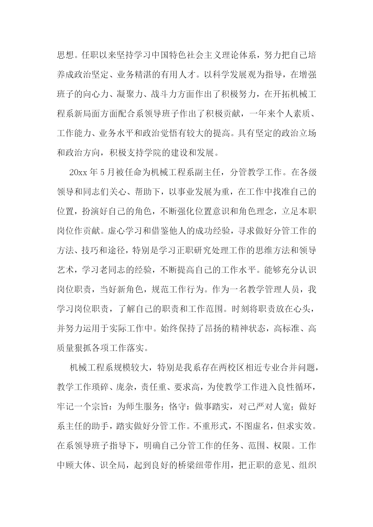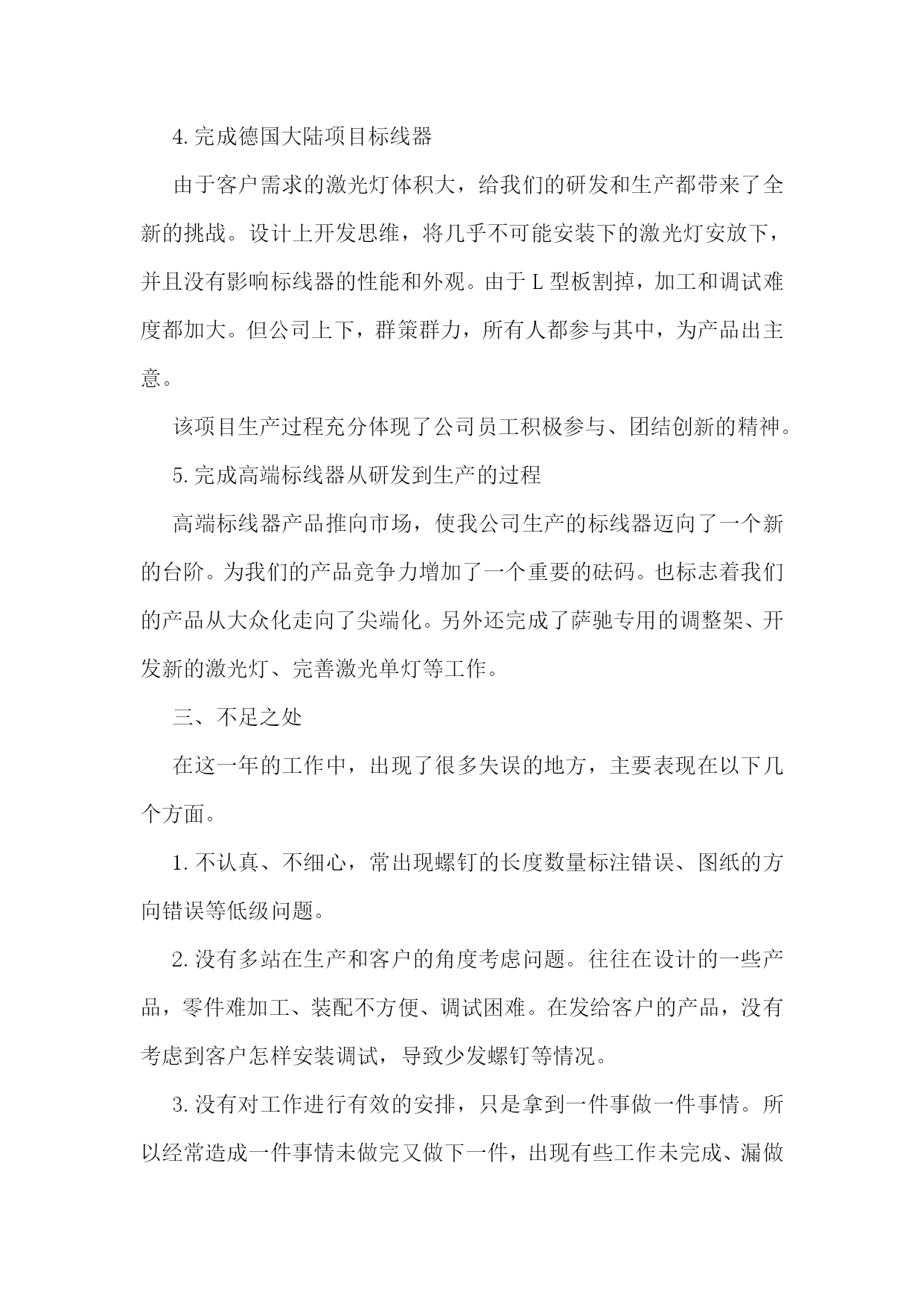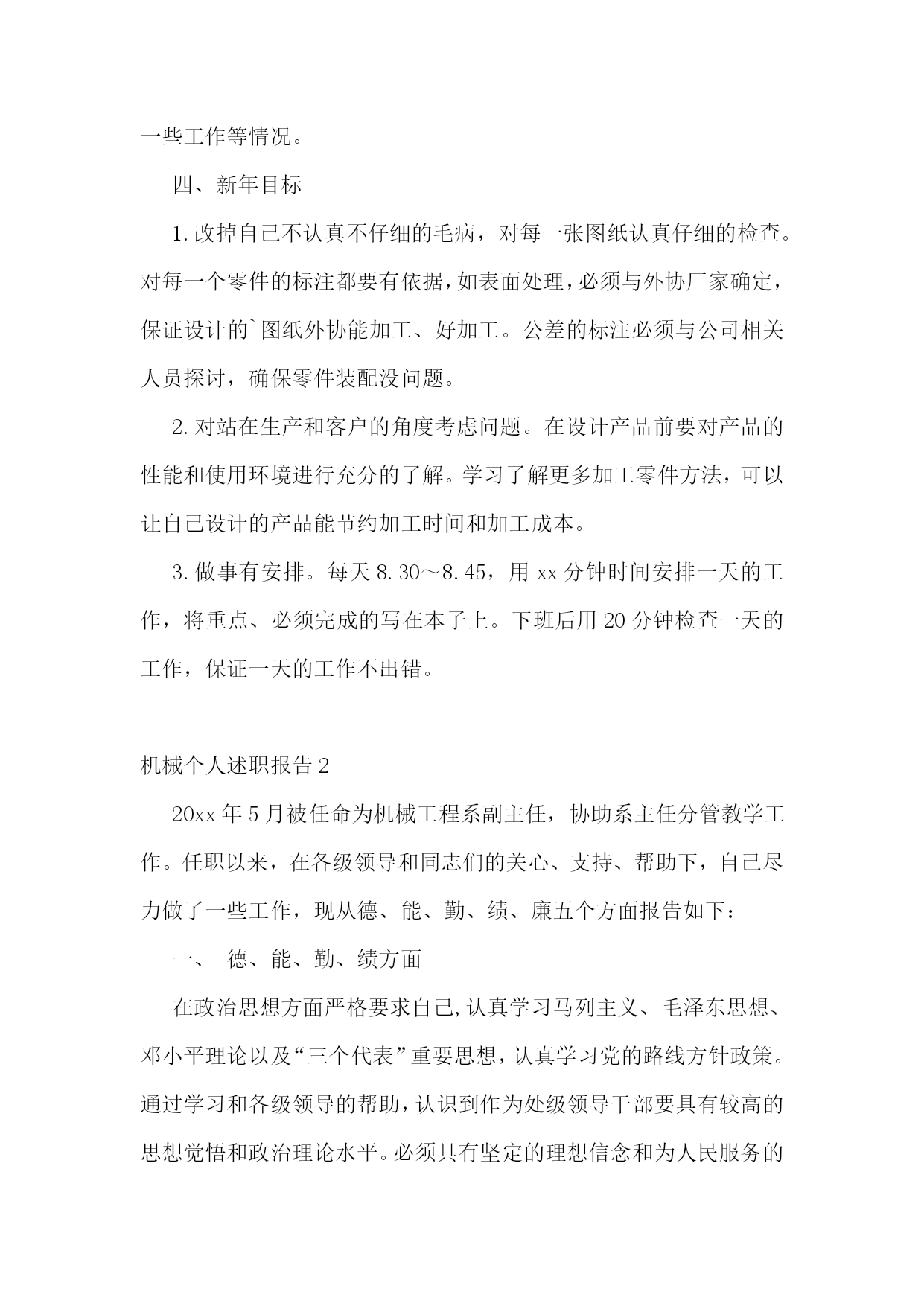 机械个人述职报告机械个人述职报告1忙忙碌碌间,我们即将走过充满感动和辛酸的20xx年。对我个人而言,这是值得总结和回味的一年。这一年在生活和工作上我都有了深刻的认识。生活中经历了离别与厮守,让我对现在的生活更加珍惜;经历了陪伴与关爱,让我更对未来的生活充满了期望。工作中尽力了失败与挫折,让我更快的成长;经历了帮助与体谅,让我更懂得团队的温暖。一、思想意识上的转变1.对工作的态度上,以前设计产品只考虑机械部分的设计,没有考虑走线、安装和调试。最近几次的设计工作在这方面都有了比较大的改进。2.在处理问题的方法上,以前总是怕领导和同事觉得自己没能力,遇到问题总是喜欢自己去考虑和解决。现在学会了遇到问题都拿出来和大家一起讨论。但是做的不好的是有时候觉得自己能处理的问题,按照自己的方法却没处理好。以后遇到在处理问题之前先将自己的方法体出来,征得大家的认可后再去实施,这样才能保证百密一疏。3.设计产品的理念上,以前只考虑结构能否合适,没有考虑产品外观,最近几次设计的产品在外观上也有了一定的进步,但还是有些不足。主要是由于对颜色的选取上没有经念。经常出现加工出来的颜色和选取的颜色有区别。二、工作的回顾与总结今年的主要工作有以下几个方面。1.完善3.0版本标线器(带L型连接板)从年初开始,我公司生产的常规标线器从2.0版本(不带L型板)切换至3.0版本(带L型板)。在生产和使用中去检验去我们的产品,发现并解决我们产品存在的一些问题。如。中间灯连接座厚度不合适,导致螺钉选取不便;调节螺钉需要加工且端面不平,更换成了机米螺钉;拨杆螺钉太短等等。经过20xx年上半年不断的改进。3.0版本标线器(带L型板)性能更加的稳定、做工更加的成熟、调节更加的方便。产品的质量和外观上都有了大大的提升。2.开发控制部分单独开盖标线器由于我们标线器控制部分和灯标部分为一体,客户在接线和检修时需要将标线器整个上壳体打开,给客户的检修和使用带来不便。在公司领导的提议下,我们开发出了。控制部分单独开盖标线器。这款标线器将控制部分和灯标部分的上壳体分开,这样在现场接线和检验就可以只打开控制部分。并且增加了气动支撑的使用。该产品在使用上更方便。不足之处就是壳体的加工较复杂,控制部分和灯标部分的上壳体之间的配合需要修磨。这样给产品的量产带来了不便。3.开发了5个灯的标线器客户需要将两个标线器放入一个箱体内,要求一个标线器打出5条激光线。该产品满足了客户的需求。诠释了以客户为中心,为客户量身打造产品的服务理念。4.完成德国大陆项目标线器由于客户需求的激光灯体积大,给我们的研发和生产都带来了全新的挑战。设计上开发思维,将几乎不可能安装下的激光灯安放下,并且没有影响标线器的性能和外观。由于L型板割掉,加工和调试难度都加大。但公司上下,群策群力,所有人都参与其中,为产品出主意。该项目生产过程充分体现了公司员工积极参与、团结创新的精神。5.完成高端标线器从研发到生产的过程高端标线器产品推向市场,使我公司生产的标线器迈向了一个新的台阶。为我们的产品竞争力增加了一个重要的砝码。也标志着我们的产品从大众化走向了尖端化。另外还完成了萨驰专用的调整架、开发新的激光灯、完善激光单灯等工作。三、不足之处在这一年的工作中,出现了很多失误的地方,主要表现在以下几个方面。1.不认真、不细心,常出现螺钉的长度数量标注错误、图纸的方向错误等低级问题。2.没有多站在生产和客户的角度考虑问题。往往在设计的一些产品,零件难加工、装配不方便、调试困难。在发给客户的产品,没有考虑到客户怎样安装调试,导致少发螺钉等情况。3.没有对工作进行有效的安排,只是拿到一件事做一件事情。所以经常造成一件事情未做完又做下一件,出现有些工作未完成、漏做一些工作等情况。四、新年目标1.改掉自己不认真不仔细的毛病,对每一张图纸认真仔细的检查。对每一个零件的标注都要有依据,如表面处理,必须与外协厂家确定,保证设计的`图纸外协能加工、好加工。公差的标注必须与公司相关人员探讨,确保零件装配没问题。2.对站在生产和客户的角度考虑问题。在设计产品前要对产品的性能和使用环境进行充分的了解。学习了解更多加工零件方法,可以让自己设计的产品能节约加工时间和加工成本。3.做事有安排。每天8.30~8.45,用xx分钟时间安排一天的工作,将重点、必须完成的写在本子上。下班后用20分钟检查一天的工作,保证一天的工作不出错。机械个人述职报告220xx年5月被任命为机械工程系副主任,协助系主任分管教学工作。任职以来,在各级领导和同志们的关心、支持、帮助下,自己尽力做了一些工作,现从德、能、勤、绩、廉五个方面报告如下:一、德、能、勤、绩方面在政治思想方面严格要求自己,认真学习马列主义、毛泽东思想、邓小