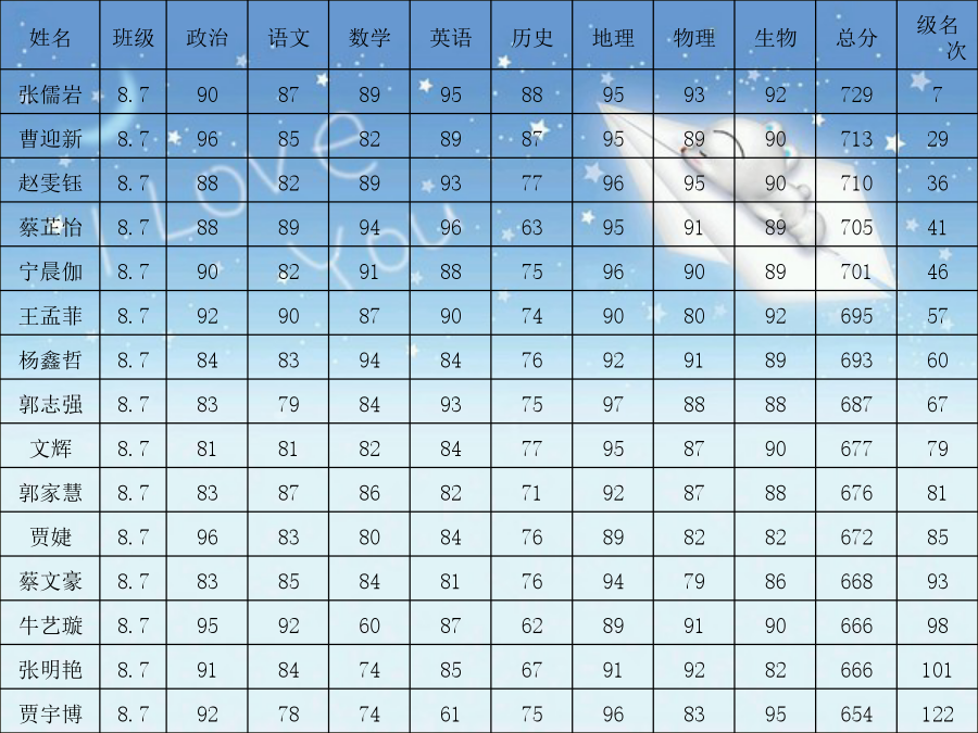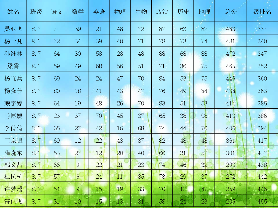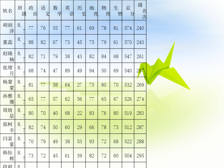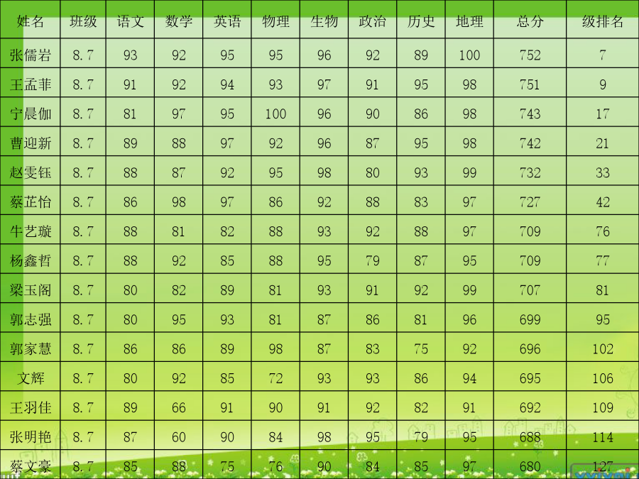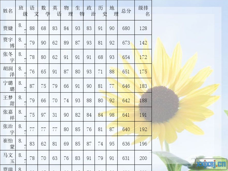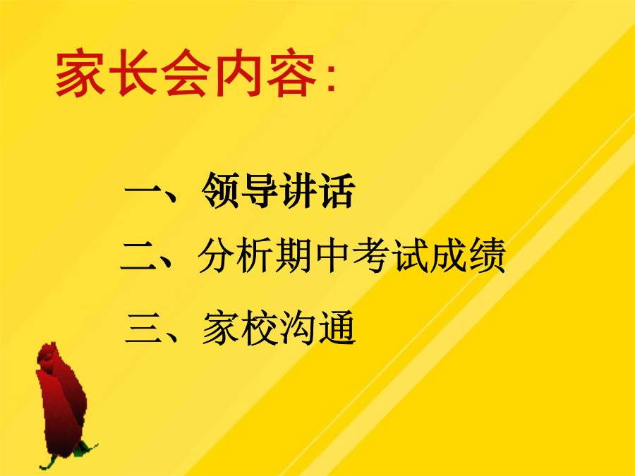家长会内容:本期期中考试成绩姓名上期期末考试成绩姓名姓名姓名姓名各单科第一请对孩子说几句话,留下你对孩子的期望!物理宁晨伽100生物赵雯钰98做到,树立孩子自信心,从而有利于小目标,这样可以使孩子感觉到能够4、经常给孩子制订几个容易达到的假若孩子在实际生活中确认,他的任性要求都能满足,他的不听话并未遭致任何不愉快的后果,那么就渐渐习惯于顽皮、任性、捣乱、不听话,之后就慢慢认为这是理所当然的。如果所列举的特征与孩子的行为相似愈多,父母就应该愈加注意,愈早防范。语言:爱说谎话,黑话,脏话,及喜欢说话时带有江湖气。孩子是祖国的未来,民族的希望,更是我们每一个家庭的寄托。7、家长要以身作则,给孩子做出榜样。孩子变坏前的10项征兆要使孩子每天都感觉到他在学习上取得了一定的进步,哪怕是改正一个缺点。王孟菲95曹迎新95如果一个孩子没有良好的家庭教育,那么不管老师付出多大的努力,都收不到完美的效果,学校里的一切问题都会在家庭里折射出来,而学校复杂的教育过程产生困难的根源也都可以追溯到家庭。请对孩子说几句话,留下你对孩子的期望!⒉严格控制孩子的零花钱、衣着、发式;3、学生思想上有放松现象,出现畏难情绪,信心不够坚定。4、有个别同学不能合理安排学习时间,晚上睡得晚导致上课打瞌睡,影响课堂效果;有的同学想提高成绩,但方法不对又不积极主动问老师和同学,时间一长就有放弃的心理。请对孩子说几句话,留下你对孩子的期望!假若孩子在实际生活中确认,他的任性要求都能满足,他的不听话并未遭致任何不愉快的后果,那么就渐渐习惯于顽皮、任性、捣乱、不听话,之后就慢慢认为这是理所当然的。--苏霍姆林斯基个别学生自我约束能力不够,易受影响。——著名教育家苏霍姆林斯基孩子变坏前的10项征兆如果所列举的特征与孩子的行为相似愈多,父母就应该愈加注意,愈早防范。穿着:太过于时髦,暴露,喜欢擅改衣服,穿制服时特别将胸前两个扣子解开。⒊控制同学聚会,过生日;尤其是中层的学生自我满足,部分学生成绩波动较大,偏科现象较突出;5、订下家庭学习规矩,并且自始至终执行,以形成良好的学习习惯,作息习惯。1、创造和睦、祥和、稳定的家庭气氛。习惯:有吸烟喝酒习惯,生活不正常,用钱需求量突增。⒉严格控制孩子的零花钱、衣着、发式;请对孩子说几句话,留下你对孩子的期望!外貌:发型怪异,身上有刺青,常有外伤。小目标,这样可以使孩子感觉到能够孩子的作业希望家长多关注一些。孩子是祖国的未来,民族的希望,更是我们每一个家庭的寄托。3、多关心孩子的学习内容和实际7、家长要以身作则,给孩子做出榜样。2、尽量表扬孩子,孩子具有一定的自信心,才会肯去学习;要使孩子每天都感觉到他在学习上取得了一定的进步,哪怕是改正一个缺点。3、多关心孩子的学习内容和实际进步程度,家长要多询问孩子最近学习了什么掌握得如何等。5、订下家庭学习规矩,并且自始至终执行,以形成良好的学习习惯,作息习惯。⒈帮孩子分析成绩,加强弱科的学习;孩子的作业希望家长多关注一些。孩子变坏前的10项征兆6.作息:早出晚归,常无端数日不归,白天蒙头大睡,黑间外出去向不交代清楚。7.物品:有不良刊物、刀具、药物、空胶罐、香烟酒类,甚至不明钱物或票据。8.课业:一下子成绩一落千丈,经常迟到早退、逃学、读书时间骤减。9.交友:有社会人士的朋友,、书信量突增,有朋友也不敢介绍给家人。10.习惯:有吸烟喝酒习惯,生活不正常,用钱需求量突增。如果所列举的特征与孩子的行为相似愈多,父母就应该愈加注意,愈早防范。孩子是祖国的未来,民族的希望,更是我们每一个家庭的寄托。在此衷心祝愿我们每一个孩子健康成长,每一个家庭幸福!真诚期待与您的合作谢谢您的光临!再见!谢谢观看