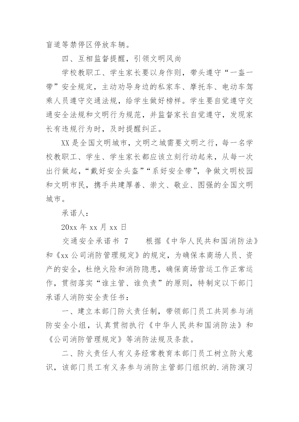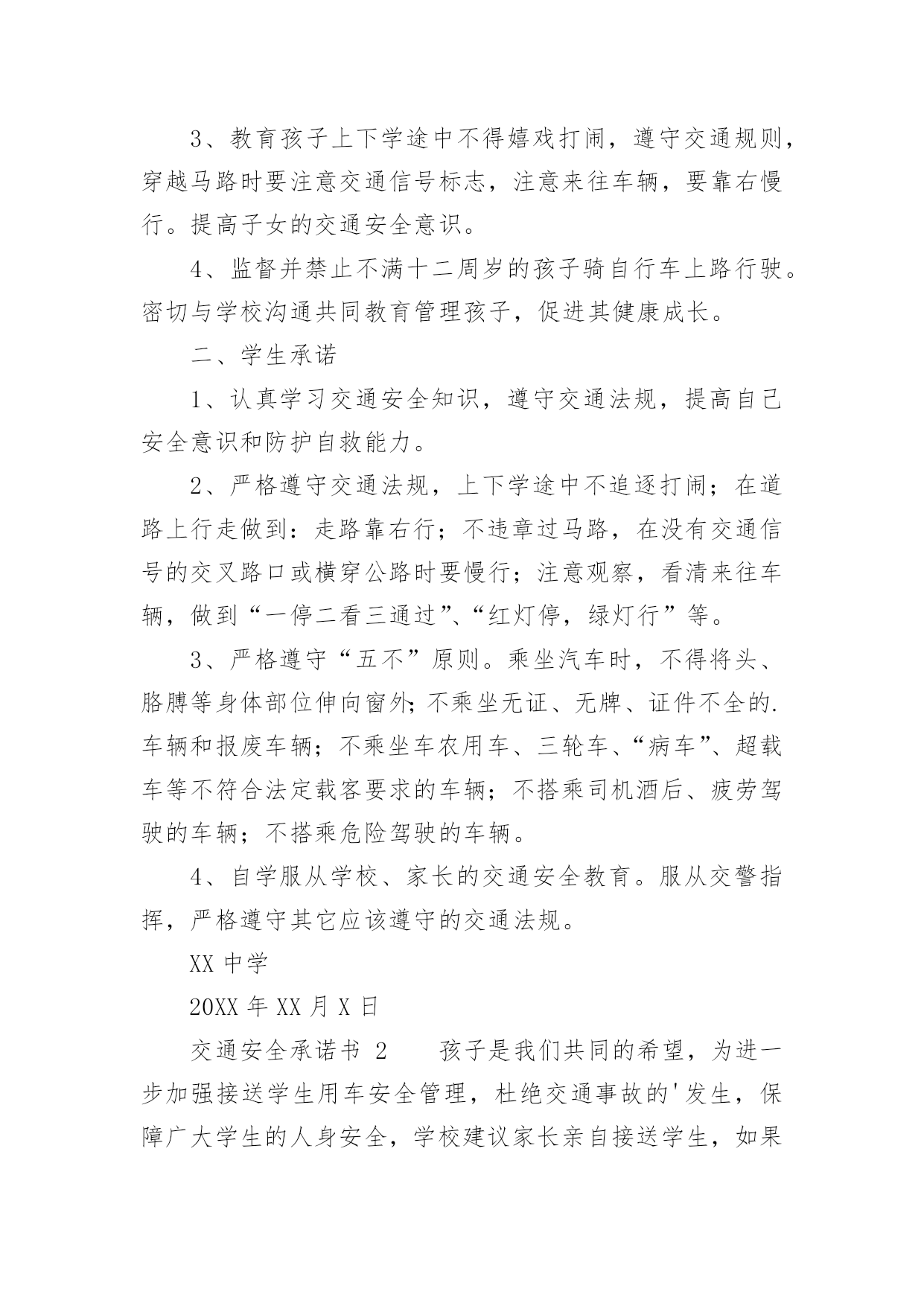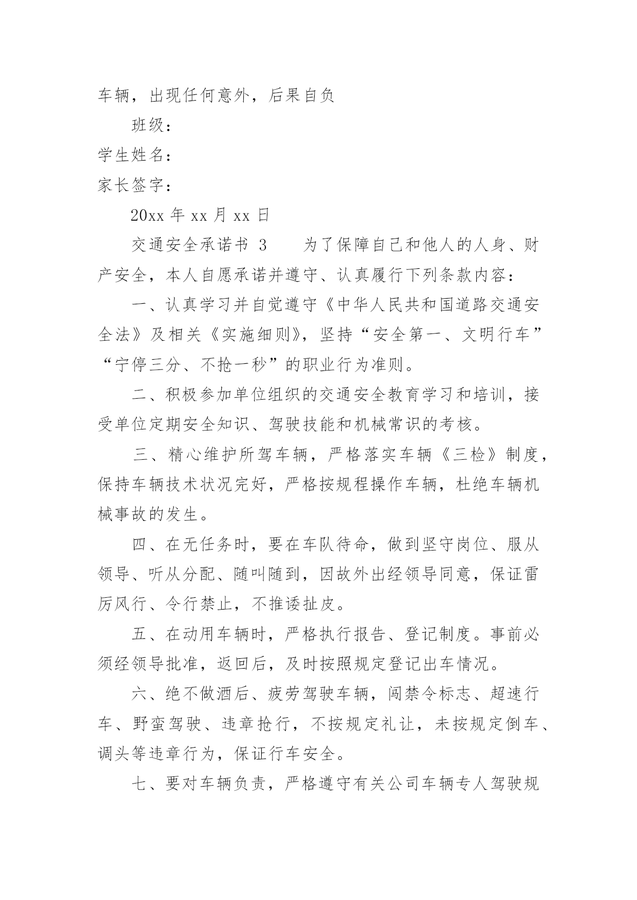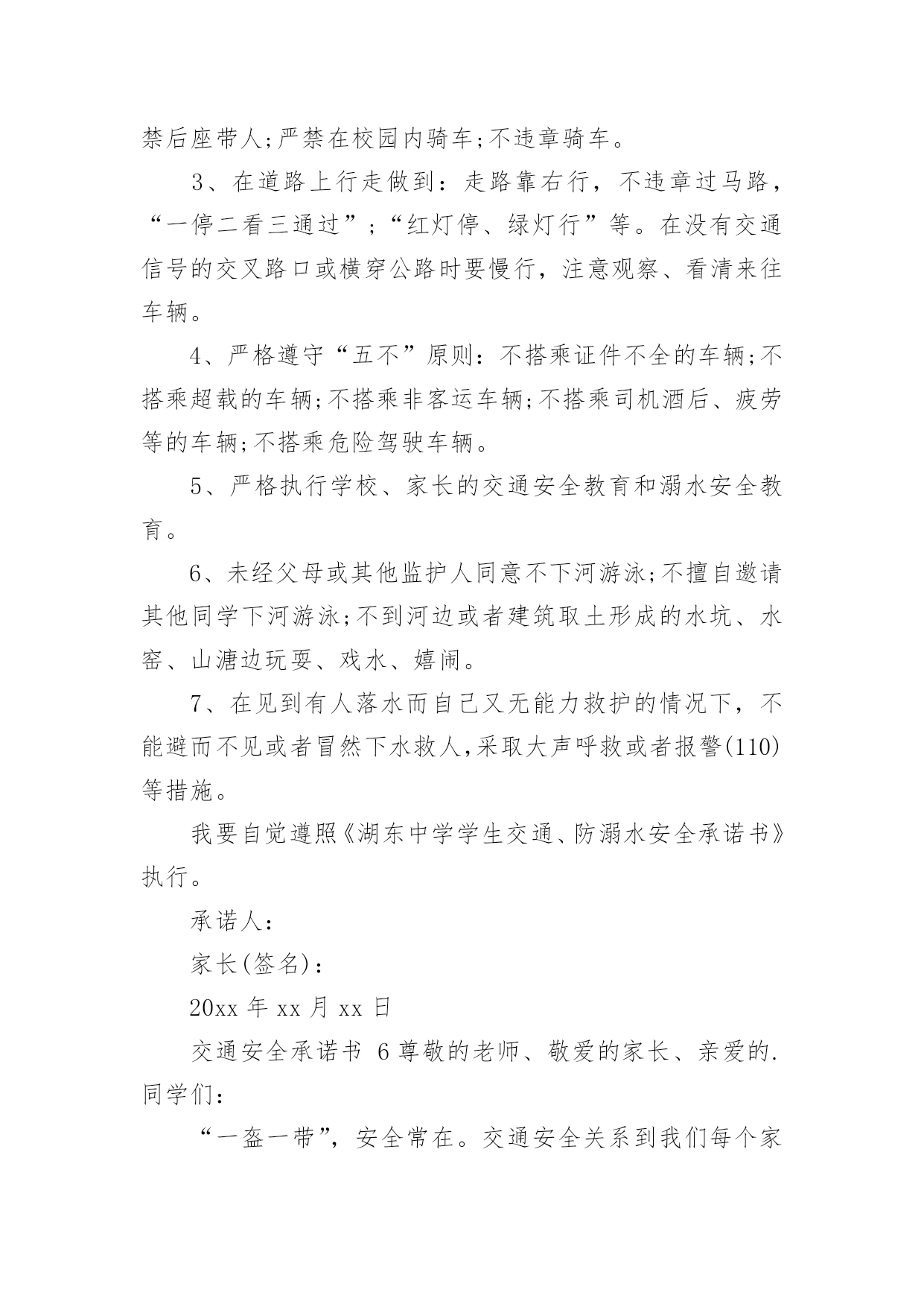 交通安全承诺书交通安全承诺书范文(通用12篇)在现实社会中,需要使用承诺书的场合越来越多,承诺书由标题、启语、正文、结语、署名、日期六部分组成。如何写一份恰当的承诺书呢?以下是小编帮大家整理的交通安全承诺书,欢迎大家分享。交通安全承诺书1安全无小事,交通安全从我做起。众多的事实告诉我们,交通事故的发生往往只是行人、车辆一念之间的疏忽、大意。为了进一步增强同学们的交通安全意识和遵守交通法规的自觉性,保障每一位同学的生命安全,保障学生上学、放学路上的交通安全,我校开展自觉遵守交通规则,文明出行的承诺活动。要求每一位学生及家长自觉做到以下承诺:一、家长承诺1、家长不使用无证、无牌、报废车辆、农用车、三轮车、手扶车、“病车”、超载车等不符合法定载客要求的车辆接送学生,不酒后驾驶车辆接送学生。2、对孩子履行监护人义务,保障孩子在校外的交通安全。配合学校加强对孩子的交通安全教育,督促孩子认真学习交通法规和交通安全知识,提高自己的安全意识和防护自救能力,时刻注意维护自己和他人的交通安全,并教育孩子自觉遵守交通安全法规。发现孩子的不良交通行为习惯,要及时教育并帮助纠正。3、教育孩子上下学途中不得嬉戏打闹,遵守交通规则,穿越马路时要注意交通信号标志,注意来往车辆,要靠右慢行。提高子女的交通安全意识。4、监督并禁止不满十二周岁的孩子骑自行车上路行驶。密切与学校沟通共同教育管理孩子,促进其健康成长。二、学生承诺1、认真学习交通安全知识,遵守交通法规,提高自己安全意识和防护自救能力。2、严格遵守交通法规,上下学途中不追逐打闹;在道路上行走做到:走路靠右行;不违章过马路,在没有交通信号的交叉路口或横穿公路时要慢行;注意观察,看清来往车辆,做到“一停二看三通过”、“红灯停,绿灯行”等。3、严格遵守“五不”原则。乘坐汽车时,不得将头、胳膊等身体部位伸向窗外;不乘坐无证、无牌、证件不全的.车辆和报废车辆;不乘坐车农用车、三轮车、“病车”、超载车等不符合法定载客要求的车辆;不搭乘司机酒后、疲劳驾驶的车辆;不搭乘危险驾驶的车辆。4、自学服从学校、家长的交通安全教育。服从交警指挥,严格遵守其它应该遵守的交通法规。XX中学20XX年XX月X日交通安全承诺书2孩子是我们共同的希望,为进一步加强接送学生用车安全管理,杜绝交通事故的'发生,保障广大学生的人身安全,学校建议家长亲自接送学生,如果您确实没有时间接送孩子,请您遵守如下条款。1、严禁家长让学生乘坐三轮摩的、低速载货汽车等车型和私自改装车辆以及达到报废标准的客车。2、严禁家长让学生乘坐报废车、无牌照车、超载车、驾驶员无证等非法运营车辆。3、严禁家长让学生早到校。学校开门时间为早7:20,中午1:00。4、严禁家长让学生在车来时,追车跑,上、下车时拥挤等现象。严禁学生在乘车时拥挤打闹,将身体的任何部位伸出车外。5、家长教育好学生在等车时不要追逐打闹或在公路上玩耍。6、家长要经常对学生进行乘车安全教育,教育学生遵守乘车秩序。7、家长要经常对接送学生车辆的车况、运营手续、乘坐人数等情况进行监督检查,发现问题立即向公安交管部门举报。8、家长应该按指定时间、地点接送学生,如延误接送时间或特殊情况(学生在放学后在校外被冒领、或出现任何意外事故)后果自负。9、家长必须与车主签订《安全行车协议书》,进一步划清责任主体,提高驾驶员的责任意识。10、家长如经济条件许可,应为子女办理意外伤害保险。11、如果您的孩子必须乘坐班车上学,请您为孩子选好车辆,出现任何意外,后果自负班级:学生姓名:家长签字:20xx年xx月xx日交通安全承诺书3为了保障自己和他人的人身、财产安全,本人自愿承诺并遵守、认真履行下列条款内容:一、认真学习并自觉遵守《中华人民共和国道路交通安全法》及相关《实施细则》,坚持“安全第一、文明行车”“宁停三分、不抢一秒”的职业行为准则。二、积极参加单位组织的交通安全教育学习和培训,接受单位定期安全知识、驾驶技能和机械常识的考核。三、精心维护所驾车辆,严格落实车辆《三检》制度,保持车辆技术状况完好,严格按规程操作车辆,杜绝车辆机械事故的发生。四、在无任务时,要在车队待命,做到坚守岗位、服从领导、听从分配、随叫随到,因故外出经领导同意,保证雷厉风行、令行禁止,不推诿扯皮。五、在动用车辆时,严格执行报告、登记制度。事前必须经领导批准,返回后,及时按照规定登记出车情况。六、绝不做酒后、疲劳驾驶车辆,闯禁令标志、超速行车、野蛮驾驶、违章抢行,不按规定礼让,未按规定倒车、调头等违章行为,保证行车安全。七、要对车辆负责,严格遵守有关公司车辆专人驾驶规定,绝不将所驾驶车辆交给非司机驾驶或未经单位考核批准的其他司机驾驶,如因特殊原因需要他人驾驶车辆的,必须经单位领导批准,办理好车辆交接手续后,方可交车。八、严格执行单位的.车辆安全管理规章