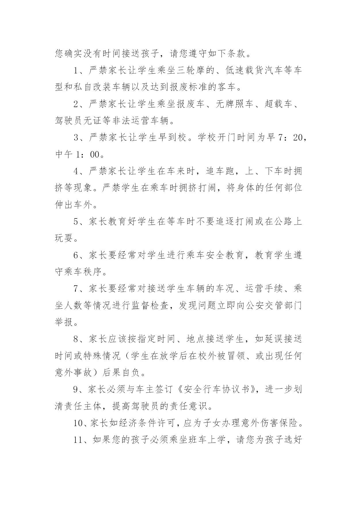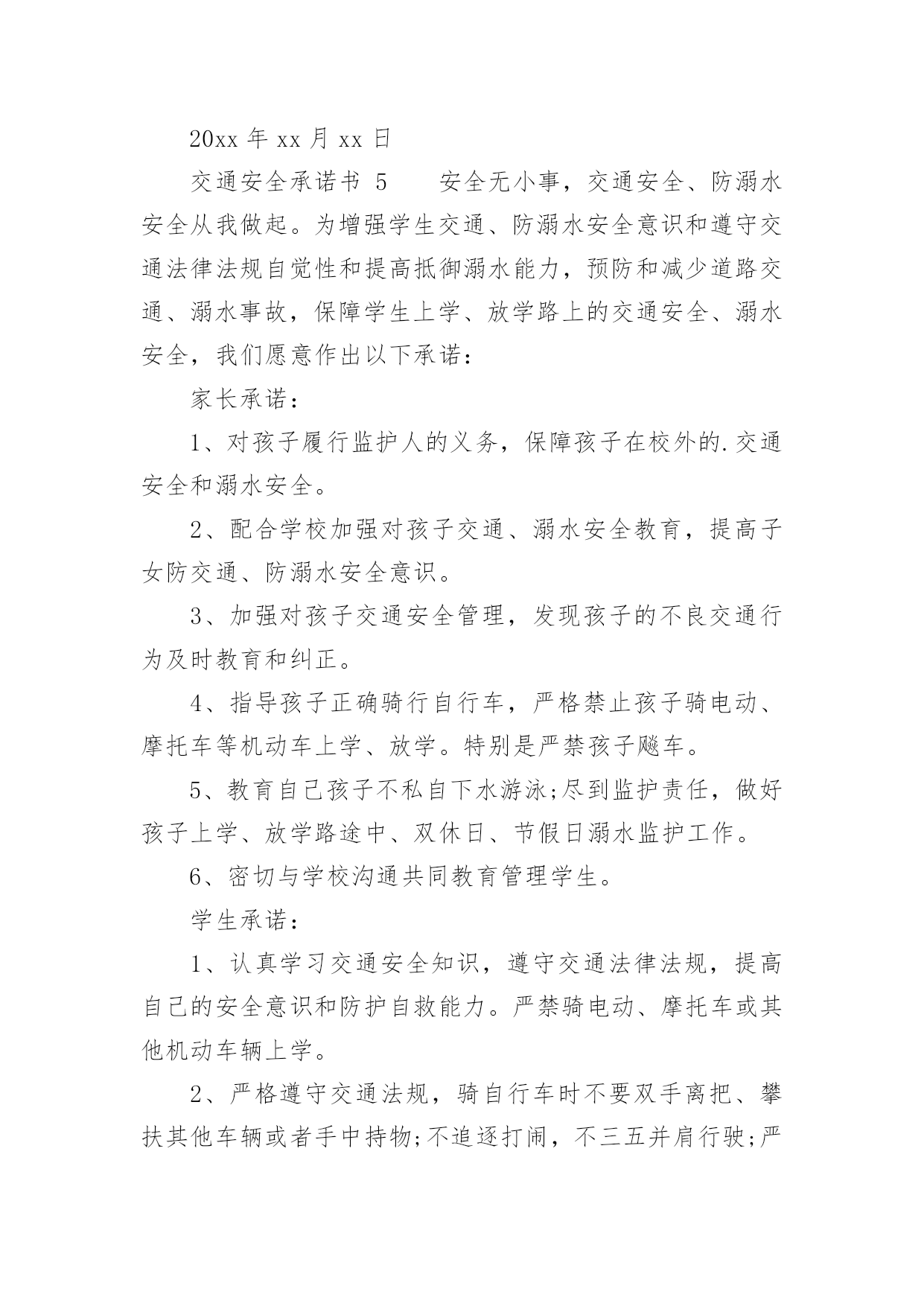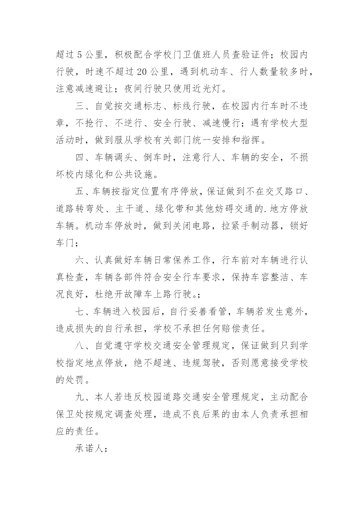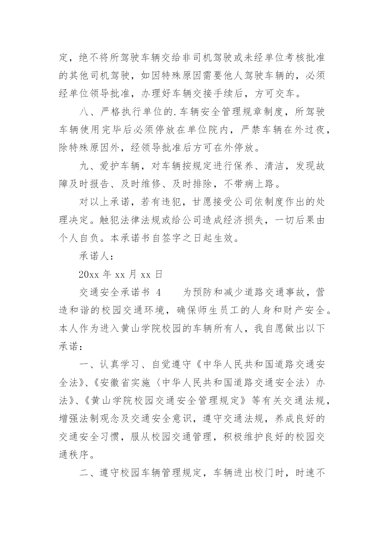 交通安全承诺书交通安全承诺书范文(通用12篇)在现实社会中,需要使用承诺书的场合越来越多,承诺书由标题、启语、正文、结语、署名、日期六部分组成。如何写一份恰当的承诺书呢?以下是小编帮大家整理的交通安全承诺书,欢迎大家分享。交通安全承诺书1安全无小事,交通安全从我做起。众多的事实告诉我们,交通事故的发生往往只是行人、车辆一念之间的疏忽、大意。为了进一步增强同学们的交通安全意识和遵守交通法规的自觉性,保障每一位同学的生命安全,保障学生上学、放学路上的交通安全,我校开展自觉遵守交通规则,文明出行的承诺活动。要求每一位学生及家长自觉做到以下承诺:一、家长承诺1、家长不使用无证、无牌、报废车辆、农用车、三轮车、手扶车、“病车”、超载车等不符合法定载客要求的车辆接送学生,不酒后驾驶车辆接送学生。2、对孩子履行监护人义务,保障孩子在校外的交通安全。配合学校加强对孩子的交通安全教育,督促孩子认真学习交通法规和交通安全知识,提高自己的安全意识和防护自救能力,时刻注意维护自己和他人的交通安全,并教育孩子自觉遵守交通安全法规。发现孩子的不良交通行为习惯,要及时教育并帮助纠正。3、教育孩子上下学途中不得嬉戏打闹,遵守交通规则,穿越马路时要注意交通信号标志,注意来往车辆,要靠右慢行。提高子女的交通安全意识。4、监督并禁止不满十二周岁的孩子骑自行车上路行驶。密切与学校沟通共同教育管理孩子,促进其健康成长。二、学生承诺1、认真学习交通安全知识,遵守交通法规,提高自己安全意识和防护自救能力。2、严格遵守交通法规,上下学途中不追逐打闹;在道路上行走做到:走路靠右行;不违章过马路,在没有交通信号的交叉路口或横穿公路时要慢行;注意观察,看清来往车辆,做到“一停二看三通过”、“红灯停,绿灯行”等。3、严格遵守“五不”原则。乘坐汽车时,不得将头、胳膊等身体部位伸向窗外;不乘坐无证、无牌、证件不全的.车辆和报废车辆;不乘坐车农用车、三轮车、“病车”、超载车等不符合法定载客要求的车辆;不搭乘司机酒后、疲劳驾驶的车辆;不搭乘危险驾驶的车辆。4、自学服从学校、家长的交通安全教育。服从交警指挥,严格遵守其它应该遵守的交通法规。XX中学20XX年XX月X日交通安全承诺书2孩子是我们共同的希望,为进一步加强接送学生用车安全管理,杜绝交通事故的'发生,保障广大学生的人身安全,学校建议家长亲自接送学生,如果您确实没有时间接送孩子,请您遵守如下条款。1、严禁家长让学生乘坐三轮摩的、低速载货汽车等车型和私自改装车辆以及达到报废标准的客车。2、严禁家长让学生乘坐报废车、无牌照车、超载车、驾驶员无证等非法运营车辆。3、严禁家长让学生早到校。学校开门时间为早7:20,中午1:00。4、严禁家长让学生在车来时,追车跑,上、下车时拥挤等现象。严禁学生在乘车时拥挤打闹,将身体的任何部位伸出车外。5、家长教育好学生在等车时不要追逐打闹或在公路上玩耍。6、家长要经常对学生进行乘车安全教育,教育学生遵守乘车秩序。7、家长要经常对接送学生车辆的车况、运营手续、乘坐人数等情况进行监督检查,发现问题立即向公安交管部门举报。8、家长应该按指定时间、地点接送学生,如延误接送时间或特殊情况(学生在放学后在校外被冒领、或出现任何意外事故)后果自负。9、家长必须与车主签订《安全行车协议书》,进一步划清责任主体,提高驾驶员的责任意识。10、家长如经济条件许可,应为子女办理意外伤害保险。11、如果您的孩子必须乘坐班车上学,请您为孩子选好车辆,出现任何意外,后果自负班级:学生姓名:家长签字:20xx年xx月xx日交通安全承诺书3为了保障自己和他人的人身、财产安全,本人自愿承诺并遵守、认真履行下列条款内容:一、认真学习并自觉遵守《中华人民共和国道路交通安全法》及相关《实施细则》,坚持“安全第一、文明行车”“宁停三分、不抢一秒”的职业行为准则。二、积极参加单位组织的交通安全教育学习和培训,接受单位定期安全知识、驾驶技能和机械常识的考核。三、精心维护所驾车辆,严格落实车辆《三检》制度,保持车辆技术状况完好,严格按规程操作车辆,杜绝车辆机械事故的发生。四、在无任务时,要在车队待命,做到坚守岗位、服从领导、听从分配、随叫随到,因故外出经领导同意,保证雷厉风行、令行禁止,不推诿扯皮。五、在动用车辆时,严格执行报告、登记制度。事前必须经领导批准,返回后,及时按照规定登记出车情况。六、绝不做酒后、疲劳驾驶车辆,闯禁令标志、超速行车、野蛮驾驶、违章抢行,不按规定礼让,未按规定倒车、调头等违章行为,保证行车安全。七、要对车辆负责,严格遵守有关公司车辆专人驾驶规定,绝不将所驾驶车辆交给非司机驾驶或未经单位考核批准的其他司机驾驶,如因特殊原因需要他人驾驶车辆的,必须经单位领导批准,办理好车辆交接手续后,方可交车。八、严格执行单位的.车辆安全管理规章