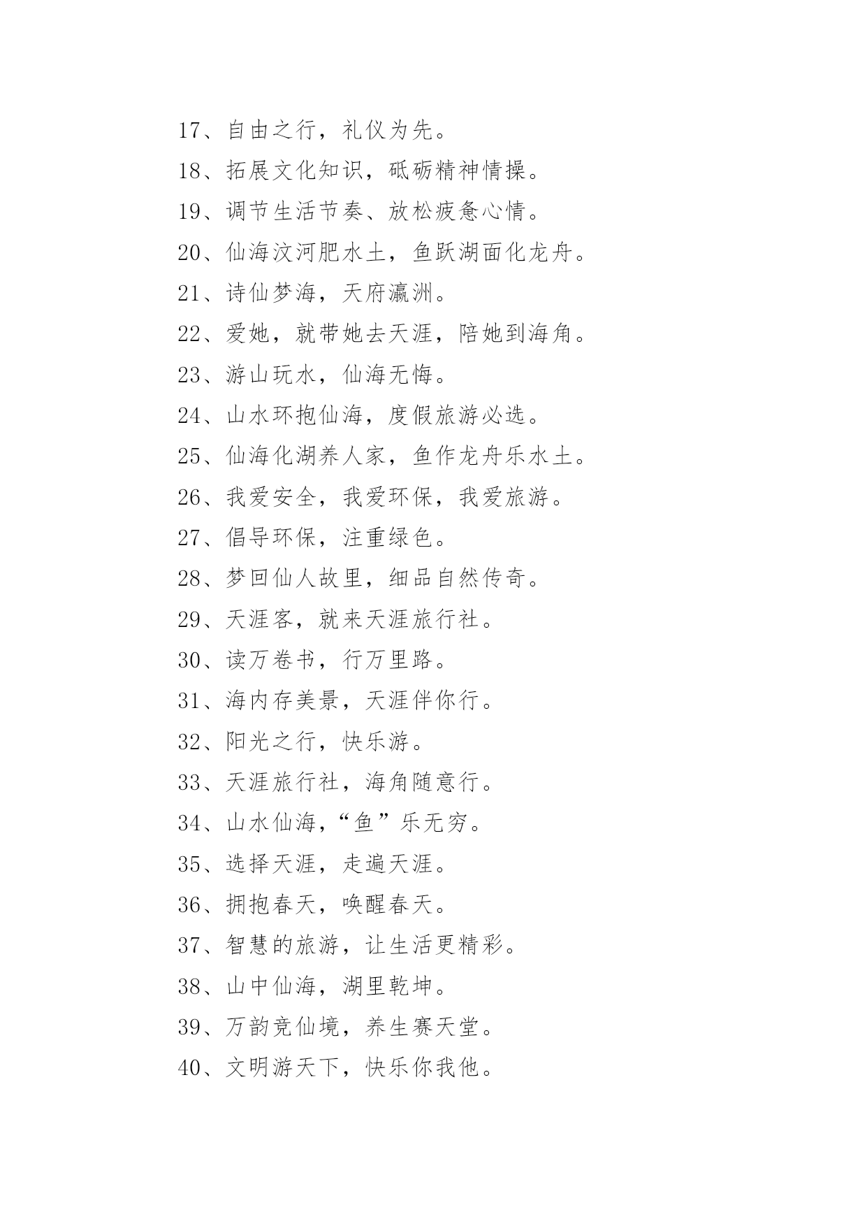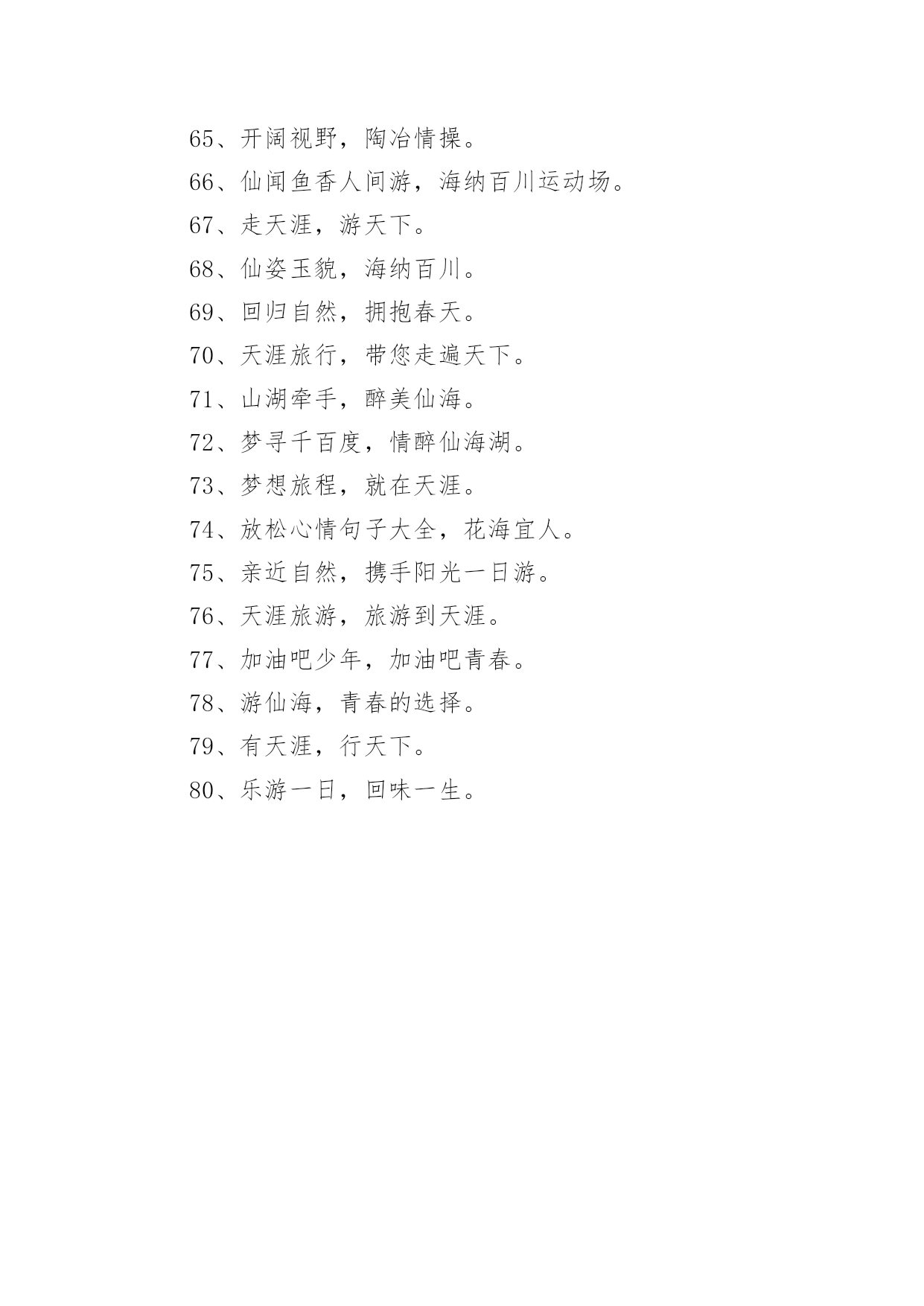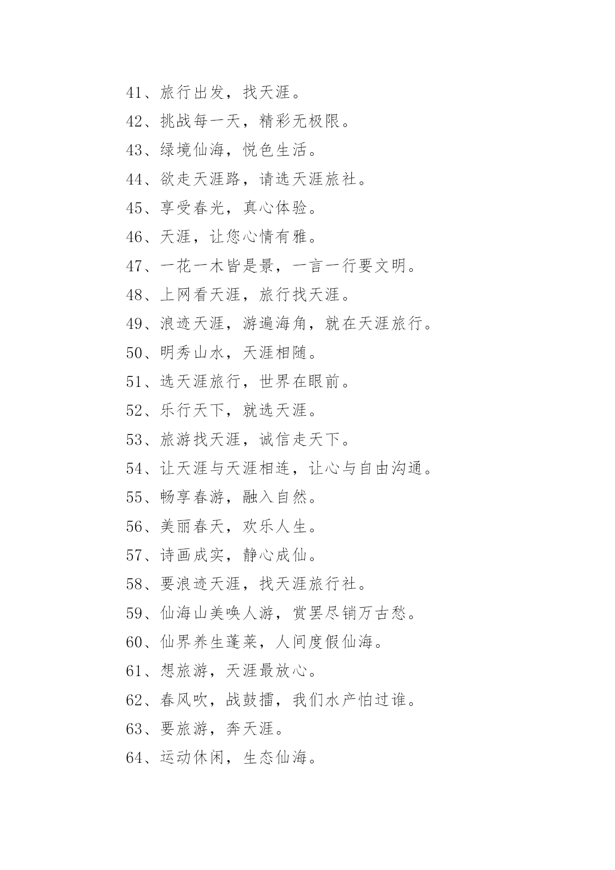 旅游宣传语旅游宣传语在充满活力,日益开放的今天,大家都对那些朗朗上口的宣传语很是熟悉吧,宣传语具有非常明显的时代特征和行业特色。那什么样的`宣传语才具有启发意义呢?以下是小编精心整理的旅游宣传语,仅供参考,大家一起来看看吧。1、怡山悦水,灵动仙海。2、爱我家园,保护环境。3、从这里出发,踏迹天涯。4、走进天涯,走向天涯。5、团结互助,我们是新一代的长征人。6、海内存寻知己,天涯任你行。7、君行天下,天涯相伴。8、来绵阳仙海,给身体一个深呼吸的机会。9、要旅游,找天涯旅行社。10、旅游美时美刻,文明随时随地。11、绵阳有天山,苍茫仙海间。12、骑妙之旅,看仙海。13、旅游来仙海,生活更多彩。14、到天涯,哪里都是家。15、天涯旅行,与您随行。16、天涯旅行,智慧人生。17、自由之行,礼仪为先。18、拓展文化知识,砥砺精神情操。19、调节生活节奏、放松疲惫心情。20、仙海汶河肥水土,鱼跃湖面化龙舟。21、诗仙梦海,天府瀛洲。22、爱她,就带她去天涯,陪她到海角。23、游山玩水,仙海无悔。24、山水环抱仙海,度假旅游必选。25、仙海化湖养人家,鱼作龙舟乐水土。26、我爱安全,我爱环保,我爱旅游。27、倡导环保,注重绿色。28、梦回仙人故里,细品自然传奇。29、天涯客,就来天涯旅行社。30、读万卷书,行万里路。31、海内存美景,天涯伴你行。32、阳光之行,快乐游。33、天涯旅行社,海角随意行。34、山水仙海,“鱼”乐无穷。35、选择天涯,走遍天涯。36、拥抱春天,唤醒春天。37、智慧的旅游,让生活更精彩。38、山中仙海,湖里乾坤。39、万韵竞仙境,养生赛天堂。40、文明游天下,快乐你我他。41、旅行出发,找天涯。42、挑战每一天,精彩无极限。43、绿境仙海,悦色生活。44、欲走天涯路,请选天涯旅社。45、享受春光,真心体验。46、天涯,让您心情有雅。47、一花一木皆是景,一言一行要文明。48、上网看天涯,旅行找天涯。49、浪迹天涯,游遍海角,就在天涯旅行。50、明秀山水,天涯相随。51、选天涯旅行,世界在眼前。52、乐行天下,就选天涯。53、旅游找天涯,诚信走天下。54、让天涯与天涯相连,让心与自由沟通。55、畅享春游,融入自然。56、美丽春天,欢乐人生。57、诗画成实,静心成仙。58、要浪迹天涯,找天涯旅行社。59、仙海山美唤人游,赏罢尽销万古愁。60、仙界养生蓬莱,人间度假仙海。61、想旅游,天涯最放心。62、春风吹,战鼓擂,我们水产怕过谁。63、要旅游,奔天涯。64、运动休闲,生态仙海。65、开阔视野,陶冶情操。66、仙闻鱼香人间游,海纳百川运动场。67、走天涯,游天下。68、仙姿玉貌,海纳百川。69、回归自然,拥抱春天。70、天涯旅行,带您走遍天下。71、山湖牵手,醉美仙海。72、梦寻千百度,情醉仙海湖。73、梦想旅程,就在天涯。74、放松心情句子大全,花海宜人。75、亲近自然,携手阳光一日游。76、天涯旅游,旅游到天涯。77、加油吧少年,加油吧青春。78、游仙海,青春的选择。79、有天涯,行天下。80、乐游一日,回味一生。