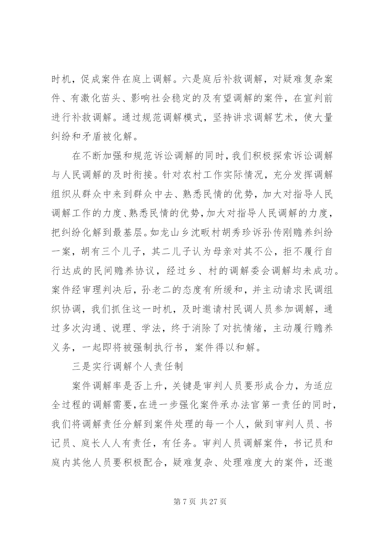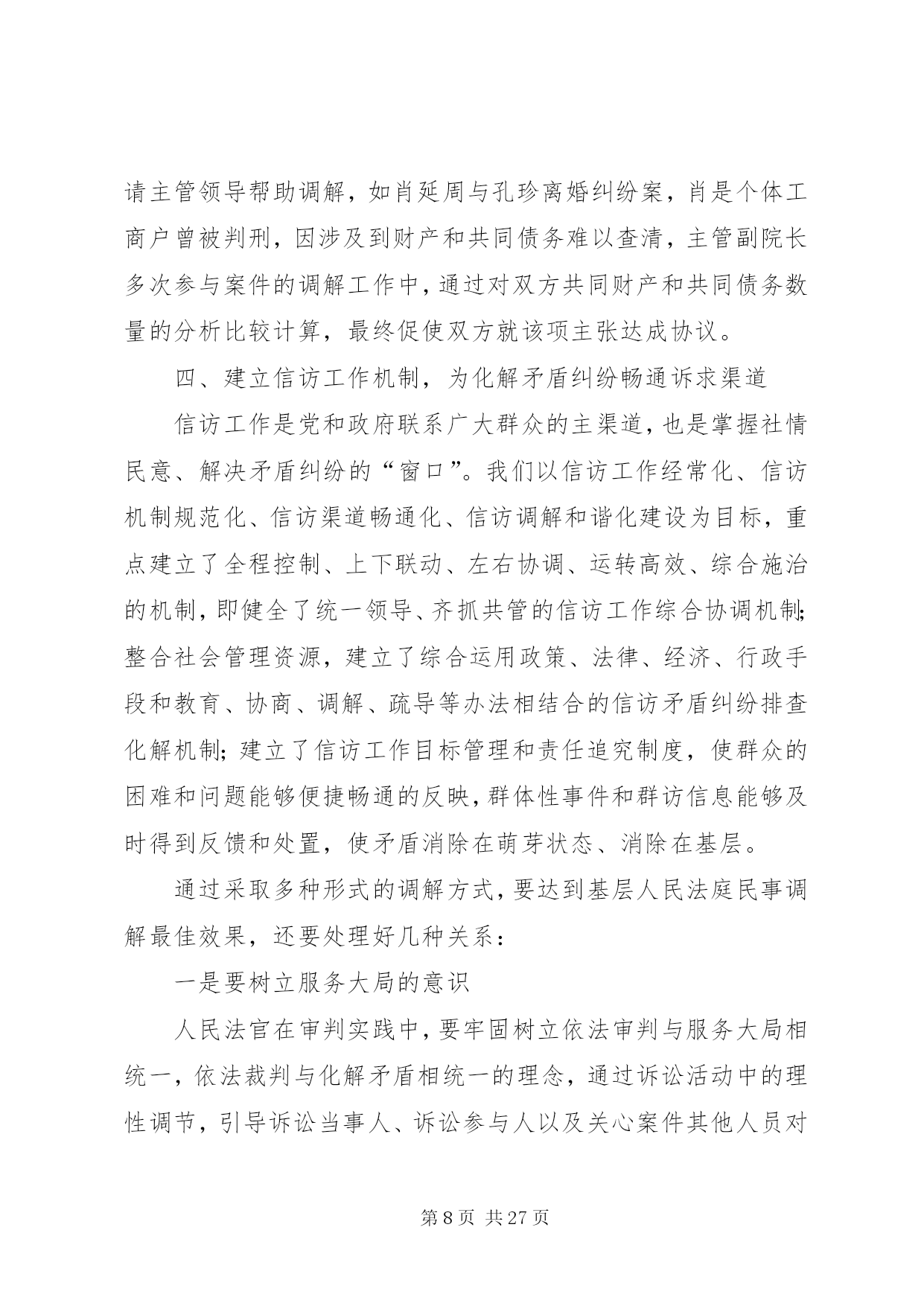 第PAGE\*Arabic\*MERGEFORMAT27页共NUMPAGES\*MERGEFORMAT27页关于调解结案促进司法和谐的思考加大调解力度,促进司法和谐王丹王长君随着“构建和谐社会”重大举措的提出,调解结案也成为法院青睐的结案方式,而调解也就成了“司法和谐”的代名词,各级法院均采取各种有效的方式,实现调解效益最大化,取得了较好的效果,但同时也存在一些问题与不足整体原因1.调解需要一定的时间,在不断加强审判流程管理、强化审限管理的同时,工作效率的提高越来越受到重视,调解的工作力度在一定程度上被削弱。2.案件数量的不断增加与警力相对紧缺的矛盾进一步突出,使法官应接不暇,没有时间过多地做当事人的调解工作,从而忽视了调解工作,甚至流于程序,客观上造成调解不能,从而降低调解结案率。3.调解需要当事人对法官的信任,而目前法院的司法权威和法官的社会公信力与社会及当事人的期望值有较大的差距,对法院及法官还有一种不太信任的态度,怕调解使自己吃亏。4.案件承办人员对司法政策的理解不够全面,除部分案件应当先调解外,认为其它案件调解并非必经程序,或认为调解过多有损法院形象,更体现不出法律的权威性或说强制性的一面。5.“人情”的干预,导致部分法官不当行使调解的权利,也影响了当事人自由处分权的行使。6.法律意识不断增强,经济进一步发展,诉讼的目的不再主要是经济利益,很大程度上打官司是“打个名气、掰个输赢”,当事人不愿调解。个体(具体案件)原因1.债务及经济纠纷案件调解率较高,但调解率浮动幅度较大。原因是债务案件是一种既期、短期利益,责任明确,争议不大,只是暂时给付不能,相对来说调解结案较容易,案件调解率也较高,但从调解率浮动幅度较大,主要原因是前几年金融机构贷款纠纷案件大量积累,为及时追回贷款,化解金融风险,保护自己的合法权益,大量纠纷涌向向法院,有时占当年法院此类案件的绝大部分,此类案件基本都能调解结案,从而使当年案件调解率大幅度上升;从2003年以后,此类案件诉讼高峰期结束,即使有也仅占此类案件的极少部分,也导致了案件调解率和案件数量的大幅度降低。2.离婚、相邻案件调解率较低且较稳定。其原因是随着经济的发展和改革开放的进一步深化,西方的婚姻观念不断冲击着我国传统的婚姻观念,人们对婚姻观念有较大的转变,其权利意识进一步增强,婚姻自由越来越成为追求的目标,人性化得到充分体现,从而导致离婚案件的增加。再加上妇女地位的提高,人身、财产的独立性得到空前增强,对男子的依附性大大减弱,这也成为离婚的“催化剂”。在案件诉讼过程中,双方对离婚与否绝大多数能达成共识,但财产分割、孩子抚养就成为争议的焦点,从而导致调解不能,直接的反映就是调解率较低且稳定;相邻案件的双方当事人主要是隔壁两邻,有的还是亲属关系,其所争议的标的是具有长期性,甚至关系到子孙后代的长远利益,所以当事人在处分自己的权利时非常谨慎,出现“宁伤感情也不损后代利益”局面,故造成案件调解的难度增大,案件调解率较低的原因。3.侵权赔偿纠纷案件的调解率居中且基本稳定。侵权赔偿案件特别是人身损害赔偿案件既涉及到财产权更涉及到人身权,产生纠纷的原因是平时积怨的结果,“百尺之冰,非一日之寒”,在诉讼过程中分歧较大,不容易调解结案,打官司的目的不仅是财产利益更是精神(心理)利益,甚至是打官司是“打个名气、掰个输赢、讨个说法”,判决效果更好,当事人根本不愿调解,故此类案件调解率较低。4.其它案件(主要是特殊侵权等新类型案件)的调解率不稳定,波动幅度较大。随着我国法制进程的不断推进,法院受理案件范围越来越广,新类型案件层出不穷,且越来越专业化,每年所出现的新类型案件没有一定的规律性,具有较大的偶然性,且不同的案件的调解方法也有较大的差异性,甚至部分案件(特别程序)依法根本就不适用调解,调解率波动幅度较大就成了势在必然。存在的问题与不足在调解工作中存在两种倾向。一是过于强调调解率,以调解结案作为评定工作和法官能力发主要指标。这就会使一些案件承办人员为了调解结案,出现强制调解的情况,如在审判实践中出现的“以拖压调”、“以判压调”、“以劝压调”、“以诱压调”等,甚至因法院内部审限及畏难情绪也会出现而对当事人采取强迫调解的现象;强调调解结案只是一种结案方式,辩证看待调解工作虽然能够产生良好的法律效果和社会效果,但它并不是一个终极目标,审判活动的终极目标是实现公正和效率,不能为了完成调解结案的指标而久调不决,拖延时间;也不能违法调解,压制当事人,给当事人留下“和稀泥”的印象,让当事人心有不甘;二是忽视调解工作,使调解成为走形式。调解本来就是当事人之间一个互让互谅的过程,为使纠纷解决,必定有双方在利益上有所让步,而法官一旦把握不好第二篇:强化民事调解促进司法和谐强化民事调解促进司法和谐最高人民法院