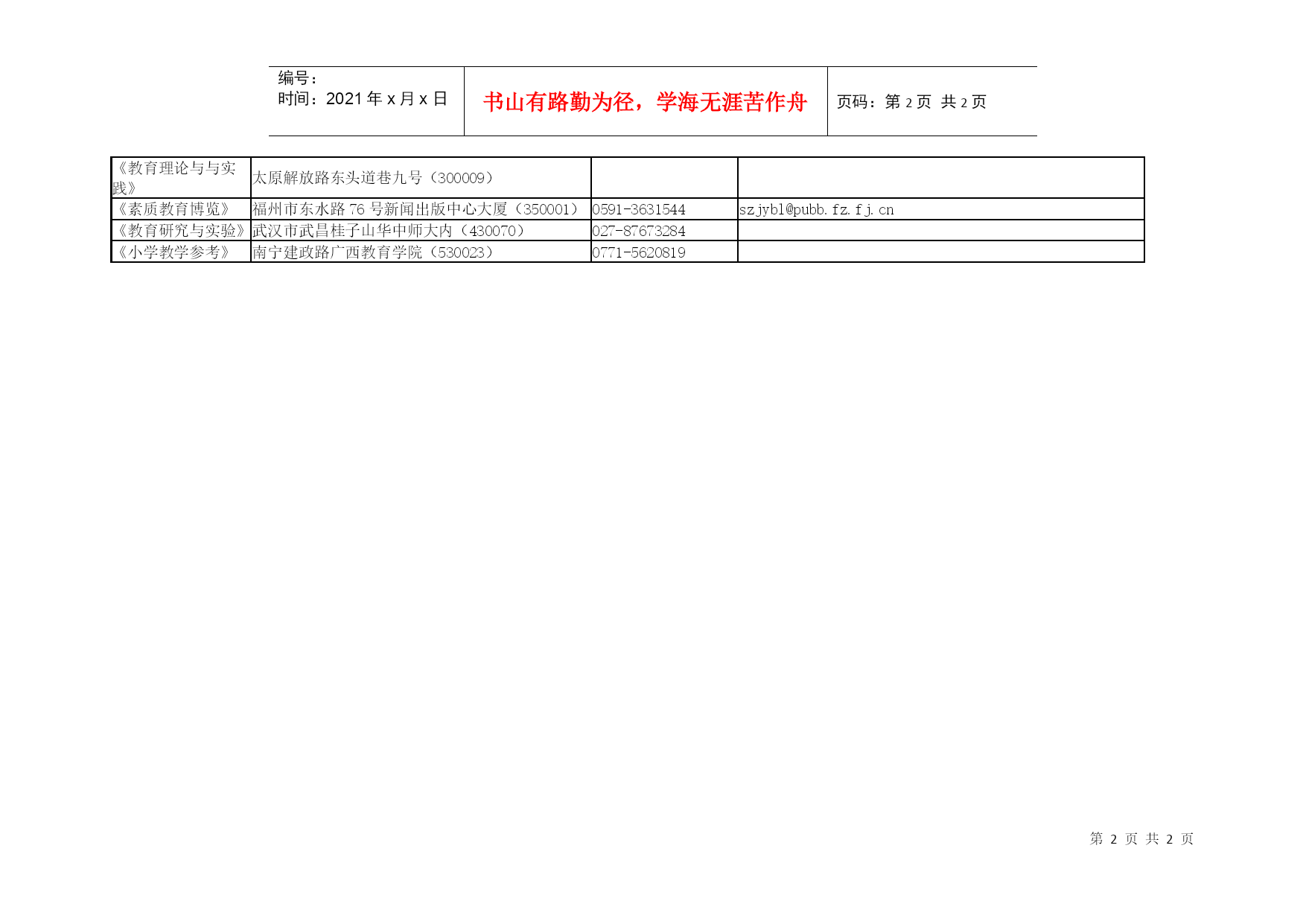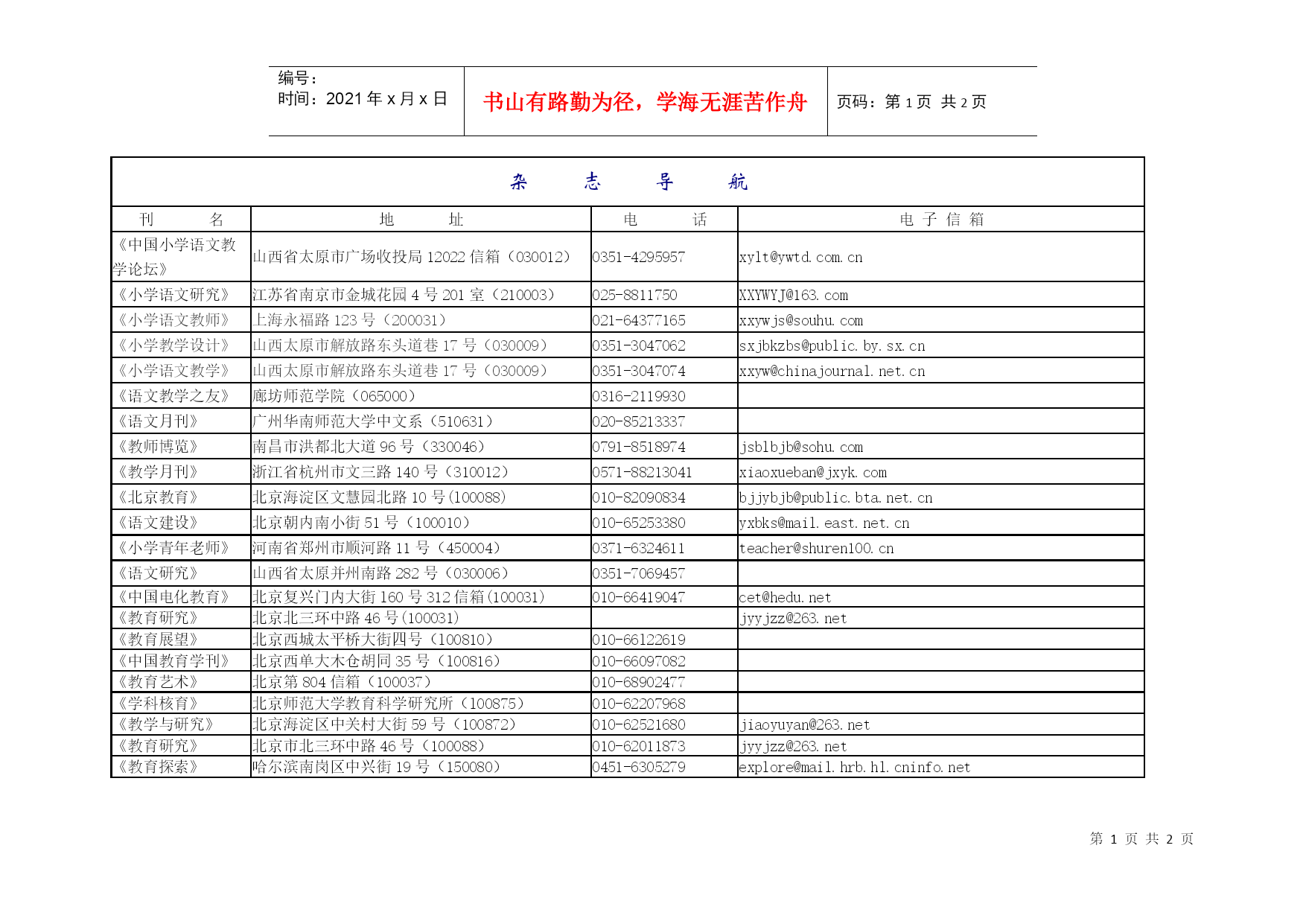 编号:时间:2021年x月x日书山有路勤为径,学海无涯苦作舟页码:第PAGE2页共NUMPAGES2页第PAGE\*MERGEFORMAT2页共NUMPAGES\*MERGEFORMAT2页杂志导航刊名地址电话电子信箱《中国小学语文教学论坛》山西省太原市广场收投局12022信箱(030012)0351-4295957HYPERLINK"mailto:xylt@ywtd.com.cn"xylt@ywtd.com.cn《小学语文研究》江苏省南京市金城花园4号201室(210003)025-8811750HYPERLINK"mailto:XXYWYJ@163.com"XXYWYJ@163.com《小学语文教师》上海永福路123号(200031)021-64377165HYPERLINK"mailto:xxywjs@souhu.com"xxywjs@souhu.com《小学教学设计》山西太原市解放路东头道巷17号(030009)0351-3047062HYPERLINK"mailto:sxjbkzbs@public.by.sx.cn"sxjbkzbs@public.by.sx.cn《小学语文教学》山西太原市解放路东头道巷17号(030009)0351-3047074HYPERLINK"mailto:xxyw@chinajournal.net.cn"xxyw@chinajournal.net.cn《语文教学之友》廊坊师范学院(065000)0316-2119930《语文月刊》广州华南师范大学中文系(510631)020-85213337《教师博览》南昌市洪都北大道96号(330046)0791-8518974HYPERLINK"mailto:jsblbjb@sohu.com"jsblbjb@sohu.com《教学月刊》浙江省杭州市文三路140号(310012)0571-88213041HYPERLINK"mailto:xiaoxueban@jxyk.com"xiaoxueban@jxyk.com《北京教育》北京海淀区文慧园北路10号(l00088)010-82090834HYPERLINK"mailto:bjjybjb@public.bta.net.cn"bjjybjb@public.bta.net.cn《语文建设》北京朝内南小街51号(100010)010-65253380HYPERLINK"mailto:yxbks@mail.east.net.cn"yxbks@mail.east.net.cn《小学青年老师》河南省郑州市顺河路11号(450004)0371-6324611HYPERLINK"mailto:teacher@shuren100.cn"teacher@shuren100.cn《语文研究》山西省太原并州南路282号(030006)0351-7069457《中国电化教育》北京复兴门内大街l60号312信箱(100031)010-66419047HYPERLINK"mailto:cet@hedu.net"cet@hedu.net《教育研究》北京北三环中路46号(100031)HYPERLINK"mailto:jyyjzz@263.net"jyyjzz@263.net《教育展望》北京西城太平桥大街四号(l00810)010-66l22619《中国教育学刊》北京西单大木仓胡同35号(l00816)010-66097082《教育艺术》北京第804信箱(100037)010-68902477《学科核育》北京师范大学教育科学研究所(l00875)010-62207968《教学与研究》北京海淀区中关村大街59号(100872)010-62521680HYPERLINK"mailto:jiaoyuyan@263.net"jiaoyuyan@263.net《教育研究》北京市北三环中路46号(100088)010-62011873HYPERLINK"mailto:jyyjzz@263.net"jyyjzz@263.net《教育探索》哈尔滨南岗区中兴街19号(150080)0451-6305279HYPERLINK"mailto:explore@mail.hrb.hl.cninfo.net"explore@mail.hrb.hl.cninfo.net《教育理论与与实践》太原解放路东头道巷九号(300009)《素质教育博览》福州市东水路76号新闻出版中心大厦(350001)0591-3631544HYPERLINK"mailto:szjybl@pubb.fz.fj.cn"szjybl@pubb.fz.fj.cn《教育研究与