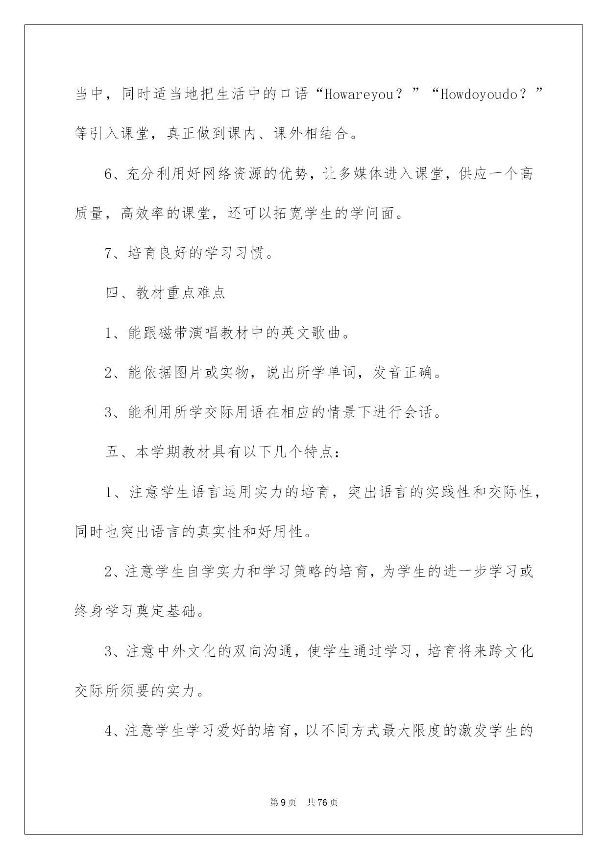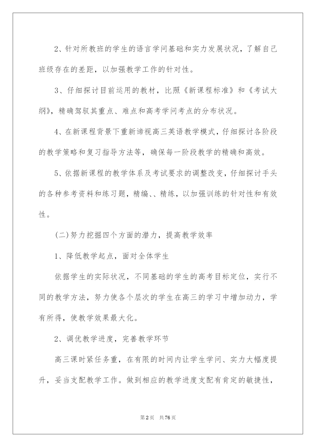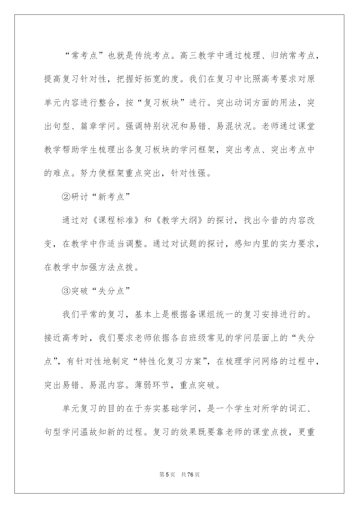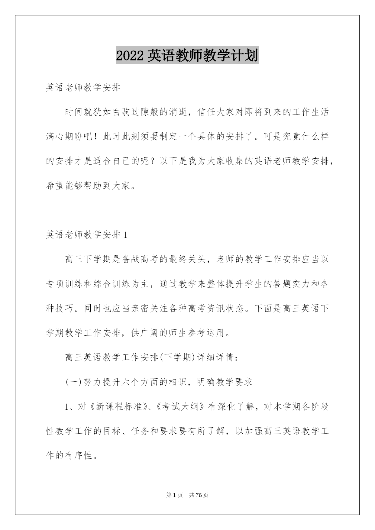 第PAGE\*Arabic\*MERGEFORMAT76页共NUMPAGES\*Arabic\*MERGEFORMAT76页第PAGE\*MERGEFORMAT76页共NUMPAGES\*MERGEFORMAT76页第PAGE\*MERGEFORMAT76页共NUMPAGES\*MERGEFORMAT76页第PAGE\*MERGEFORMAT76页共NUMPAGES\*MERGEFORMAT76页第PAGE\*MERGEFORMAT76页共NUMPAGES\*MERGEFORMAT76页第PAGE\*MERGEFORMAT76页共NUMPAGES\*MERGEFORMAT76页第PAGE\*MERGEFORMAT76页共NUMPAGES\*MERGEFORMAT76页第PAGE\*MERGEFORMAT76页共NUMPAGES\*MERGEFORMAT76页第PAGE\*MERGEFORMAT76页共NUMPAGES\*MERGEFORMAT76页第PAGE\*MERGEFORMAT76页共NUMPAGES\*MERGEFORMAT76页第PAGE\*MERGEFORMAT76页共NUMPAGES\*MERGEFORMAT76页2022英语教师教学计划英语老师教学安排时间就犹如白驹过隙般的消逝,信任大家对即将到来的工作生活满心期盼吧!此时此刻须要制定一个具体的安排了。可是究竟什么样的安排才是适合自己的呢?以下是我为大家收集的英语老师教学安排,希望能够帮助到大家。英语老师教学安排1高三下学期是备战高考的最终关头,老师的教学工作安排应当以专项训练和综合训练为主,通过教学来整体提升学生的答题实力和各种技巧。同时也应当亲密关注各种高考资讯状态。下面是高三英语下学期教学工作安排,供广阔的师生参考运用。高三英语教学工作安排(下学期)详细详情:(一)努力提升六个方面的相识,明确教学要求1、对《新课程标准》、《考试大纲》有深化了解,对本学期各阶段性教学工作的目标、任务和要求要有所了解,以加强高三英语教学工作的有序性。2、针对所教班的学生的语言学问基础和实力发展状况,了解自己班级存在的差距,以加强教学工作的针对性。3、仔细探讨目前运用的教材,比照《新课程标准》和《考试大纲》,精确驾驭其重点、难点和高考学问考点的分布状况。4、在新课程背景下重新谛视高三英语教学模式,仔细探讨各阶段的教学策略和复习指导方法等,确保每一阶段教学的精确和高效。5、依据新课程的教学体系及考试要求的调整改变,仔细探讨手头的各种参考资料和练习题,精编、、精练,以加强训练的针对性和有效性。(二)努力挖掘四个方面的潜力,提高教学效率1、降低教学起点,面对全体学生依据学生的实际状况,不同基础的学生的高考目标定位,实行不同的教学方法,努力使各个层次的学生在高三的学习中增加动力,学有所得,使教学效果最大化。2、调优教学进度,完善教学环节高三课时紧任务重,在有限的时间内让学生学问、实力大幅度提升,妥当支配教学工作。做到相应的教学进度支配有肯定的敏捷性,从学生的学习效果考虑,不盲目赶进度,该快则快,需慢则慢。一切为提高近期和远期的教学目标服务。3、加强教学反思,讲求教学实效高三学生的时间无比宝贵,我将努力通过反思教学发觉教学活动中存在的问题,刚好调整教学方案,主动将教学效果最优化作为工作目标。在备课中反思已备内容,思索这堂课这样备在那些方面会给学生在学问方面和实力方面带来收益,同事要常常开展听课评课工作,指出彼此存在的问题,探讨更为合理的方法,互帮互助,共同提高教学质量。细心支配复习安排,细心备课,细心设计课堂教学程序,细心批改作业,细心选择和评讲试题,细心辅导学生。留意避开重教轻学、重讲轻练。4、提倡精讲巧评,提高学习效率做到三个必讲――核心内容必讲、思路方法必讲、疑点难点必讲;做到三个不讲――学生已经驾驭的内容不讲,讲了也不会的不讲,不讲也会的不讲。凡是要求学生做的练习,老师必需先做;凡是学生所做的练习,老师必需刚好批阅;凡是学生做错的题目,老师必需指导学生订正,并刚好组织二次练习。(三)走好六步棋,加强教学安排性复习安排围绕以提高效率为中心,我将主要分以下六个阶段进行:1、第一轮教材复习2、词汇、句型学问复习3、语法填空专项复习4、阅读理解、完形填空专题训练5、基础写作、读写任务专题训练6、综合训练(四)共享集体备课的成果在个体独立思索的基础上,科学开展集体备课,汇合个体才智,形成集体合力,形成一个具有新特点、新思路的优质教案。(五)瞄准五个着眼点,提高教学效率时间对高三学生来说特别宝贵,作为老师肯定要提高教学效率,进而使学生提