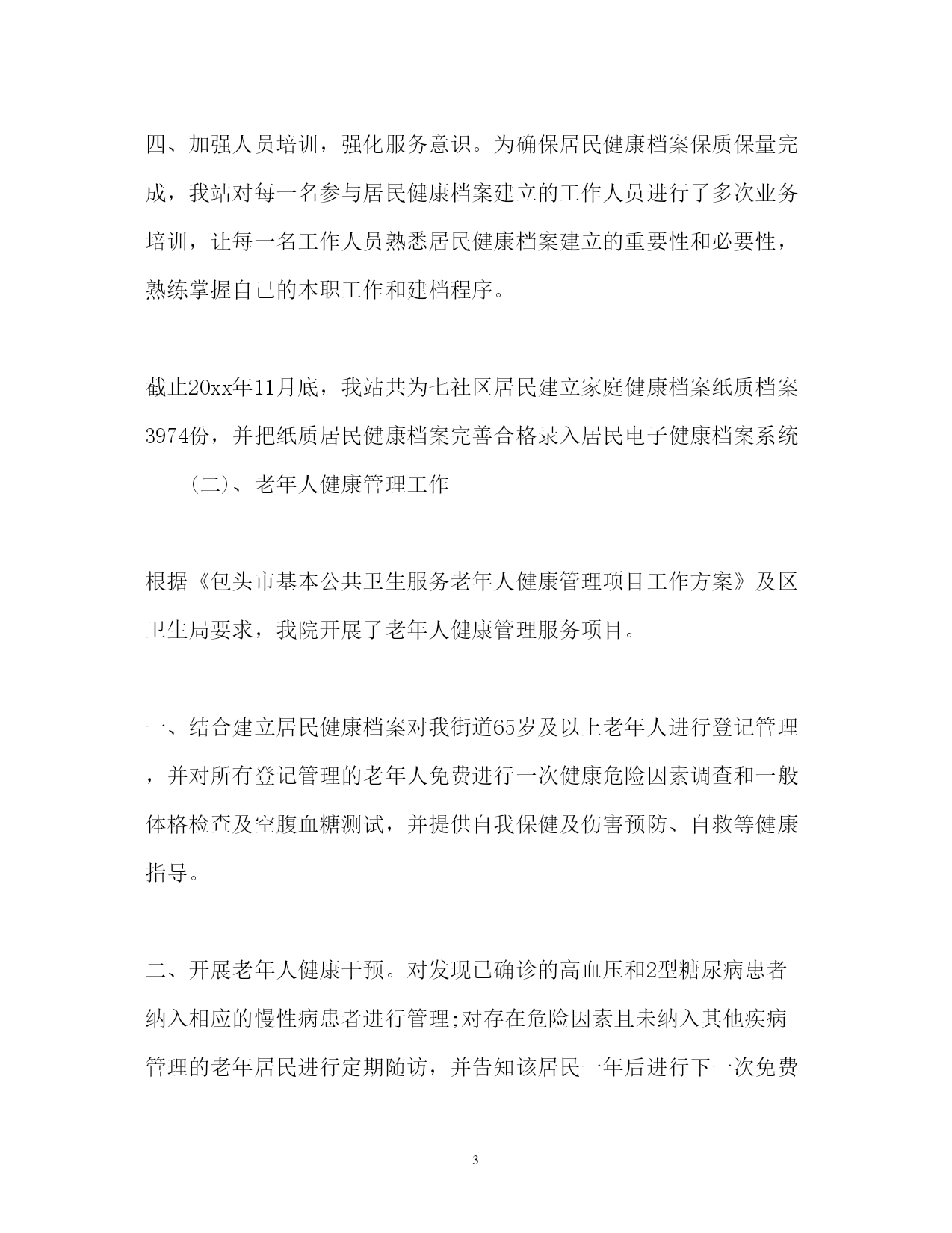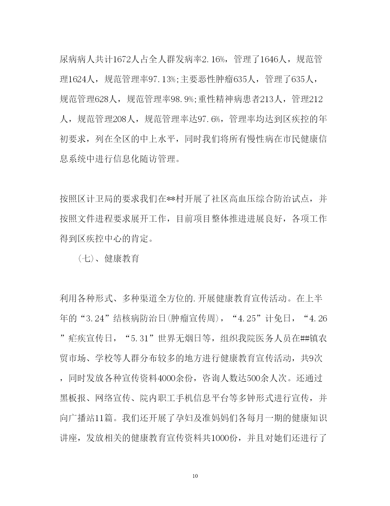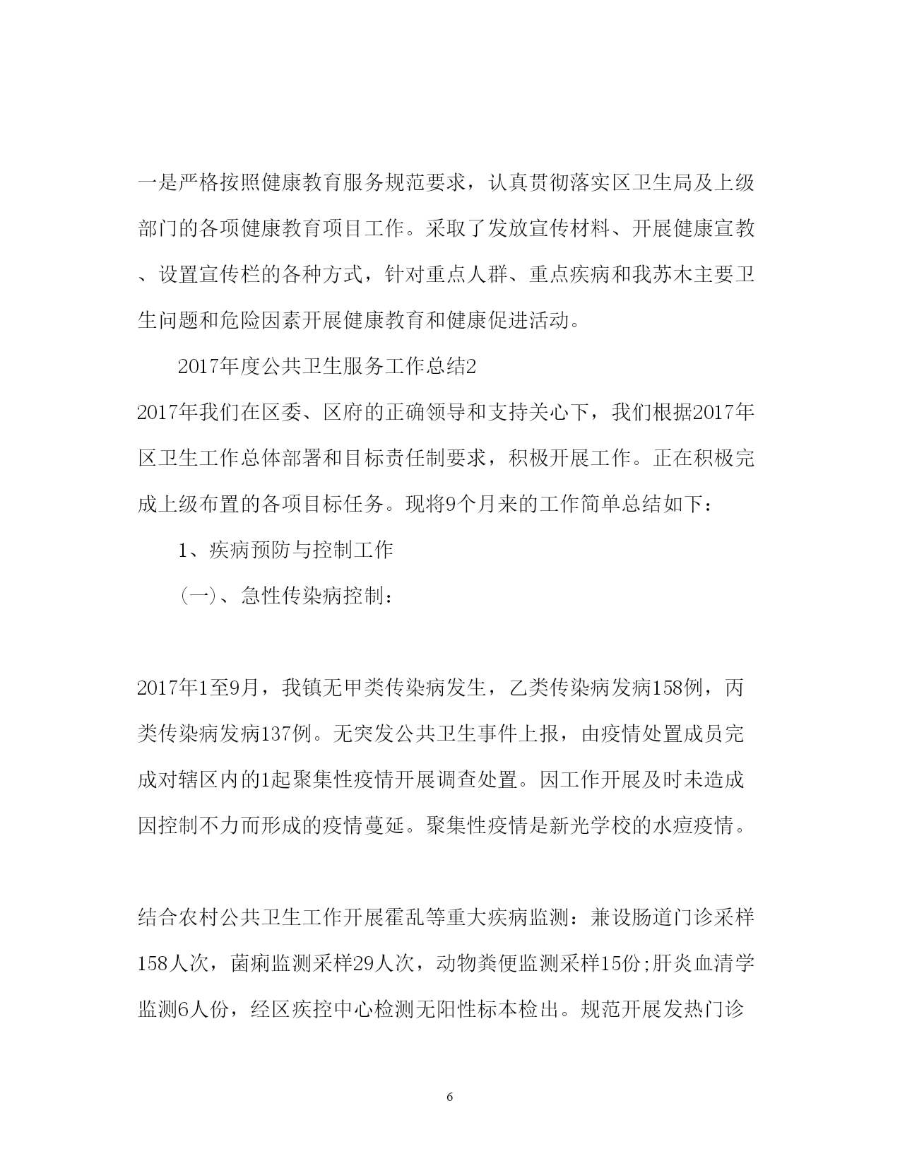 此资料由网络收集而来,如有侵权请告知上传者立即删除。资料共分享,我们负责传递知识。PAGEPAGE13度公共卫生服务工作总结2017年度公共卫生服务工作总结公共卫生服务工作已经告一段落,我们的工作总结不能忽视。下面是小编搜集整理的2017年度公共卫生服务工作总结,欢迎阅读。2017年度公共卫生服务工作总结12017年,我站在卫生局的正确领导下,严格执行《国家基本公共卫生服务规范》认真贯彻落实《包头市基本公共卫生服务项目工作方案》以及卫生局各类文件精神,加强内部管理,严抓基本公共卫生服务项目工作,充分调动全站职工的工作积极性和主动性,取得了较好效果,现将我院基本公共卫生服务项目工作总结汇报一、基本公共卫生服务项目开展落实情况(一)、居民健康档案工作根据《20xx年基本公共卫生服务建立居民健康档案项目工作方案》要求,在区卫生局统一部署下,我院于今年3月份开展了2017年建立居民健康档案工作。一是争取领导重视,搞好综合协调。为迅速落实建档工作,我院多次向办事处居会等基层管理组织单位进行协调与沟通,得到党委政府的大力支持,分管领导亲自组织召开协调会,亲自安排部署,使居委会对居民健康档案工作十分重视,每个辖区都安排专人负责协助建档工作。二是加强组织领导,落实工作责任。为确保居民健康档案工作的顺利进行,我站专门成立了由站长任组长的居民健康档案工作领导小组,加强整个街道居民健康档案工作组织领导,制定了操作性强、切实可行的实施方案。成立专门建档工作小组和居民健康体检小组相互积极配合采取进入户调查统一体检服务的方式为居民建立健康档案建档工作。三、是加大宣传力度,提高居民主动建档意识。为提高我辖区居民主动参与建档意识,我站大力宣传发放各类宣传材料让每一名社区居民了解居民健康档案,积极主动配合我院建档工作小组顺利完成居民建档工作。四、加强人员培训,强化服务意识。为确保居民健康档案保质保量完成,我站对每一名参与居民健康档案建立的工作人员进行了多次业务培训,让每一名工作人员熟悉居民健康档案建立的重要性和必要性,熟练掌握自己的本职工作和建档程序。截止20xx年11月底,我站共为七社区居民建立家庭健康档案纸质档案3974份,并把纸质居民健康档案完善合格录入居民电子健康档案系统(二)、老年人健康管理工作根据《包头市基本公共卫生服务老年人健康管理项目工作方案》及区卫生局要求,我院开展了老年人健康管理服务项目。一、结合建立居民健康档案对我街道65岁及以上老年人进行登记管理,并对所有登记管理的老年人免费进行一次健康危险因素调查和一般体格检查及空腹血糖测试,并提供自我保健及伤害预防、自救等健康指导。二、开展老年人健康干预。对发现已确诊的高血压和2型糖尿病患者纳入相应的慢性病患者进行管理;对存在危险因素且未纳入其他疾病管理的老年居民进行定期随访,并告知该居民一年后进行下一次免费健康检查。截止20xx年11月,我院共登记管理65岁及以上老年220人。并按要求录入市居民电子健康档案系统。(三)、慢性病管理工作为有效预防和控制高血压、糖尿病等慢性病,根据《包头市2016年基本公共卫生服务慢性病管理项目工作方案》及区卫生局要求,我院对我社区居民的高血压、2型糖尿病等慢性病建立健康档案,开展高血压、2型糖尿病等慢性病的随访管理、康复指导工作,掌握我街道高血压、2型糖尿病等慢性病发病、死亡和现患情况。1、高血压患者管理一是通过开展35岁及以上居民首诊测血压;居民诊疗过程测血压;健康体检测血压;和健康档案建立过程中询问等方式发现高血压患者。二是对确诊的高血压患者进行登记管理,并提供面对面随访,每次随访询问病情、测量血压,对用药、饮食、运动、心理等提供健康指导。三是对已经登记管理的高血压患者进行一次免费的健康体检(含一般体格检查和随机血糖测试)截止20xx年11月,我站共登记管理并提供随访高血压患者为204人。并按要求录入居民电子健康档案系统。2、2型糖尿病患者管理一是通过健康体检和高危人群筛查检测血糖;建立居民健康档案过程中询问等方式发现患者。二是对确诊的2型糖尿病患者进行登记管理,并提供面对面随访,每次随访要询问病情、进行空腹血糖和血压测量等检查,对用药、饮食、运动、心理等提供健康指导。三是对已经登记管理的2型糖尿病患者进行一次免费健康体检(含一般体格检查和空腹血糖测试)。截止2xx年11月,我站共登记管理并提供随访的糖尿病患者为125人。并按要求录入居民电子健康档案系统。(四)、健康教育工作一是严格按照健康教育服务规范要求,认真贯彻落实区卫生局及上级部门的各项健康教育项目工作。采取了发放宣传材料、开展健康宣教、设置宣传栏的各种方式,针对重点人群、重点疾病和我苏木主要卫生问题和危险因素开展健康