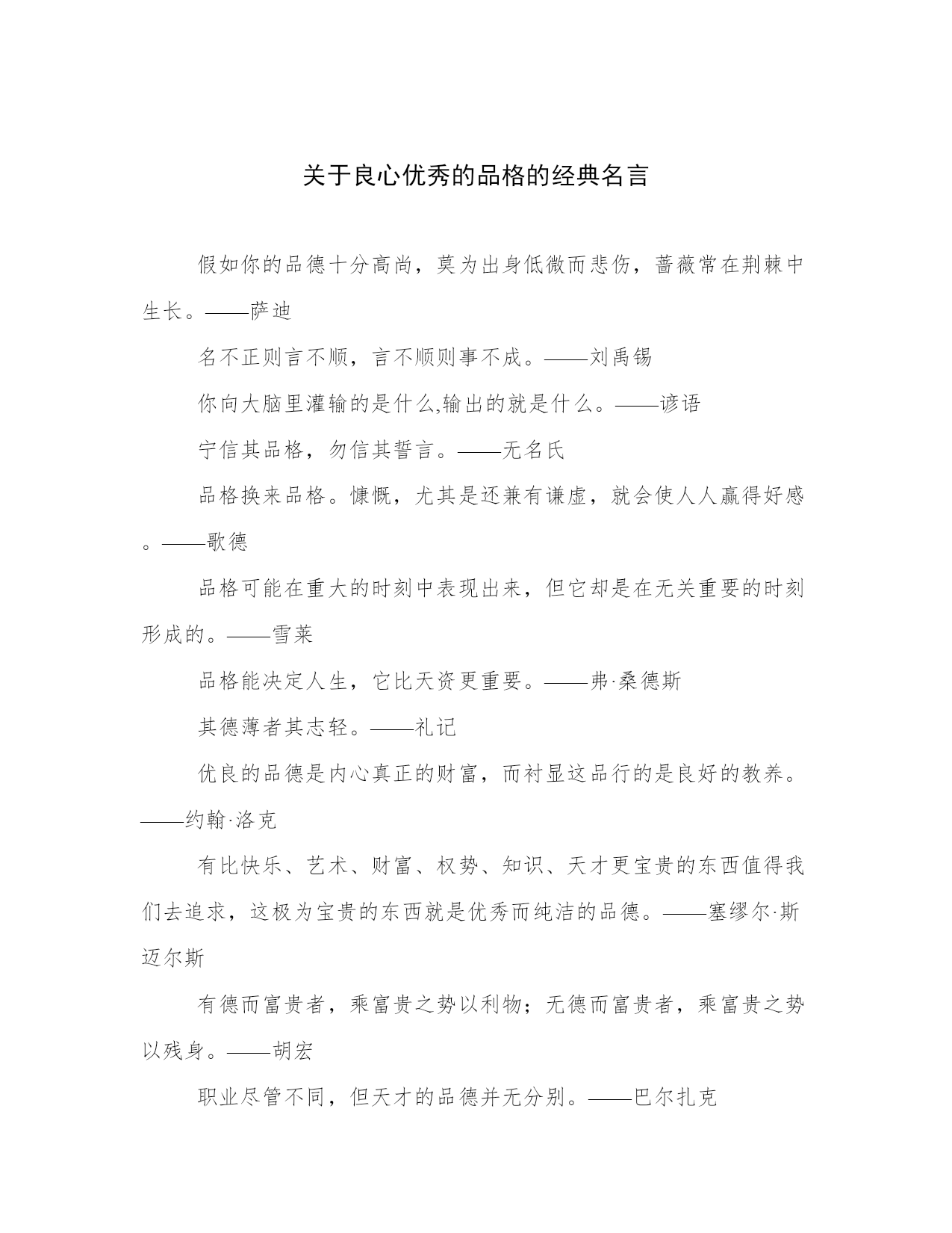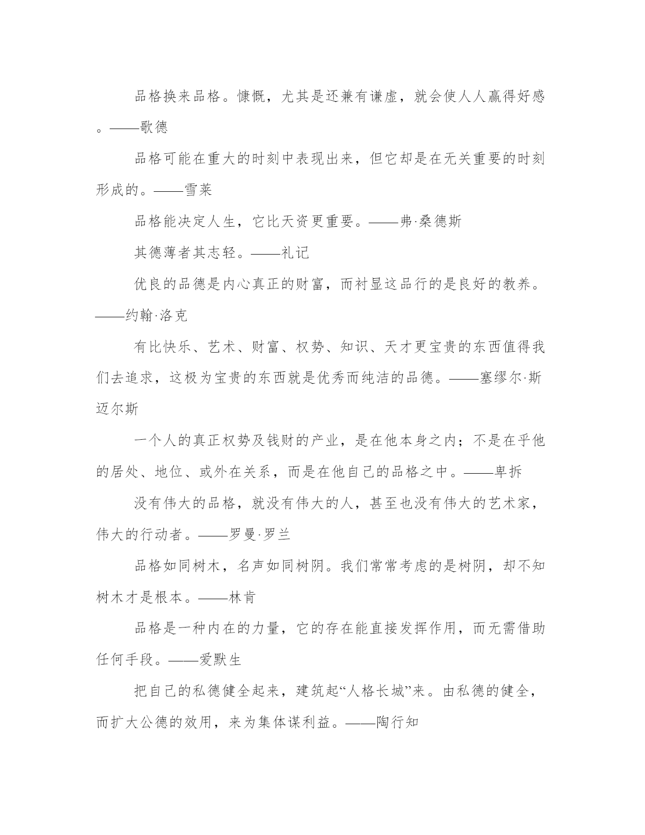 关于良心优秀的品格的经典名言假如你的品德十分高尚,莫为出身低微而悲伤,蔷薇常在荆棘中生长。——萨迪名不正则言不顺,言不顺则事不成。——刘禹锡你向大脑里灌输的是什么,输出的就是什么。——谚语宁信其品格,勿信其誓言。——无名氏品格换来品格。慷慨,尤其是还兼有谦虚,就会使人人赢得好感。——歌德品格可能在重大的时刻中表现出来,但它却是在无关重要的时刻形成的。——雪莱品格能决定人生,它比天资更重要。——弗·桑德斯其德薄者其志轻。——礼记优良的品德是内心真正的财富,而衬显这品行的是良好的教养。——约翰·洛克有比快乐、艺术、财富、权势、知识、天才更宝贵的东西值得我们去追求,这极为宝贵的东西就是优秀而纯洁的品德。——塞缪尔·斯迈尔斯有德而富贵者,乘富贵之势以利物;无德而富贵者,乘富贵之势以残身。——胡宏职业尽管不同,但天才的品德并无分别。——巴尔扎克名气,是世上所有男人跟女人对我的评价;品格是上帝跟天使对我们的认识与了解。——潘恩品性是一个人的内在,名誉是一个人的外貌。——莎士比亚你要宣扬你的一切,不必用你的语言,要用你的本来面目。——卢梭教育家谓称童品格,决定于二岁至五岁之间,诚然不虚。——罗德曼才能最好于孤独中培养;品格最好在世界的汹涌波涛中形成。——歌德人在品格修养上,必须从花朵学得教训。为什么栀子花普遍为人喜爱,只有一个理由,因为他绝不想玫瑰花般的香味。——佚名我们要想涵养公正的品德,就应养成一种“不苟”的优良习惯。——林肯人必须通过财富和安逸的考验,始知其身的坚强。——古塞品格是最难下的定义,但它却是人生中最具影响而重要的东西。——谚语假如你的品德十分高尚,莫为出身低微而悲伤,蔷薇常在荆棘中生长。——萨迪名不正则言不顺,言不顺则事不成。——刘禹锡你向大脑里灌输的是什么,输出的就是什么。——谚语宁信其品格,勿信其誓言。——无名氏品格换来品格。慷慨,尤其是还兼有谦虚,就会使人人赢得好感。——歌德品格可能在重大的时刻中表现出来,但它却是在无关重要的时刻形成的。——雪莱品格能决定人生,它比天资更重要。——弗·桑德斯其德薄者其志轻。——礼记优良的品德是内心真正的财富,而衬显这品行的是良好的教养。——约翰·洛克有比快乐、艺术、财富、权势、知识、天才更宝贵的东西值得我们去追求,这极为宝贵的东西就是优秀而纯洁的品德。——塞缪尔·斯迈尔斯一个人的真正权势及钱财的产业,是在他本身之内;不是在乎他的居处、地位、或外在关系,而是在他自己的品格之中。——卑拆没有伟大的品格,就没有伟大的人,甚至也没有伟大的艺术家,伟大的行动者。——罗曼·罗兰品格如同树木,名声如同树阴。我们常常考虑的是树阴,却不知树木才是根本。——林肯品格是一种内在的力量,它的存在能直接发挥作用,而无需借助任何手段。——爱默生把自己的私德健全起来,建筑起“人格长城”来。由私德的健全,而扩大公德的效用,来为集体谋利益。——陶行知不同的品格导致不同的兴趣爱好。——西塞罗