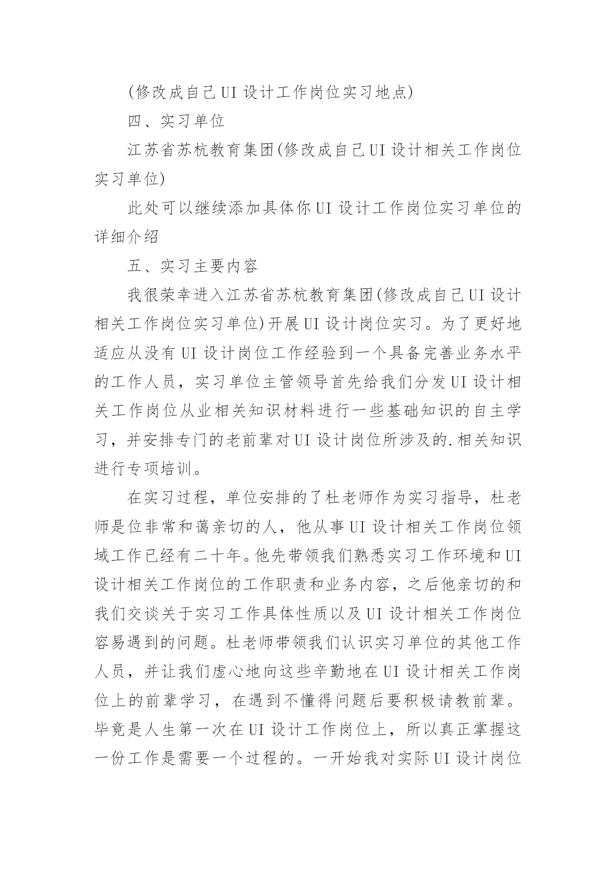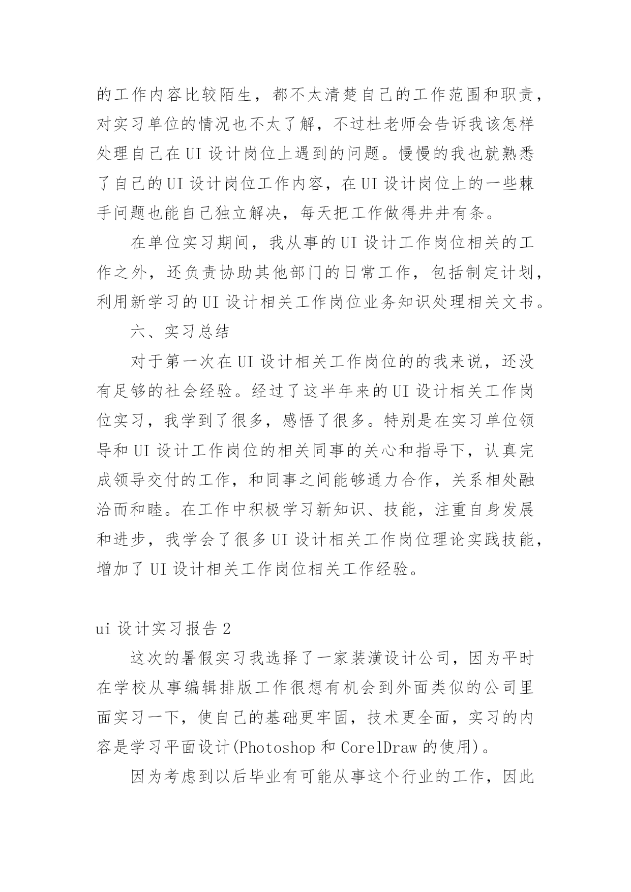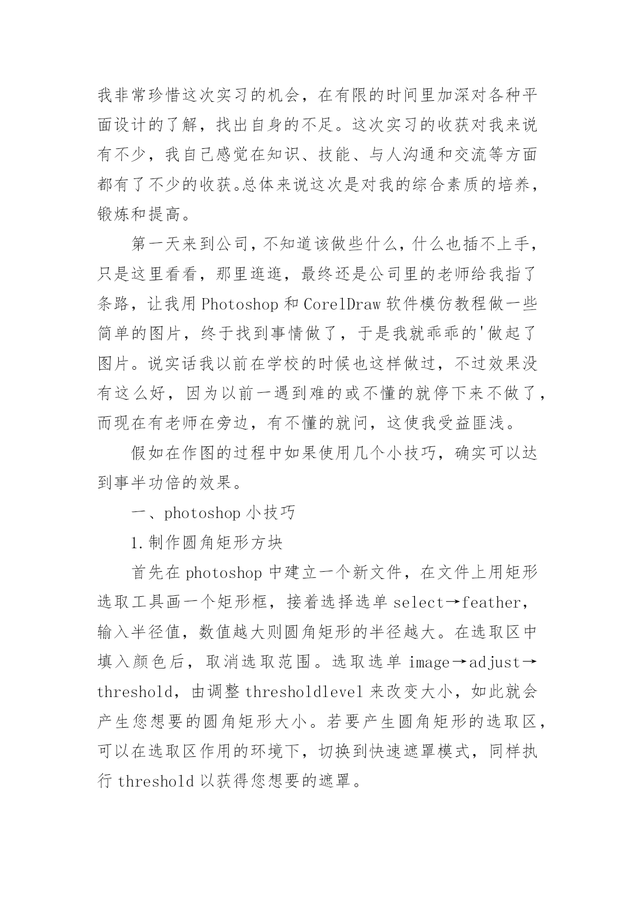 ui设计实习报告随着社会一步步向前发展,需要使用报告的情况越来越多,报告具有成文事后性的特点。你知道怎样写报告才能写的好吗?以下是小编收集整理的ui设计实习报告,希望对大家有所帮助。ui设计实习报告1一、实习目的实习目的是,通过UI设计相关工作岗位实习使我了解以后再UI设计相关工作岗位工作的特点、性质,学习体验UI设计相关岗位工作的实际情况,学习与积累工作经验,为以后真正走上UI设计相关工作岗位做好岗前准备。同时通过UI设计相关工作岗位的实习,熟悉实际工作过程的运作体系和管理流程,把自己所学UI设计工作岗位理论知识应用于实际,锻炼UI设计工作岗位业务能力和社会交际实践能力,并在工作中学习UI设计相关工作岗位的新知识,对自己所学的知识进行总结并提升,以指导未来在UI设计相关工作岗位的学习重点和发展方向。二、实习时间201×年03月01日~201×年06月15日(修改成自己UI设计相关工作岗位实习时间)三、实习地点苏州市经济开发区江南大道(修改成自己UI设计工作岗位实习地点)四、实习单位江苏省苏杭教育集团(修改成自己UI设计相关工作岗位实习单位)此处可以继续添加具体你UI设计工作岗位实习单位的详细介绍五、实习主要内容我很荣幸进入江苏省苏杭教育集团(修改成自己UI设计相关工作岗位实习单位)开展UI设计岗位实习。为了更好地适应从没有UI设计岗位工作经验到一个具备完善业务水平的工作人员,实习单位主管领导首先给我们分发UI设计相关工作岗位从业相关知识材料进行一些基础知识的自主学习,并安排专门的老前辈对UI设计岗位所涉及的.相关知识进行专项培训。在实习过程,单位安排的了杜老师作为实习指导,杜老师是位非常和蔼亲切的人,他从事UI设计相关工作岗位领域工作已经有二十年。他先带领我们熟悉实习工作环境和UI设计相关工作岗位的工作职责和业务内容,之后他亲切的和我们交谈关于实习工作具体性质以及UI设计相关工作岗位容易遇到的问题。杜老师带领我们认识实习单位的其他工作人员,并让我们虚心地向这些辛勤地在UI设计相关工作岗位上的前辈学习,在遇到不懂得问题后要积极请教前辈。毕竟是人生第一次在UI设计工作岗位上,所以真正掌握这一份工作是需要一个过程的。一开始我对实际UI设计岗位的工作内容比较陌生,都不太清楚自己的工作范围和职责,对实习单位的情况也不太了解,不过杜老师会告诉我该怎样处理自己在UI设计岗位上遇到的问题。慢慢的我也就熟悉了自己的UI设计岗位工作内容,在UI设计岗位上的一些棘手问题也能自己独立解决,每天把工作做得井井有条。在单位实习期间,我从事的UI设计工作岗位相关的工作之外,还负责协助其他部门的日常工作,包括制定计划,利用新学习的UI设计相关工作岗位业务知识处理相关文书。六、实习总结对于第一次在UI设计相关工作岗位的的我来说,还没有足够的社会经验。经过了这半年来的UI设计相关工作岗位实习,我学到了很多,感悟了很多。特别是在实习单位领导和UI设计工作岗位的相关同事的关心和指导下,认真完成领导交付的工作,和同事之间能够通力合作,关系相处融洽而和睦。在工作中积极学习新知识、技能,注重自身发展和进步,我学会了很多UI设计相关工作岗位理论实践技能,增加了UI设计相关工作岗位相关工作经验。ui设计实习报告2这次的暑假实习我选择了一家装潢设计公司,因为平时在学校从事编辑排版工作很想有机会到外面类似的公司里面实习一下,使自己的基础更牢固,技术更全面,实习的内容是学习平面设计(Photoshop和CorelDraw的使用)。因为考虑到以后毕业有可能从事这个行业的工作,因此我非常珍惜这次实习的机会,在有限的时间里加深对各种平面设计的了解,找出自身的不足。这次实习的收获对我来说有不少,我自己感觉在知识、技能、与人沟通和交流等方面都有了不少的收获。总体来说这次是对我的综合素质的培养,锻炼和提高。第一天来到公司,不知道该做些什么,什么也插不上手,只是这里看看,那里逛逛,最终还是公司里的老师给我指了条路,让我用Photoshop和CorelDraw软件模仿教程做一些简单的图片,终于找到事情做了,于是我就乖乖的'做起了图片。说实话我以前在学校的时候也这样做过,不过效果没有这么好,因为以前一遇到难的或不懂的就停下来不做了,而现在有老师在旁边,有不懂的就问,这使我受益匪浅。假如在作图的过程中如果使用几个小技巧,确实可以达到事半功倍的效果。一、photoshop小技巧1.制作圆角矩形方块首先在photoshop中建立一个新文件,在文件上用矩形选取工具画一个矩形框,接着选择选单select→feather,输入半径值,数值越大则圆角矩形的半径越大。在选取区中填入颜色后,取消选取范围。选取选单image→adjust→threshold,由调整thresholdlevel来改变大小,如此就会