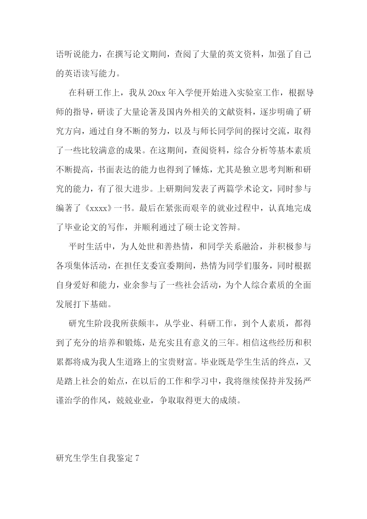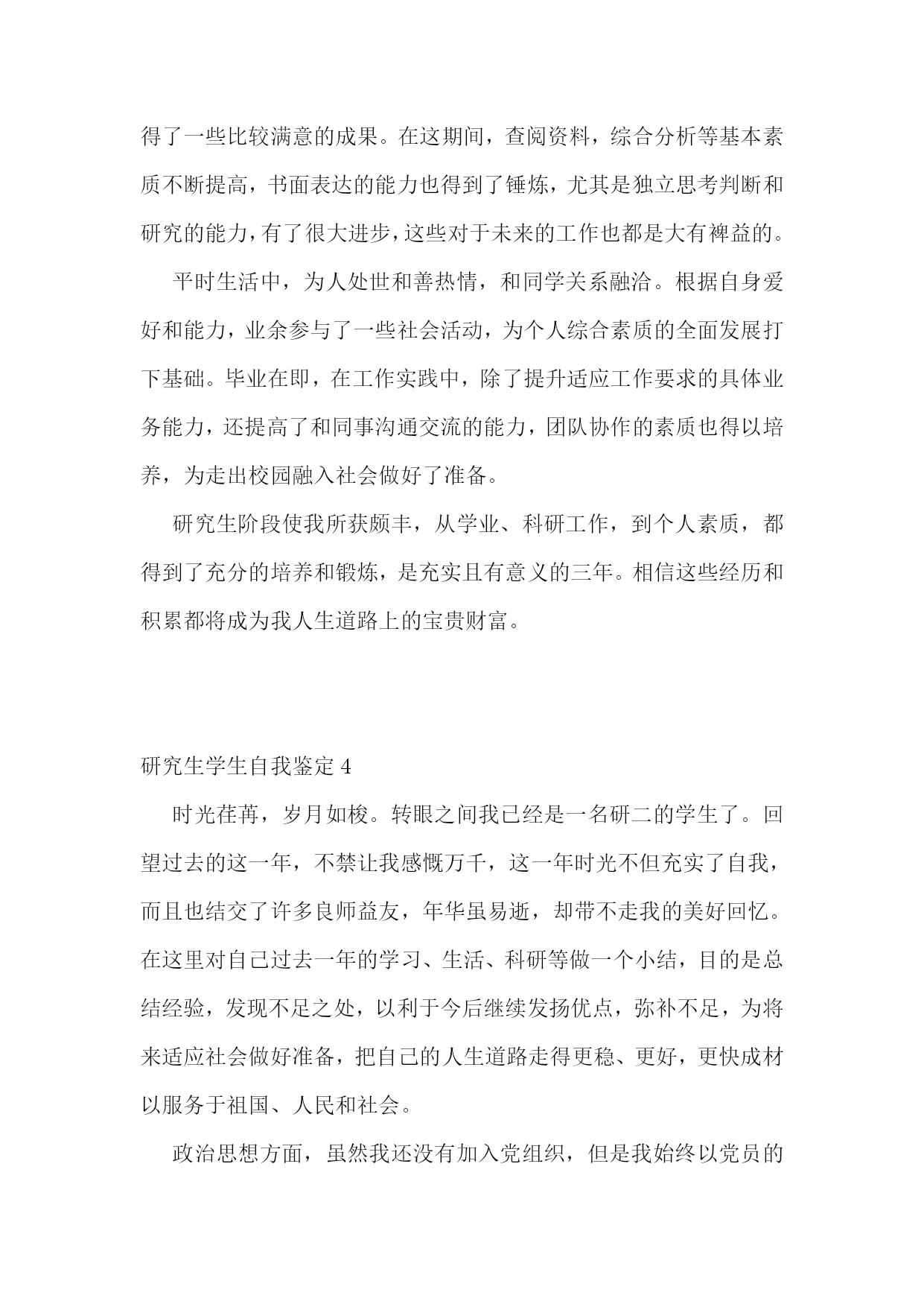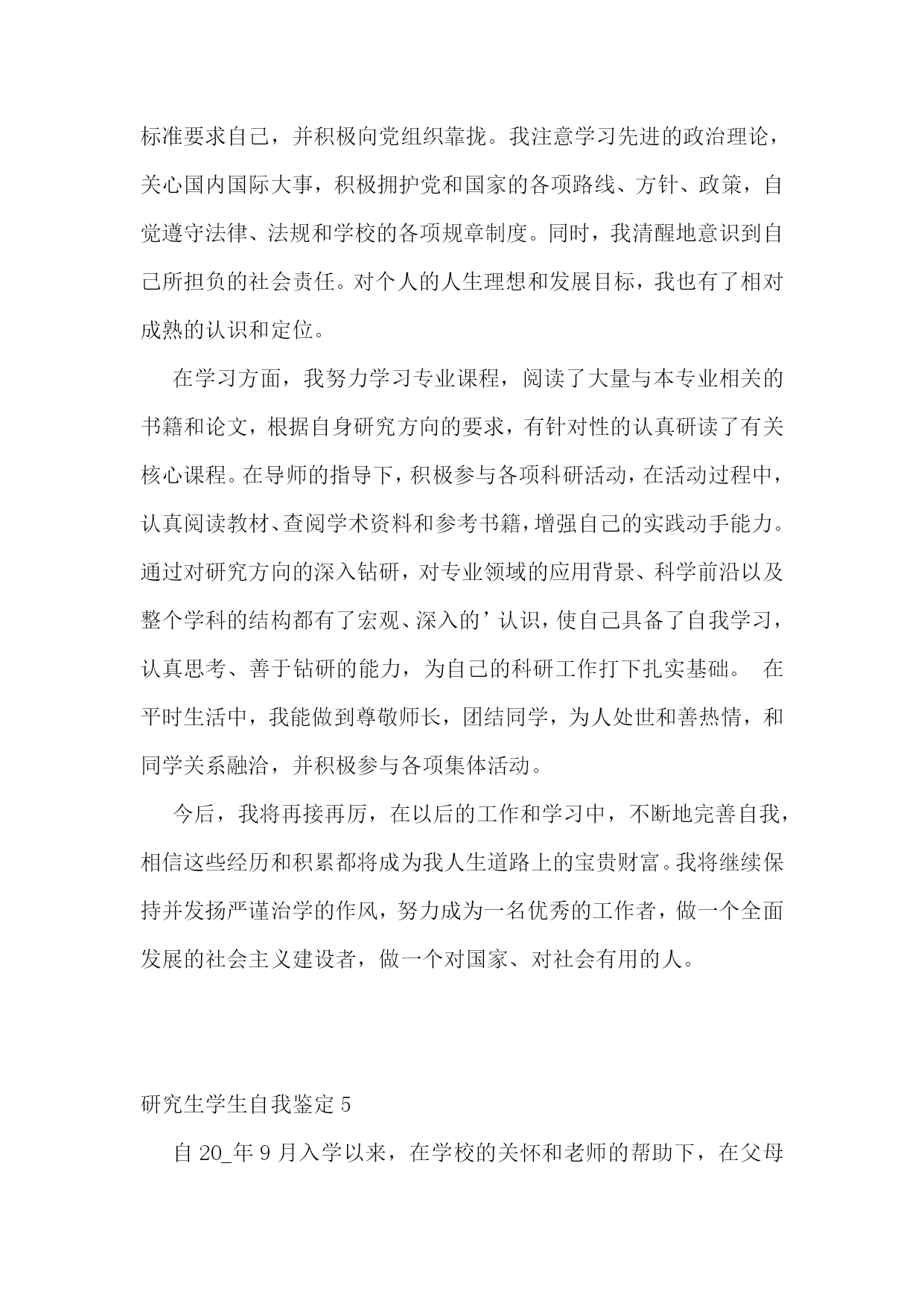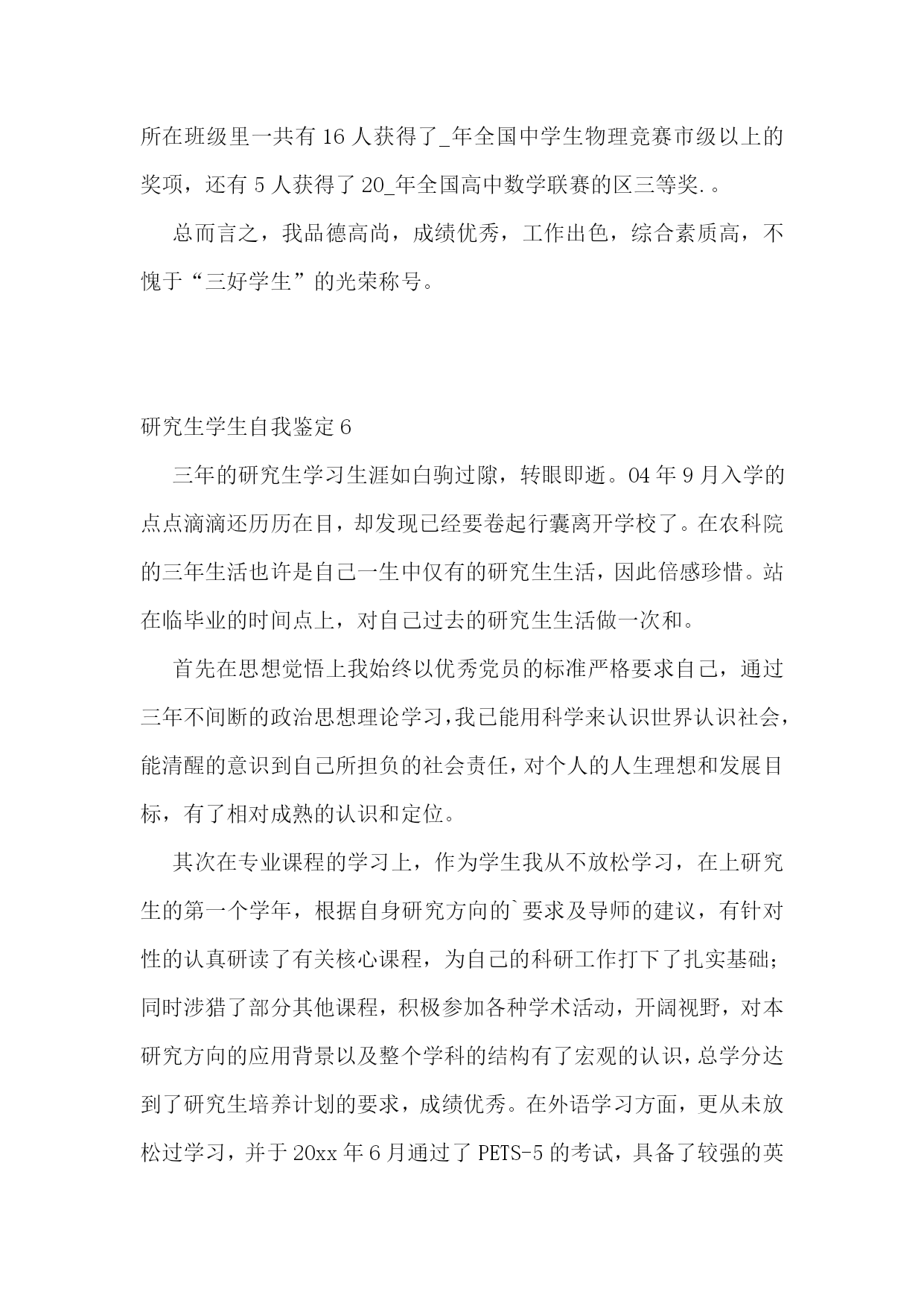 研究生学生自我鉴定集合9篇研究生学生自我鉴定1毕业之际,回顾三年来的学习、工作以及生活,做研究生自我鉴定如下:在思想觉悟上始终对自己有较高的要求,主动和党组织靠拢,尽管自己还没有加入党组织,但是自己始终以共产党员的高标准要求自己,能用科学发展观来认识世界认识社会,能清醒的意识到自己所担负的社会责任,对个人的人生理想和发展目标,有了相对成熟的认识和定位。在学习上,根据自身研究方向的要求,有针对性的`认真研读了有关核心课程,为自己的科研工作打下扎实基础;并涉猎了一部分其他课程,开阔视野,对本人研究方向的应用背景以及整个学科的结构有了宏观的认识。在英语学习方面,通过了大学英语六级考试,具备了较强的英语听说能力,在撰写论文期间,查阅了大量的英文资料。在导师的指导下,积极参与各项教学科研活动,在教学实践的过程中,认真阅读教材、查阅学术资料和参考书籍,在课堂上在快乐中吸收各个知识点。同时自己具有较强的实践动手能力,参与了导师多项课题的研究,使自己的理论知识与实践水平得到了进一步的增强和提高,同时顺利完成了硕士毕业论文。生活中,为人处世和善热情,和同学关系融洽,并积极参与各项集体活动,在担任支委期间,热情为同学们服务。今后,我将再接再厉,在以后的工作和学习中,不断地完善自我,相信这些经历和积累都将成为我人生道路上的宝贵财富。我将继续保持并发扬严谨治学的作风,努力成为一名优秀的工作者,做一个全面发展的社会主义建设者,做一个对国家、对社会有用的人。研究生学生自我鉴定2两年的硕士研究生学习已经接近尾声,马上就要从学校走向社会了。回顾这两年来,通过自己不断的努力,在工作、学习、生活等各方面都有所提高。这两年的研究生学习,使我不但开阔了思路,增长了见识,更重要的是在学习和实践中锻炼了自己的实际操作和解决问题的能力。自身整体素质的提高使我受益匪浅。在学习上,文化课的学习使我对本专业有了更深刻、更准确的认识;查阅相关的文献和资料使我对专业的相关进展有了更加清晰的了解;实验相关的课程使我对很多仪器有了更直观的认识。在不断的.学习中,积累了知识和经验;在平常的实验中,提高了动手技能;在课题的研究过程中,对相关的领域有了全面而具体的认知。在生活中,我积极参加各项集体活动,同学之间和睦相处,与同寝室、同专业、同班级的同学保持十分融洽的关系。平常注意锻炼身体,参加丰富多彩的各种体育活动,并且在足球、篮球等有特长的方面努力为集体争取荣誉。保持朴素的生活作风,注意节俭,抵制各种浪费行为。提高自身修养,从小事做起严格要求自己。在思想觉悟上,我时刻牢记自己是一名党员,处处以身作则,以一名合格党员的要求严格规范自己的言行举止,起到模范带头作用。关心国家大事,经常通过各种媒体了解时事新闻,对国内外发生的事件都有自己的见解和判断。当然,在不断进步的同时,自己还是暴露了一些缺点和需要提高的地方。例如,在两年的学习中并没有发表相关的论文,说明自己在学术研究上还需要继续努力。平常的待人处事中容易冲动,有时脾气比较急躁,做起事情来有些时候也欠缺考虑。所以在将来的工作和学习中要更加努力,不断严格要求自己,从各个方面完善自我,继续提高自身的综合素质。研究生学生自我鉴定3本人在思想觉悟上始终对自己有较高的要求,能清醒的意识到自己所担负的社会责任,对个人的人生理想和发展目标,有了相对成熟的认识和定位。在专业课程的学习上,根据自身研究方向的要求,有针对性的认真研读了有关核心课程,为自己的科研工作打下扎实基础;并涉猎了一部分其他课程,开阔视野,对本研究方向的应用背景以及整个学科的.结构有了宏观的认识。学习成绩也比较理想。在外语方面,研究生阶段着重加强了书面写作的训练,并取得了一定效果。在科研工作上,根据导师的指导,研读了大量论著,逐步明确了研究方向,通过自身不断的努力,以及与师长同学间的探讨交流,取得了一些比较满意的成果。在这期间,查阅资料,综合分析等基本素质不断提高,书面表达的能力也得到了锤炼,尤其是独立思考判断和研究的能力,有了很大进步,这些对于未来的工作也都是大有裨益的。平时生活中,为人处世和善热情,和同学关系融洽。根据自身爱好和能力,业余参与了一些社会活动,为个人综合素质的全面发展打下基础。毕业在即,在工作实践中,除了提升适应工作要求的具体业务能力,还提高了和同事沟通交流的能力,团队协作的素质也得以培养,为走出校园融入社会做好了准备。研究生阶段使我所获颇丰,从学业、科研工作,到个人素质,都得到了充分的培养和锻炼,是充实且有意义的三年。相信这些经历和积累都将成为我人生道路上的宝贵财富。研究生学生自我鉴定4时光荏苒,岁月如梭。转眼之间我已经是一名研二的学生了。回望过去的这一年,不禁让我感慨万千,这一年时光不但充实了自我,而且也结交了许多良师