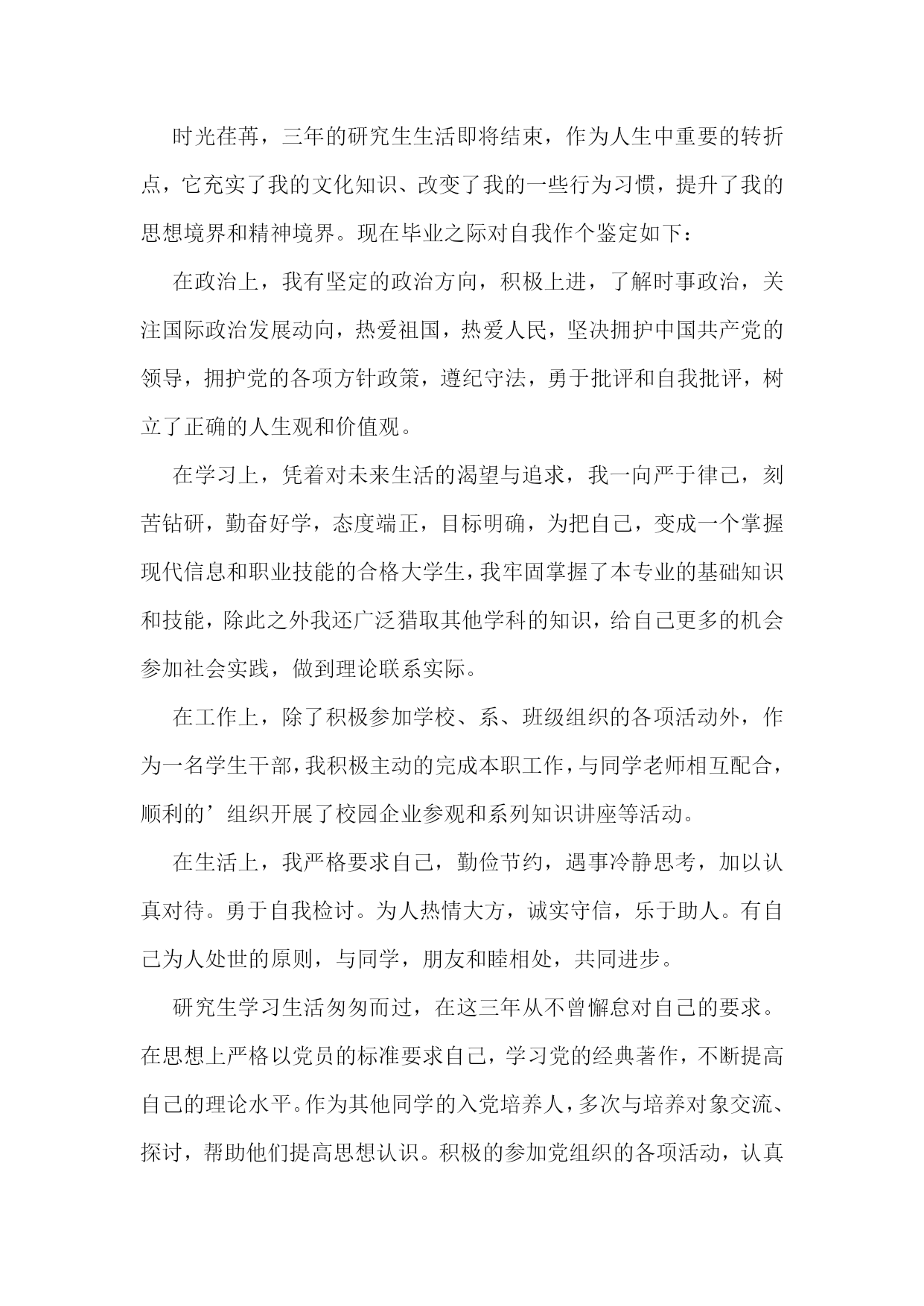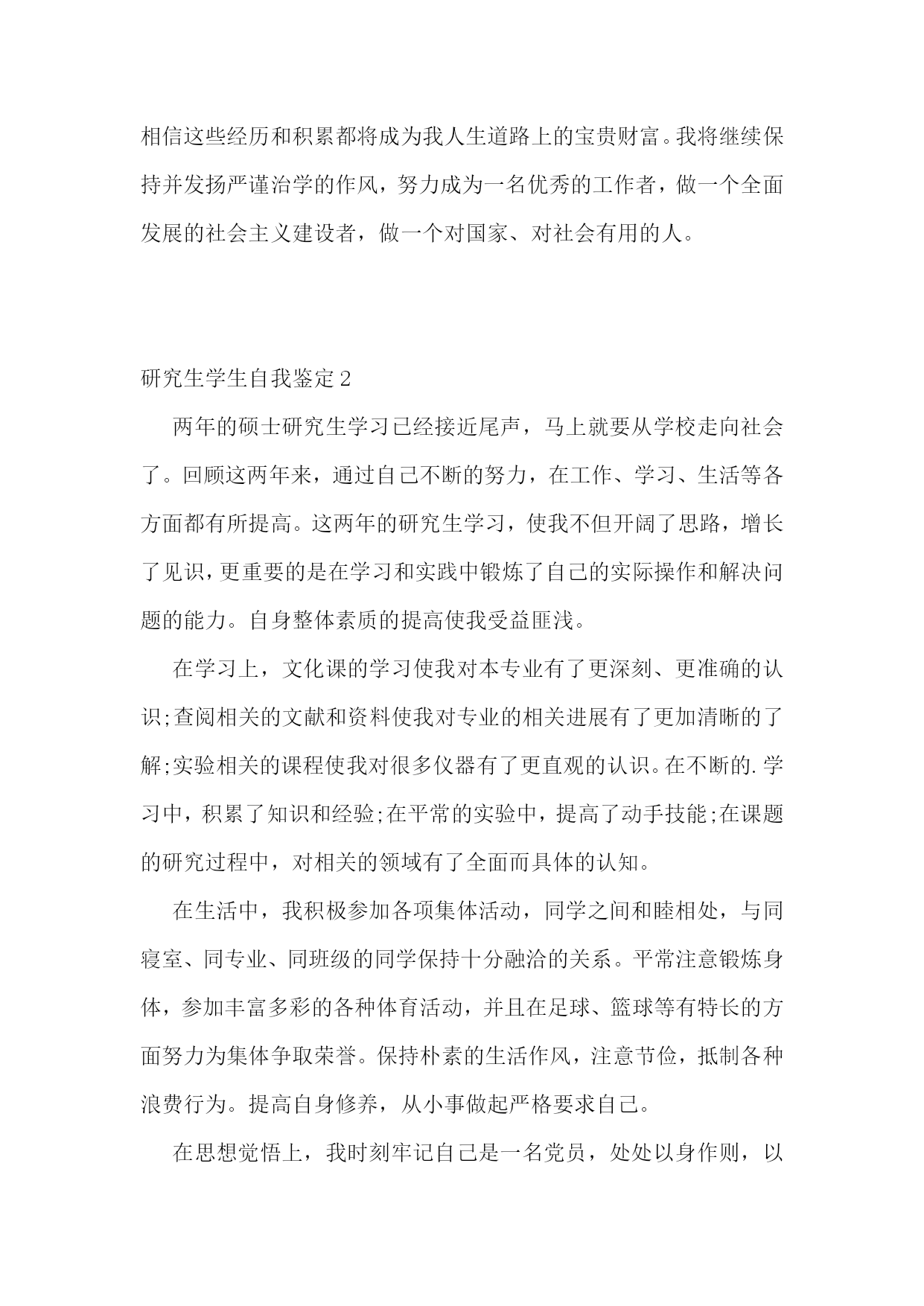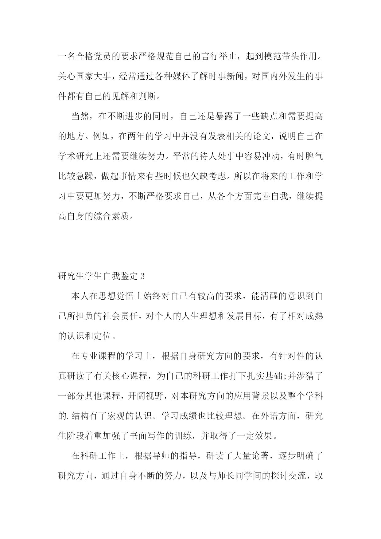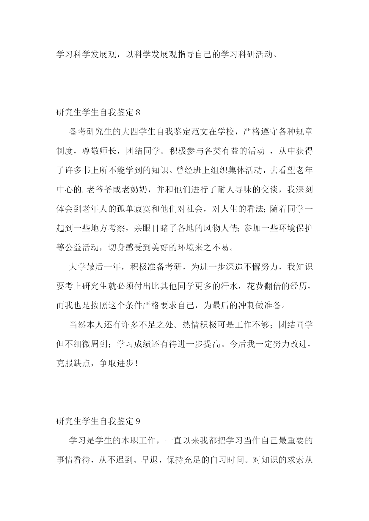 研究生学生自我鉴定集合9篇研究生学生自我鉴定1毕业之际,回顾三年来的学习、工作以及生活,做研究生自我鉴定如下:在思想觉悟上始终对自己有较高的要求,主动和党组织靠拢,尽管自己还没有加入党组织,但是自己始终以共产党员的高标准要求自己,能用科学发展观来认识世界认识社会,能清醒的意识到自己所担负的社会责任,对个人的人生理想和发展目标,有了相对成熟的认识和定位。在学习上,根据自身研究方向的要求,有针对性的`认真研读了有关核心课程,为自己的科研工作打下扎实基础;并涉猎了一部分其他课程,开阔视野,对本人研究方向的应用背景以及整个学科的结构有了宏观的认识。在英语学习方面,通过了大学英语六级考试,具备了较强的英语听说能力,在撰写论文期间,查阅了大量的英文资料。在导师的指导下,积极参与各项教学科研活动,在教学实践的过程中,认真阅读教材、查阅学术资料和参考书籍,在课堂上在快乐中吸收各个知识点。同时自己具有较强的实践动手能力,参与了导师多项课题的研究,使自己的理论知识与实践水平得到了进一步的增强和提高,同时顺利完成了硕士毕业论文。生活中,为人处世和善热情,和同学关系融洽,并积极参与各项集体活动,在担任支委期间,热情为同学们服务。今后,我将再接再厉,在以后的工作和学习中,不断地完善自我,相信这些经历和积累都将成为我人生道路上的宝贵财富。我将继续保持并发扬严谨治学的作风,努力成为一名优秀的工作者,做一个全面发展的社会主义建设者,做一个对国家、对社会有用的人。研究生学生自我鉴定2两年的硕士研究生学习已经接近尾声,马上就要从学校走向社会了。回顾这两年来,通过自己不断的努力,在工作、学习、生活等各方面都有所提高。这两年的研究生学习,使我不但开阔了思路,增长了见识,更重要的是在学习和实践中锻炼了自己的实际操作和解决问题的能力。自身整体素质的提高使我受益匪浅。在学习上,文化课的学习使我对本专业有了更深刻、更准确的认识;查阅相关的文献和资料使我对专业的相关进展有了更加清晰的了解;实验相关的课程使我对很多仪器有了更直观的认识。在不断的.学习中,积累了知识和经验;在平常的实验中,提高了动手技能;在课题的研究过程中,对相关的领域有了全面而具体的认知。在生活中,我积极参加各项集体活动,同学之间和睦相处,与同寝室、同专业、同班级的同学保持十分融洽的关系。平常注意锻炼身体,参加丰富多彩的各种体育活动,并且在足球、篮球等有特长的方面努力为集体争取荣誉。保持朴素的生活作风,注意节俭,抵制各种浪费行为。提高自身修养,从小事做起严格要求自己。在思想觉悟上,我时刻牢记自己是一名党员,处处以身作则,以一名合格党员的要求严格规范自己的言行举止,起到模范带头作用。关心国家大事,经常通过各种媒体了解时事新闻,对国内外发生的事件都有自己的见解和判断。当然,在不断进步的同时,自己还是暴露了一些缺点和需要提高的地方。例如,在两年的学习中并没有发表相关的论文,说明自己在学术研究上还需要继续努力。平常的待人处事中容易冲动,有时脾气比较急躁,做起事情来有些时候也欠缺考虑。所以在将来的工作和学习中要更加努力,不断严格要求自己,从各个方面完善自我,继续提高自身的综合素质。研究生学生自我鉴定3本人在思想觉悟上始终对自己有较高的要求,能清醒的意识到自己所担负的社会责任,对个人的人生理想和发展目标,有了相对成熟的认识和定位。在专业课程的学习上,根据自身研究方向的要求,有针对性的认真研读了有关核心课程,为自己的科研工作打下扎实基础;并涉猎了一部分其他课程,开阔视野,对本研究方向的应用背景以及整个学科的.结构有了宏观的认识。学习成绩也比较理想。在外语方面,研究生阶段着重加强了书面写作的训练,并取得了一定效果。在科研工作上,根据导师的指导,研读了大量论著,逐步明确了研究方向,通过自身不断的努力,以及与师长同学间的探讨交流,取得了一些比较满意的成果。在这期间,查阅资料,综合分析等基本素质不断提高,书面表达的能力也得到了锤炼,尤其是独立思考判断和研究的能力,有了很大进步,这些对于未来的工作也都是大有裨益的。平时生活中,为人处世和善热情,和同学关系融洽。根据自身爱好和能力,业余参与了一些社会活动,为个人综合素质的全面发展打下基础。毕业在即,在工作实践中,除了提升适应工作要求的具体业务能力,还提高了和同事沟通交流的能力,团队协作的素质也得以培养,为走出校园融入社会做好了准备。研究生阶段使我所获颇丰,从学业、科研工作,到个人素质,都得到了充分的培养和锻炼,是充实且有意义的三年。相信这些经历和积累都将成为我人生道路上的宝贵财富。研究生学生自我鉴定4时光荏苒,岁月如梭。转眼之间我已经是一名研二的学生了。回望过去的这一年,不禁让我感慨万千,这一年时光不但充实了自我,而且也结交了许多良师