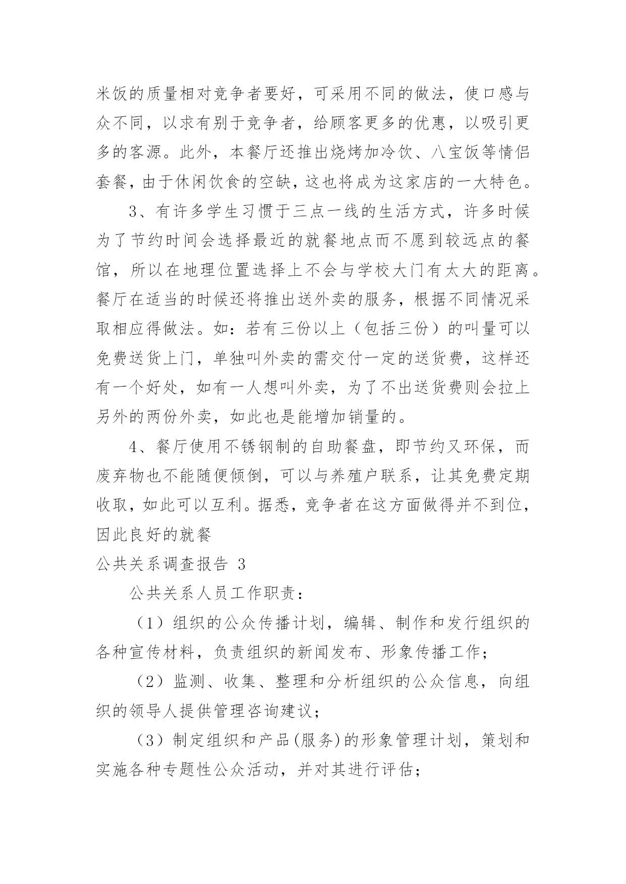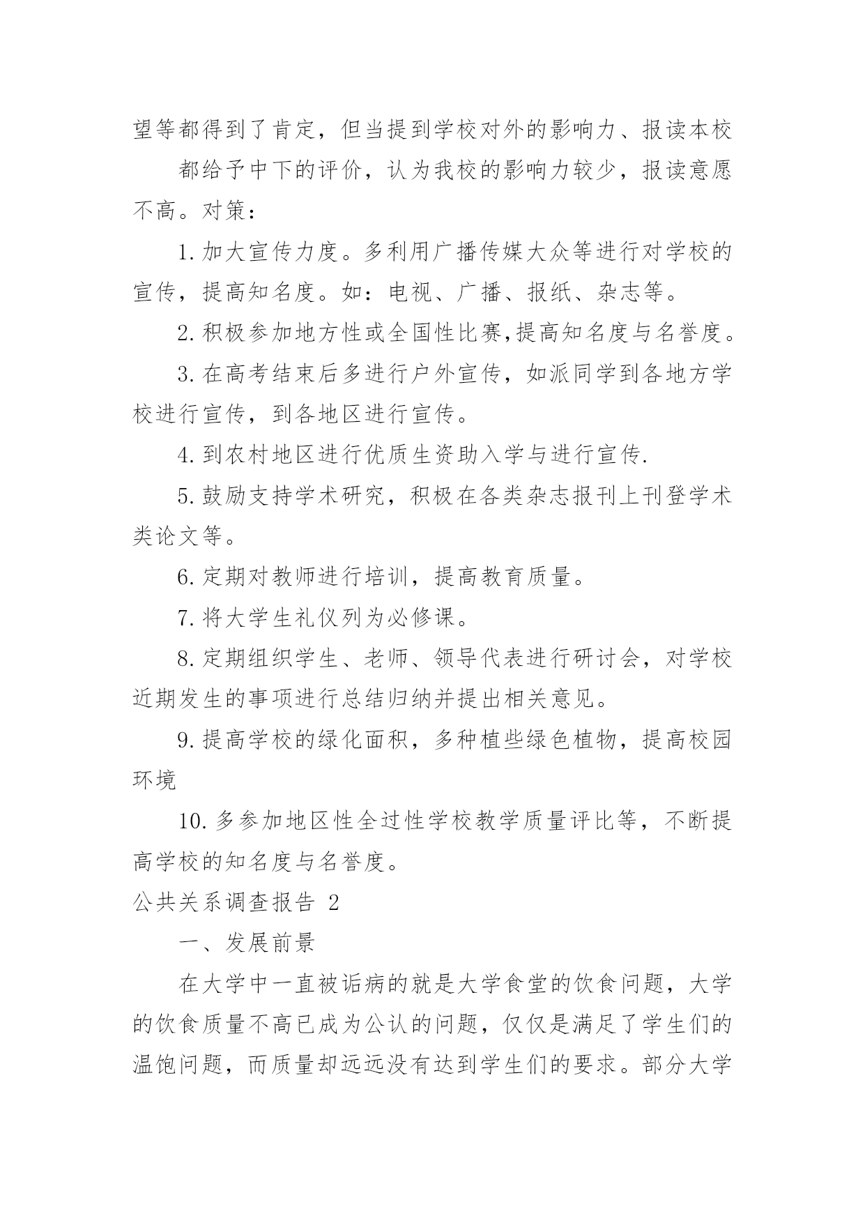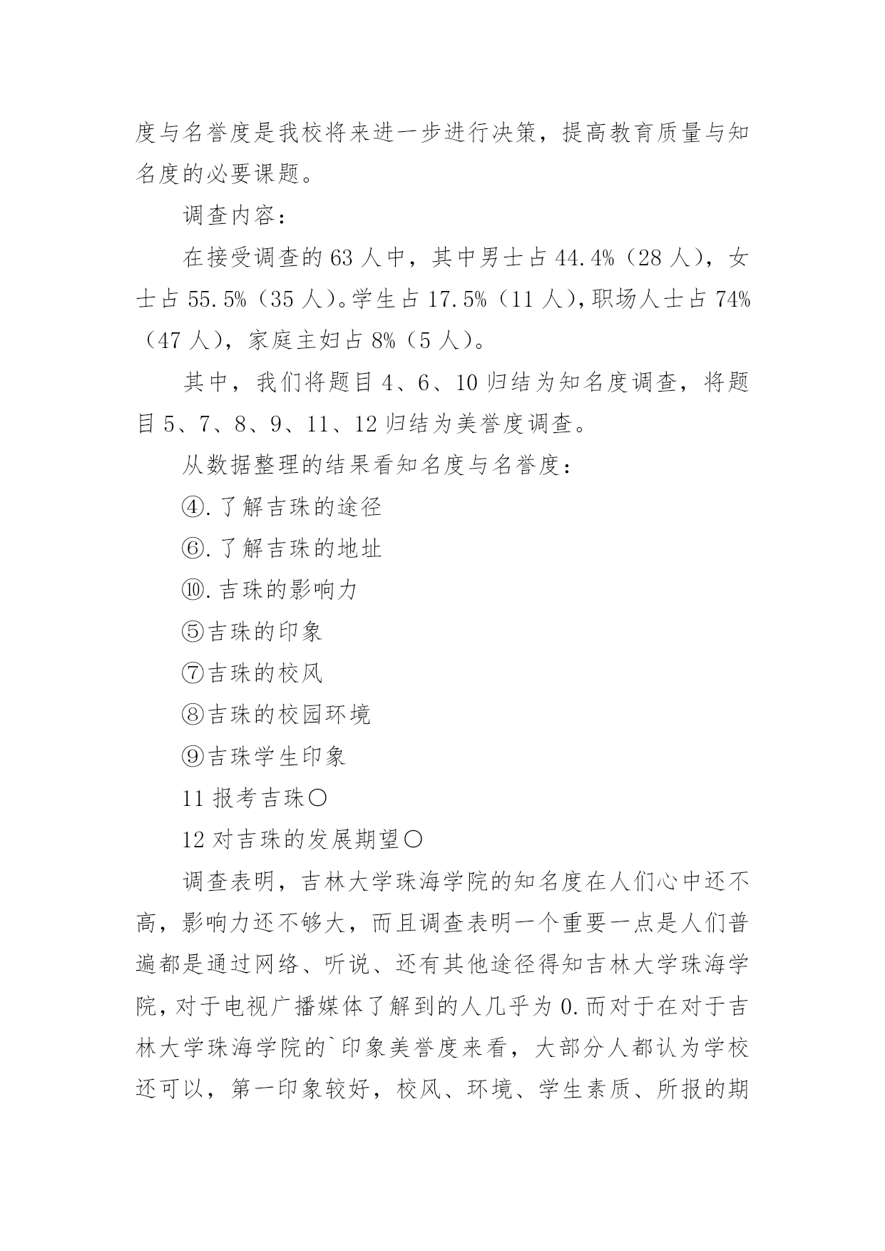 公共关系调查报告公共关系调查报告8篇随着个人的文明素养不断提升,报告十分的重要,我们在写报告的时候要避免篇幅过长。你还在对写报告感到一筹莫展吗?以下是小编整理的公共关系调查报告,欢迎阅读,希望大家能够喜欢。公共关系调查报告1调查目的:了解当前吉林大学珠海学院组织形象的现状,以便寻求构建吉林大学珠海学院良好组织形象的策略。调查意义:能够起到透过现象看本质的作用,有利于学校的活动和策划提供有效的依据和导向。调查对象:吉林大学外人士中随机抽取100名。在发放的100份问卷中有63%(63人)知道吉林大学珠海学院,并认真的填写了调查问卷,另外还有37%(37人)的受调查者不知道或者问卷没能收回。调查地点:珠海市、顺德区、广州市、汕头市调查方式:随机问卷调查调查时间:9月27日至10月3日调查背景:随着教育改革的进一步深入,人们对学校的选择要求在不断地提高,越来越注重学校的教学质量与知名度,因此,了解本校在社会中的影响力,人们心目中的知名度与名誉度是我校将来进一步进行决策,提高教育质量与知名度的必要课题。调查内容:在接受调查的63人中,其中男士占44.4%(28人),女士占55.5%(35人)。学生占17.5%(11人),职场人士占74%(47人),家庭主妇占8%(5人)。其中,我们将题目4、6、10归结为知名度调查,将题目5、7、8、9、11、12归结为美誉度调查。从数据整理的结果看知名度与名誉度:④.了解吉珠的途径⑥.了解吉珠的地址⑩.吉珠的影响力⑤吉珠的印象⑦吉珠的校风⑧吉珠的校园环境⑨吉珠学生印象11报考吉珠○12对吉珠的发展期望○调查表明,吉林大学珠海学院的知名度在人们心中还不高,影响力还不够大,而且调查表明一个重要一点是人们普遍都是通过网络、听说、还有其他途径得知吉林大学珠海学院,对于电视广播媒体了解到的人几乎为0.而对于在对于吉林大学珠海学院的`印象美誉度来看,大部分人都认为学校还可以,第一印象较好,校风、环境、学生素质、所报的期望等都得到了肯定,但当提到学校对外的影响力、报读本校都给予中下的评价,认为我校的影响力较少,报读意愿不高。对策:1.加大宣传力度。多利用广播传媒大众等进行对学校的宣传,提高知名度。如:电视、广播、报纸、杂志等。2.积极参加地方性或全国性比赛,提高知名度与名誉度。3.在高考结束后多进行户外宣传,如派同学到各地方学校进行宣传,到各地区进行宣传。4.到农村地区进行优质生资助入学与进行宣传.5.鼓励支持学术研究,积极在各类杂志报刊上刊登学术类论文等。6.定期对教师进行培训,提高教育质量。7.将大学生礼仪列为必修课。8.定期组织学生、老师、领导代表进行研讨会,对学校近期发生的事项进行总结归纳并提出相关意见。9.提高学校的绿化面积,多种植些绿色植物,提高校园环境10.多参加地区性全过性学校教学质量评比等,不断提高学校的知名度与名誉度。公共关系调查报告2一、发展前景在大学中一直被诟病的就是大学食堂的饮食问题,大学的饮食质量不高已成为公认的问题,仅仅是满足了学生们的温饱问题,而质量却远远没有达到学生们的要求。部分大学的饮食状况令人担忧,甚至有的大学食堂出现了集体中毒事件。民以食为天,许多学生都为学校的餐厅而抱怨不已,因为学校食堂普遍都是以大锅菜的方式做的,因此虽然价格较低但很少能真正让学生欢迎。虽然大学生可以到校外就餐,但大多数学生迫于经济因素,还是愿意在校食堂就餐。饭菜质量得不到保证,会导致很多问题,学生营养跟不上,甚至有的学生经常不吃饭。于是,营养不良、胃病等不该出现在大学生中的病症也屡见不鲜,这为学生身心健康埋下了隐患。因此,为了保障大学生的饮食安全,提高大学生的饮食质量,成立大学饮食联盟,旨在为高校大学生提供价格低廉安全高质并富有特色的食品,并且同时为各高校提供一定的'勤工助学岗位,帮助贫困生更好的完成学业,我们决定整合食堂和饭店的优缺,开一家学生自助营养快餐店。二、店面布局这家店位于大学聚集中心地段,主要针对的客户群是大学生、教师、以及打工人员。经营面积约为八十平米左右。主要提供早餐、午餐、晚餐以及特色冷饮和休闲餐饮等。早餐以浙江等南方小吃为主打特色,当然本地小吃也是少不了的。品种繁多,口味齐全,营养丰富,使就餐者有更多的选择。午餐和晚餐则有南北方不同口味菜式。而非餐点又因季节而异提供各种冷饮或甜点,如果汁、薄冰、冰粥、刨冰、冰豆甜汤、冰冻咖啡、水果拼盘等。本餐厅采用自助快餐的方式,使顾客有更轻松的就餐环境与更多的选择空间。恰当运用灯光,地毯,隔断等元素,尽量一方面有效利用空间,一方面显得错落有致,不显开阔平淡之感。可适当设计一些较为私密的桌位,然长时间逗留的顾客充分享受那份怡然自得的情调。分区布局,让每个细分群体的消费者都有自己喜爱的角落和桌位。灯饰和灯光:灯饰是餐厅装饰的重要元素,选择各种不同样