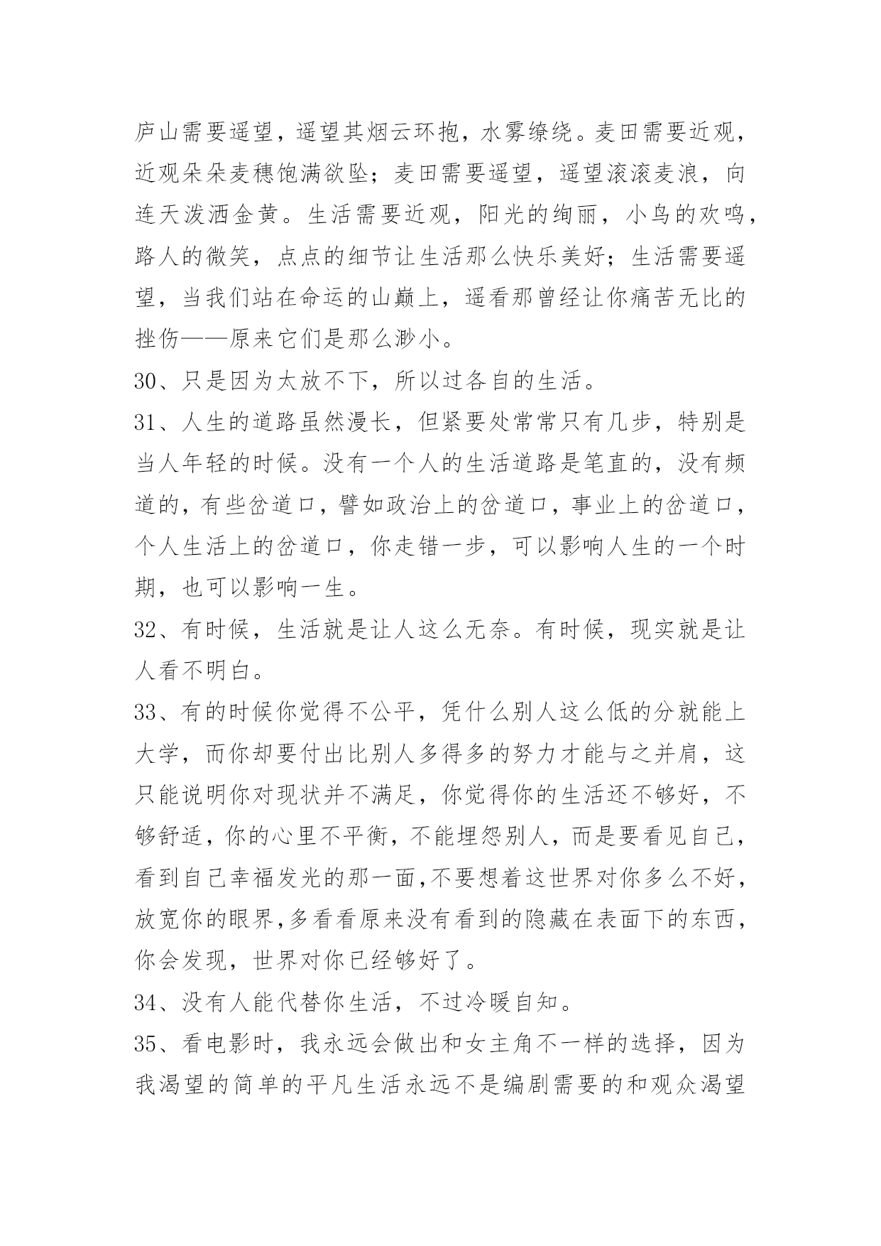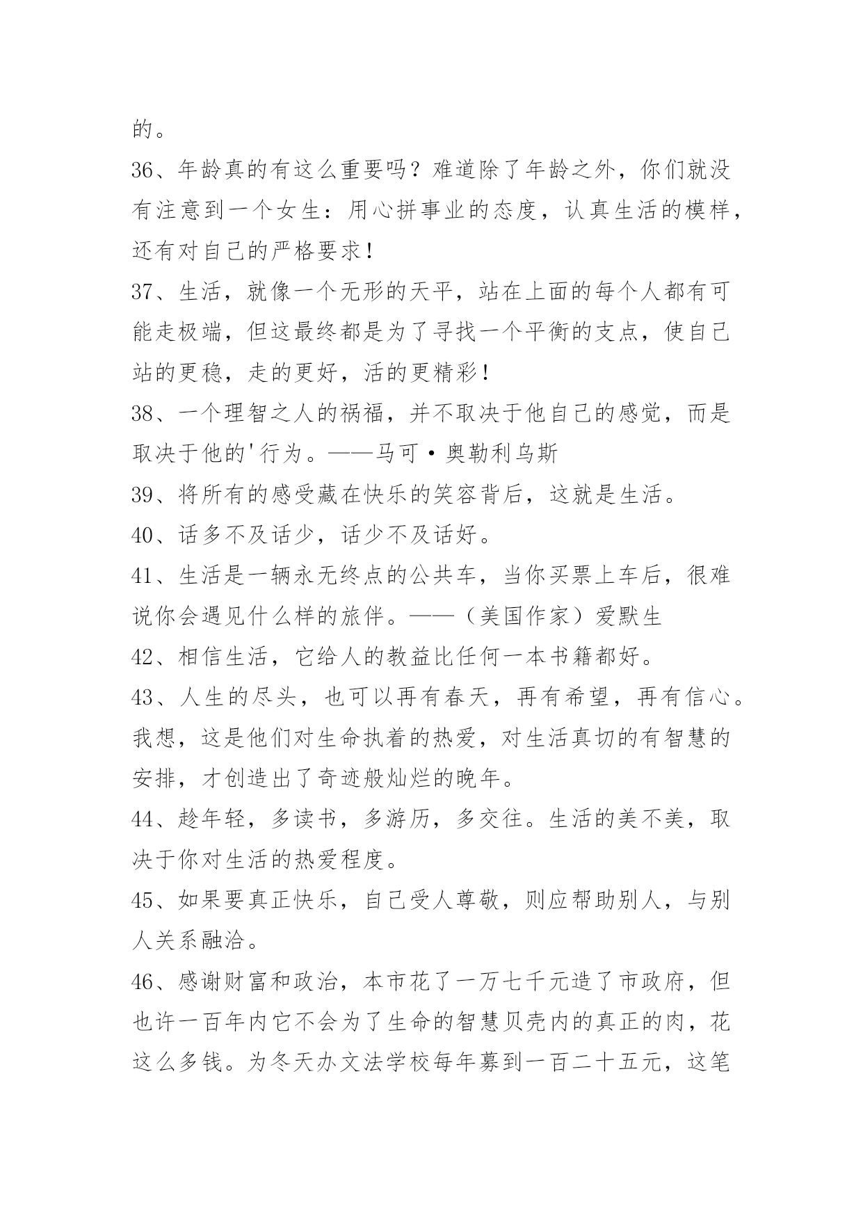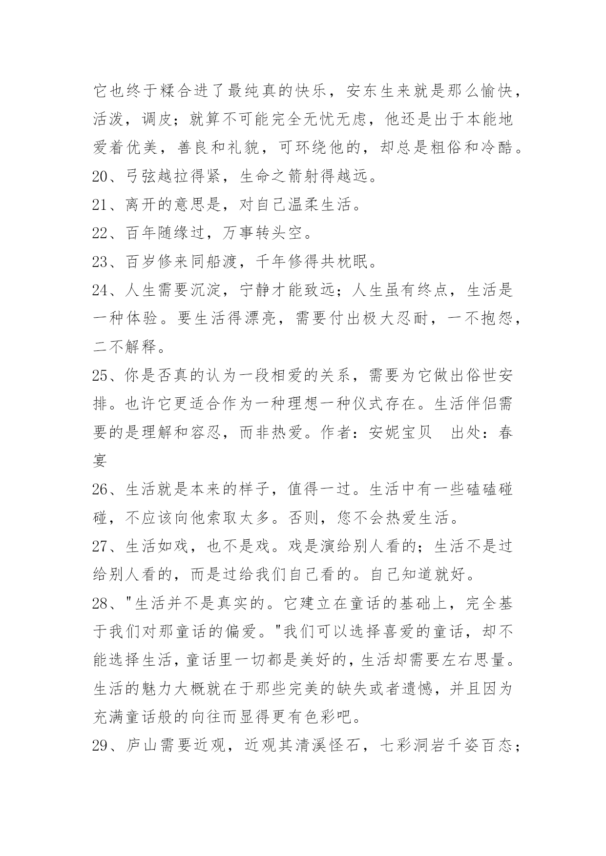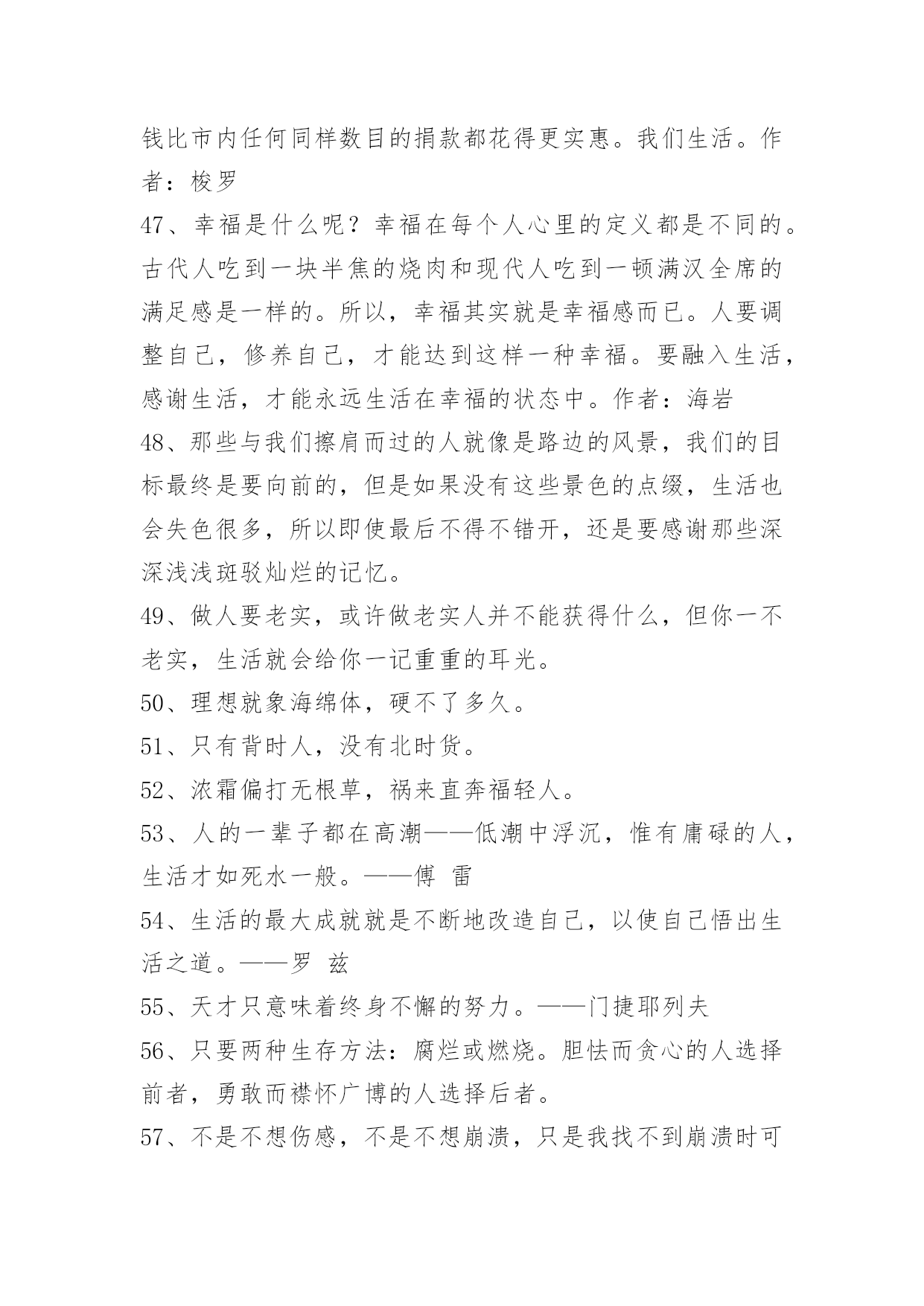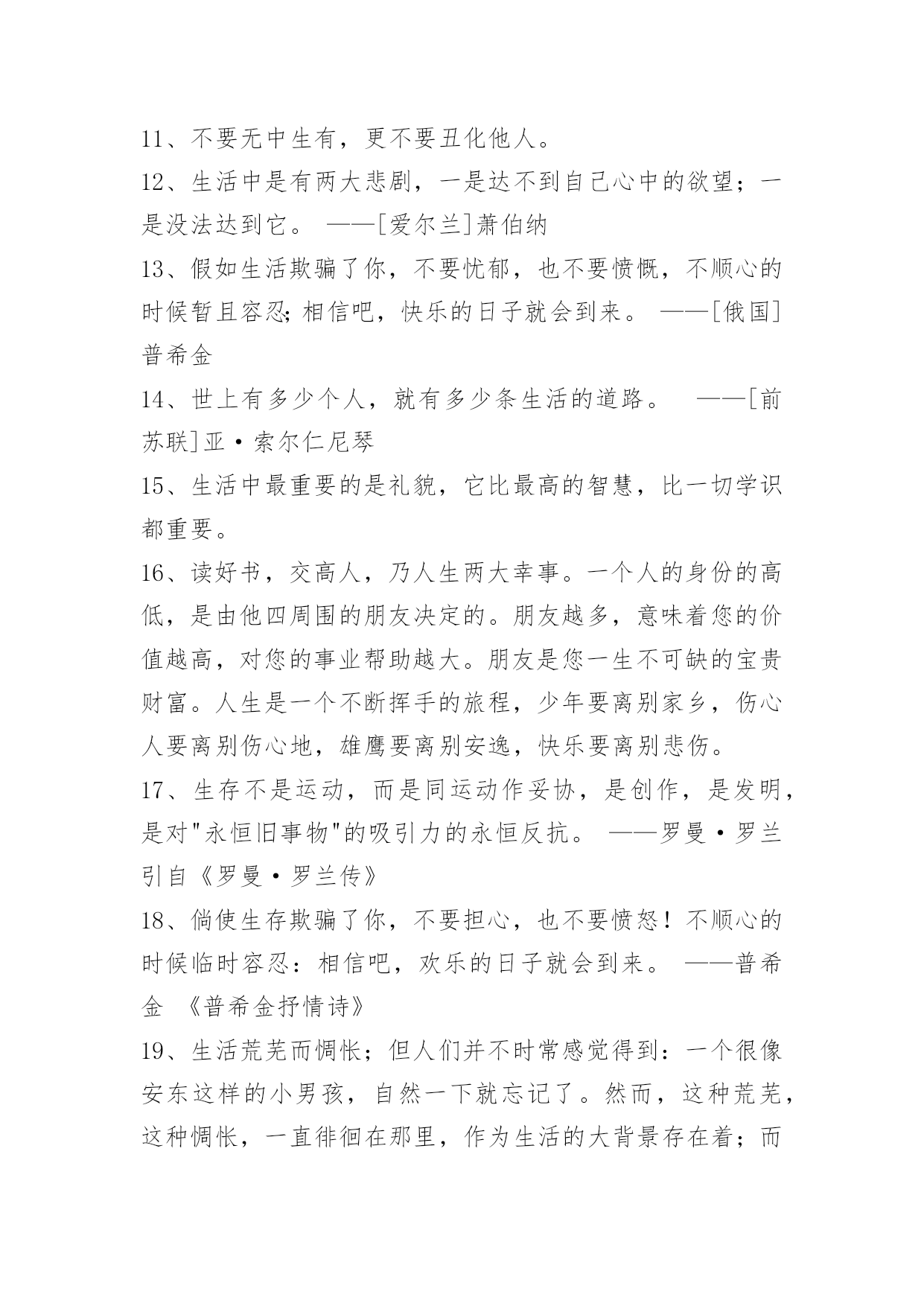 生活名言名句60条精选生活名言名句汇编60条没有你,我的生活怎样继续?以下是小编收集整理的生活名言名句60条,欢迎阅读。1、所谓责任,并不是谁都有心愿意负担。而所谓命运,就是人各有路。2、每个女人都应该为自己打算,这是她们的责任!谁会来代她绸缪?不,我有的,不过是自己。3、人要知福,惜福,再造福,才最有福。4、生活是条难走的路,高低不平,坎坎坷坷,有喜悦也有忧伤,交替着向前演释。人就是在这样的环境中走向成熟,但不能逆来顺受,磨掉生活的梭角,要勇于奋进,知难而上,面对生活,感谢生命的情有独钟。5、如果有来世,要做一棵树,站成永恒,没有悲欢的姿势。一半在土里安详,一半在风里飞扬,一半洒落阴凉,一半沐浴阳光,非常沉默非常骄傲,从不依靠从不寻找。6、对知识的渴求是人类的自然意向,任何头脑健全的人都会为获取知识而不惜一切。(塞·约翰逊)7、生活之树是常青的。8、快于意者云于行。——《燕丹子》9、少欲觉身轻。——黄宗羲10、胜利都永久不会言弃,抛弃者永久不会胜利。11、不要无中生有,更不要丑化他人。12、生活中是有两大悲剧,一是达不到自己心中的欲望;一是没法达到它。——[爱尔兰]萧伯纳13、假如生活欺骗了你,不要忧郁,也不要愤慨,不顺心的时候暂且容忍;相信吧,快乐的日子就会到来。——[俄国]普希金14、世上有多少个人,就有多少条生活的道路。——[前苏联]亚·索尔仁尼琴15、生活中最重要的是礼貌,它比最高的智慧,比一切学识都重要。16、读好书,交高人,乃人生两大幸事。一个人的身份的高低,是由他四周围的朋友决定的。朋友越多,意味着您的价值越高,对您的事业帮助越大。朋友是您一生不可缺的宝贵财富。人生是一个不断挥手的旅程,少年要离别家乡,伤心人要离别伤心地,雄鹰要离别安逸,快乐要离别悲伤。17、生存不是运动,而是同运动作妥协,是创作,是发明,是对"永恒旧事物"的吸引力的永恒反抗。——罗曼·罗兰引自《罗曼·罗兰传》18、倘使生存欺骗了你,不要担心,也不要愤怒!不顺心的时候临时容忍:相信吧,欢乐的日子就会到来。——普希金《普希金抒情诗》19、生活荒芜而惆怅;但人们并不时常感觉得到:一个很像安东这样的小男孩,自然一下就忘记了。然而,这种荒芜,这种惆怅,一直徘徊在那里,作为生活的大背景存在着;而它也终于糅合进了最纯真的快乐,安东生来就是那么愉快,活泼,调皮;就算不可能完全无忧无虑,他还是出于本能地爱着优美,善良和礼貌,可环绕他的,却总是粗俗和冷酷。20、弓弦越拉得紧,生命之箭射得越远。21、离开的意思是,对自己温柔生活。22、百年随缘过,万事转头空。23、百岁修来同船渡,千年修得共枕眠。24、人生需要沉淀,宁静才能致远;人生虽有终点,生活是一种体验。要生活得漂亮,需要付出极大忍耐,一不抱怨,二不解释。25、你是否真的认为一段相爱的关系,需要为它做出俗世安排。也许它更适合作为一种理想一种仪式存在。生活伴侣需要的是理解和容忍,而非热爱。作者:安妮宝贝出处:春宴26、生活就是本来的样子,值得一过。生活中有一些磕磕碰碰,不应该向他索取太多。否则,您不会热爱生活。27、生活如戏,也不是戏。戏是演给别人看的;生活不是过给别人看的,而是过给我们自己看的。自己知道就好。28、"生活并不是真实的。它建立在童话的基础上,完全基于我们对那童话的偏爱。"我们可以选择喜爱的童话,却不能选择生活,童话里一切都是美好的,生活却需要左右思量。生活的魅力大概就在于那些完美的缺失或者遗憾,并且因为充满童话般的向往而显得更有色彩吧。29、庐山需要近观,近观其清溪怪石,七彩洞岩千姿百态;庐山需要遥望,遥望其烟云环抱,水雾缭绕。麦田需要近观,近观朵朵麦穗饱满欲坠;麦田需要遥望,遥望滚滚麦浪,向连天泼洒金黄。生活需要近观,阳光的绚丽,小鸟的欢鸣,路人的微笑,点点的细节让生活那么快乐美好;生活需要遥望,当我们站在命运的山巅上,遥看那曾经让你痛苦无比的挫伤——原来它们是那么渺小。30、只是因为太放不下,所以过各自的生活。31、人生的道路虽然漫长,但紧要处常常只有几步,特别是当人年轻的时候。没有一个人的生活道路是笔直的,没有频道的,有些岔道口,譬如政治上的岔道口,事业上的岔道口,个人生活上的岔道口,你走错一步,可以影响人生的一个时期,也可以影响一生。32、有时候,生活就是让人这么无奈。有时候,现实就是让人看不明白。33、有的时候你觉得不公平,凭什么别人这么低的分就能上大学,而你却要付出比别人多得多的努力才能与之并肩,这只能说明你对现状并不满足,你觉得你的生活还不够好,不够舒适,你的心里不平衡,不能埋怨别人,而是要看见自己,看到自己幸福发光的那一面,不要想着这世界对你多么不好,放宽你的眼界,多看看原来没有看到的隐藏在表面下的东西,你会发现,世界对你已经够好了。34、没有人能代替你生活,不过冷暖自知。3