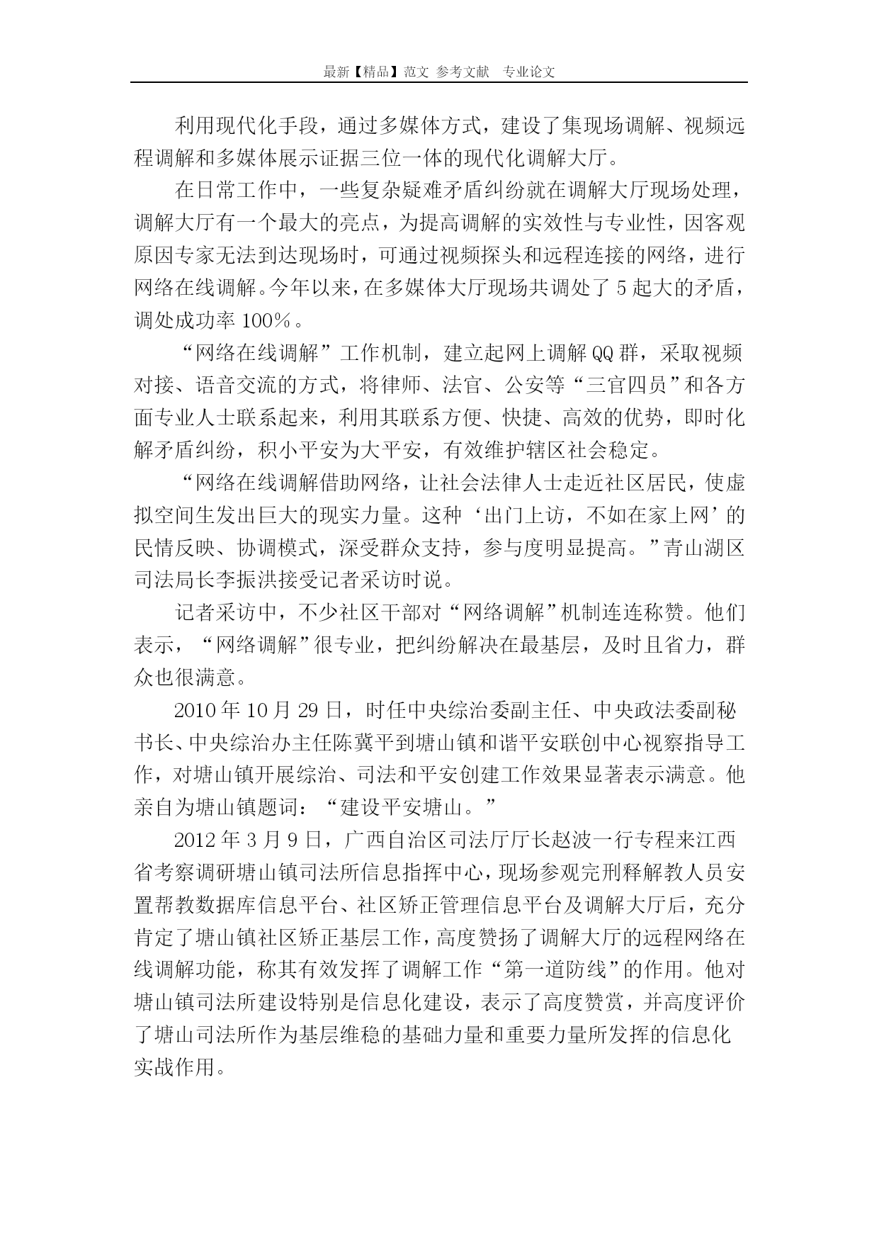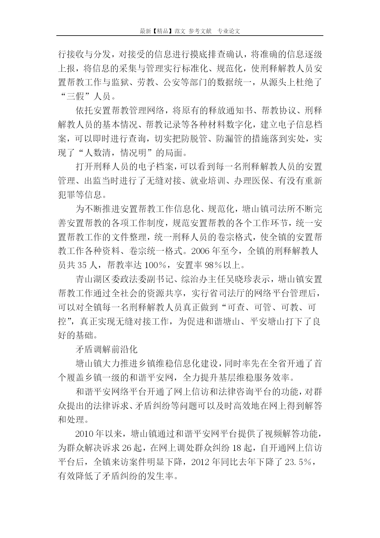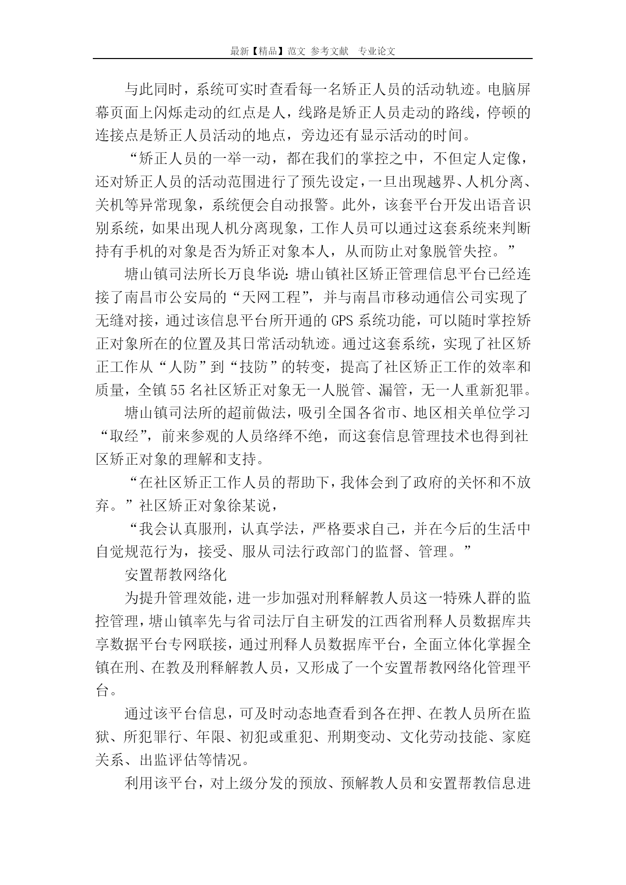 最新【精品】范文参考文献专业论文“数字司法”助推“平安塘山”“数字司法”助推“平安塘山”青山湖区塘山镇地处南昌市城东,是新城区发展的腹地,作为城乡结合地带,面临着辖区内人员结构复杂、流动人口多等一系列新问题。在繁重的管理压力下,2009年,塘山镇司法所在成立“塘山镇矛盾纠纷调处中心”(后改名为“塘山镇和谐平安联创中心”)的基础上,创新工作方法,积极探索司法行政工作,充分挖掘、利用现代化科学信息技术手段,建立起全省首家集中、统一的综合信息指挥“数字司法”大平台。该信息平台突出“社区矫正、安置帮教、矛盾调解”等功能,应用工作达到了全国领先水平,为全省司法所信息化建设提供了经验、树立了榜样,成为江西司法行政工作的一大亮点、一大品牌。同时,也成为该镇稳定工作的一项基础力量和重要力量。社区矫正跟踪化2012年10月16日10时许,塘山镇基层维稳信息指挥中心大厅,醒目的4块电脑屏幕悬挂在大厅中央,工作人员坐在电脑前轻松操作,查看社区矫正对象的具体信息。工作人员轻点第四块电脑屏幕打开社区矫正系统页面,可以看到通知公告、信息提醒、矫正人员基本情况、法律法规等分栏。只要用鼠标点击一名社区矫正人员的姓名,屏幕上马上出现他所犯的罪名、刑期、矫正结束期等信息,并显示他现在所处的位置。系统操作员向记者现场演示,在社区矫正系统中,找到模拟“矫正对象”万斌的动态情况。通过GPRS系统在电子地图上可以实时查看到他的所处位置,同时还可以通过全镇监控探头,实时看到他的图像。司法所工作人员锁定万斌的所在位置是在辖区广盛电子厂门口,打电话示意他对着监控摄像头挥挥手,站在指挥中心大厅内的人,可以清清楚楚看到万斌的一举一动。与此同时,系统可实时查看每一名矫正人员的活动轨迹。电脑屏幕页面上闪烁走动的红点是人,线路是矫正人员走动的路线,停顿的连接点是矫正人员活动的地点,旁边还有显示活动的时间。“矫正人员的一举一动,都在我们的掌控之中,不但定人定像,还对矫正人员的活动范围进行了预先设定,一旦出现越界、人机分离、关机等异常现象,系统便会自动报警。此外,该套平台开发出语音识别系统,如果出现人机分离现象,工作人员可以通过这套系统来判断持有手机的对象是否为矫正对象本人,从而防止对象脱管失控。”塘山镇司法所长万良华说:塘山镇社区矫正管理信息平台已经连接了南昌市公安局的“天网工程”,并与南昌市移动通信公司实现了无缝对接,通过该信息平台所开通的GPS系统功能,可以随时掌控矫正对象所在的位置及其日常活动轨迹。通过这套系统,实现了社区矫正工作从“人防”到“技防”的转变,提高了社区矫正工作的效率和质量,全镇55名社区矫正对象无一人脱管、漏管,无一人重新犯罪。塘山镇司法所的超前做法,吸引全国各省市、地区相关单位学习“取经”,前来参观的人员络绎不绝,而这套信息管理技术也得到社区矫正对象的理解和支持。“在社区矫正工作人员的帮助下,我体会到了政府的关怀和不放弃。”社区矫正对象徐某说,“我会认真服刑,认真学法,严格要求自己,并在今后的生活中自觉规范行为,接受、服从司法行政部门的监督、管理。”安置帮教网络化为提升管理效能,进一步加强对刑释解教人员这一特殊人群的监控管理,塘山镇率先与省司法厅自主研发的江西省刑释人员数据库共享数据平台专网联接,通过刑释人员数据库平台,全面立体化掌握全镇在刑、在教及刑释解教人员,又形成了一个安置帮教网络化管理平台。通过该平台信息,可及时动态地查看到各在押、在教人员所在监狱、所犯罪行、年限、初犯或重犯、刑期变动、文化劳动技能、家庭关系、出监评估等情况。利用该平台,对上级分发的预放、预解教人员和安置帮教信息进行接收与分发,对接受的信息进行摸底排查确认,将准确的信息逐级上报,将信息的采集与管理实行标准化、规范化,使刑释解教人员安置帮教工作与监狱、劳教、公安等部门的数据统一,从源头上杜绝了“三假”人员。依托安置帮教管理网络,将原有的释放通知书、帮教协议、刑释解教人员的基本情况、帮教记录等各种材料数字化,建立电子信息档案,可以即时进行查询,切实把防脱管、防漏管的措施落到实处,实现了“人数清,情况明”的局面。打开刑释人员的电子档案,可以看到每一名刑释解教人员的安置管理、出监当时进行了无缝对接、就业培训、办理医保、有没有重新犯罪等信息。为不断推进安置帮教工作信息化、规范化,塘山镇司法所不断完善安置帮教的各项工作制度,规范安置帮教的各个工作环节,统一安置帮教工作的文件整理,统一刑释人员的卷宗格式,使全镇的安置帮教工作各种资料、卷宗统一格式。2006年至今,全镇的刑释解教人员共35人,帮教率达100%,安置率98%以上。青山湖区委政法委副书记、综治办主任吴晓珍表示,塘山镇安置帮教工作通过全社会的资源共享,实行省司法厅的网络平台管理后,可以对全镇
