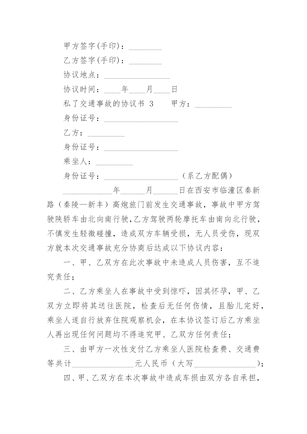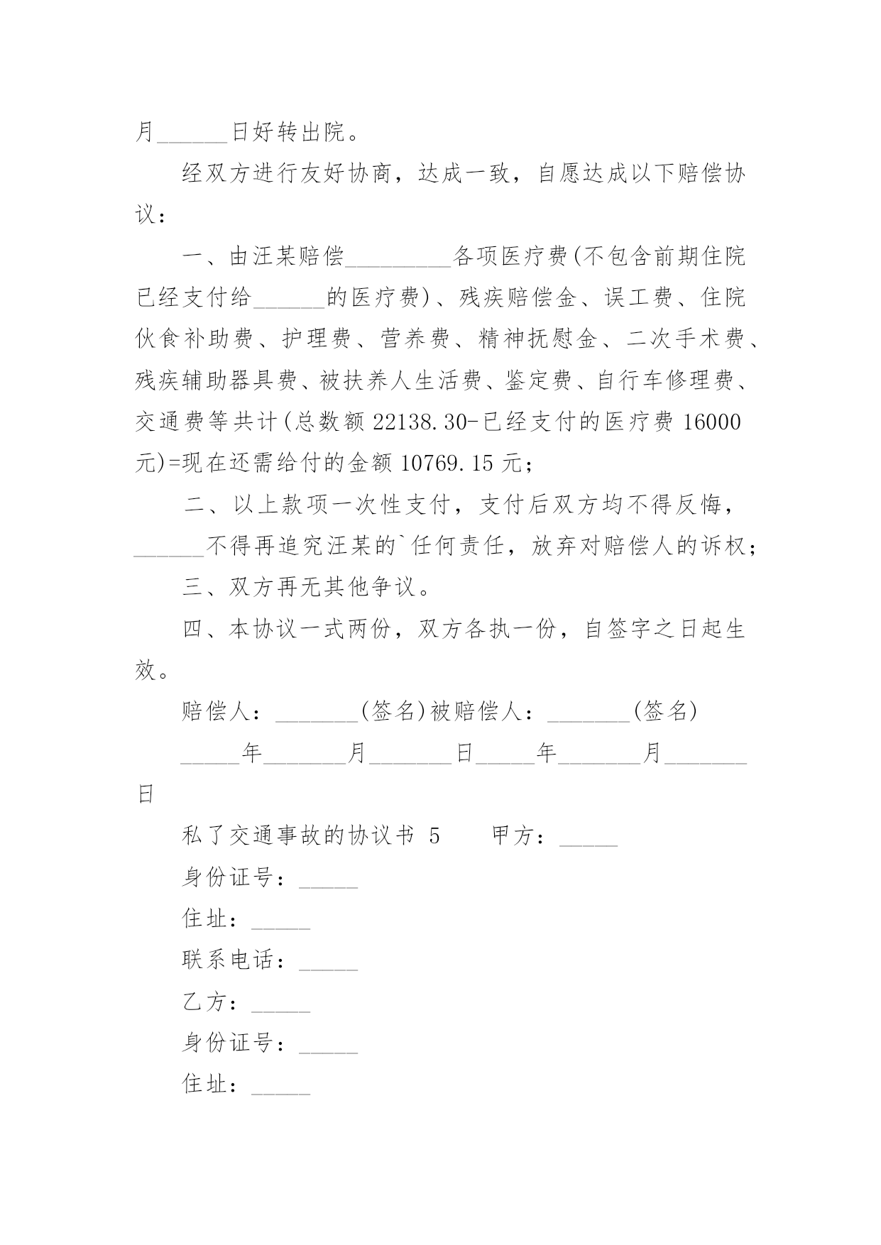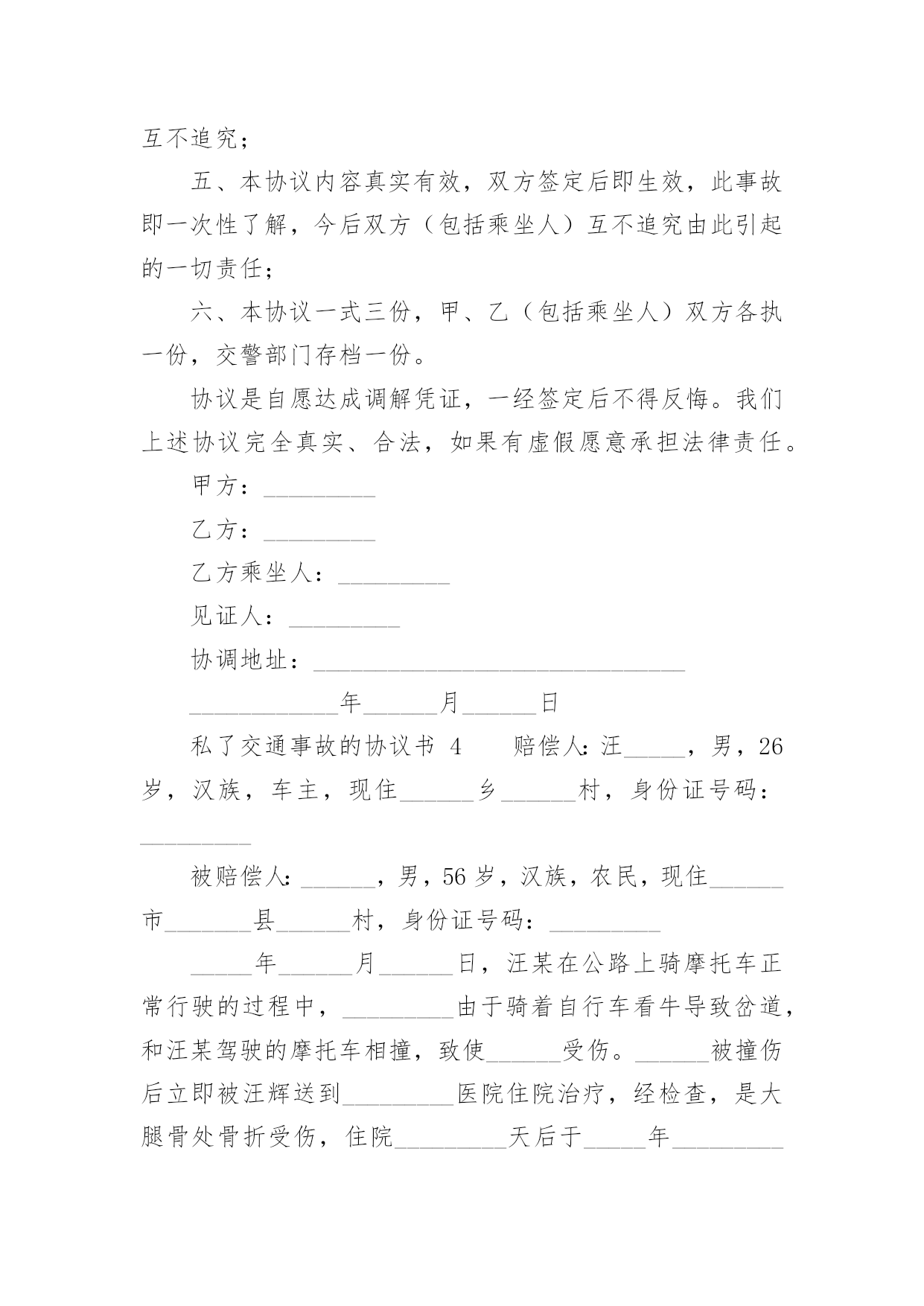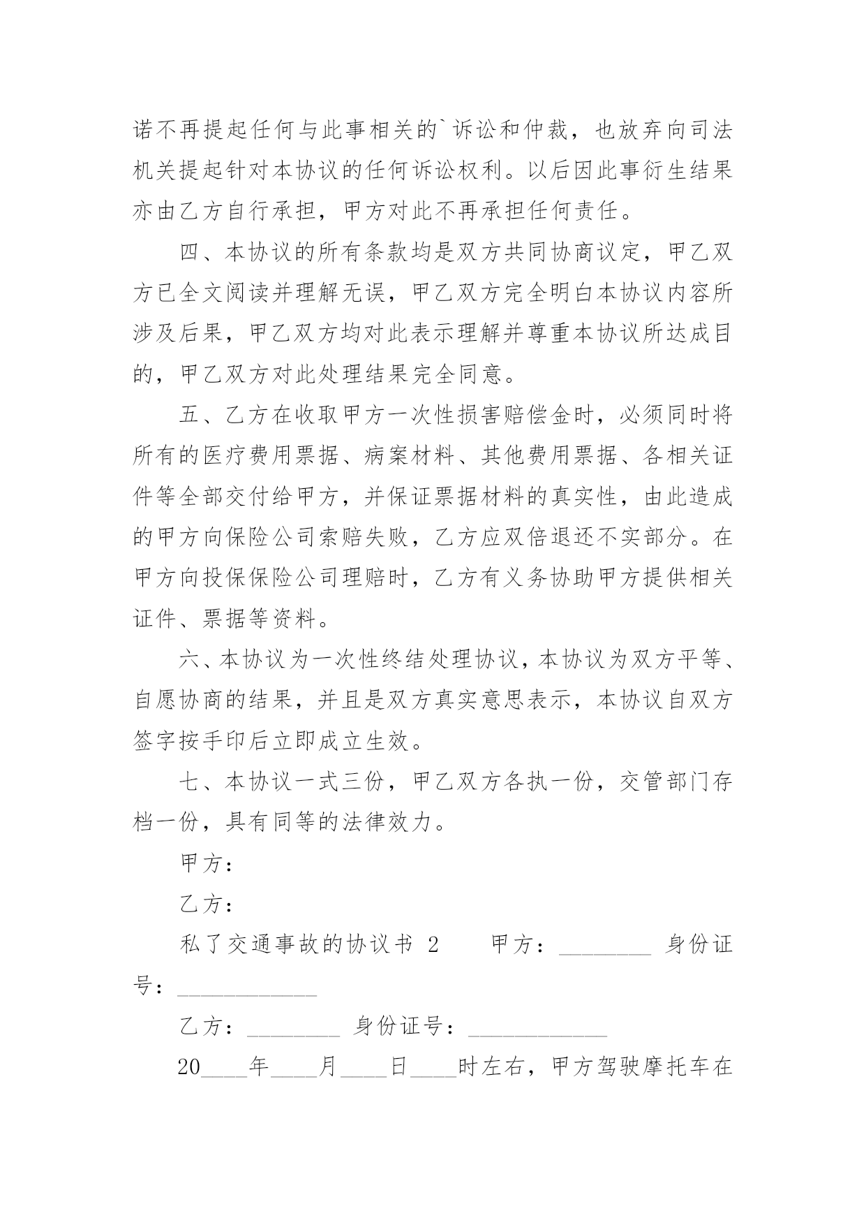 私了交通事故的协议书私了交通事故的协议书(精选22篇)在现在的社会生活中,协议的使用成为日常生活的常态,签订协议可以使双方受到法律的保护。那么什么样的协议才是有效的呢?下面是小编精心整理的私了交通事故的协议书,欢迎阅读与收藏。私了交通事故的协议书1甲方:(身份证号码:)乙方:(身份证号码:)20______年______月______日,甲方骑摩托车不小心撞伤乙方后,甲方及时履行报警和救助义务,并支付了乙方就医、康复冶疗、生活补助、营养费、交通费护理费等费用共计人民币45000元(大写:肆万伍仟元整),目前乙方要求甲方一次性解决,甲乙双方在平等、自愿协商及充分了解相关法律法规的基础上,并征得处理交通事故的大安交警同意,达成如下协议:一、甲乙双方依据交通事故处理的一般原则达成一次性赔偿协议,甲方一次性支付乙方人民币8000元(大写:壹万捌仟元整)。二、在甲方支付人民币8000元后,乙方保证今后绝不以任何理由和任何形式就此事再向甲方要求各种名义补助、补偿等费用,后续事宜及费用均由乙方自行处理和承担。三、在乙方收到甲方支付的人民币8000元后,此事处理即告终结,甲乙双方之间不再存在任何权利义务,乙方承诺不再提起任何与此事相关的`诉讼和仲裁,也放弃向司法机关提起针对本协议的任何诉讼权利。以后因此事衍生结果亦由乙方自行承担,甲方对此不再承担任何责任。四、本协议的所有条款均是双方共同协商议定,甲乙双方已全文阅读并理解无误,甲乙双方完全明白本协议内容所涉及后果,甲乙双方均对此表示理解并尊重本协议所达成目的,甲乙双方对此处理结果完全同意。五、乙方在收取甲方一次性损害赔偿金时,必须同时将所有的医疗费用票据、病案材料、其他费用票据、各相关证件等全部交付给甲方,并保证票据材料的真实性,由此造成的甲方向保险公司索赔失败,乙方应双倍退还不实部分。在甲方向投保保险公司理赔时,乙方有义务协助甲方提供相关证件、票据等资料。六、本协议为一次性终结处理协议,本协议为双方平等、自愿协商的结果,并且是双方真实意思表示,本协议自双方签字按手印后立即成立生效。七、本协议一式三份,甲乙双方各执一份,交管部门存档一份,具有同等的法律效力。甲方:乙方:私了交通事故的协议书2甲方:________身份证号:____________乙方:________身份证号:____________20____年____月____日____时左右,甲方驾驶摩托车在佛山大道与人民路交叉路段与乙方发生刮碰,事发之后,甲方及时将乙方送到____市____医院进行了CT和B超检查,经医院医师诊断为软组织损伤,没有造成器官的损伤及其他身体部位伤害。甲、乙双方经平等友好协商,就乙方遭受的损失自愿达成一次性赔偿协议,现依据国家有关法律、法规,对具体的赔偿事宜和双方权利义务明确如下:一、甲方自本协议签订后5日内向乙方支付一次性损害赔偿金共计10000元人民币(大写:壹万圆整)(不包括已经支付的.医药费,交通费等20______元)。二、第一条的一次性损害赔偿金包含乙方因此次事故所需的交通费、护理费、误工费、伙食住宿费、后续治疗费、精神损失费等各项损失赔偿。三、乙方在收取甲方一次性损害赔偿金时,必须同时将所有的医疗费用票据、病案材料、其他费用票据等全部交付给甲方,并保证票据材料的真实性。四、本协议所涉及的赔偿是一次性终结赔偿,甲方支付乙方费用后,今后乙方不得以任何理由向甲方主张任何权利,甲方不再负有任何赔偿责任。五、本协议签订时,双方均是在自愿的情形下签订的,不存在任何重大误解或显失公平的情形,甲、乙双方不得以任何理由对于协议提出反悔。六、本协议自双方当事人签字后生效。七、本协议一式二份,甲乙双方各执一份。二份均是协议正本,具有同等法律效力。甲方签字(手印):________乙方签字(手印):________协议地点:________________协议时间:____年____月____日私了交通事故的协议书3甲方:_________身份证号:__________________乙方:_________身份证号:__________________乘坐人:_________身份证号:__________________(系乙方配偶)____________年______月______日在西安市临潼区秦新路(秦陵—新丰)高炮旅门前发生交通事故,事故中甲方驾驶陕轿车由北向南行驶,乙方驾驶两轮摩托车由南向北行驶,不慎发生轻微碰撞,造成双方车辆受损,无人员受伤,现双方就本次交通事故充分协商后达成以下协议内容:一、甲、乙双方在此次事故中未造成人员伤害,互不追究责任;二、乙方乘坐人在事故中受到惊吓,因其怀孕,甲、乙双方立即将其送往医院,检查后无任何伤情,且胎儿完好,乘坐人遂自行放弃住院观察机会,在本协议签订后乙方乘坐