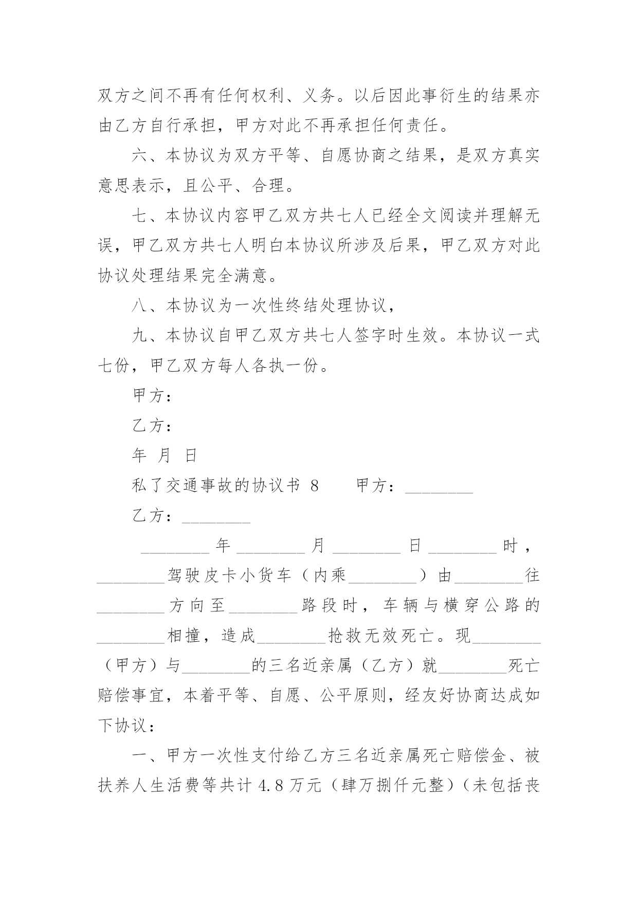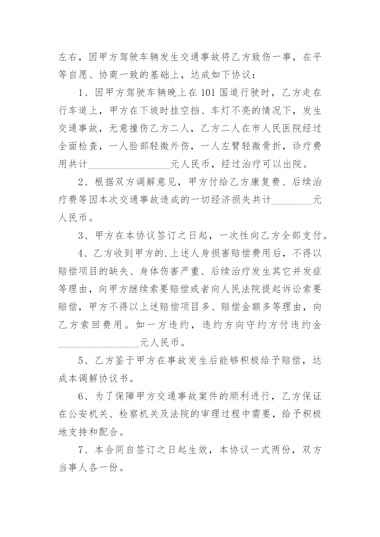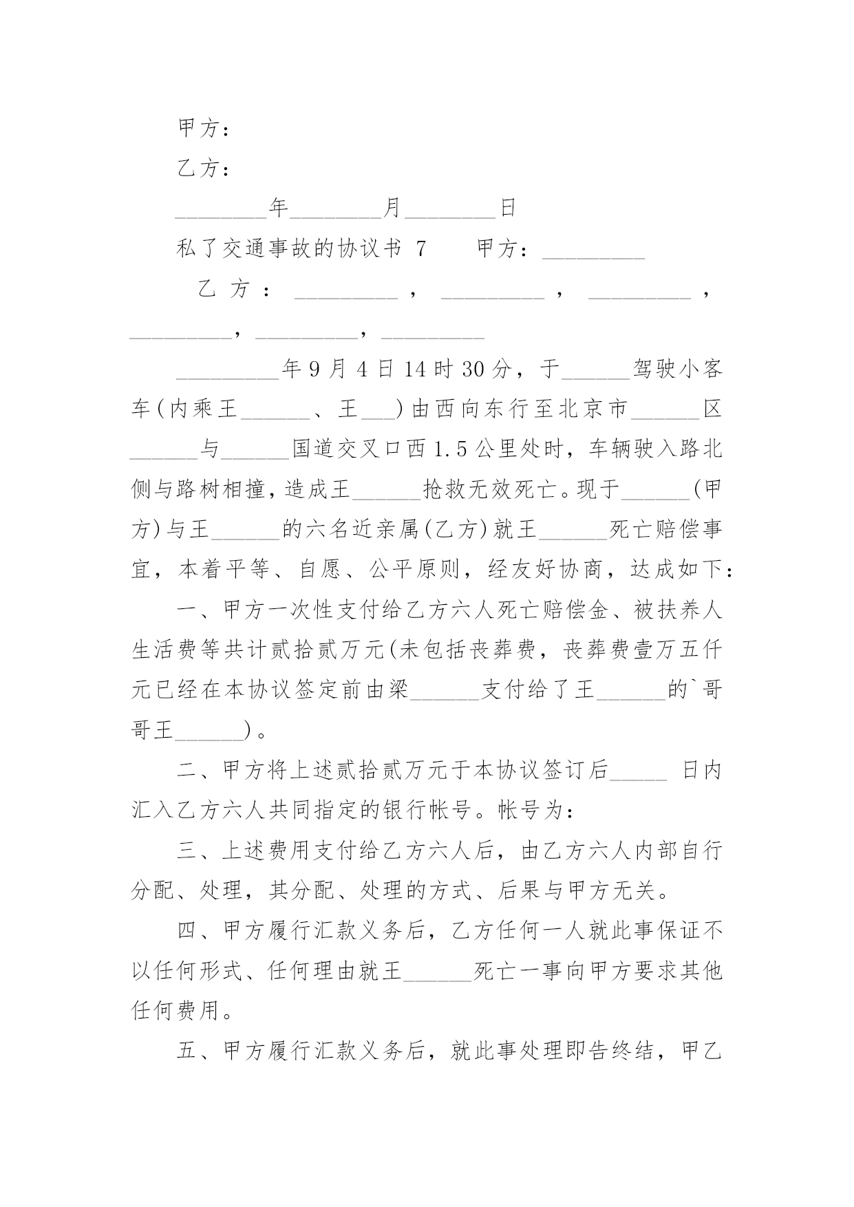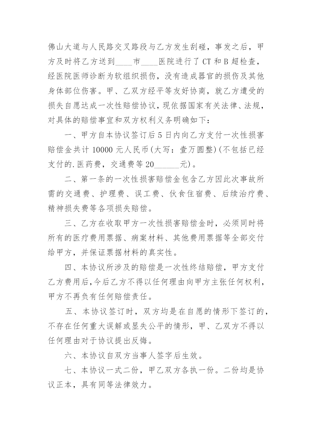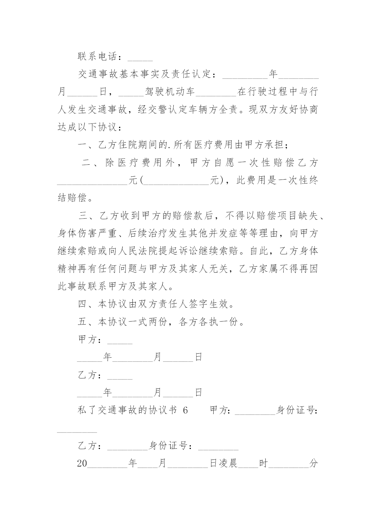 私了交通事故的协议书私了交通事故的协议书(精选22篇)在现在的社会生活中,协议的使用成为日常生活的常态,签订协议可以使双方受到法律的保护。那么什么样的协议才是有效的呢?下面是小编精心整理的私了交通事故的协议书,欢迎阅读与收藏。私了交通事故的协议书1甲方:(身份证号码:)乙方:(身份证号码:)20______年______月______日,甲方骑摩托车不小心撞伤乙方后,甲方及时履行报警和救助义务,并支付了乙方就医、康复冶疗、生活补助、营养费、交通费护理费等费用共计人民币45000元(大写:肆万伍仟元整),目前乙方要求甲方一次性解决,甲乙双方在平等、自愿协商及充分了解相关法律法规的基础上,并征得处理交通事故的大安交警同意,达成如下协议:一、甲乙双方依据交通事故处理的一般原则达成一次性赔偿协议,甲方一次性支付乙方人民币8000元(大写:壹万捌仟元整)。二、在甲方支付人民币8000元后,乙方保证今后绝不以任何理由和任何形式就此事再向甲方要求各种名义补助、补偿等费用,后续事宜及费用均由乙方自行处理和承担。三、在乙方收到甲方支付的人民币8000元后,此事处理即告终结,甲乙双方之间不再存在任何权利义务,乙方承诺不再提起任何与此事相关的`诉讼和仲裁,也放弃向司法机关提起针对本协议的任何诉讼权利。以后因此事衍生结果亦由乙方自行承担,甲方对此不再承担任何责任。四、本协议的所有条款均是双方共同协商议定,甲乙双方已全文阅读并理解无误,甲乙双方完全明白本协议内容所涉及后果,甲乙双方均对此表示理解并尊重本协议所达成目的,甲乙双方对此处理结果完全同意。五、乙方在收取甲方一次性损害赔偿金时,必须同时将所有的医疗费用票据、病案材料、其他费用票据、各相关证件等全部交付给甲方,并保证票据材料的真实性,由此造成的甲方向保险公司索赔失败,乙方应双倍退还不实部分。在甲方向投保保险公司理赔时,乙方有义务协助甲方提供相关证件、票据等资料。六、本协议为一次性终结处理协议,本协议为双方平等、自愿协商的结果,并且是双方真实意思表示,本协议自双方签字按手印后立即成立生效。七、本协议一式三份,甲乙双方各执一份,交管部门存档一份,具有同等的法律效力。甲方:乙方:私了交通事故的协议书2甲方:________身份证号:____________乙方:________身份证号:____________20____年____月____日____时左右,甲方驾驶摩托车在佛山大道与人民路交叉路段与乙方发生刮碰,事发之后,甲方及时将乙方送到____市____医院进行了CT和B超检查,经医院医师诊断为软组织损伤,没有造成器官的损伤及其他身体部位伤害。甲、乙双方经平等友好协商,就乙方遭受的损失自愿达成一次性赔偿协议,现依据国家有关法律、法规,对具体的赔偿事宜和双方权利义务明确如下:一、甲方自本协议签订后5日内向乙方支付一次性损害赔偿金共计10000元人民币(大写:壹万圆整)(不包括已经支付的.医药费,交通费等20______元)。二、第一条的一次性损害赔偿金包含乙方因此次事故所需的交通费、护理费、误工费、伙食住宿费、后续治疗费、精神损失费等各项损失赔偿。三、乙方在收取甲方一次性损害赔偿金时,必须同时将所有的医疗费用票据、病案材料、其他费用票据等全部交付给甲方,并保证票据材料的真实性。四、本协议所涉及的赔偿是一次性终结赔偿,甲方支付乙方费用后,今后乙方不得以任何理由向甲方主张任何权利,甲方不再负有任何赔偿责任。五、本协议签订时,双方均是在自愿的情形下签订的,不存在任何重大误解或显失公平的情形,甲、乙双方不得以任何理由对于协议提出反悔。六、本协议自双方当事人签字后生效。七、本协议一式二份,甲乙双方各执一份。二份均是协议正本,具有同等法律效力。甲方签字(手印):________乙方签字(手印):________协议地点:________________协议时间:____年____月____日私了交通事故的协议书3甲方:_________身份证号:__________________乙方:_________身份证号:__________________乘坐人:_________身份证号:__________________(系乙方配偶)____________年______月______日在西安市临潼区秦新路(秦陵—新丰)高炮旅门前发生交通事故,事故中甲方驾驶陕轿车由北向南行驶,乙方驾驶两轮摩托车由南向北行驶,不慎发生轻微碰撞,造成双方车辆受损,无人员受伤,现双方就本次交通事故充分协商后达成以下协议内容:一、甲、乙双方在此次事故中未造成人员伤害,互不追究责任;二、乙方乘坐人在事故中受到惊吓,因其怀孕,甲、乙双方立即将其送往医院,检查后无任何伤情,且胎儿完好,乘坐人遂自行放弃住院观察机会,在本协议签订后乙方乘坐