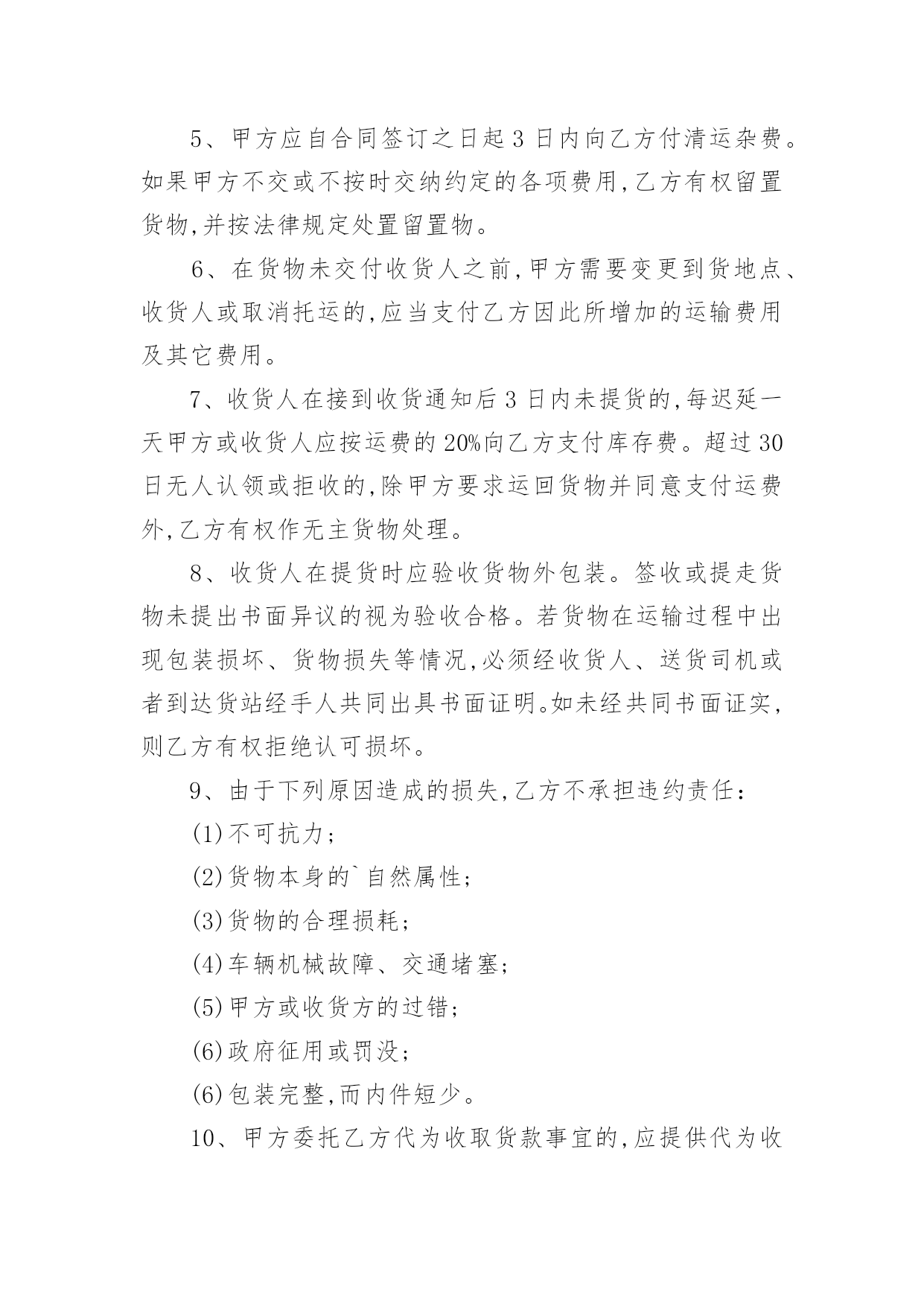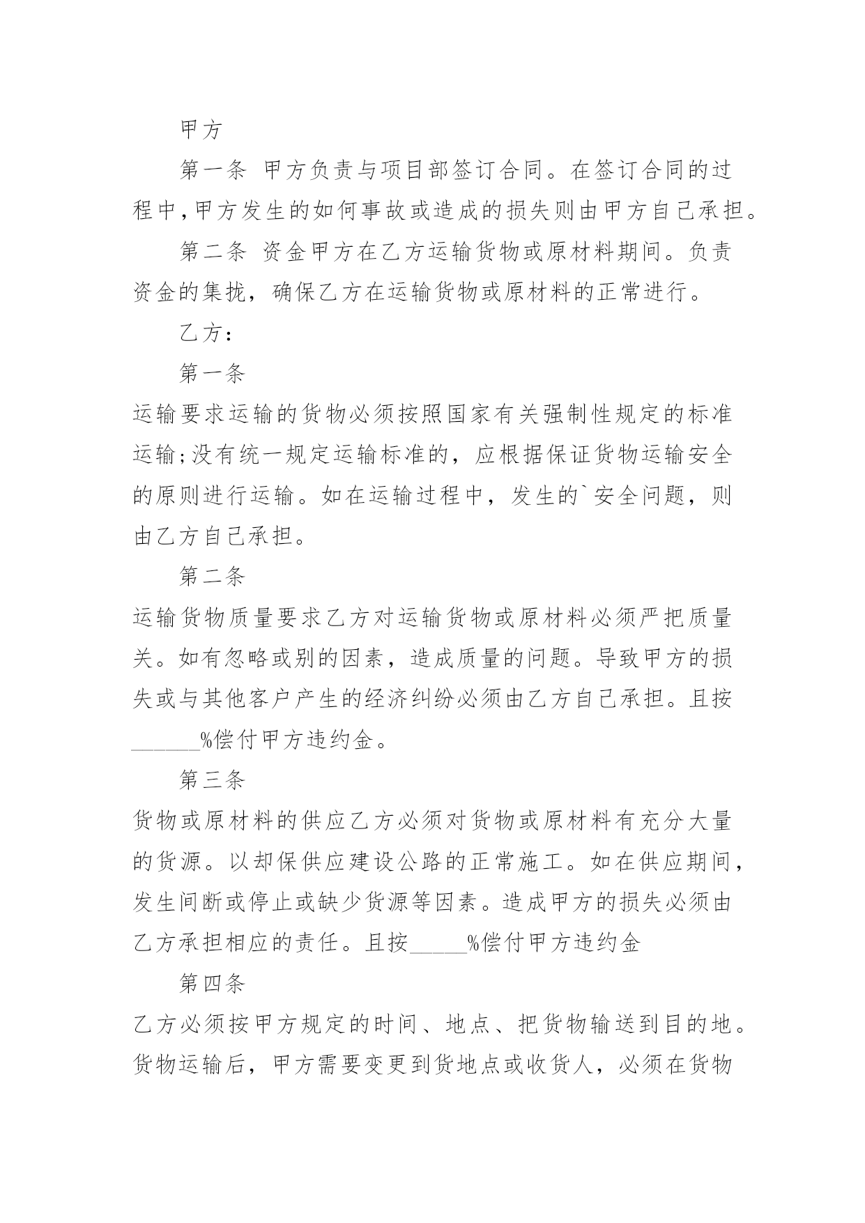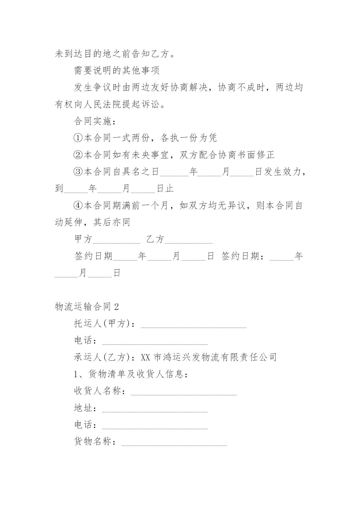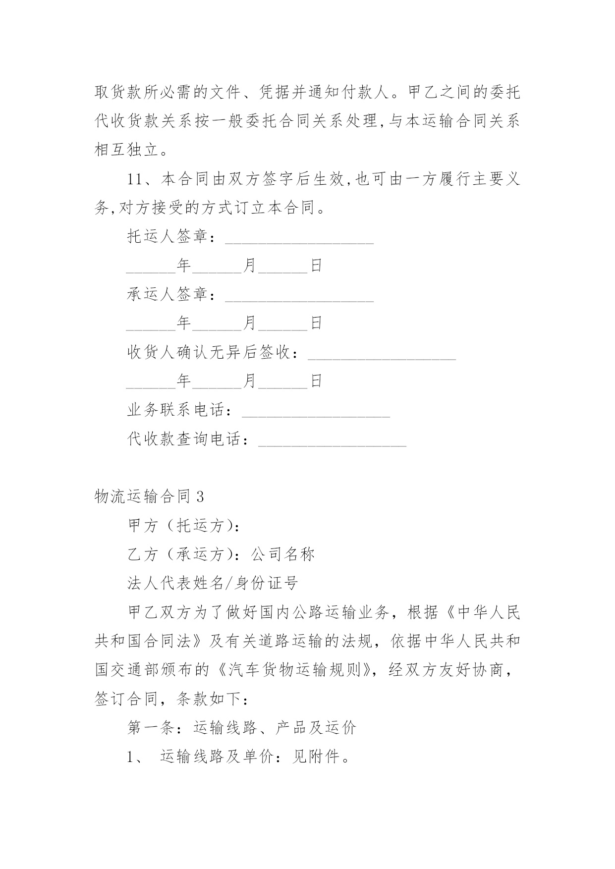 物流运输合同物流运输合同15篇(精)在人们的法律意识不断增强的社会,合同的法律效力与日俱增,签订合同也是非常有必要的行为。那么大家知道合同的格式吗?以下是小编为大家收集的物流运输合同,希望对大家有所帮助。物流运输合同1甲方:___________;乙方:___________;甲方详细地址:______,联系方式:______。乙方详细地址:______,联系方式:______。根据《中华人民共和国合同法》等有关法律规定,经过双方充分协商,特订立本合同,以便双方共同遵守。运输货物的名称、规格、数量、运输费价款货物编号___________品名___________规格___________单位___________单价___________数量___________金额(元)___________甲方第一条甲方负责与项目部签订合同。在签订合同的过程中,甲方发生的如何事故或造成的损失则由甲方自己承担。第二条资金甲方在乙方运输货物或原材料期间。负责资金的集拢,确保乙方在运输货物或原材料的正常进行。乙方:第一条运输要求运输的货物必须按照国家有关强制性规定的标准运输;没有统一规定运输标准的,应根据保证货物运输安全的原则进行运输。如在运输过程中,发生的`安全问题,则由乙方自己承担。第二条运输货物质量要求乙方对运输货物或原材料必须严把质量关。如有忽略或别的因素,造成质量的问题。导致甲方的损失或与其他客户产生的经济纠纷必须由乙方自己承担。且按______%偿付甲方违约金。第三条货物或原材料的供应乙方必须对货物或原材料有充分大量的货源。以却保供应建设公路的正常施工。如在供应期间,发生间断或停止或缺少货源等因素。造成甲方的损失必须由乙方承担相应的责任。且按_____%偿付甲方违约金第四条乙方必须按甲方规定的时间、地点、把货物输送到目的地。货物运输后,甲方需要变更到货地点或收货人,必须在货物未到达目的地之前告知乙方。需要说明的其他事项发生争议时由两边友好协商解决,协商不成时,两边均有权向人民法院提起诉讼。合同实施:①本合同一式两份,各执一份为凭②本合同如有未央事宜,双方配合协商书面修正③本合同自具名之日______年_____月_____日发生效力,到_____年_____月_____日止④本合同期满前一个月,如双方均无异议,则本合同自动延伸,其后亦同甲方__________乙方__________签约日期_____年_____月_____日签约日期:_____年_____月_____日物流运输合同2托运人(甲方):______________________电话:______________________承运人(乙方):XX市鸿运兴发物流有限责任公司1、货物清单及收货人信息:收货人名称:______________________地址:______________________电话:______________________货物名称:______________________数量:______________________包装:______________________重量/体积:______________________货物价值:______________________运费:______________________保价费3‰备注:______________________合计:______仟______佰______拾______元2、甲方应当按照国家及行业标准对货物进行包装;没有国家和行业标准的,应当以保证货物运输安全的方式进行包装,否则货物运输过程中的毁损灭失由甲方自行承担。玻璃、陶瓷等易碎物品、液体、无包装或包装不规范物品、鲜活物品的毁损,乙方不承担赔偿责任。对于零散货物,乙方可协助甲方进行打包、装箱等必要工作,甲方应向乙方支付相应的材料费、人工费等。3、甲方不得委托乙方运输易燃、易爆、有毒等危险品及国家禁运品、限运品,由此给乙方及第三方造成损失的由甲方承担。甲方隐匿或错报货物性质、重量等导致人身伤亡或财产损失的,甲方应承担全部赔偿责任。4、甲方将货物交给乙方承运前,须按货物实际价值足额投保以乙方为被保险人和受益人的货物保险,或交纳保价费由乙方代为购买保险,否则运输过程中发生货物毁损、灭失,甲方同意乙方比照《国内邮件处理规则》第424条规定的非保价快件的最高赔偿限额的1-3赔予以赔偿。5、甲方应自合同签订之日起3日内向乙方付清运杂费。如果甲方不交或不按时交纳约定的各项费用,乙方有权留置货物,并按法律规定处置留置物。6、在货物未交付收货人之前,甲方需要变更到货地点、收货人或取消托运的,应当支付乙方因此所增加的运输费用及其它费用。7、收货人在接到收货通知后3日内未提货的,每迟延一天甲方或收货人应按运费的20%向乙