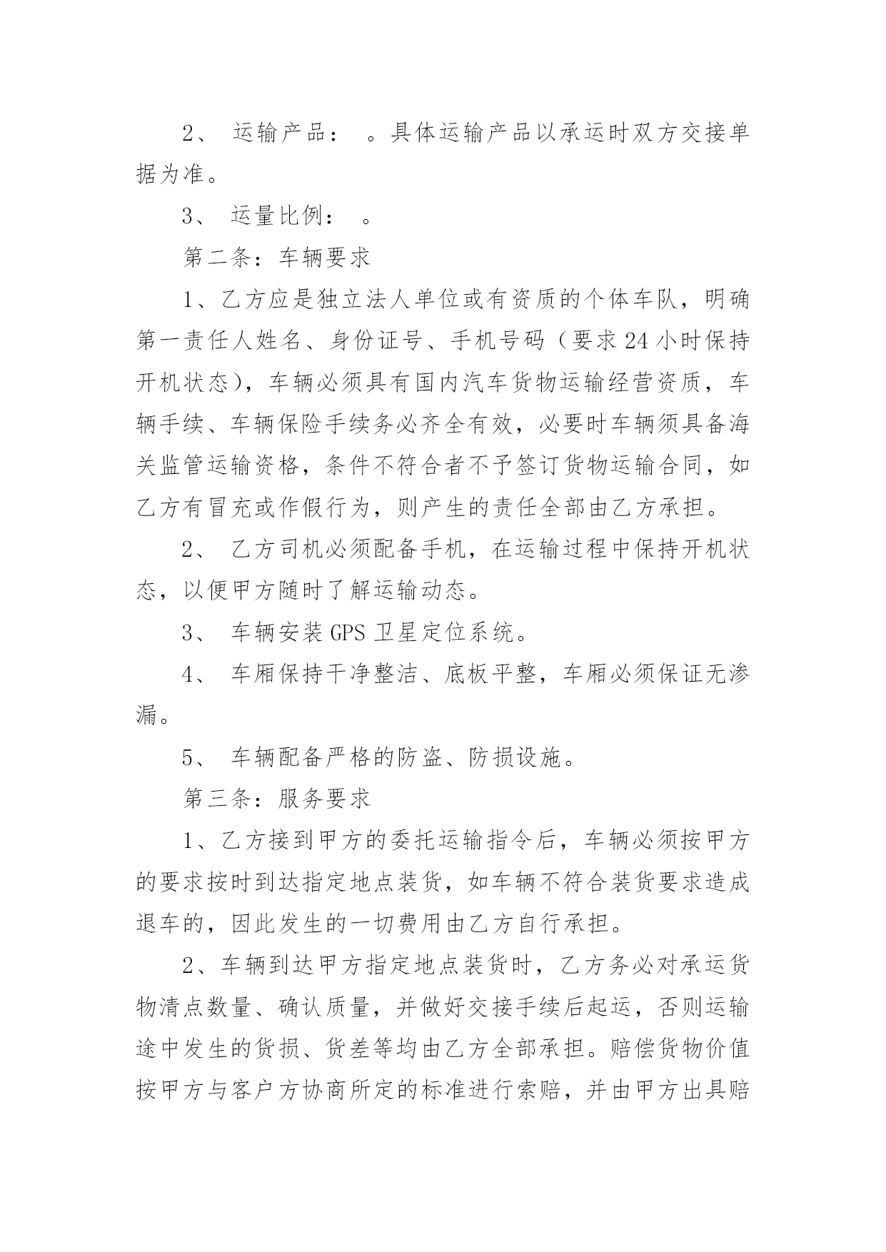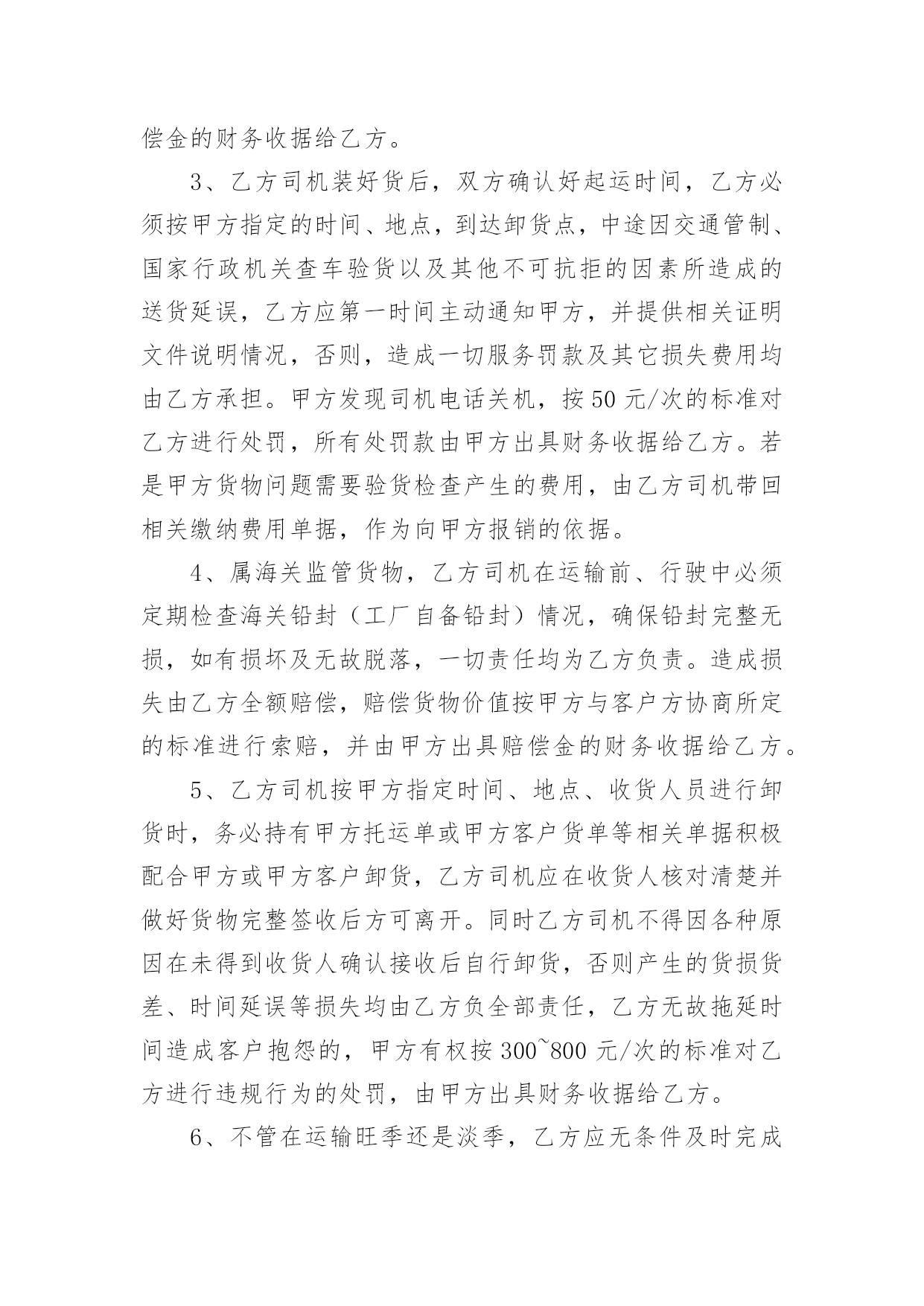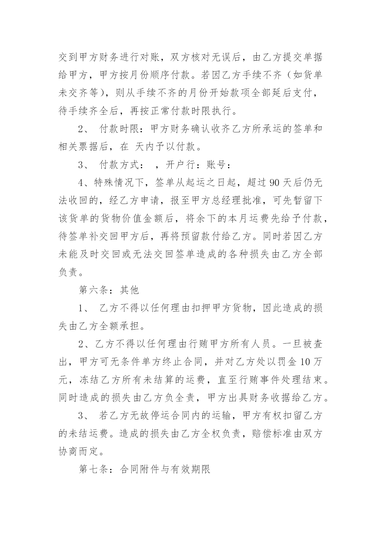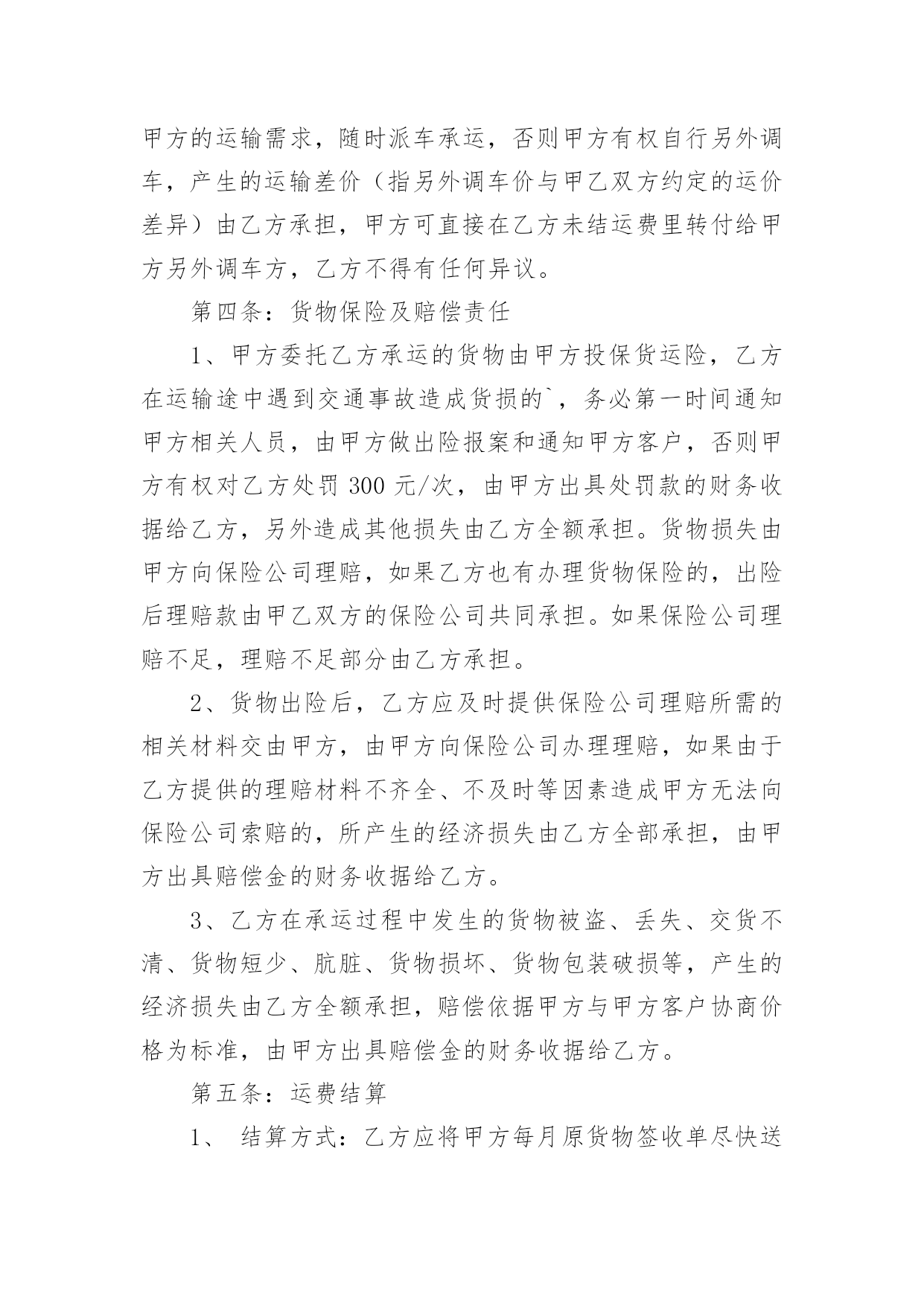 物流运输合同物流运输合同15篇(精)在人们的法律意识不断增强的社会,合同的法律效力与日俱增,签订合同也是非常有必要的行为。那么大家知道合同的格式吗?以下是小编为大家收集的物流运输合同,希望对大家有所帮助。物流运输合同1甲方:___________;乙方:___________;甲方详细地址:______,联系方式:______。乙方详细地址:______,联系方式:______。根据《中华人民共和国合同法》等有关法律规定,经过双方充分协商,特订立本合同,以便双方共同遵守。运输货物的名称、规格、数量、运输费价款货物编号___________品名___________规格___________单位___________单价___________数量___________金额(元)___________甲方第一条甲方负责与项目部签订合同。在签订合同的过程中,甲方发生的如何事故或造成的损失则由甲方自己承担。第二条资金甲方在乙方运输货物或原材料期间。负责资金的集拢,确保乙方在运输货物或原材料的正常进行。乙方:第一条运输要求运输的货物必须按照国家有关强制性规定的标准运输;没有统一规定运输标准的,应根据保证货物运输安全的原则进行运输。如在运输过程中,发生的`安全问题,则由乙方自己承担。第二条运输货物质量要求乙方对运输货物或原材料必须严把质量关。如有忽略或别的因素,造成质量的问题。导致甲方的损失或与其他客户产生的经济纠纷必须由乙方自己承担。且按______%偿付甲方违约金。第三条货物或原材料的供应乙方必须对货物或原材料有充分大量的货源。以却保供应建设公路的正常施工。如在供应期间,发生间断或停止或缺少货源等因素。造成甲方的损失必须由乙方承担相应的责任。且按_____%偿付甲方违约金第四条乙方必须按甲方规定的时间、地点、把货物输送到目的地。货物运输后,甲方需要变更到货地点或收货人,必须在货物未到达目的地之前告知乙方。需要说明的其他事项发生争议时由两边友好协商解决,协商不成时,两边均有权向人民法院提起诉讼。合同实施:①本合同一式两份,各执一份为凭②本合同如有未央事宜,双方配合协商书面修正③本合同自具名之日______年_____月_____日发生效力,到_____年_____月_____日止④本合同期满前一个月,如双方均无异议,则本合同自动延伸,其后亦同甲方__________乙方__________签约日期_____年_____月_____日签约日期:_____年_____月_____日物流运输合同2托运人(甲方):______________________电话:______________________承运人(乙方):XX市鸿运兴发物流有限责任公司1、货物清单及收货人信息:收货人名称:______________________地址:______________________电话:______________________货物名称:______________________数量:______________________包装:______________________重量/体积:______________________货物价值:______________________运费:______________________保价费3‰备注:______________________合计:______仟______佰______拾______元2、甲方应当按照国家及行业标准对货物进行包装;没有国家和行业标准的,应当以保证货物运输安全的方式进行包装,否则货物运输过程中的毁损灭失由甲方自行承担。玻璃、陶瓷等易碎物品、液体、无包装或包装不规范物品、鲜活物品的毁损,乙方不承担赔偿责任。对于零散货物,乙方可协助甲方进行打包、装箱等必要工作,甲方应向乙方支付相应的材料费、人工费等。3、甲方不得委托乙方运输易燃、易爆、有毒等危险品及国家禁运品、限运品,由此给乙方及第三方造成损失的由甲方承担。甲方隐匿或错报货物性质、重量等导致人身伤亡或财产损失的,甲方应承担全部赔偿责任。4、甲方将货物交给乙方承运前,须按货物实际价值足额投保以乙方为被保险人和受益人的货物保险,或交纳保价费由乙方代为购买保险,否则运输过程中发生货物毁损、灭失,甲方同意乙方比照《国内邮件处理规则》第424条规定的非保价快件的最高赔偿限额的1-3赔予以赔偿。5、甲方应自合同签订之日起3日内向乙方付清运杂费。如果甲方不交或不按时交纳约定的各项费用,乙方有权留置货物,并按法律规定处置留置物。6、在货物未交付收货人之前,甲方需要变更到货地点、收货人或取消托运的,应当支付乙方因此所增加的运输费用及其它费用。7、收货人在接到收货通知后3日内未提货的,每迟延一天甲方或收货人应按运费的20%向乙