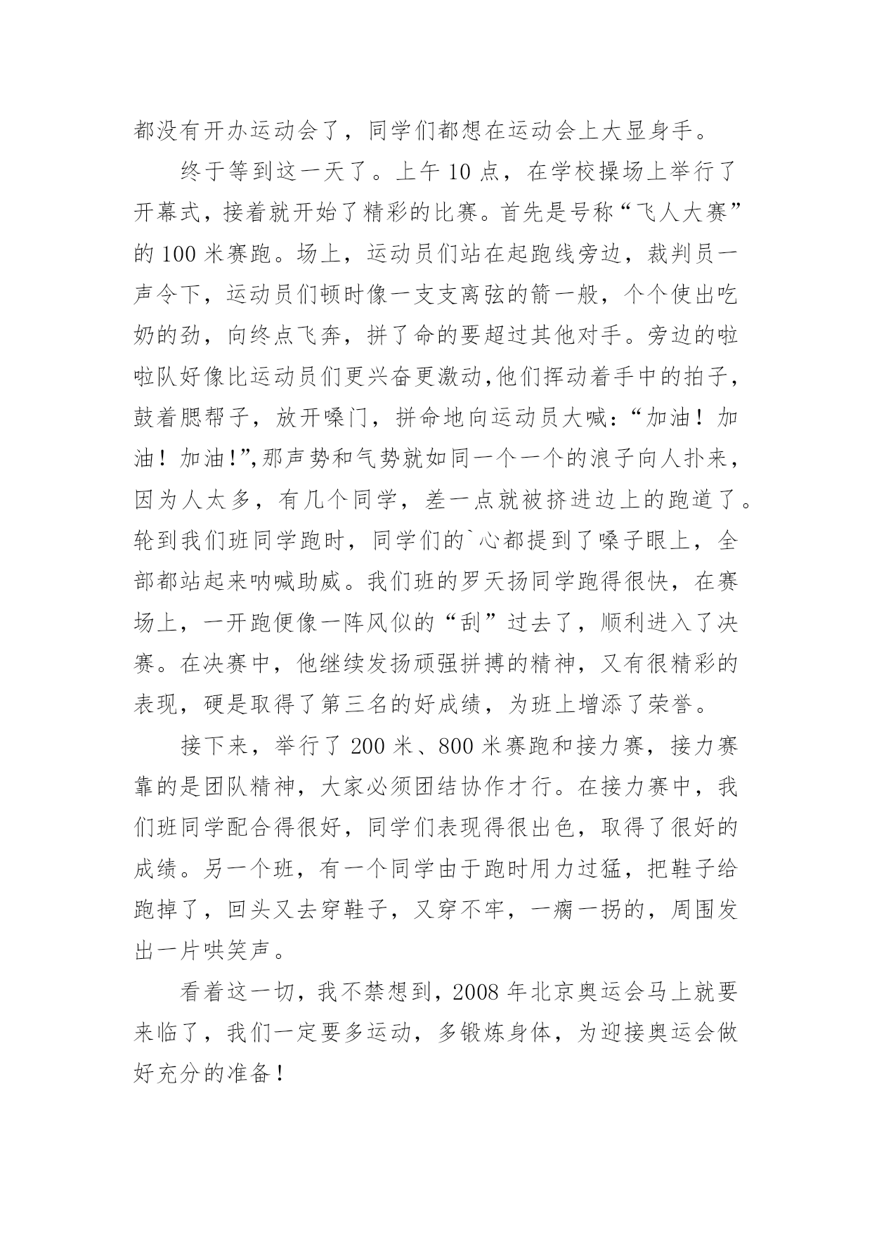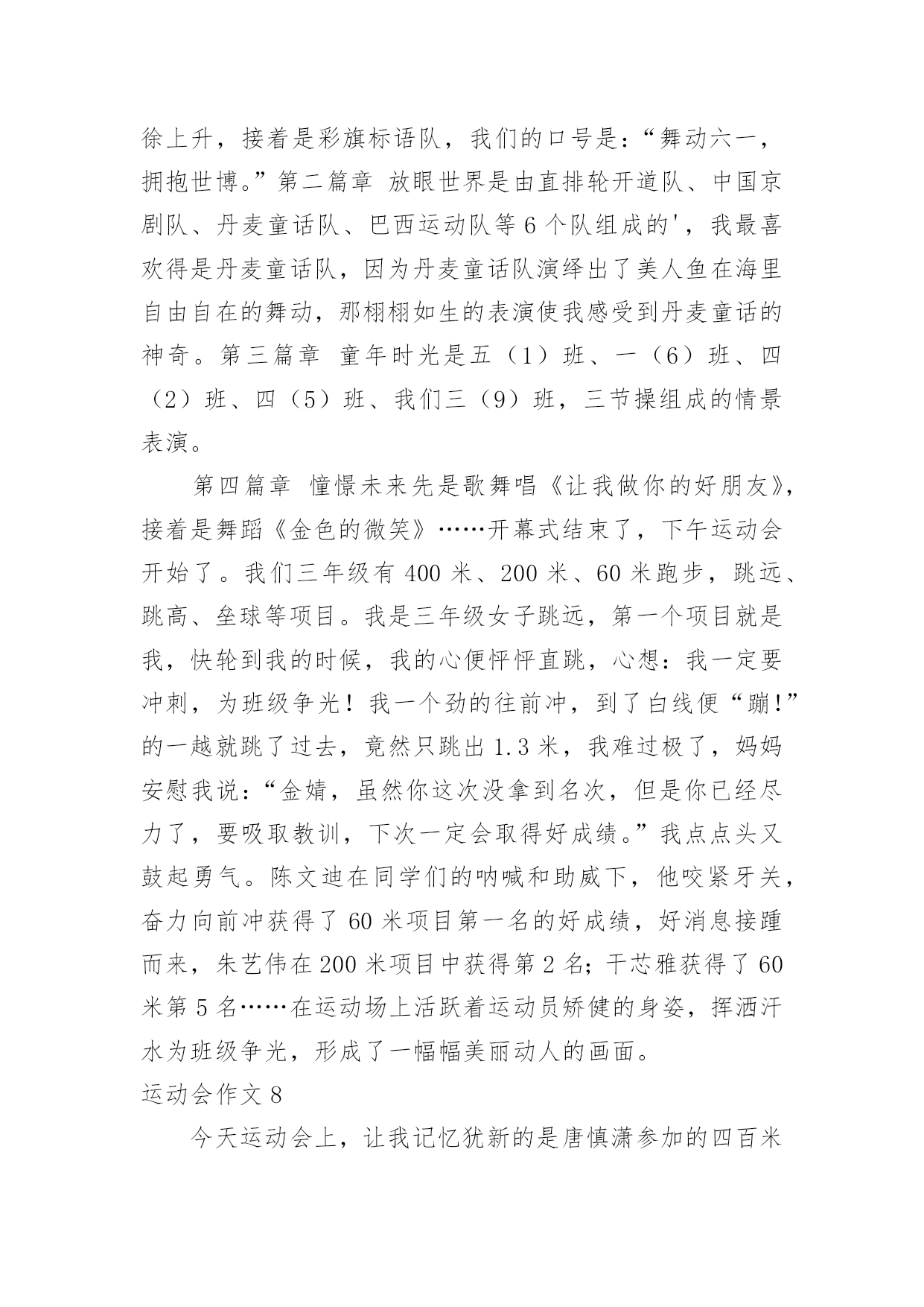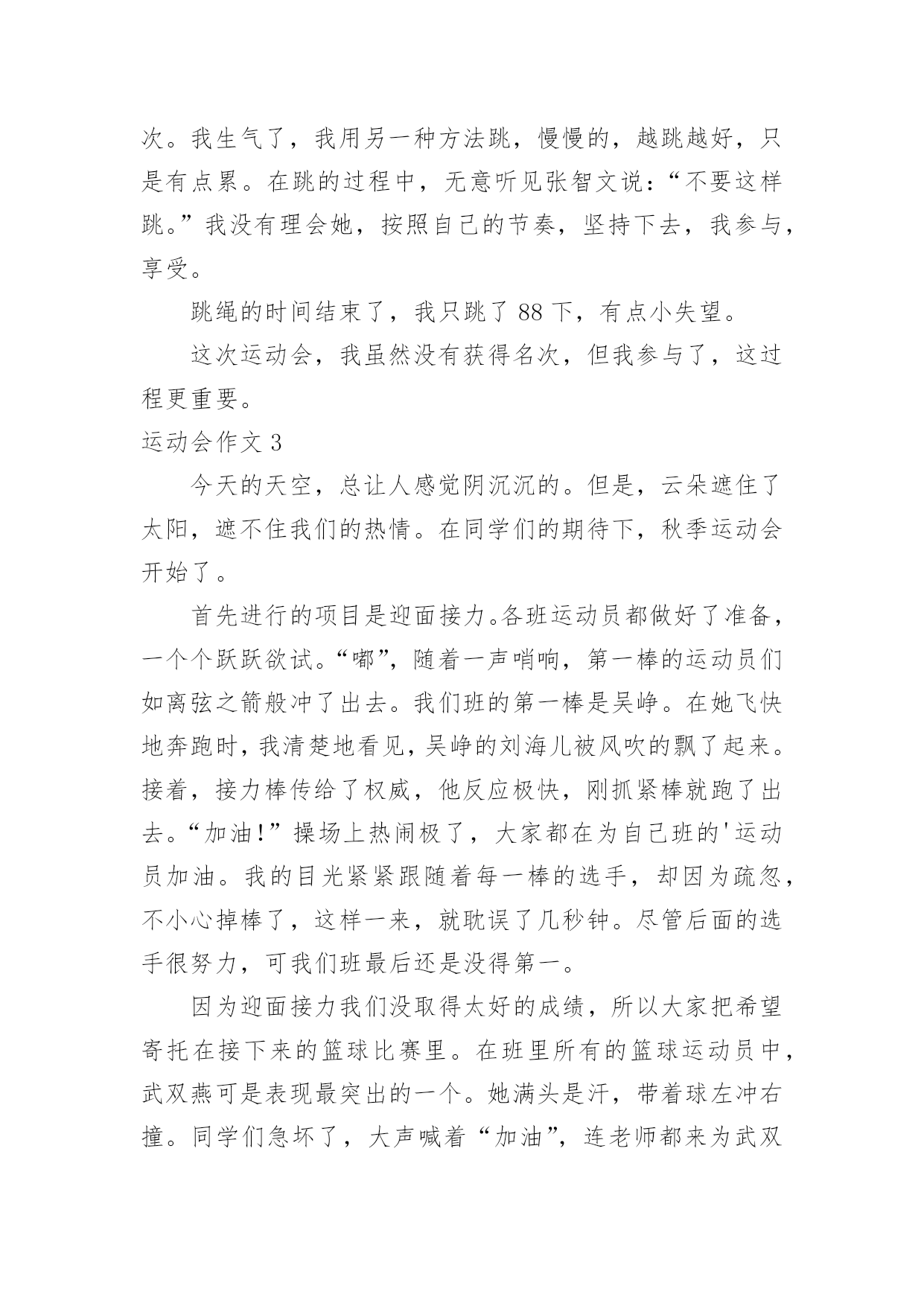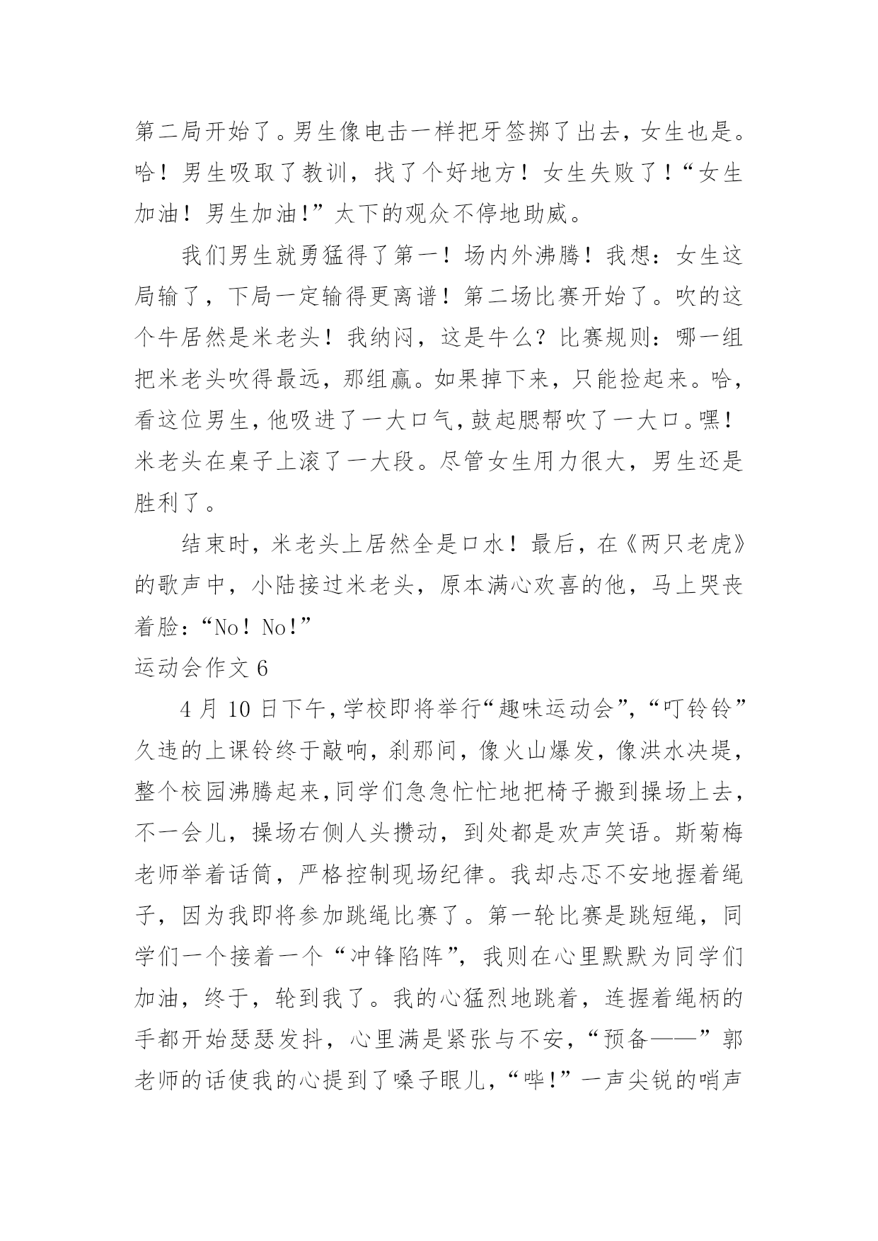 运动会作文运动会作文集锦(15篇)在生活、工作和学习中,大家都经常看到作文的身影吧,作文是一种言语活动,具有高度的综合性和创造性。那要怎么写好作文呢?下面是小编整理的运动会作文,希望对大家有所帮助。运动会作文1经过大家耐心的等待,终于到了我们兴高采烈的日子——4月29日,4月28日夜晚的雨大概是即将到来的前兆吧,4月29日下午一到校,就觉得气氛不对劲,平时现在的时间都是读书和背概念,而现在,一些人连书包也没带,我因为来晚了,便和大家来到楼下。好不容易到了操场,又是星期一的老三样:升国旗、奏国歌、敬队礼,完后就是校长讲话,学生代表讲话。接着就是激动人心的第三项:运动会开始了。我虽然大似羊堆里的`骆驼,鸡堆里仙鹤,并且海拔在1。5米以上,但这次运动会我却一个项目也没有,只能助助威、加加油,并给同胞们发笔和纸,(因为我把文具盒带了下来)好多写一点意见送到广播室,为班级积分、争光。说归说,我虽然不喜欢短跑和长跑系列,但是,我也成为了“追星族”,同时又是四(3)班的拉拉队员,高呼着“四(3)班,加油!四(3)班,加油!每当我们班有名次时,小部分人就会飞奔回自己的座位,对旁边那些没有去看的本班同胞们说着精彩的事迹,那大家一定很奇怪,大部分人呢,我自然也随着大部分人去看登记,如果有人得了第一名,大家的热情不用说就更高了。几乎全班同学都会去登记处看。经过一天半的激烈竞赛,运动会结束了,大家的心情非常愉快,都盼望着下届运动会的开始。运动会作文2一年一度的冬季运动会即将开幕,同学们个个都很兴奋,恨不得各项比赛马上开始。开幕式上,校长致开幕词,他那热情的讲话,把开幕式推向了高潮。比赛的第一项是五分钟跳长绳。五年级一班和三班,个个满怀信心,而我们却没有。我们知道是不会赢的,跳长绳我们只练过几次而已,其他班可是天天都在练习。必晒开始,别班跳长绳,一个接一个跳,那速度杠杠的。而我们呢,一个人跳了,下一个要张望几下,绳要空几下,才跳,结果不言而喻。我亲自参加的'项目是一分钟跳绳,我很紧张。由于从来没有参加过这么激烈的对抗,心里还有点小激动呢!要开始比赛了,手拿着绳的把柄,举得高高,随时准备开始。裁判员拿着秒表,大声地喊着:“所有人听好了,当我说‘开始’时,你们就跳起来。”他稍微停顿,“开始。”我听见了,快速跳了起来。由于太紧张了,失误了好几次。我生气了,我用另一种方法跳,慢慢的,越跳越好,只是有点累。在跳的过程中,无意听见张智文说:“不要这样跳。”我没有理会她,按照自己的节奏,坚持下去,我参与,享受。跳绳的时间结束了,我只跳了88下,有点小失望。这次运动会,我虽然没有获得名次,但我参与了,这过程更重要。运动会作文3今天的天空,总让人感觉阴沉沉的。但是,云朵遮住了太阳,遮不住我们的热情。在同学们的期待下,秋季运动会开始了。首先进行的项目是迎面接力。各班运动员都做好了准备,一个个跃跃欲试。“嘟”,随着一声哨响,第一棒的运动员们如离弦之箭般冲了出去。我们班的第一棒是吴峥。在她飞快地奔跑时,我清楚地看见,吴峥的刘海儿被风吹的飘了起来。接着,接力棒传给了权威,他反应极快,刚抓紧棒就跑了出去。“加油!”操场上热闹极了,大家都在为自己班的'运动员加油。我的目光紧紧跟随着每一棒的选手,却因为疏忽,不小心掉棒了,这样一来,就耽误了几秒钟。尽管后面的选手很努力,可我们班最后还是没得第一。因为迎面接力我们没取得太好的成绩,所以大家把希望寄托在接下来的篮球比赛里。在班里所有的篮球运动员中,武双燕可是表现最突出的一个。她满头是汗,带着球左冲右撞。同学们急坏了,大声喊着“加油”,连老师都来为武双燕助威呢!也许是受到了大家的鼓舞,武双燕很快就进了一个球,“好”同学们发出一阵欢呼,有的还蹦起来了。女生篮球第一场结束了,我们班在和7班比赛中获得了胜利。短短的休息时间过去了,第二场比赛拉开了帷幕,这是和6班的对决,这一次,遇上了强劲的对手。尽管我们班的运动员连进几个球,还是以3:4的成绩输了。尽管我们班这次成绩不太理想,但是,重在参与,我们也收获了许多。运动会作文4在这个晴空万里的早晨,TJ小学第九届篮球运动会开幕了!下到操场后,我们的第一个项目就是十传两抢。而这个项目正好是我的项目。我们班我负责抽签,在万众瞩目下,我怀着忐忑不安的心情将我的手缓缓伸进了箱子里。拿出来一看,发现我抽到了二班(实力最弱的班)顿时一阵狂喜。在我告诉大家后,全班发出了一阵欢呼。这个时候,其它班的抽签结果也出来了。一班抽到了我们班。十传两抢分两个部分,先是一个班派出两名同学去抢其他班的球,接着是其他班的.同学来抢我们的球。我们班负责抢球的是我和JHB。我们俩面对着二班一个个膀大腰圆的对手,不禁有点紧张。比赛开始了,我直接像猛虎扑食一样朝对分拿球的队员扑去,可是他就像一只小猴子,直接灵活的转了一个身,把球传给了另外