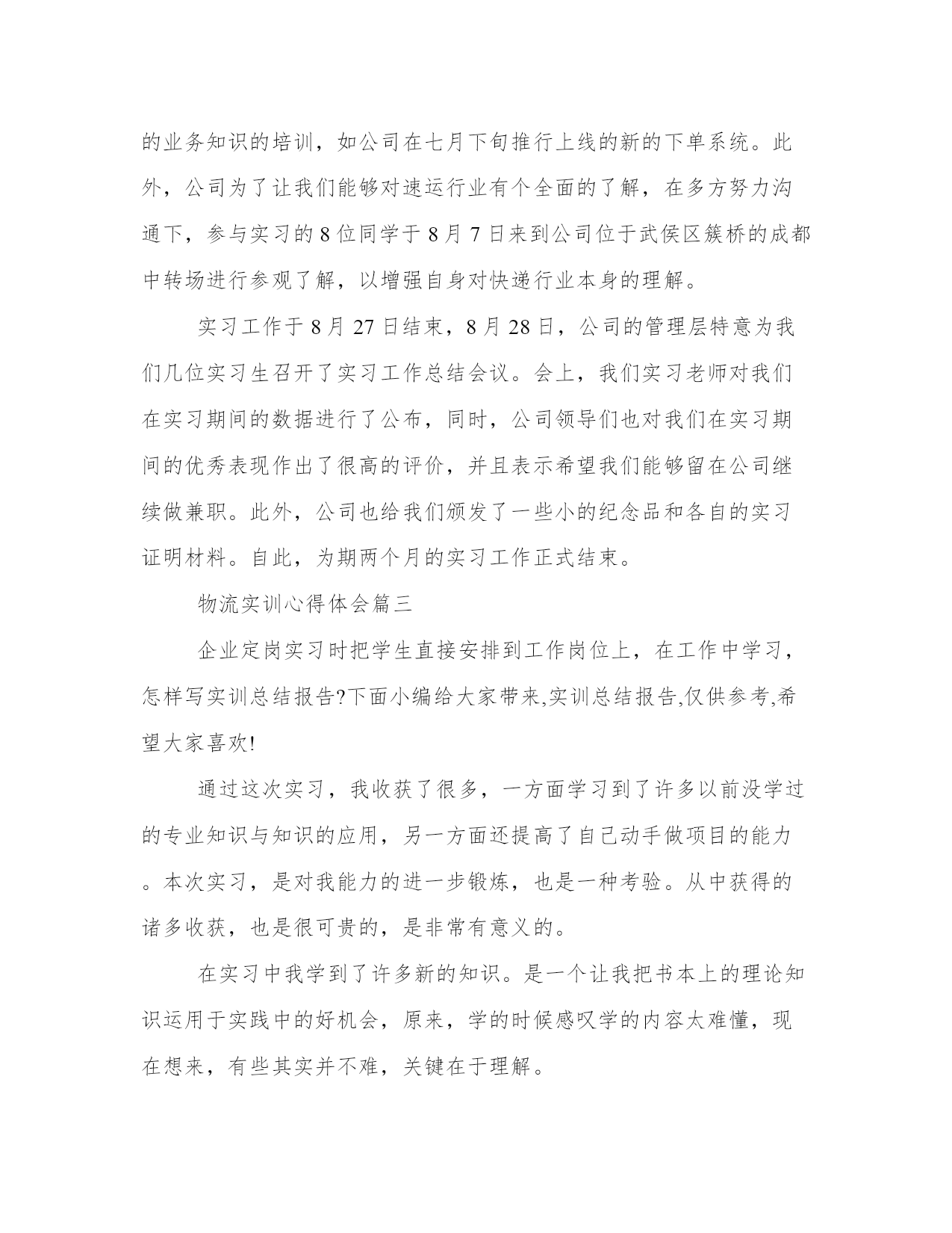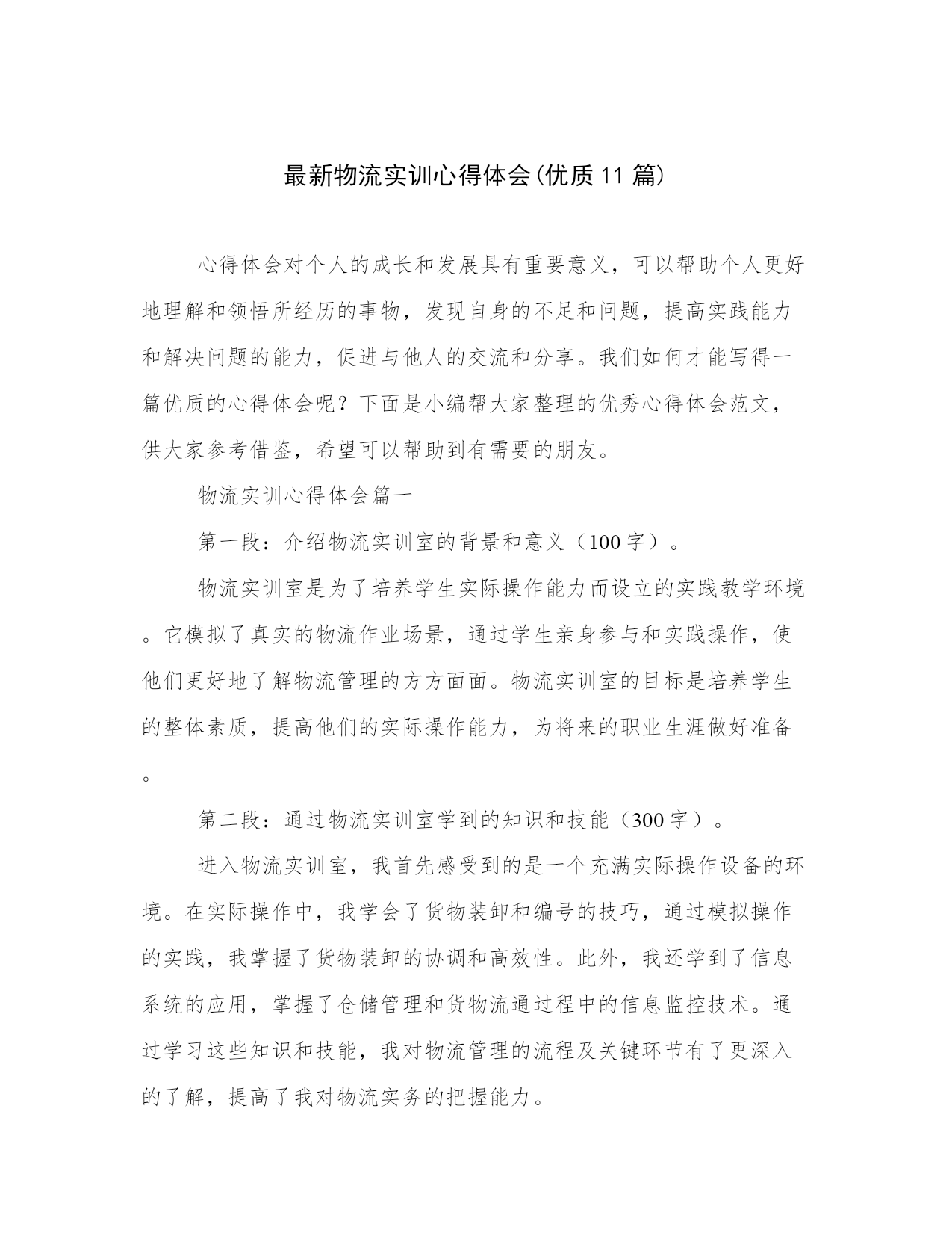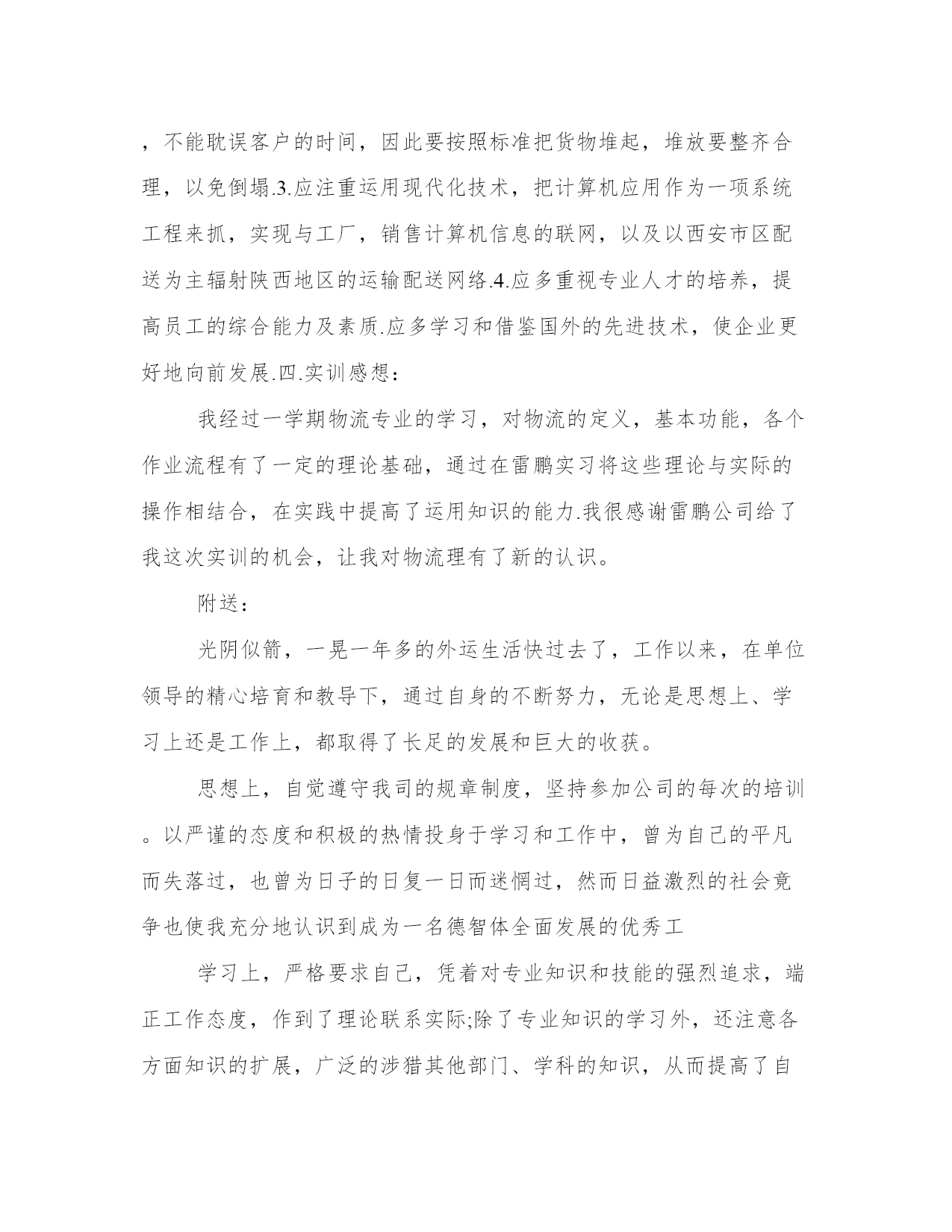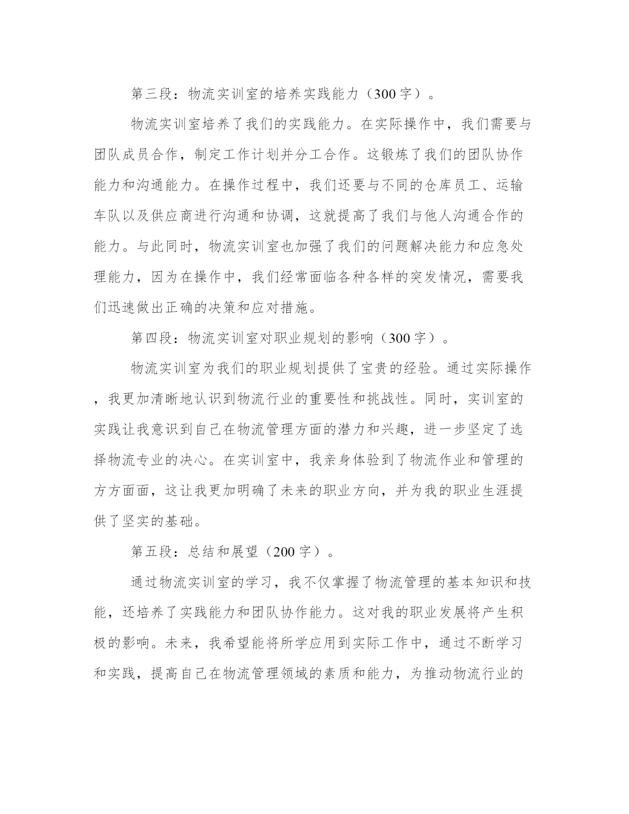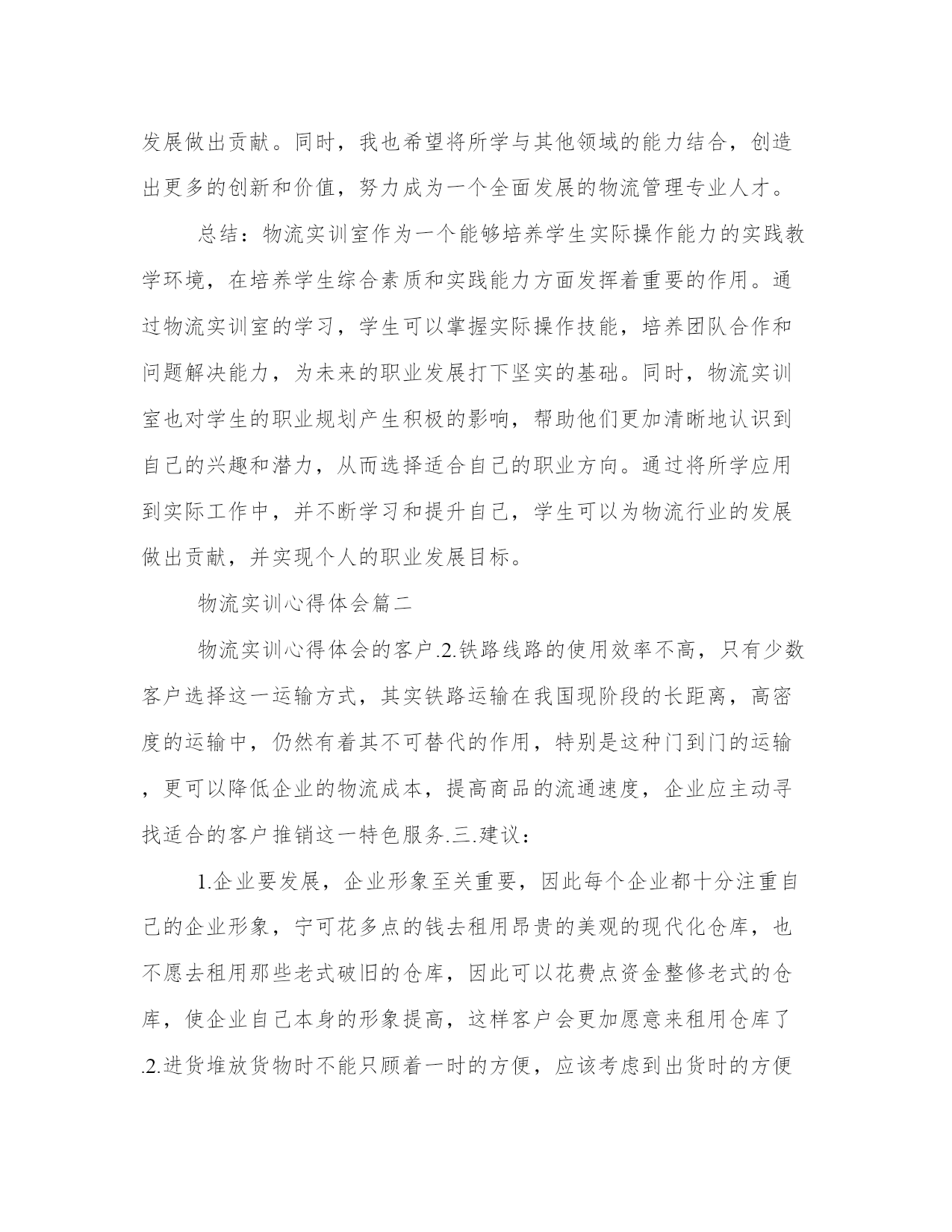 最新物流实训心得体会(优质11篇)心得体会对个人的成长和发展具有重要意义,可以帮助个人更好地理解和领悟所经历的事物,发现自身的不足和问题,提高实践能力和解决问题的能力,促进与他人的交流和分享。我们如何才能写得一篇优质的心得体会呢?下面是小编帮大家整理的优秀心得体会范文,供大家参考借鉴,希望可以帮助到有需要的朋友。物流实训心得体会篇一第一段:介绍物流实训室的背景和意义(100字)。物流实训室是为了培养学生实际操作能力而设立的实践教学环境。它模拟了真实的物流作业场景,通过学生亲身参与和实践操作,使他们更好地了解物流管理的方方面面。物流实训室的目标是培养学生的整体素质,提高他们的实际操作能力,为将来的职业生涯做好准备。第二段:通过物流实训室学到的知识和技能(300字)。进入物流实训室,我首先感受到的是一个充满实际操作设备的环境。在实际操作中,我学会了货物装卸和编号的技巧,通过模拟操作的实践,我掌握了货物装卸的协调和高效性。此外,我还学到了信息系统的应用,掌握了仓储管理和货物流通过程中的信息监控技术。通过学习这些知识和技能,我对物流管理的流程及关键环节有了更深入的了解,提高了我对物流实务的把握能力。第三段:物流实训室的培养实践能力(300字)。物流实训室培养了我们的实践能力。在实际操作中,我们需要与团队成员合作,制定工作计划并分工合作。这锻炼了我们的团队协作能力和沟通能力。在操作过程中,我们还要与不同的仓库员工、运输车队以及供应商进行沟通和协调,这就提高了我们与他人沟通合作的能力。与此同时,物流实训室也加强了我们的问题解决能力和应急处理能力,因为在操作中,我们经常面临各种各样的突发情况,需要我们迅速做出正确的决策和应对措施。第四段:物流实训室对职业规划的影响(300字)。物流实训室为我们的职业规划提供了宝贵的经验。通过实际操作,我更加清晰地认识到物流行业的重要性和挑战性。同时,实训室的实践让我意识到自己在物流管理方面的潜力和兴趣,进一步坚定了选择物流专业的决心。在实训室中,我亲身体验到了物流作业和管理的方方面面,这让我更加明确了未来的职业方向,并为我的职业生涯提供了坚实的基础。第五段:总结和展望(200字)。通过物流实训室的学习,我不仅掌握了物流管理的基本知识和技能,还培养了实践能力和团队协作能力。这对我的职业发展将产生积极的影响。未来,我希望能将所学应用到实际工作中,通过不断学习和实践,提高自己在物流管理领域的素质和能力,为推动物流行业的发展做出贡献。同时,我也希望将所学与其他领域的能力结合,创造出更多的创新和价值,努力成为一个全面发展的物流管理专业人才。总结:物流实训室作为一个能够培养学生实际操作能力的实践教学环境,在培养学生综合素质和实践能力方面发挥着重要的作用。通过物流实训室的学习,学生可以掌握实际操作技能,培养团队合作和问题解决能力,为未来的职业发展打下坚实的基础。同时,物流实训室也对学生的职业规划产生积极的影响,帮助他们更加清晰地认识到自己的兴趣和潜力,从而选择适合自己的职业方向。通过将所学应用到实际工作中,并不断学习和提升自己,学生可以为物流行业的发展做出贡献,并实现个人的职业发展目标。物流实训心得体会篇二物流实训心得体会的客户.2.铁路线路的使用效率不高,只有少数客户选择这一运输方式,其实铁路运输在我国现阶段的长距离,高密度的运输中,仍然有着其不可替代的作用,特别是这种门到门的运输,更可以降低企业的物流成本,提高商品的流通速度,企业应主动寻找适合的客户推销这一特色服务.三.建议:1.企业要发展,企业形象至关重要,因此每个企业都十分注重自己的企业形象,宁可花多点的钱去租用昂贵的美观的现代化仓库,也不愿去租用那些老式破旧的仓库,因此可以花费点资金整修老式的仓库,使企业自己本身的形象提高,这样客户会更加愿意来租用仓库了.2.进货堆放货物时不能只顾着一时的方便,应该考虑到出货时的方便,不能耽误客户的时间,因此要按照标准把货物堆起,堆放要整齐合理,以免倒塌.3.应注重运用现代化技术,把计算机应用作为一项系统工程来抓,实现与工厂,销售计算机信息的联网,以及以西安市区配送为主辐射陕西地区的运输配送网络.4.应多重视专业人才的培养,提高员工的综合能力及素质.应多学习和借鉴国外的先进技术,使企业更好地向前发展.四.实训感想:我经过一学期物流专业的学习,对物流的定义,基本功能,各个作业流程有了一定的理论基础,通过在雷鹏实习将这些理论与实际的操作相结合,在实践中提高了运用知识的能力.我很感谢雷鹏公司给了我这次实训的机会,让我对物流理有了新的认识。附送:光阴似箭,一晃一年多的外运生活快过去了,工作以来,在单位领导的精心培育和教导下,通过自身的不断努力,无论是思想上、学习上还是工作上,都取得了长足的发展和