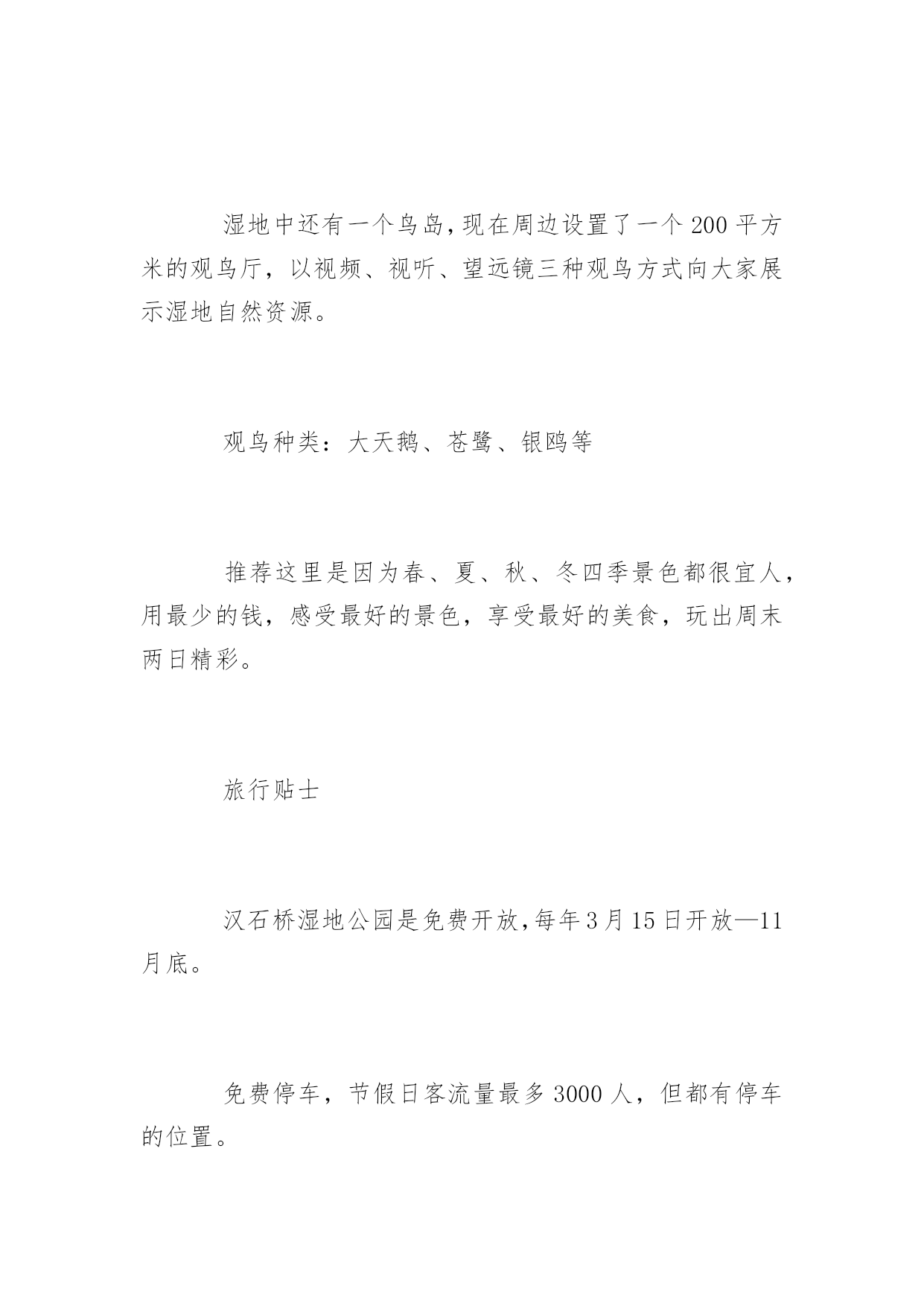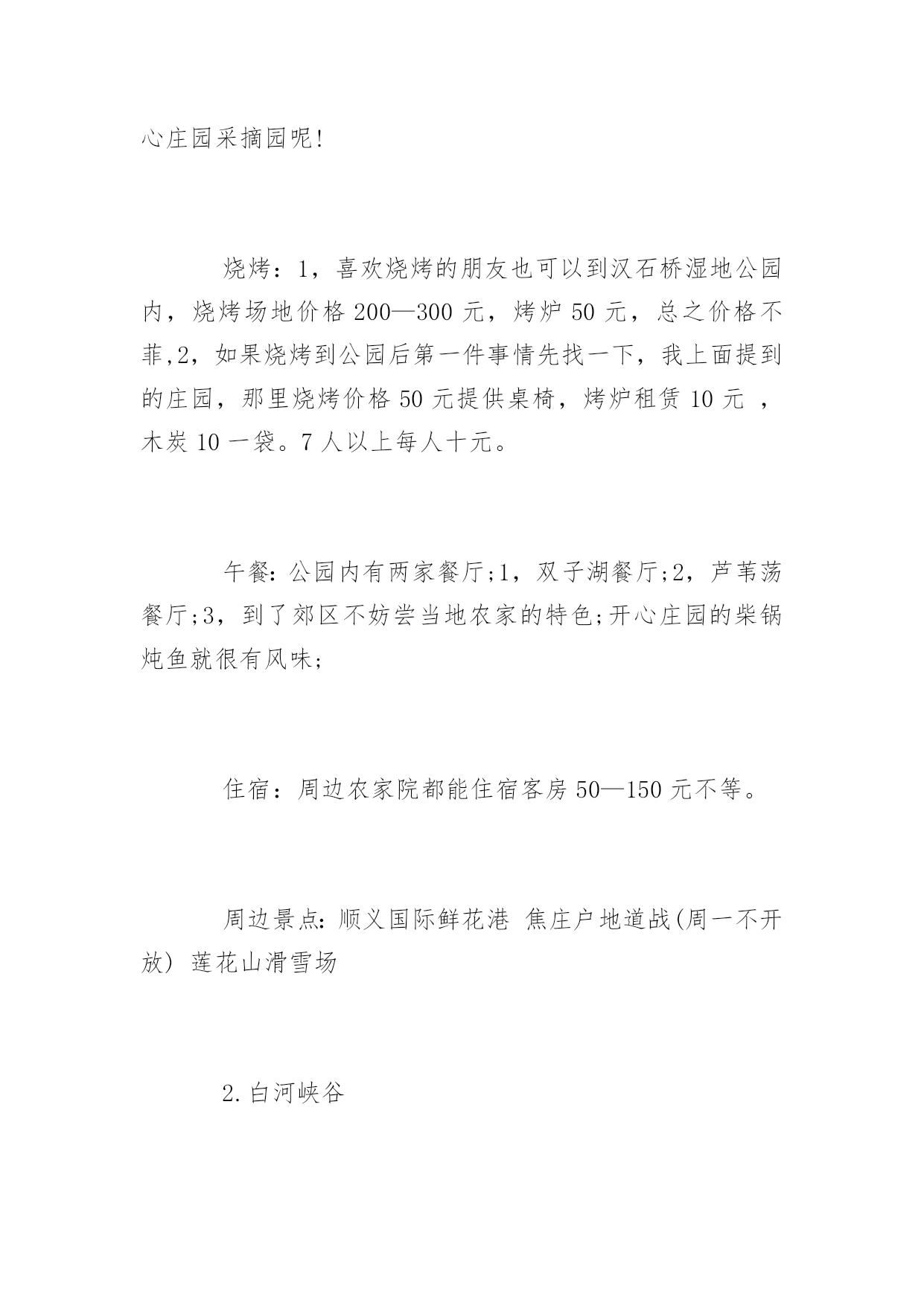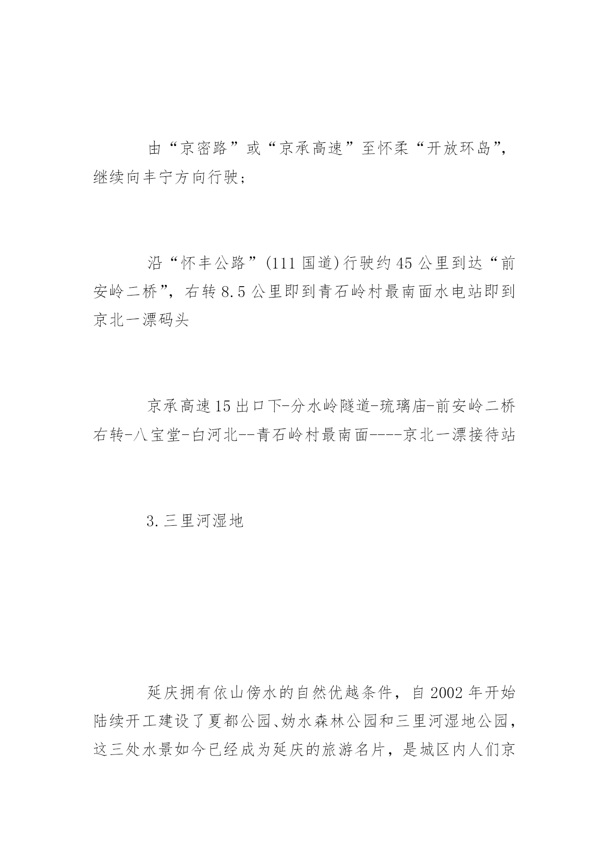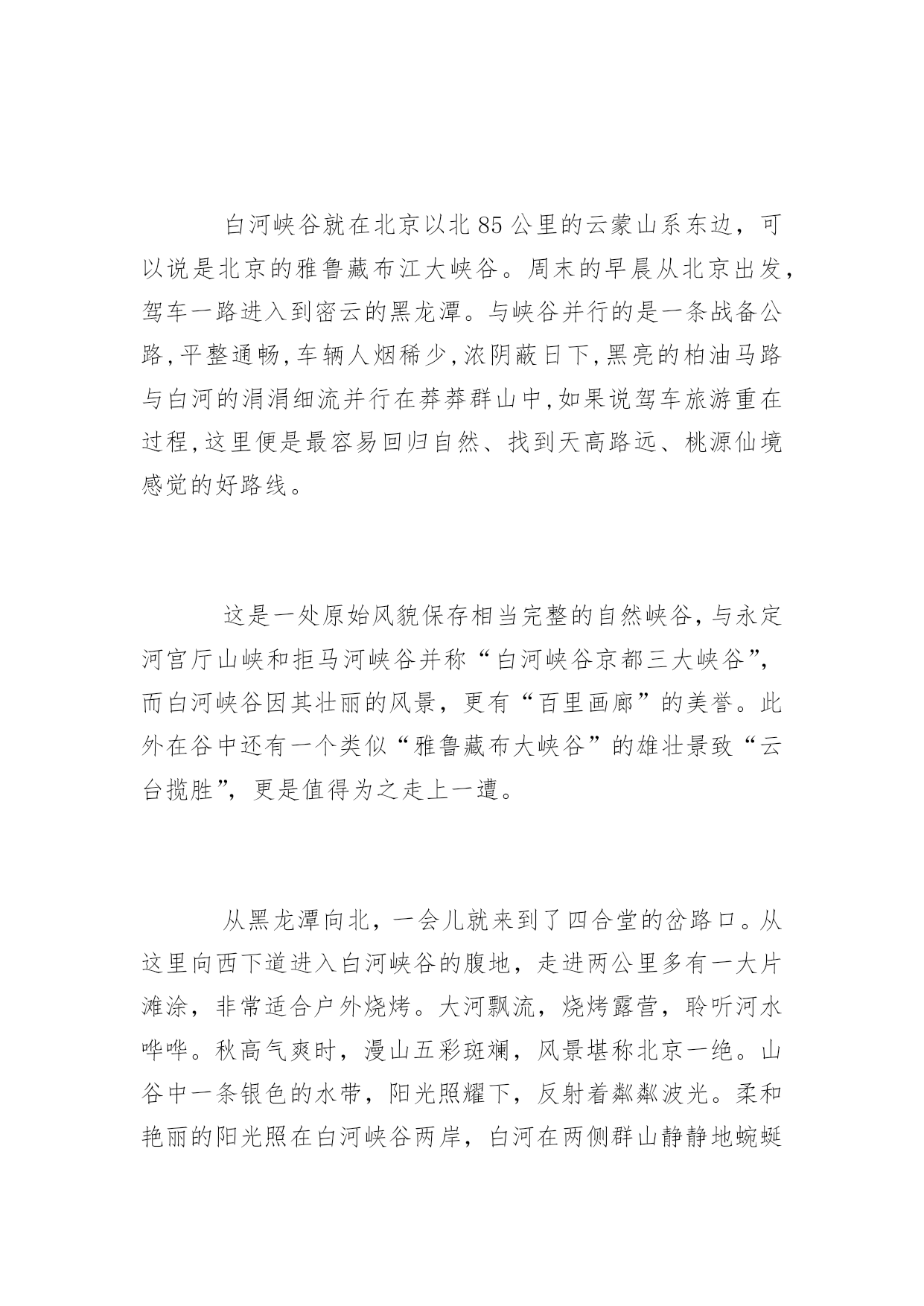 五一假期旅游胜地马上又要到五一假了,三天的假期,想好去哪玩了么?本文特意为大家收集整理了五一假期旅游胜地,心动就赶紧行动吧!1.顺义汉石桥湿地自然保护区这里有京城现存的大型芦苇沼泽湿地,这里还是多种珍稀水禽的快乐家园,其中国家一级重点保护野生动物有两种、国家二级重点保护野生动物17种。每年3-4月,汉石桥湿地会迎来一批批远道而来的候鸟“客人”。走在湿地公园用木头搭的栈道上,放眼四周,能看到湿地中有很多有趣的鸟:苍鹭、野鸭在清澈的水面上空盘旋;灰鹤保持“金鸡独立”的姿势能达20分钟以上,即使有人来也一动不动。湿地中还有一个鸟岛,现在周边设置了一个200平方米的观鸟厅,以视频、视听、望远镜三种观鸟方式向大家展示湿地自然资源。观鸟种类:大天鹅、苍鹭、银鸥等推荐这里是因为春、夏、秋、冬四季景色都很宜人,用最少的钱,感受最好的景色,享受最好的美食,玩出周末两日精彩。旅行贴士汉石桥湿地公园是免费开放,每年3月15日开放—11月底。免费停车,节假日客流量最多3000人,但都有停车的位置。离市区很近车程30分钟;路面平坦安全无拥堵现象。高速有两条;1,京平见木燕路出口出费用15元,2,机场北线10元上顺平路18公里见木燕路右转即到;(10高速费票据回城出示,不收费用不要丢掉哦)公园娱乐项目不少,钓鱼划船四人自行车踢足球真人cs野营摄影:摄影爱好者的好地方,春、夏、秋、冬都要用您的眼睛去发现生活之美。休闲迈步,放松心情,全家亲子活动都不错。周边农家庄园:正门往北200米见"T"字小路口路东见灯笼即到;有一家不起眼的“开心庄园”庄园还不小;环境很是原生态;也是不错的地方。在网上还可以查到顺义开心庄园采摘园呢!烧烤:1,喜欢烧烤的朋友也可以到汉石桥湿地公园内,烧烤场地价格200—300元,烤炉50元,总之价格不菲,2,如果烧烤到公园后第一件事情先找一下,我上面提到的庄园,那里烧烤价格50元提供桌椅,烤炉租赁10元,木炭10一袋。7人以上每人十元。午餐:公园内有两家餐厅;1,双子湖餐厅;2,芦苇荡餐厅;3,到了郊区不妨尝当地农家的特色;开心庄园的柴锅炖鱼就很有风味;住宿:周边农家院都能住宿客房50—150元不等。周边景点:顺义国际鲜花港焦庄户地道战(周一不开放)莲花山滑雪场2.白河峡谷白河峡谷就在北京以北85公里的云蒙山系东边,可以说是北京的雅鲁藏布江大峡谷。周末的早晨从北京出发,驾车一路进入到密云的黑龙潭。与峡谷并行的是一条战备公路,平整通畅,车辆人烟稀少,浓阴蔽日下,黑亮的柏油马路与白河的涓涓细流并行在莽莽群山中,如果说驾车旅游重在过程,这里便是最容易回归自然、找到天高路远、桃源仙境感觉的好路线。这是一处原始风貌保存相当完整的自然峡谷,与永定河宫厅山峡和拒马河峡谷并称“白河峡谷京都三大峡谷”,而白河峡谷因其壮丽的风景,更有“百里画廊”的美誉。此外在谷中还有一个类似“雅鲁藏布大峡谷”的雄壮景致“云台揽胜”,更是值得为之走上一遭。从黑龙潭向北,一会儿就来到了四合堂的岔路口。从这里向西下道进入白河峡谷的腹地,走进两公里多有一大片滩涂,非常适合户外烧烤。大河飘流,烧烤露营,聆听河水哗哗。秋高气爽时,漫山五彩斑斓,风景堪称北京一绝。山谷中一条银色的水带,阳光照耀下,反射着粼粼波光。柔和艳丽的阳光照在白河峡谷两岸,白河在两侧群山静静地蜿蜒流过,构成一幅完美的画面。顺便玩:除了烧烤以外,白河还是北京郊区漂流的好地方,如果想顺便漂流,一定要带上水枪!旅行贴士公交路线北京东直门乘916路公共汽车,在怀柔汽车站下车,在换乘936或者去往汤河口方向的班车,到前安岭二桥下车,打车到青石岭村最南面水电站(因为那里村落稀少至今没有公交车通行)由于家园乘坐936支线(怀柔---汤河口)前安岭二桥下车,打车到青石岭村最南面水电站京北一漂漂流接待站自驾游路线由“京密路”或“京承高速”至怀柔“开放环岛”,继续向丰宁方向行驶;沿“怀丰公路”(111国道)行驶约45公里到达“前安岭二桥”,右转8.5公里即到青石岭村最南面水电站即到京北一漂码头京承高速15出口下-分水岭隧道-琉璃庙-前安岭二桥右转-八宝堂-白河北--青石岭村最南面----京北一漂接待站3.三里河湿地延庆拥有依山傍水的自然优越条件,自2002年开始陆续开工建设了夏都公园、妫水森林公园和三里河湿地公园,这三处水景如今已经成为延庆的旅游名片,是城区内人们京郊旅游的首选之地。延庆妫河森林公园是北京市11座新城滨河森林公园之一,沿延庆母亲河———妫河而建,东起延康大桥,西至农场橡胶坝,全长8公里,公园以水为轴,以林为体,山水相依,包括台地园、清风园、静心园、幽径园、雅荷园五个景区,是集观光、休闲、度假、健身、娱乐、品味民俗、探究文化为一体的旅游胜地。