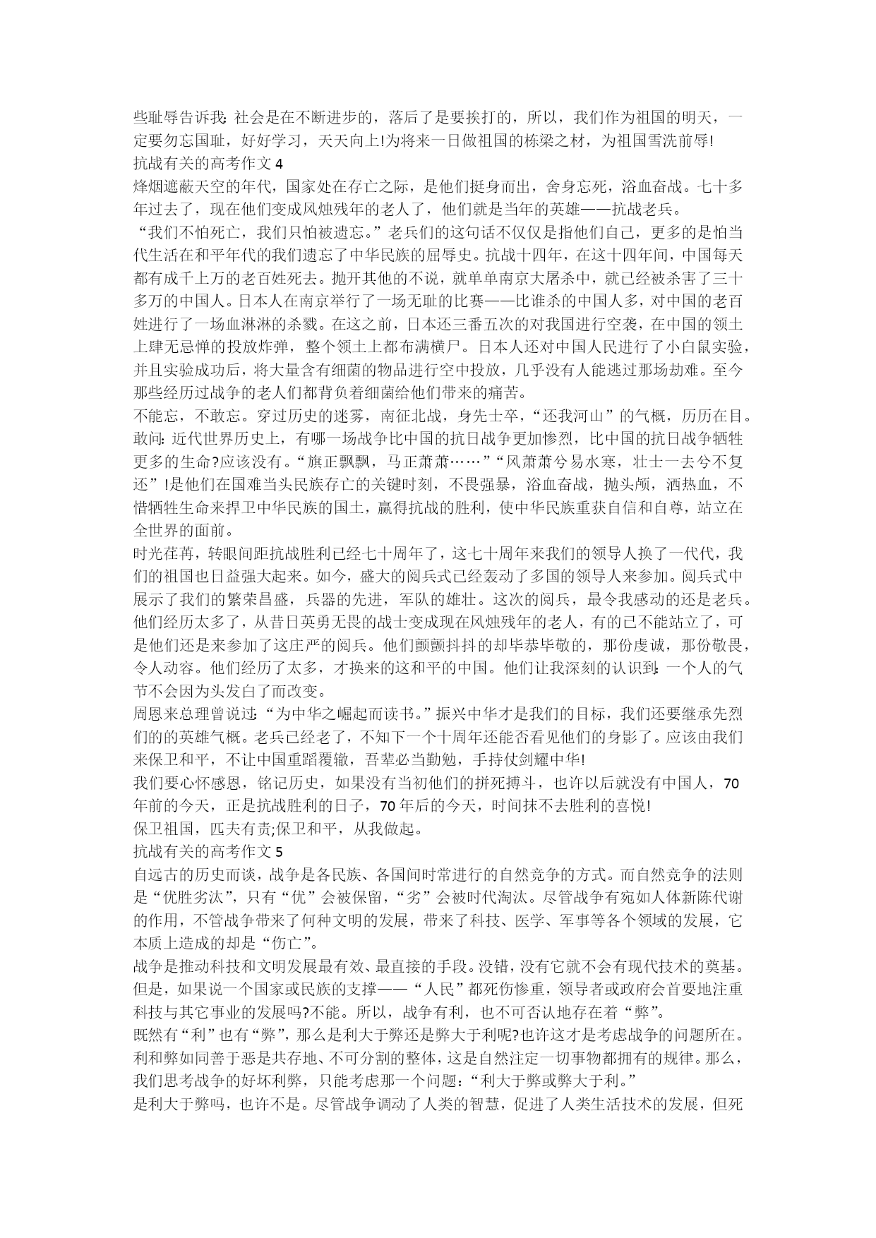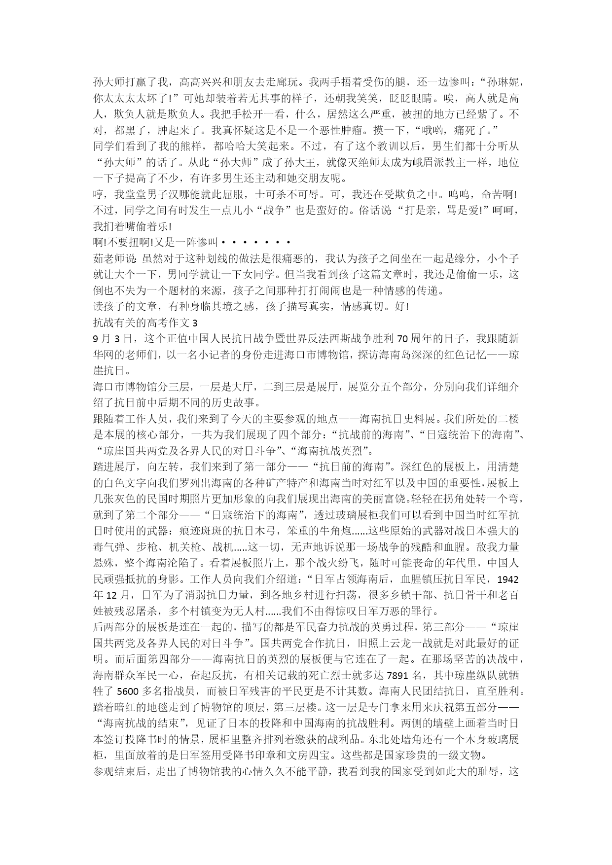 抗战有关的高考作文抗战胜利70周年庆典大阅兵是宣言书,它向全世界庄严宣告,中华民族是一个不可战胜的民族,是个热爱和平,珍惜和平的民族。让我们一起来看看关于抗战有关的高考作文,希望对您有所帮助,欢迎查阅学习!抗战有关的高考作文11945年,1965年,1975年,1985年,1995年,2005年,2015年,距离抗战胜利已经有整整七十年了!自古英雄出少年。抗日战争时期,中华民族涌现出了一批少年英雄。在国难当头的时刻,用自己稚嫩的肩膀,保家卫国,担起了沉重的抗争。现在,大家跟着我一起回忆一下抗战时期的英雄人物和他们的事迹吧!抗日小英雄---王二小。“牛儿还在山坡吃草,放牛的却不知哪儿去了……”优美的旋律时常在耳边响起,动人的故事一代代流传。二小在山坡上放牛时碰上了打算进村“扫荡”的鬼子。鬼子让他带路,二小却把鬼子带进了八路军的埋伏圈。鬼子发现上当后,用刺刀刺向二小的胸膛……抗日小英雄---张嘎!那个艰苦的岁月,生活在白洋淀的小男孩张嘎与奶奶相依为命。为了掩护在他家养伤的八路军侦查连长钟亮,奶奶英勇地牺牲在日本的刀下,而钟亮也被敌人抓走了。为替奶奶报仇和救出老钟叔,嘎子毅然决定出发去寻找打鬼子的队伍。后来在敌人面前,嘎子刚强不屈,并在战斗中逃了出来,他配合游击队拔掉岗楼,救出了钟亮。最终张嘎成了一个出色的小侦查员。抗日小英雄---雨来!那个日本鬼子蹂躏中国的时代,晋察冀边区的北部叫芦花村的小村庄,出了了小雨来。12岁的雨来喜欢游泳,他游泳本领可高了。后来雨来上了夜校,在夜校里他知道了:我们是中国人,我们爱自己的祖国。有一天,村里的李大叔急急忙忙地进了雨来家,挪开了水缸,跳进了缸里的地洞。雨来将水缸挪回了原位。这时鬼子也到了。雨来为了掩护李大叔,自己不幸被敌人抓住。他在敌人严刑拷打下,坚强不屈,气得敌人大叫把他拉出去枪毙。他趁鬼子不注意一头扎进河里,从河底游到远处。千锤百炼出深山,烈火焚烧若等闲,粉身碎骨浑不怕,要留清白在人间。像王二小这样的英雄还有很多,送鸡毛信的海娃,草原英雄小姐妹龙梅与玉荣……梁启超曾说过:“少年强,则国强;少年富,则国富;少年屹立于世界,则国屹立于世界”。珍惜现在的生活,懂得来之不易,我们要向抗日小英雄们学习,做一个中国人,做一个爱学习的少年,把我们的祖国建设的更加美好,富强、民主、文明!抗战有关的高考作文2“喂喂喂,超线了。”“又怎么样,哼!”我和同桌又吵了,我俩可谓是三天一小吵,五天一大吵,全班同学都知道。看,同桌又超线了,一定要自己占的多些,唉,无语,可恶!还撞我!老虎不发威,你当我病猫啊!就这样,战争开始了。我和她玩起“肉搏战”。虽然也有那么一丢丢的危险,不过毕竟我身强体壮,被踢几脚也没有什么大碍。可同桌呢,被我如炮弹似的“飞毛腿”踢得左躲右闪。可当我正得意洋洋的时候,同桌“灭绝师太”立马使出了峨眉派的独特本领——鹰爪功。只见她的双手弯成弓形,跑过来,向我的大腿发起了进攻。看,她把我的肉一抓,使劲一扭。“啊,痛啊!孙琳妮,你这个巫女!”我惨叫一声。本来自称十二层功力的飞毛腿现在开始连抬也抬不起了。果然是个“灭绝师太”,而我这个“路人小袁”和她真的不是一个级别的。孙大师打赢了我,高高兴兴和朋友去走廊玩。我两手捂着受伤的腿,还一边惨叫:“孙琳妮,你太太太太坏了!”可她却装着若无其事的样子,还朝我笑笑,眨眨眼睛。唉,高人就是高人,欺负人就是欺负人。我把手松开一看,什么,居然这么严重,被扭的地方已经紫了。不对,都黑了,肿起来了。我真怀疑这是不是一个恶性肿瘤。摸一下,“哦哟,痛死了。”同学们看到了我的熊样,都哈哈大笑起来。不过,有了这个教训以后,男生们都十分听从“孙大师”的话了。从此“孙大师”成了孙大王,就像灭绝师太成为峨眉派教主一样,地位一下子提高了不少,有许多男生还主动和她交朋友呢。哼,我堂堂男子汉哪能就此屈服,士可杀不可辱。可,我还在受欺负之中。呜呜,命苦啊!不过,同学之间有时发生一点儿小“战争”也是蛮好的。俗话说:“打是亲,骂是爱!”呵呵,我扪着嘴偷着乐!啊!不要扭啊!又是一阵惨叫·······茹老师说:虽然对于这种划线的做法是很痛恶的,我认为孩子之间坐在一起是缘分,小个子就让大个一下,男同学就让一下女同学。但当我看到孩子这篇文章时,我还是偷偷一乐,这倒也不失为一个题材的来源,孩子之间那种打打闹闹也是一种情感的传递。读孩子的文章,有种身临其境之感,孩子描写真实,情感真切。好!抗战有关的高考作文39月3日,这个正值中国人民抗日战争暨世界反法西斯战争胜利70周年的日子,我跟随新华网的老师们,以一名小记者的身份走进海口市博物馆,探访海南岛深深的红色记忆——琼崖抗日。海口市博物馆分三层,一层是大厅,二到三层是展厅,展览分五个部分,分别向我们详细介绍了抗日前中后
