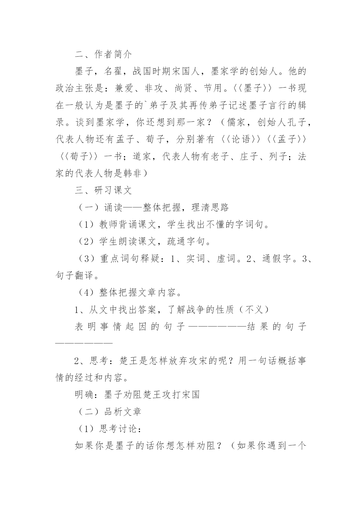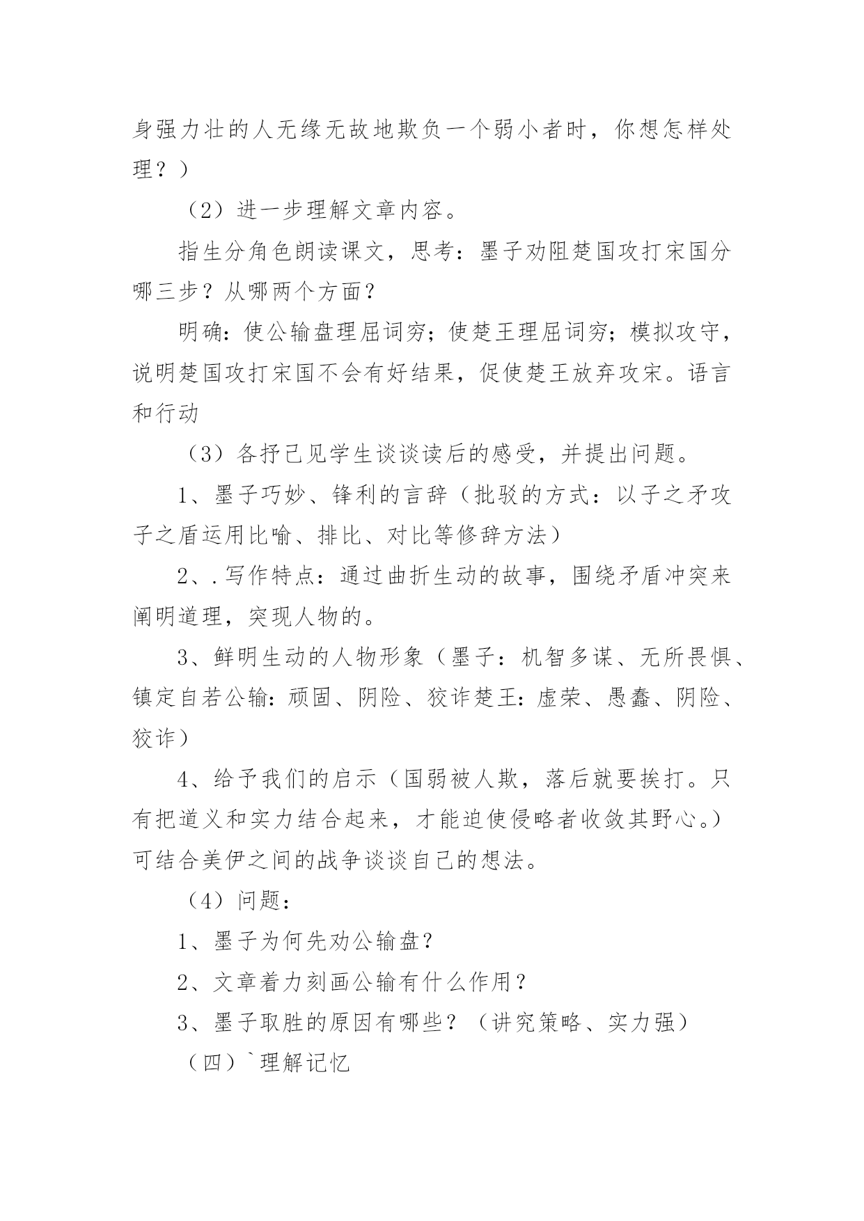 《公输》教学设计教学课题:公输教学课型:新授教学目标:1、体会文章高超的劝说艺术。2、理解文中的人物形象及文章所寓含的道理。3、能背诵课文重点段落。教学设想:“书读百遍,其义自见”,以读贯穿全文,在疏通文意的基础上,让学生先整体把握课文,然后启发学生去研习课文。先设疑(考查学生的应变能力,与文章内容进行比较,加深对课文的理解),再让学生从内容、人物、.写作特点等方面鉴赏文章,接着教师点拨.总结,学生理解记忆并背诵重点,最后是对文章内容的拓展。教学方法:1、诵读——品析——背诵2、设疑——点拨——释疑教学过程:一、导语设计大家对于成语“班门弄斧”都很熟悉吧,谁能解释一下?(在鲁班面前摆弄斧子,比喻在行家面前显示本领)班,鲁班,古代有名的能工巧匠,同时他还是一个顽固、狡诈、阴险的人,通过学习《公输》一文,我们会了解到更多的知识。二、作者简介墨子,名翟,战国时期宋国人,墨家学的创始人。他的政治主张是:兼爱、非攻、尚贤、节用。〈〈墨子〉〉一书现在一般认为是墨子的`弟子及其再传弟子记述墨子言行的辑录。谈到墨家学,你还想到那一家?(儒家,创始人孔子,代表人物还有孟子、荀子,分别著有〈〈论语〉〉〈〈孟子〉〉〈〈荀子〉〉一书;道家,代表人物有老子、庄子、列子;法家的代表人物是韩非)三、研习课文(一)诵读——整体把握,理清思路(1)教师背诵课文,学生找出不懂的字词句。(2)学生朗读课文,疏通字句。(3)重点词句释疑:1、实词、虚词。2、通假字。3、句子翻译。(4)整体把握文章内容。1、从文中找出答案,了解战争的性质(不义)表明事情起因的句子——————结果的句子——————2、思考:楚王是怎样放弃攻宋的呢?用一句话概括事情的经过和内容。明确:墨子劝阻楚王攻打宋国(二)品析文章(1)思考讨论:如果你是墨子的话你想怎样劝阻?(如果你遇到一个身强力壮的人无缘无故地欺负一个弱小者时,你想怎样处理?)(2)进一步理解文章内容。指生分角色朗读课文,思考:墨子劝阻楚国攻打宋国分哪三步?从哪两个方面?明确:使公输盘理屈词穷;使楚王理屈词穷;模拟攻守,说明楚国攻打宋国不会有好结果,促使楚王放弃攻宋。语言和行动(3)各抒己见学生谈谈读后的感受,并提出问题。1、墨子巧妙、锋利的言辞(批驳的方式:以子之矛攻子之盾运用比喻、排比、对比等修辞方法)2、.写作特点:通过曲折生动的故事,围绕矛盾冲突来阐明道理,突现人物的。3、鲜明生动的人物形象(墨子:机智多谋、无所畏惧、镇定自若公输:顽固、阴险、狡诈楚王:虚荣、愚蠢、阴险、狡诈)4、给予我们的启示(国弱被人欺,落后就要挨打。只有把道义和实力结合起来,才能迫使侵略者收敛其野心。)可结合美伊之间的战争谈谈自己的想法。(4)问题:1、墨子为何先劝公输盘?2、文章着力刻画公输有什么作用?3、墨子取胜的原因有哪些?(讲究策略、实力强)(四)`理解记忆文章先诱使对方说出正确观点,然后指出对方的行为与观点相悖谬,使之陷入自相矛盾中而无法争辩。(劝阻公输、楚王的段落)(五)拓展学习《公输》一课后,我的最大感受是——————————————————。