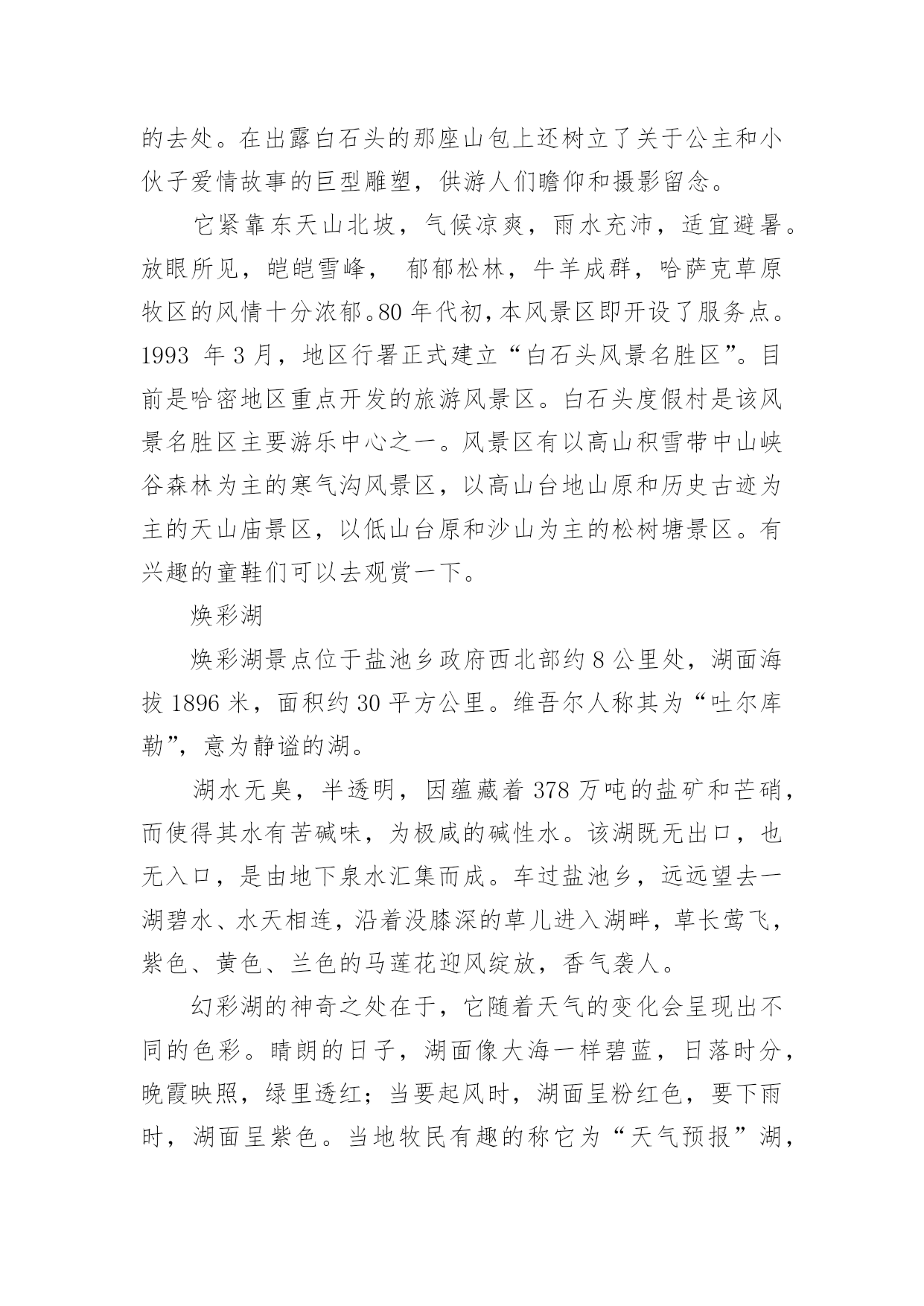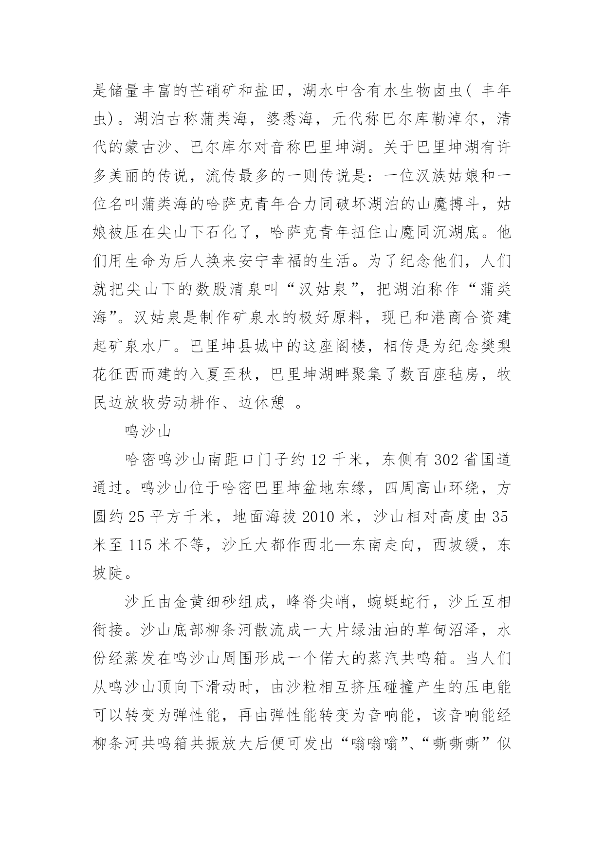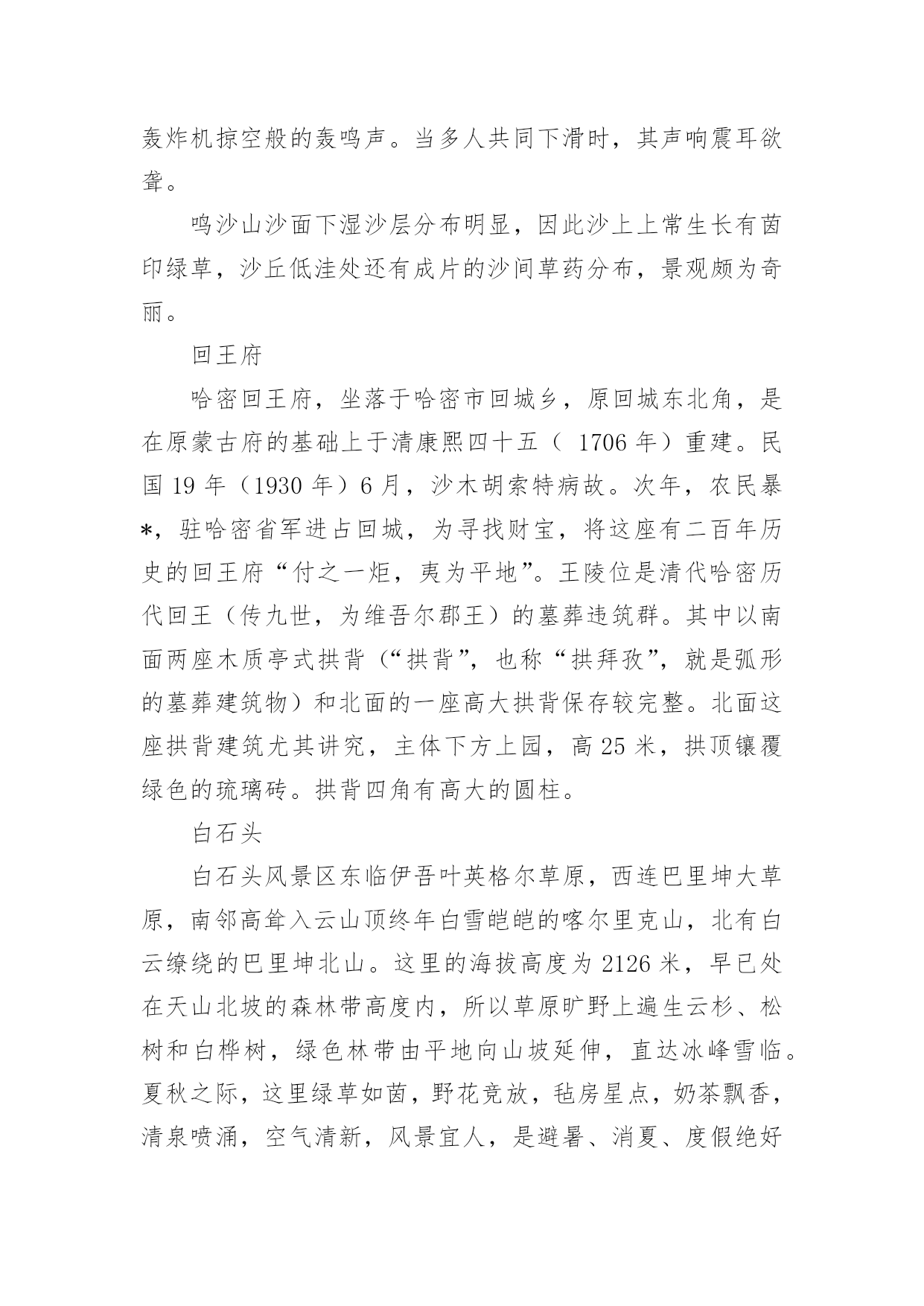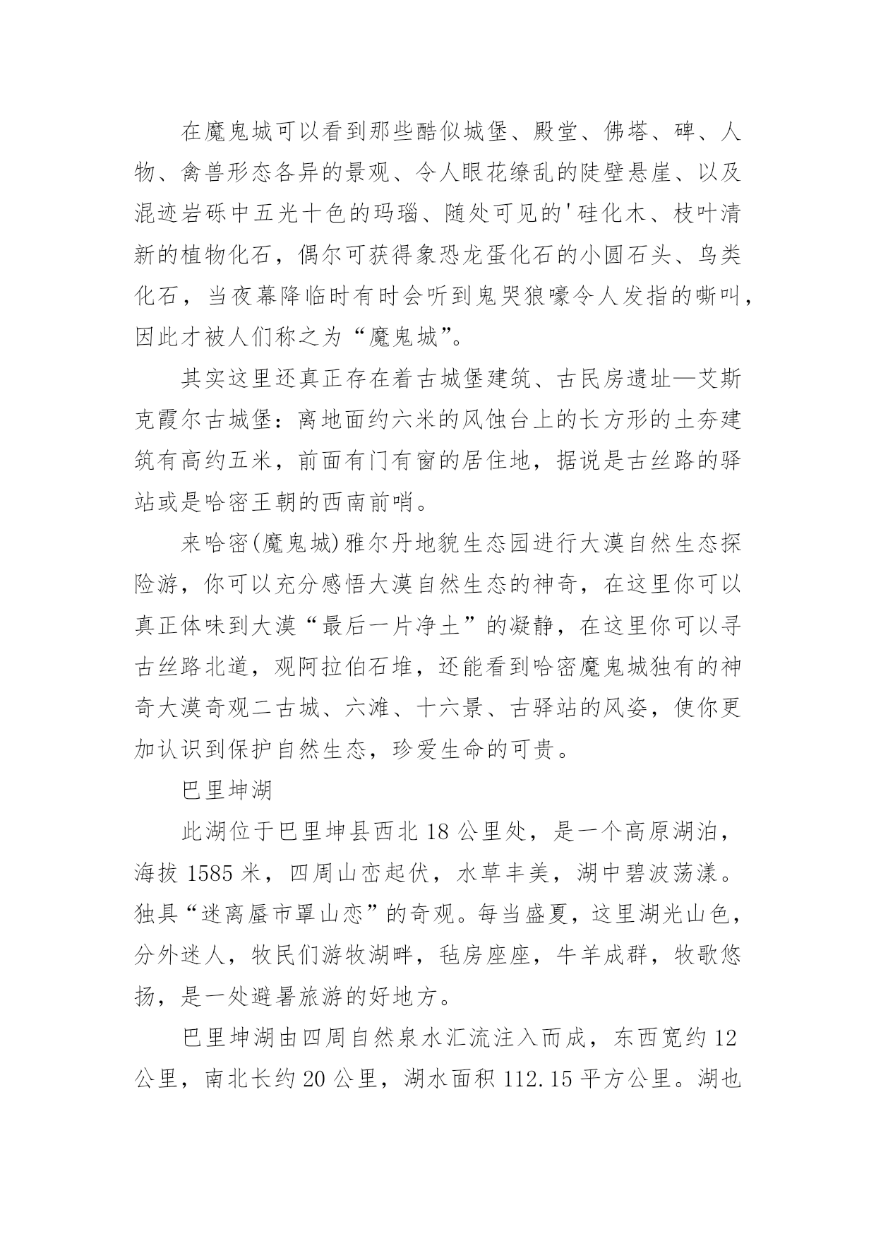 哈密的最佳旅游时间哈密以其地貌出名,近年来也有很多人选择去哈密旅游,那么你知道哈密的最佳旅游时间是什么时候吗?接下来是小编为你带来收集整理的哈密的最佳旅游时间,欢迎阅读!7、8、9三个月是哈密的最佳旅游时间。哈密地处亚欧大陆腹地,属温带大陆性干旱气候。干燥少雨,昼夜温差大,日照时间长。一年四季气候变化显著。夏末秋初之际前往哈密,可以品尝新鲜的瓜果,欣赏美丽的自然风光,领略不同的风土人情。五堡魔鬼城魔鬼城位于哈密市五堡乡以南,距五堡乡20Km,距哈密市约100Km,由于它神秘莫测,不熟悉地形的人若遇风暴,有迷失方向的危险,哈密雅丹地貌东起烟墩外的骆驼峰,经雅满苏铁矿,大南湖煤矿,到五堡沙尔湖十三间房等长约400公里,宽约5-10公里,在哈密属于特殊的地理环境,它是经过漫长的风蚀自然而形成的。哈密雅丹地貌东起烟墩外的骆驼峰,经雅满苏铁矿,大南湖煤矿,到五堡沙尔湖十三间房等长约400公里,宽约5-10公里,在哈密属于特殊的地理环境,它是经过漫长的风蚀自然而形成的。在魔鬼城可以看到那些酷似城堡、殿堂、佛塔、碑、人物、禽兽形态各异的景观、令人眼花缭乱的陡壁悬崖、以及混迹岩砾中五光十色的玛瑙、随处可见的'硅化木、枝叶清新的植物化石,偶尔可获得象恐龙蛋化石的小圆石头、鸟类化石,当夜幕降临时有时会听到鬼哭狼嚎令人发指的嘶叫,因此才被人们称之为“魔鬼城”。其实这里还真正存在着古城堡建筑、古民房遗址—艾斯克霞尔古城堡:离地面约六米的风蚀台上的长方形的土夯建筑有高约五米,前面有门有窗的居住地,据说是古丝路的驿站或是哈密王朝的西南前哨。来哈密(魔鬼城)雅尔丹地貌生态园进行大漠自然生态探险游,你可以充分感悟大漠自然生态的神奇,在这里你可以真正体味到大漠“最后一片净土”的凝静,在这里你可以寻古丝路北道,观阿拉伯石堆,还能看到哈密魔鬼城独有的神奇大漠奇观二古城、六滩、十六景、古驿站的风姿,使你更加认识到保护自然生态,珍爱生命的可贵。巴里坤湖此湖位于巴里坤县西北18公里处,是一个高原湖泊,海拔1585米,四周山峦起伏,水草丰美,湖中碧波荡漾。独具“迷离蜃市罩山恋”的奇观。每当盛夏,这里湖光山色,分外迷人,牧民们游牧湖畔,毡房座座,牛羊成群,牧歌悠扬,是一处避暑旅游的好地方。巴里坤湖由四周自然泉水汇流注入而成,东西宽约12公里,南北长约20公里,湖水面积112.15平方公里。湖也是储量丰富的芒硝矿和盐田,湖水中含有水生物卤虫(丰年虫)。湖泊古称蒲类海,婆悉海,元代称巴尔库勒淖尔,清代的蒙古沙、巴尔库尔对音称巴里坤湖。关于巴里坤湖有许多美丽的传说,流传最多的一则传说是:一位汉族姑娘和一位名叫蒲类海的哈萨克青年合力同破坏湖泊的山魔搏斗,姑娘被压在尖山下石化了,哈萨克青年扭住山魔同沉湖底。他们用生命为后人换来安宁幸福的生活。为了纪念他们,人们就把尖山下的数股清泉叫“汉姑泉”,把湖泊称作“蒲类海”。汉姑泉是制作矿泉水的极好原料,现已和港商合资建起矿泉水厂。巴里坤县城中的这座阁楼,相传是为纪念樊梨花征西而建的入夏至秋,巴里坤湖畔聚集了数百座毡房,牧民边放牧劳动耕作、边休憩。鸣沙山哈密鸣沙山南距口门子约12千米,东侧有302省国道通过。鸣沙山位于哈密巴里坤盆地东缘,四周高山环绕,方圆约25平方千米,地面海拔2010米,沙山相对高度由35米至115米不等,沙丘大都作西北—东南走向,西坡缓,东坡陡。沙丘由金黄细砂组成,峰脊尖峭,蜿蜒蛇行,沙丘互相衔接。沙山底部柳条河散流成一大片绿油油的草甸沼泽,水份经蒸发在鸣沙山周围形成一个偌大的蒸汽共鸣箱。当人们从鸣沙山顶向下滑动时,由沙粒相互挤压碰撞产生的压电能可以转变为弹性能,再由弹性能转变为音响能,该音响能经柳条河共鸣箱共振放大后便可发出“嗡嗡嗡”、“嘶嘶嘶”似轰炸机掠空般的轰鸣声。当多人共同下滑时,其声响震耳欲聋。鸣沙山沙面下湿沙层分布明显,因此沙上上常生长有茵印绿草,沙丘低洼处还有成片的沙间草药分布,景观颇为奇丽。回王府哈密回王府,坐落于哈密市回城乡,原回城东北角,是在原蒙古府的基础上于清康熙四十五(1706年)重建。民国19年(1930年)6月,沙木胡索特病故。次年,农民暴*,驻哈密省军进占回城,为寻找财宝,将这座有二百年历史的回王府“付之一炬,夷为平地”。王陵位是清代哈密历代回王(传九世,为维吾尔郡王)的墓葬违筑群。其中以南面两座木质亭式拱背(“拱背”,也称“拱拜孜”,就是弧形的墓葬建筑物)和北面的一座高大拱背保存较完整。北面这座拱背建筑尤其讲究,主体下方上园,高25米,拱顶镶覆绿色的琉璃砖。拱背四角有高大的圆柱。白石头白石头风景区东临伊吾叶英格尔草原,西连巴里坤大草原,南邻高耸入云山顶终年白雪皑皑的喀尔里克山,北有白云缭绕的巴里坤北山。这里的海拔高度为2126米,早已处在天山北坡的森林带高度内,所以草原旷野上遍生云杉、松