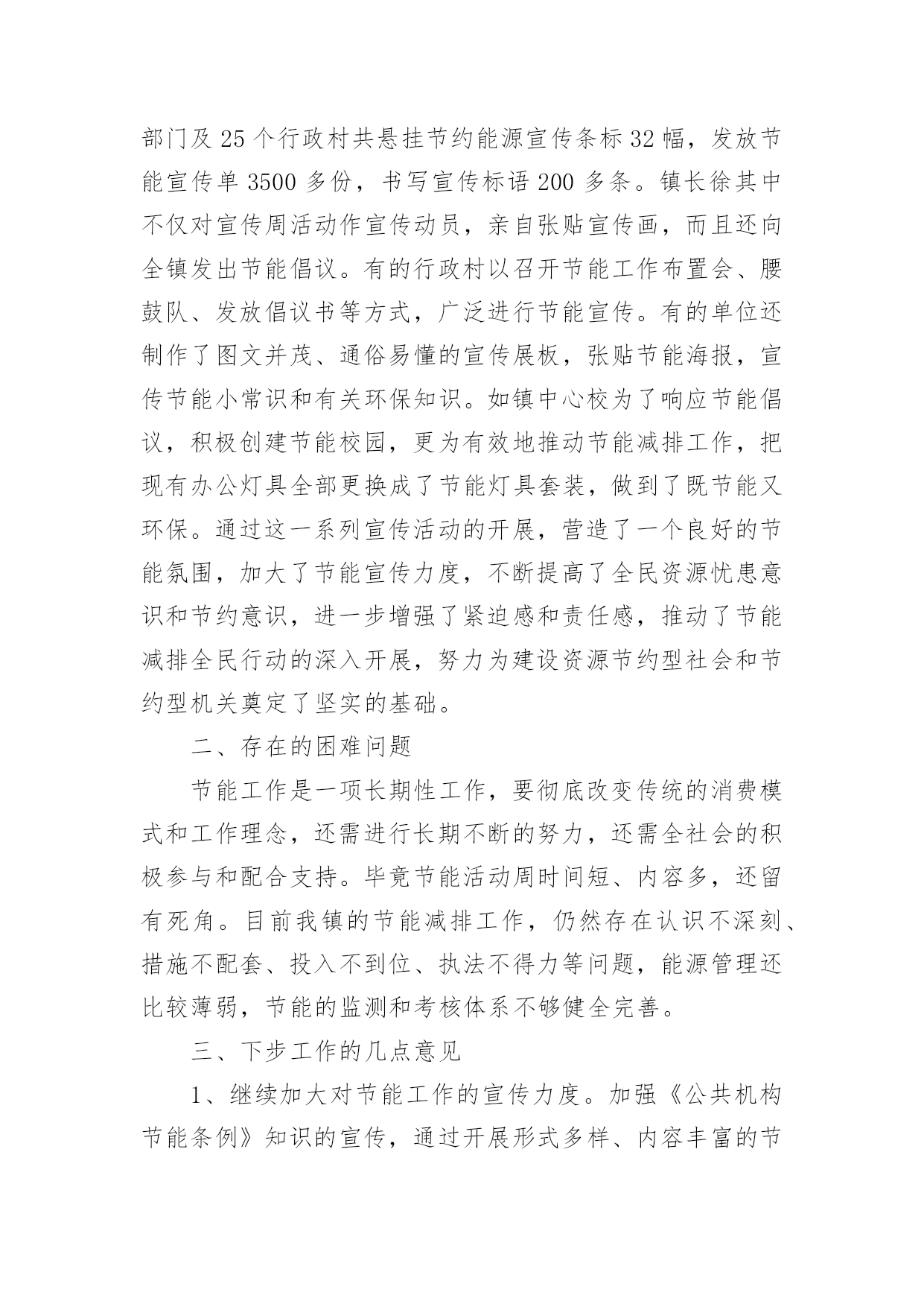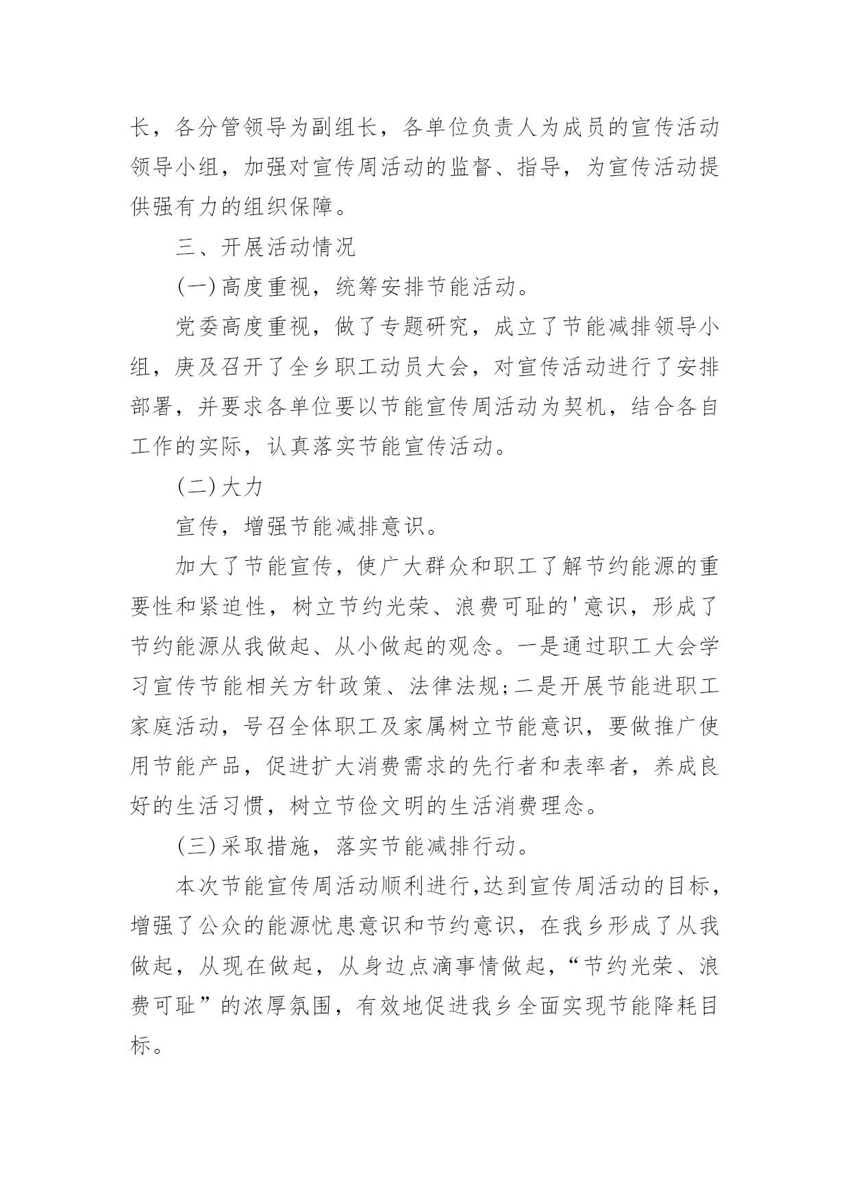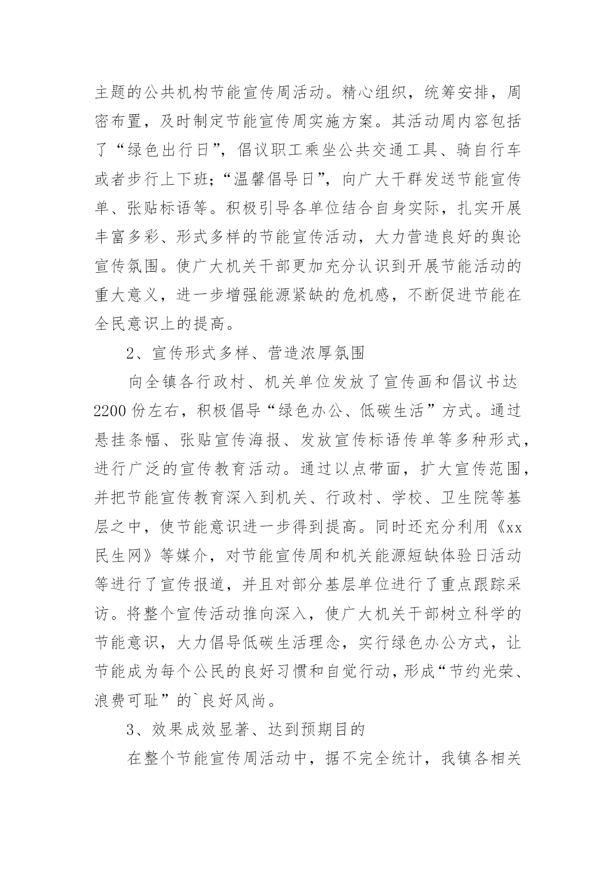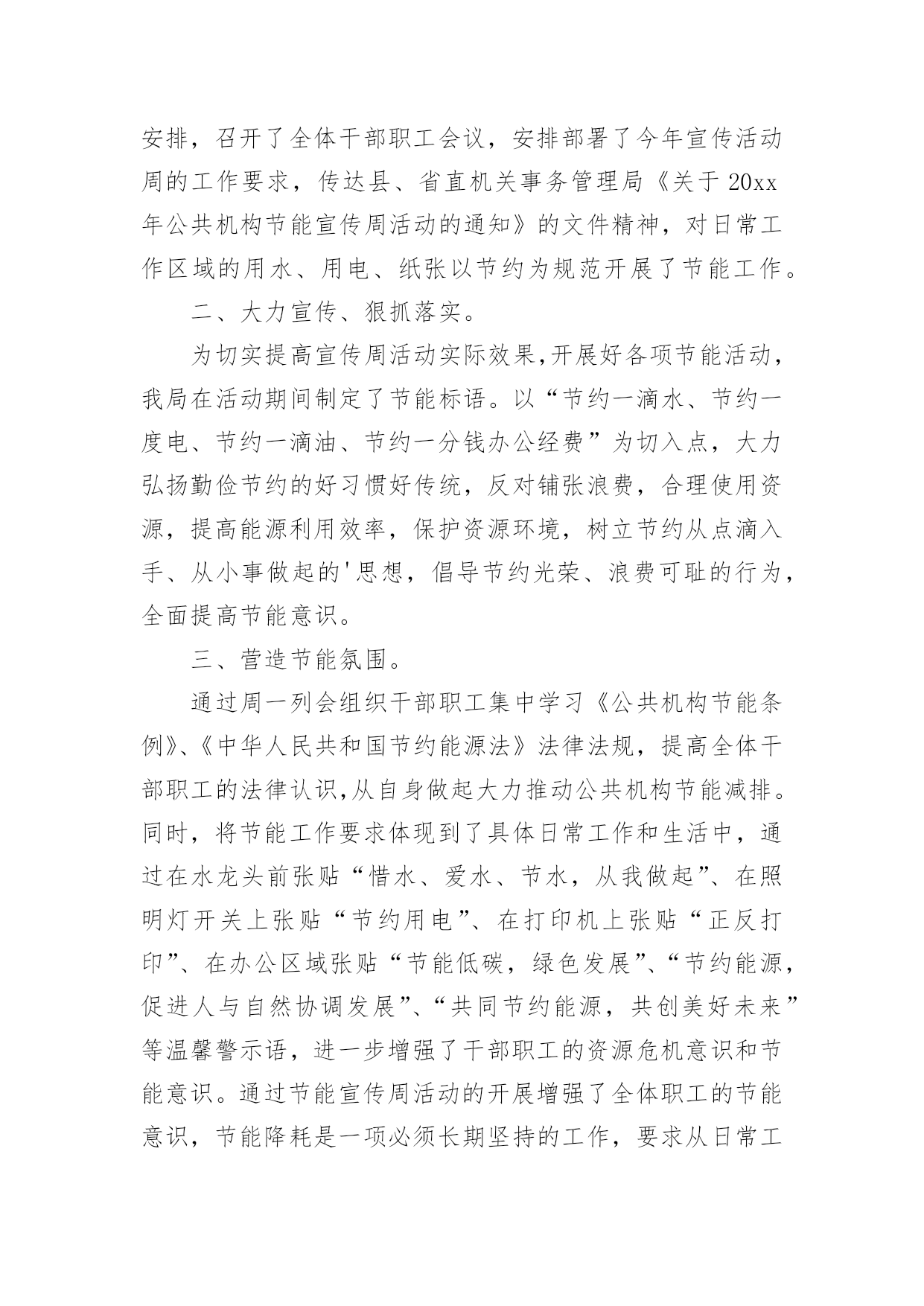 公共机构节能宣传周工作总结公共机构节能宣传周工作总结总结是事后对某一时期、某一项目或某些工作进行回顾和分析,从而做出带有规律性的结论,它能使我们及时找出错误并改正,不如静下心来好好写写总结吧。我们该怎么写总结呢?以下是小编收集整理的公共机构节能宣传周工作总结,希望能够帮助到大家。公共机构节能宣传周工作总结1按照《关于开展x年公共机构节能宣传周活动的通知》(达县公共机构节能办2号)精神,我乡紧紧围绕“节能低碳新生活,公共机构做表率”这一主题,对今年的宣传周活动进行了安排部署,既营造了良好的氛围,又取得了较好的效果。现将我乡节能宣传周活动总结如下:一、指导思想以实现科学发展为目标,走可持续发展之路,广泛地开展节能教育,集中宣传节能降耗的极端重要性和紧迫性,宣传国家有关节能的方针政策、法律法规和标准规范,不断提高全民资源忧患意识和节约意识,增强紧迫感和责任感,努力营造浓厚的节能氛围,全力打好节能减排攻坚仗。二、加强组织领导为确保宣传周活动的顺利开展,成立了以主要领导为组长,各分管领导为副组长,各单位负责人为成员的宣传活动领导小组,加强对宣传周活动的监督、指导,为宣传活动提供强有力的组织保障。三、开展活动情况(一)高度重视,统筹安排节能活动。党委高度重视,做了专题研究,成立了节能减排领导小组,庚及召开了全乡职工动员大会,对宣传活动进行了安排部署,并要求各单位要以节能宣传周活动为契机,结合各自工作的实际,认真落实节能宣传活动。(二)大力宣传,增强节能减排意识。加大了节能宣传,使广大群众和职工了解节约能源的重要性和紧迫性,树立节约光荣、浪费可耻的'意识,形成了节约能源从我做起、从小做起的观念。一是通过职工大会学习宣传节能相关方针政策、法律法规;二是开展节能进职工家庭活动,号召全体职工及家属树立节能意识,要做推广使用节能产品,促进扩大消费需求的先行者和表率者,养成良好的生活习惯,树立节俭文明的生活消费理念。(三)采取措施,落实节能减排行动。本次节能宣传周活动顺利进行,达到宣传周活动的目标,增强了公众的能源忧患意识和节约意识,在我乡形成了从我做起,从现在做起,从身边点滴事情做起,“节约光荣、浪费可耻”的浓厚氛围,有效地促进我乡全面实现节能降耗目标。公共机构节能宣传周工作总结2根据市节能办《关于在全市开展xxxx年公共机构节能宣传周活动的通知》(贵公节办〔xxxx〕6号)的文件精神,贵港市信访局结合实际扎实有效地开展各项节能宣传活动。现将活动开展情况总结如下:一、高度重视,加强组织领导成立了由局主要领导任组长,其他局领导为副组长,各科室(中心)负责人为成员的宣传周活动领导小组,为宣传周活动的开展提供了强有力的组织保障。二、紧扣活动主题,多形式宣传(一)制定节能宣传周活动方案为了达到宣传节能效果,制定贵港市信访局xxxx年节能宣传周活动实施方案。把节能降耗工作落在实处,进一步制定了节能减排实施方案,落实了相关责任人、重点工作、节能措施、保障措施等,并对节能指标进行了分解。(二)开展以“节能有我、绿色共享”、“工业低碳发展”为主题的宣传活动节能宣传周活动期间,我局紧紧围绕“节能有我,绿色共享”、“工业低碳发展”主题,结合信访工作实际,开展了形式多样,丰富多彩的.宣传活动。1、展出板报、悬挂和张贴各种宣传标语及宣传画在市信访局办公楼正门口悬挂宣传标语;在办公楼一楼、二楼、三楼等楼道显眼处张贴宣传画。在一楼接访大厅展出以“节能有我绿色共享”为主题的节能宣传板报,向更多的干部职工及来访群众普及能源资源节约和资源循环利用知识,营造浓厚的节能宣传氛围。通过多形式向干部职工宣传节约用水、用电的重要意义和必要性,号召全体干部职工在工作和生活中积极主动节约用水、用电,提高干部职工节能减排的意识。2、开展各种主题宣传和体验活动一是开展节能低碳主题宣传活动。在节能宣传周期间,以建设生态文明为主线,凝聚社会各界力量,普及生态文明、绿色低碳发展理念,通过群众喜闻乐见的各种宣传形式,普及生态文明理念和知识,引领带动全社会形成崇尚节约节能、绿色消费与低碳环保的社会风尚,倡导绿色化生产生活方式。二是开展低碳日能源紧缺体验活动。6月13日是“全国低碳日”,当天,我局机关和人民群众来访接访中心办公区域停开空调一天,公共场所停开照明灯一天,办公室、会议室内充分利用自然光,不开或者少开照明灯;办公区域停开电视、电风扇等非办公电器。办公楼、办公室一律停开工作照明灯、空调,饮水机进行定时定点开电供水,做到人离切电。积极响应市提倡的节能措施,以绿色低碳的办公模式和出行方式支持“能源紧缺体验日”活动。三是开展废旧商品回收利用宣传活动。通过召开会议的形式,向全体干部职工宣传随意丢弃废旧灯管、电池对生态环境和人体健康的危害性,牢固树立保护环境、节约能源与循环利用的思想观念、形成“保护环境、人人