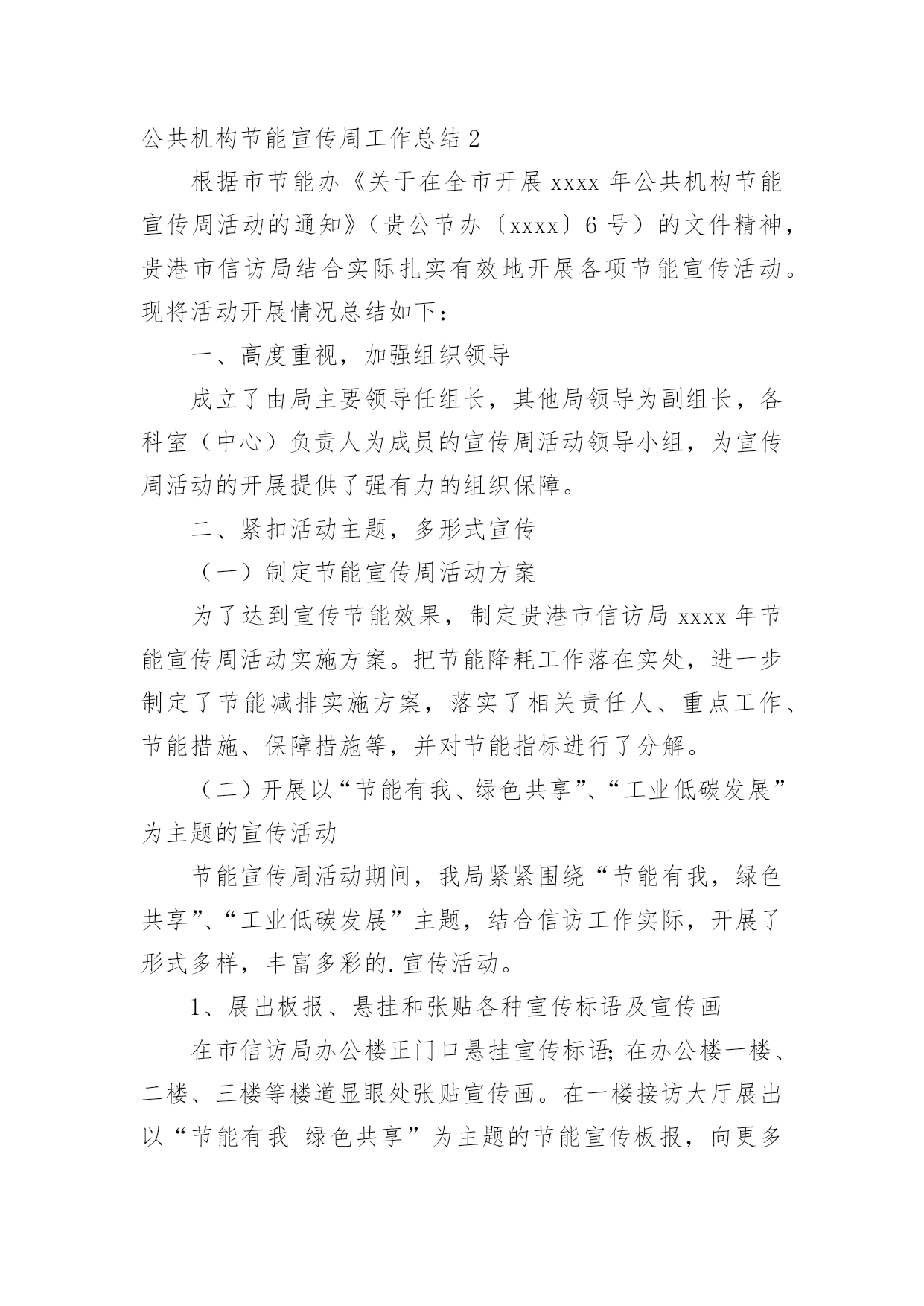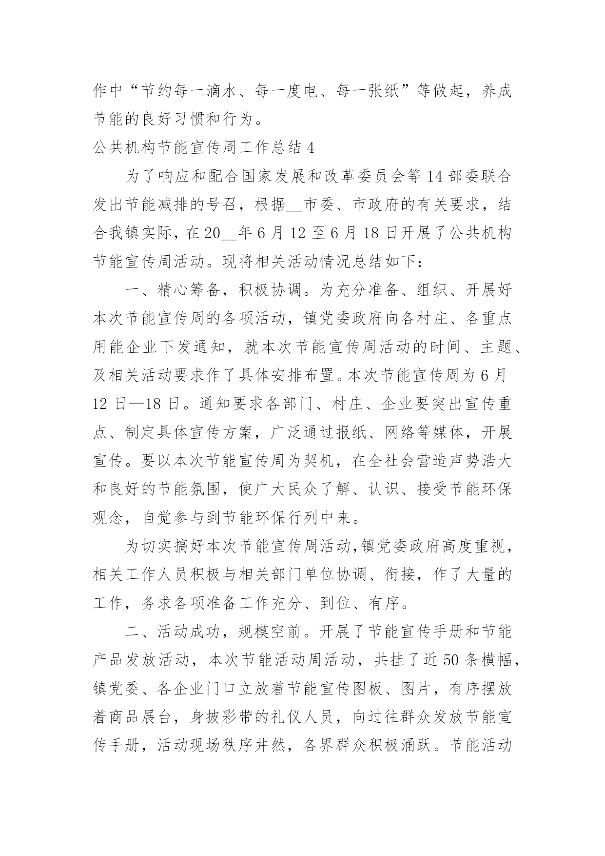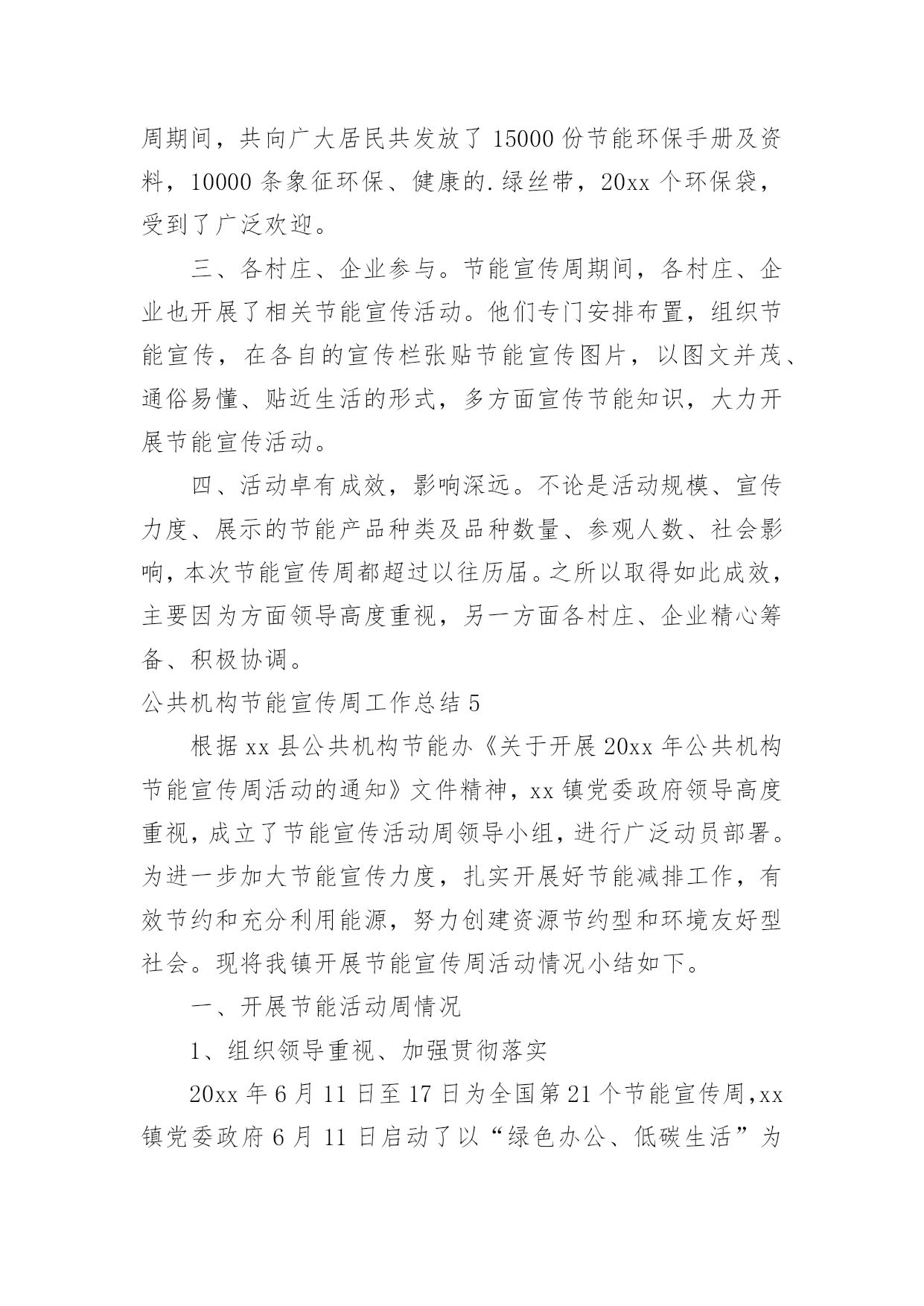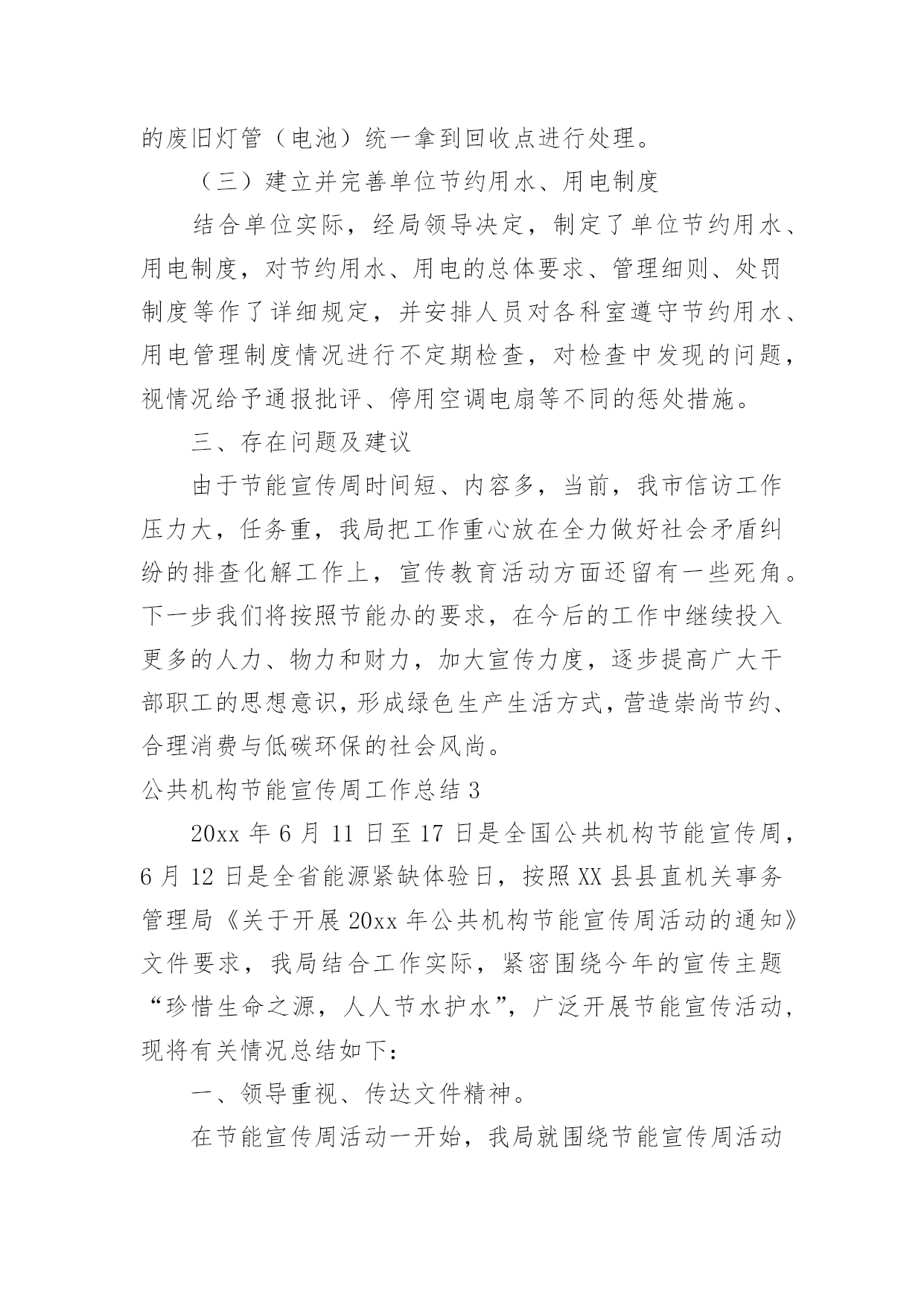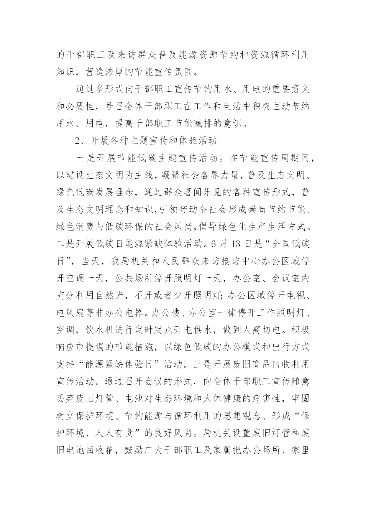 公共机构节能宣传周工作总结公共机构节能宣传周工作总结总结是事后对某一时期、某一项目或某些工作进行回顾和分析,从而做出带有规律性的结论,它能使我们及时找出错误并改正,不如静下心来好好写写总结吧。我们该怎么写总结呢?以下是小编收集整理的公共机构节能宣传周工作总结,希望能够帮助到大家。公共机构节能宣传周工作总结1按照《关于开展x年公共机构节能宣传周活动的通知》(达县公共机构节能办2号)精神,我乡紧紧围绕“节能低碳新生活,公共机构做表率”这一主题,对今年的宣传周活动进行了安排部署,既营造了良好的氛围,又取得了较好的效果。现将我乡节能宣传周活动总结如下:一、指导思想以实现科学发展为目标,走可持续发展之路,广泛地开展节能教育,集中宣传节能降耗的极端重要性和紧迫性,宣传国家有关节能的方针政策、法律法规和标准规范,不断提高全民资源忧患意识和节约意识,增强紧迫感和责任感,努力营造浓厚的节能氛围,全力打好节能减排攻坚仗。二、加强组织领导为确保宣传周活动的顺利开展,成立了以主要领导为组长,各分管领导为副组长,各单位负责人为成员的宣传活动领导小组,加强对宣传周活动的监督、指导,为宣传活动提供强有力的组织保障。三、开展活动情况(一)高度重视,统筹安排节能活动。党委高度重视,做了专题研究,成立了节能减排领导小组,庚及召开了全乡职工动员大会,对宣传活动进行了安排部署,并要求各单位要以节能宣传周活动为契机,结合各自工作的实际,认真落实节能宣传活动。(二)大力宣传,增强节能减排意识。加大了节能宣传,使广大群众和职工了解节约能源的重要性和紧迫性,树立节约光荣、浪费可耻的'意识,形成了节约能源从我做起、从小做起的观念。一是通过职工大会学习宣传节能相关方针政策、法律法规;二是开展节能进职工家庭活动,号召全体职工及家属树立节能意识,要做推广使用节能产品,促进扩大消费需求的先行者和表率者,养成良好的生活习惯,树立节俭文明的生活消费理念。(三)采取措施,落实节能减排行动。本次节能宣传周活动顺利进行,达到宣传周活动的目标,增强了公众的能源忧患意识和节约意识,在我乡形成了从我做起,从现在做起,从身边点滴事情做起,“节约光荣、浪费可耻”的浓厚氛围,有效地促进我乡全面实现节能降耗目标。公共机构节能宣传周工作总结2根据市节能办《关于在全市开展xxxx年公共机构节能宣传周活动的通知》(贵公节办〔xxxx〕6号)的文件精神,贵港市信访局结合实际扎实有效地开展各项节能宣传活动。现将活动开展情况总结如下:一、高度重视,加强组织领导成立了由局主要领导任组长,其他局领导为副组长,各科室(中心)负责人为成员的宣传周活动领导小组,为宣传周活动的开展提供了强有力的组织保障。二、紧扣活动主题,多形式宣传(一)制定节能宣传周活动方案为了达到宣传节能效果,制定贵港市信访局xxxx年节能宣传周活动实施方案。把节能降耗工作落在实处,进一步制定了节能减排实施方案,落实了相关责任人、重点工作、节能措施、保障措施等,并对节能指标进行了分解。(二)开展以“节能有我、绿色共享”、“工业低碳发展”为主题的宣传活动节能宣传周活动期间,我局紧紧围绕“节能有我,绿色共享”、“工业低碳发展”主题,结合信访工作实际,开展了形式多样,丰富多彩的.宣传活动。1、展出板报、悬挂和张贴各种宣传标语及宣传画在市信访局办公楼正门口悬挂宣传标语;在办公楼一楼、二楼、三楼等楼道显眼处张贴宣传画。在一楼接访大厅展出以“节能有我绿色共享”为主题的节能宣传板报,向更多的干部职工及来访群众普及能源资源节约和资源循环利用知识,营造浓厚的节能宣传氛围。通过多形式向干部职工宣传节约用水、用电的重要意义和必要性,号召全体干部职工在工作和生活中积极主动节约用水、用电,提高干部职工节能减排的意识。2、开展各种主题宣传和体验活动一是开展节能低碳主题宣传活动。在节能宣传周期间,以建设生态文明为主线,凝聚社会各界力量,普及生态文明、绿色低碳发展理念,通过群众喜闻乐见的各种宣传形式,普及生态文明理念和知识,引领带动全社会形成崇尚节约节能、绿色消费与低碳环保的社会风尚,倡导绿色化生产生活方式。二是开展低碳日能源紧缺体验活动。6月13日是“全国低碳日”,当天,我局机关和人民群众来访接访中心办公区域停开空调一天,公共场所停开照明灯一天,办公室、会议室内充分利用自然光,不开或者少开照明灯;办公区域停开电视、电风扇等非办公电器。办公楼、办公室一律停开工作照明灯、空调,饮水机进行定时定点开电供水,做到人离切电。积极响应市提倡的节能措施,以绿色低碳的办公模式和出行方式支持“能源紧缺体验日”活动。三是开展废旧商品回收利用宣传活动。通过召开会议的形式,向全体干部职工宣传随意丢弃废旧灯管、电池对生态环境和人体健康的危害性,牢固树立保护环境、节约能源与循环利用的思想观念、形成“保护环境、人人