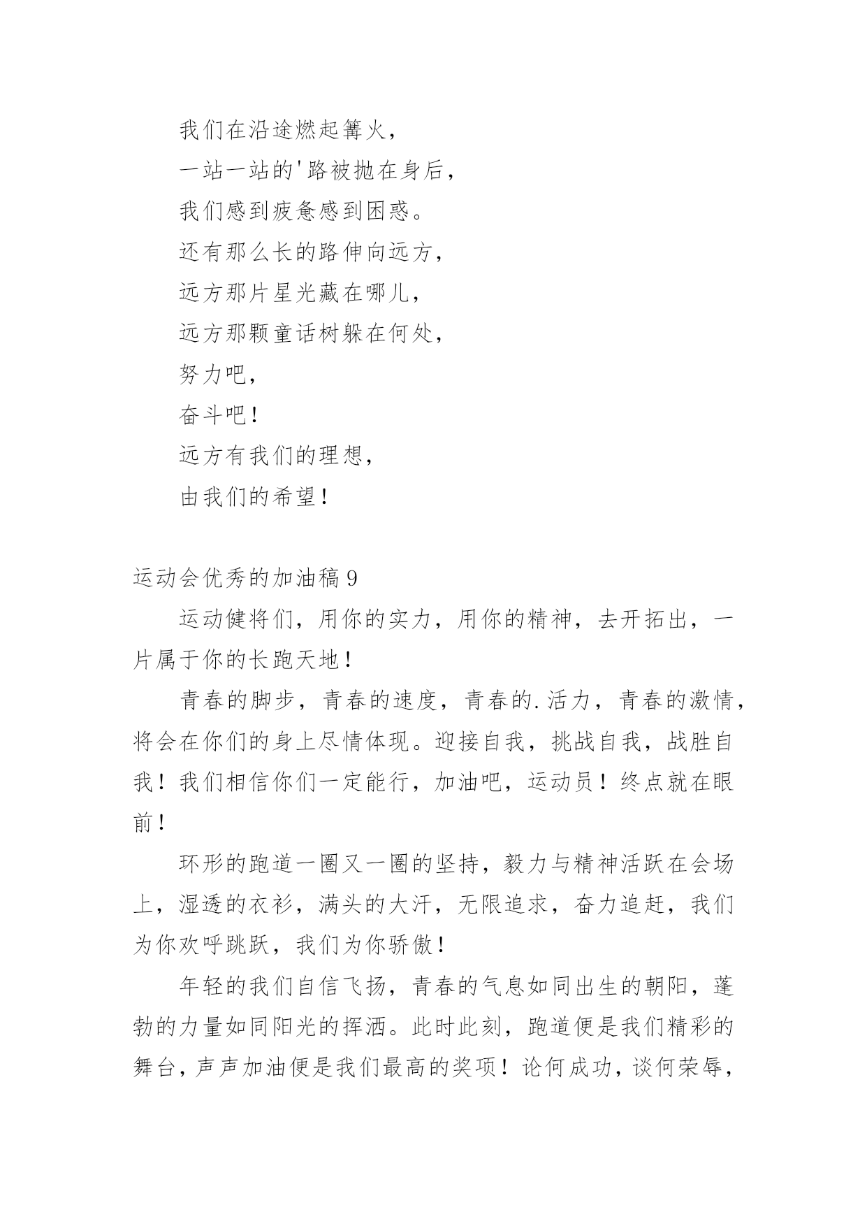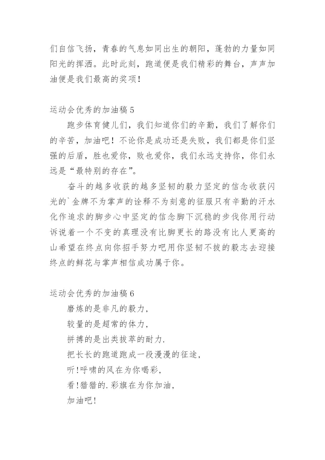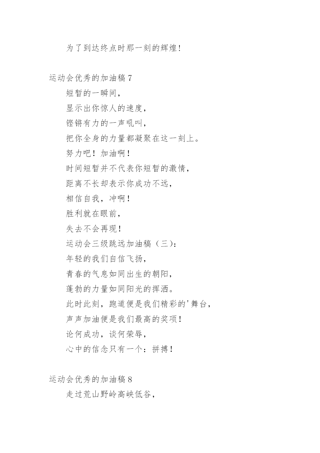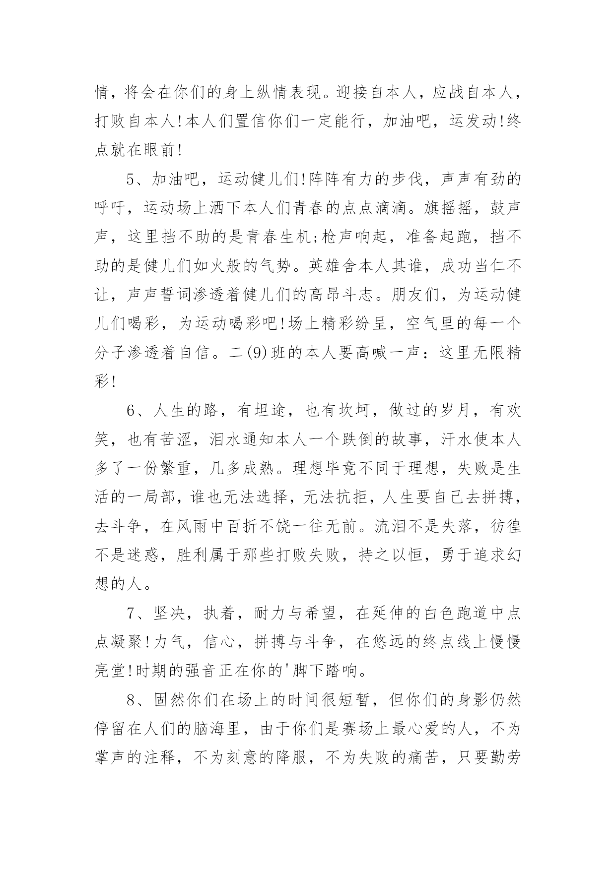 运动会优秀的加油稿在日新月异的现代社会中,我们都跟加油稿有着直接或间接的联系,加油稿是一种对他人有正向激励作用的文稿。大家知道加油稿怎么写才正确吗?下面是小编为大家整理的运动会优秀的加油稿,供大家参考借鉴,希望可以帮助到有需要的朋友。运动会优秀的加油稿1漫长的道路依旧漫长,是猎人哪怕草莽荆棘虎豹豺狼;是水手怎恐激流漩涡惊涛骇浪;是战士不具枪林弹雨滚滚硝烟;是强者无畏艰难困苦失败挫折。只要不断的攀登,就能领略无限的风光;只要不停的追求,就能捉到天边的'海风。抖擞疲惫的精神,让永不服输的心,在阳光雨露中尽情的激荡。挺直结实的腰杆,高昂不屈的头颅,拭去吧,额头的汗水;挥去吧,天边的阴云。微笑着跑步,生活中的强者,你终将迎来胜利和春光!运动会优秀的加油稿21、汗水,泪水;笑声,歌声;本人们纵情挥洒。开幕式上,运动场上,本人们纵情展示,几艰苦,几困苦,本人们英勇承当。由于年轻,由于张扬,由于本人们晓得:用今天的汗水换来明天的笑容。2、踏着春天的气息,迈着轻盈的脚步,本人们迎来了心仪已久的运动会。这里就是展现自本人的舞台。本人们向往高山的坚忍不拔,本人们盼望大海的博大精深,还有,本人们更痴迷于你们的速度激情。来吧,纵情释放你的生机。你的每一次冲刺,都叩动着本人们的心弦;你的每一次逾越,都吸收着本人们的视野;你的每一次起跳,都绷紧本人们的神经。本人们为你呼吁,本人们为你骄傲,本人们为你猖獗。3、步子迈开,让本人们奔驰在红色跑道上,用本人们的泪水和热血,更改历史的记载,起立吧,歌唱吧!为本人们的勇士加油!28致失败者倒下的时分,生命又怎能耸立!歪倾斜斜的身影,又怎耐的住风雨的洗礼。你若有一个不屈的灵魂,脚下才会有一方坚实的土地。昨天的失败曾经过去,成功不只仅是一个美妙的话题。4、青春的脚步,青春的速度,青春的生机,青春的激情,将会在你们的身上纵情表现。迎接自本人,应战自本人,打败自本人!本人们置信你们一定能行,加油吧,运发动!终点就在眼前!5、加油吧,运动健儿们!阵阵有力的步伐,声声有劲的呼吁,运动场上洒下本人们青春的点点滴滴。旗摇摇,鼓声声,这里挡不助的是青春生机;枪声响起,准备起跑,挡不助的是健儿们如火般的气势。英雄舍本人其谁,成功当仁不让,声声誓词渗透着健儿们的高昂斗志。朋友们,为运动健儿们喝彩,为运动喝彩吧!场上精彩纷呈,空气里的每一个分子渗透着自信。二(9)班的本人要高喊一声:这里无限精彩!6、人生的路,有坦途,也有坎坷,做过的岁月,有欢笑,也有苦涩,泪水通知本人一个跌倒的故事,汗水使本人多了一份繁重,几多成熟。理想毕竟不同于理想,失败是生活的一局部,谁也无法选择,无法抗拒,人生要自己去拼搏,去斗争,在风雨中百折不饶一往无前。流泪不是失落,彷徨不是迷惑,胜利属于那些打败失败,持之以恒,勇于追求幻想的人。7、坚决,执着,耐力与希望,在延伸的白色跑道中点点凝聚!力气,信心,拼搏与斗争,在悠远的终点线上慢慢亮堂!时期的强音正在你的'脚下踏响。8、固然你们在场上的时间很短暂,但你们的身影仍然停留在人们的脑海里,由于你们是赛场上最心爱的人,不为掌声的注释,不为刻意的降服,不为失败的痛苦,只要勤劳的汗水化作胜利的脚步。9、泥泞的路走过无数累了,通知自己:快了,再坚持一会儿身上的伤流出血来疼了,通知自己:别哭,会好的摔到了,通知自己:快爬起来,世上很少有坦途。10、胜利与失败就在一霎时,但不论胜利或失败,你们都冲过了心中的终点,你们永远是好样的,永远是本人们心中最美的。你们在呼吁声中,努力努力再努力,拼搏拼搏再拼搏,本人们为你呼吁,为你加油,运动会因你们而精彩。运动会优秀的加油稿3枪声伴您踏上征程,您昂着自信的头,带着必胜的信念,冲去,奔去。那一刻时光仿佛都为您停住,您的.勇气振动了一切,震撼了每一个人的心灵。终点。您赢了。虽然只是那短短的十几秒,但您在我们心中留下了永恒。运动会优秀的加油稿4有多少次挥汗如雨,伤痛曾添满记忆,只因为始终相信,去拼搏才能胜利。总在鼓舞自己,要成功就得努力。热血在赛场沸腾,巨人在赛场升起。相信自己,你将赢得胜利,创造奇迹;相信自己,梦想在你手中,这是你的天地。当一切过去,你们将是第一。相信自己,你们将超越极限,超越自己!相信自己,加油吧,健儿们,相信你自己。年轻的'我们自信飞扬,青春的气息如同出生的朝阳,蓬勃的力量如同阳光的挥洒。此时此刻,跑道便是我们精彩的舞台,声声加油便是我们最高的奖项!运动会优秀的加油稿5跑步体育健儿们,我们知道你们的辛勤,我们了解你们的辛苦,加油吧!不论你是成功还是失败,我们都是你们坚强的后盾,胜也爱你,败也爱你,我们永远支持你,你们永远是“最特别的存在”。奋斗的越多收获的越多坚韧的毅力坚定的信念收获闪光的`金牌不为掌声的诠释不为刻意的征服只有辛勤的汗水化作追求的脚步心中坚定的信念脚下沉稳