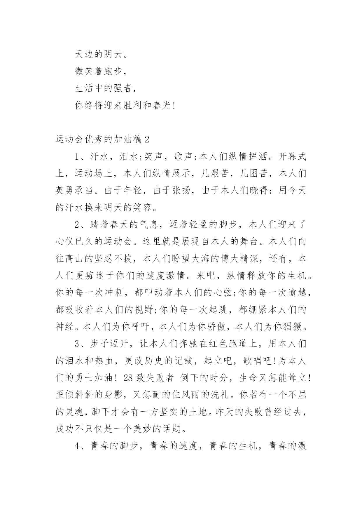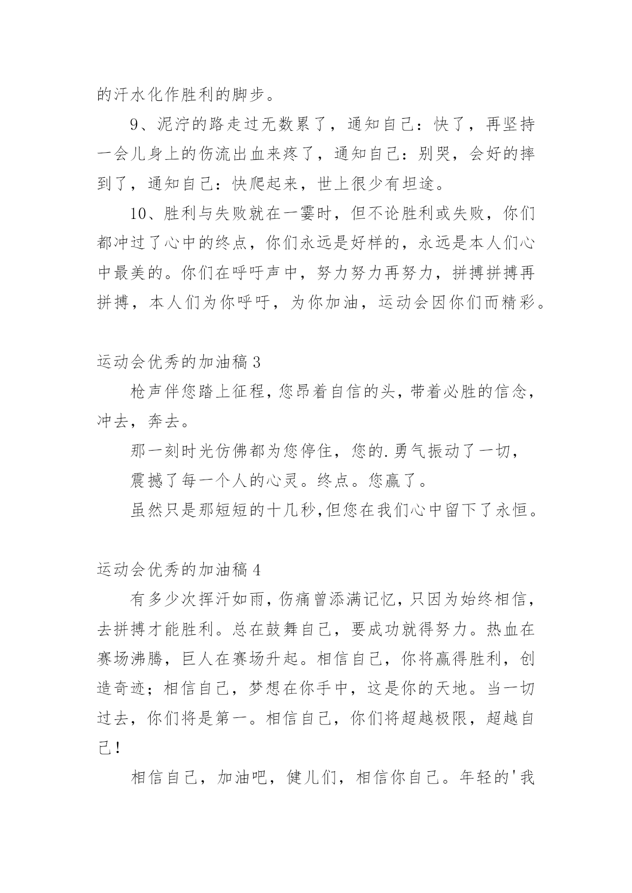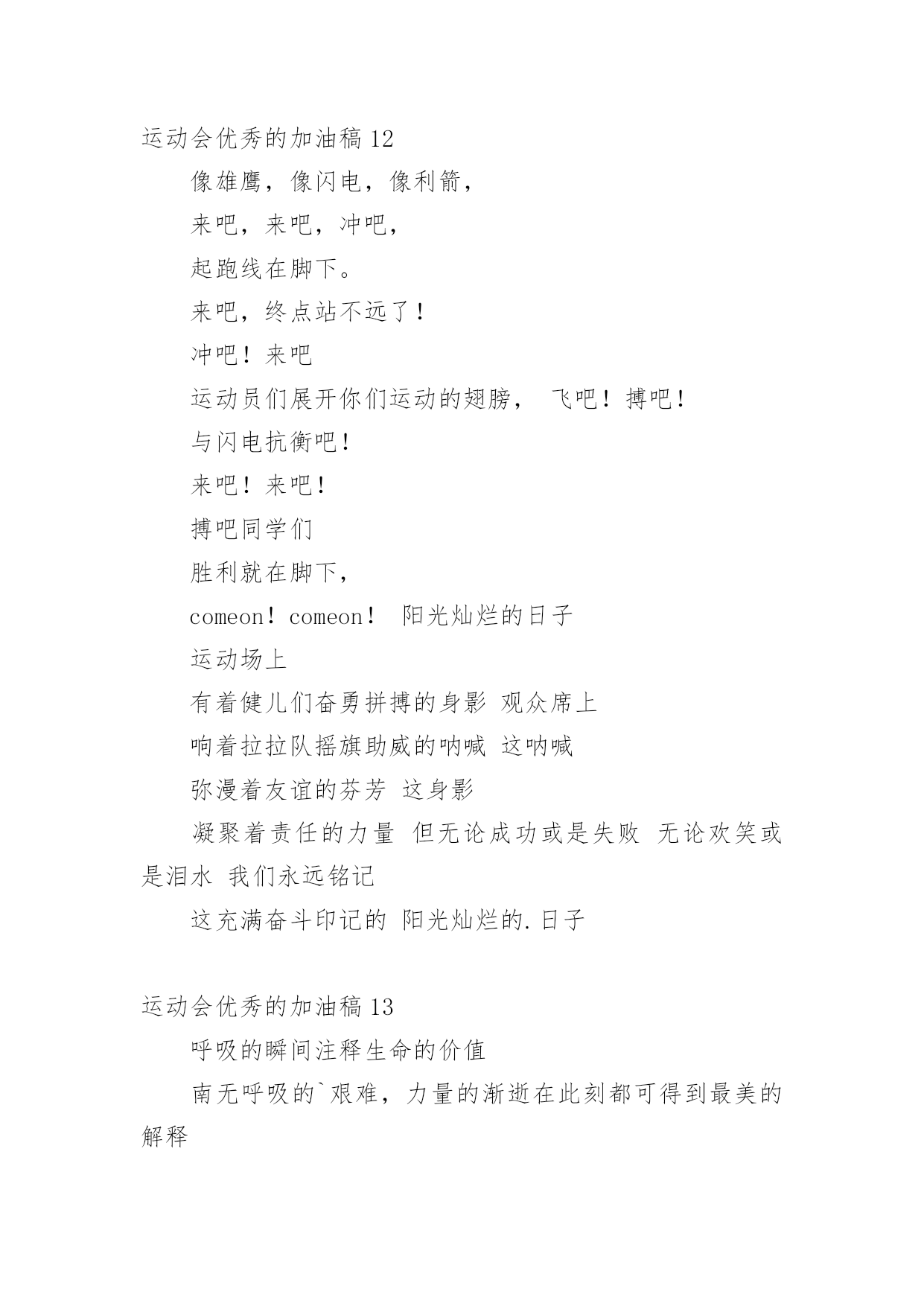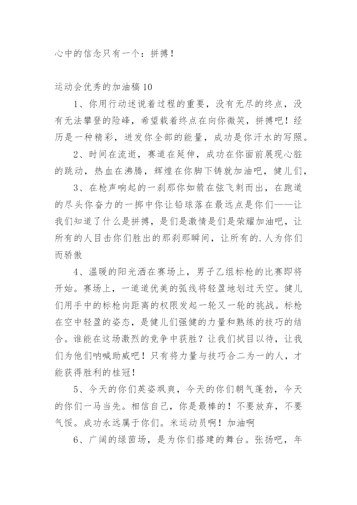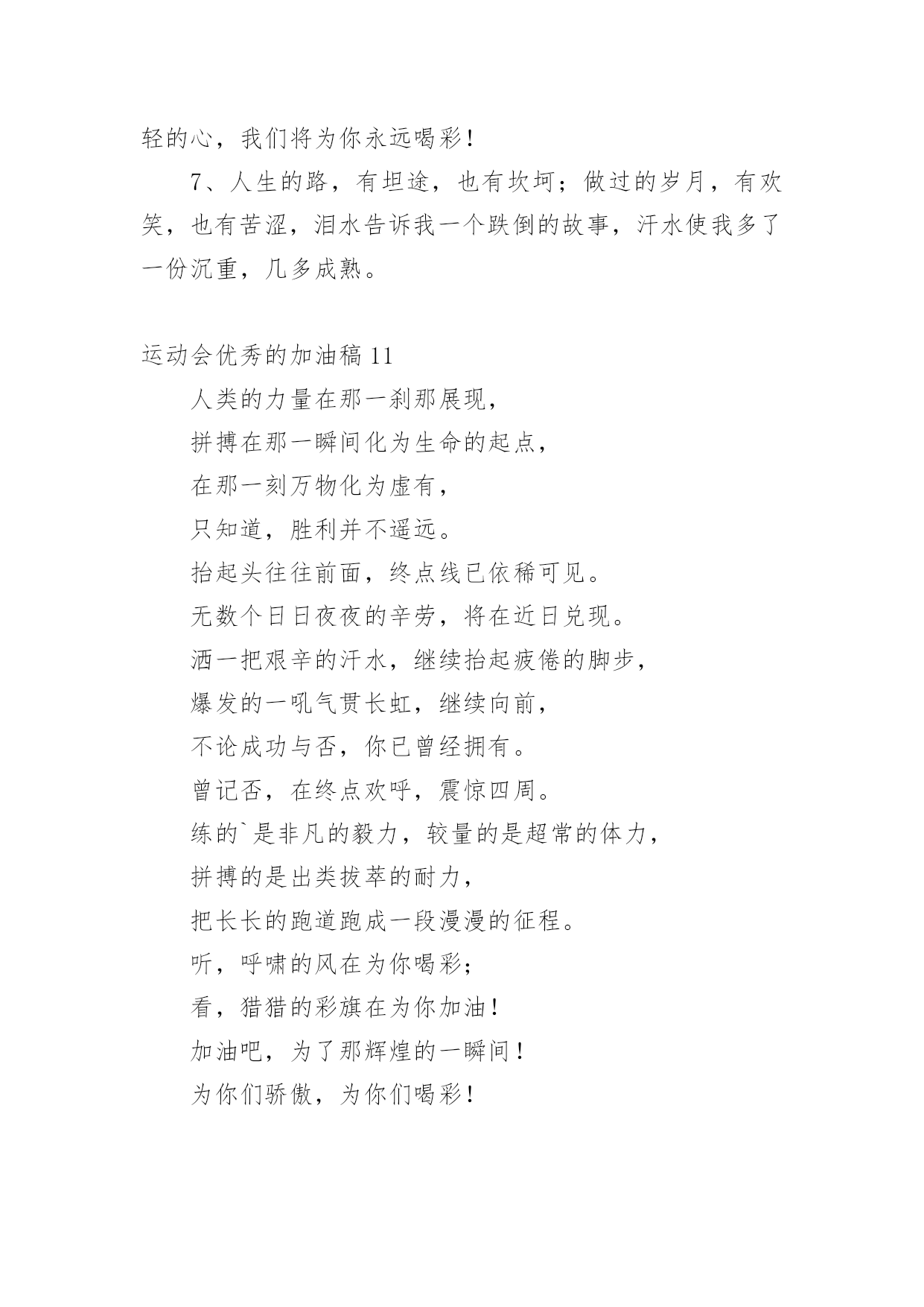 运动会优秀的加油稿在日新月异的现代社会中,我们都跟加油稿有着直接或间接的联系,加油稿是一种对他人有正向激励作用的文稿。大家知道加油稿怎么写才正确吗?下面是小编为大家整理的运动会优秀的加油稿,供大家参考借鉴,希望可以帮助到有需要的朋友。运动会优秀的加油稿1漫长的道路依旧漫长,是猎人哪怕草莽荆棘虎豹豺狼;是水手怎恐激流漩涡惊涛骇浪;是战士不具枪林弹雨滚滚硝烟;是强者无畏艰难困苦失败挫折。只要不断的攀登,就能领略无限的风光;只要不停的追求,就能捉到天边的'海风。抖擞疲惫的精神,让永不服输的心,在阳光雨露中尽情的激荡。挺直结实的腰杆,高昂不屈的头颅,拭去吧,额头的汗水;挥去吧,天边的阴云。微笑着跑步,生活中的强者,你终将迎来胜利和春光!运动会优秀的加油稿21、汗水,泪水;笑声,歌声;本人们纵情挥洒。开幕式上,运动场上,本人们纵情展示,几艰苦,几困苦,本人们英勇承当。由于年轻,由于张扬,由于本人们晓得:用今天的汗水换来明天的笑容。2、踏着春天的气息,迈着轻盈的脚步,本人们迎来了心仪已久的运动会。这里就是展现自本人的舞台。本人们向往高山的坚忍不拔,本人们盼望大海的博大精深,还有,本人们更痴迷于你们的速度激情。来吧,纵情释放你的生机。你的每一次冲刺,都叩动着本人们的心弦;你的每一次逾越,都吸收着本人们的视野;你的每一次起跳,都绷紧本人们的神经。本人们为你呼吁,本人们为你骄傲,本人们为你猖獗。3、步子迈开,让本人们奔驰在红色跑道上,用本人们的泪水和热血,更改历史的记载,起立吧,歌唱吧!为本人们的勇士加油!28致失败者倒下的时分,生命又怎能耸立!歪倾斜斜的身影,又怎耐的住风雨的洗礼。你若有一个不屈的灵魂,脚下才会有一方坚实的土地。昨天的失败曾经过去,成功不只仅是一个美妙的话题。4、青春的脚步,青春的速度,青春的生机,青春的激情,将会在你们的身上纵情表现。迎接自本人,应战自本人,打败自本人!本人们置信你们一定能行,加油吧,运发动!终点就在眼前!5、加油吧,运动健儿们!阵阵有力的步伐,声声有劲的呼吁,运动场上洒下本人们青春的点点滴滴。旗摇摇,鼓声声,这里挡不助的是青春生机;枪声响起,准备起跑,挡不助的是健儿们如火般的气势。英雄舍本人其谁,成功当仁不让,声声誓词渗透着健儿们的高昂斗志。朋友们,为运动健儿们喝彩,为运动喝彩吧!场上精彩纷呈,空气里的每一个分子渗透着自信。二(9)班的本人要高喊一声:这里无限精彩!6、人生的路,有坦途,也有坎坷,做过的岁月,有欢笑,也有苦涩,泪水通知本人一个跌倒的故事,汗水使本人多了一份繁重,几多成熟。理想毕竟不同于理想,失败是生活的一局部,谁也无法选择,无法抗拒,人生要自己去拼搏,去斗争,在风雨中百折不饶一往无前。流泪不是失落,彷徨不是迷惑,胜利属于那些打败失败,持之以恒,勇于追求幻想的人。7、坚决,执着,耐力与希望,在延伸的白色跑道中点点凝聚!力气,信心,拼搏与斗争,在悠远的终点线上慢慢亮堂!时期的强音正在你的'脚下踏响。8、固然你们在场上的时间很短暂,但你们的身影仍然停留在人们的脑海里,由于你们是赛场上最心爱的人,不为掌声的注释,不为刻意的降服,不为失败的痛苦,只要勤劳的汗水化作胜利的脚步。9、泥泞的路走过无数累了,通知自己:快了,再坚持一会儿身上的伤流出血来疼了,通知自己:别哭,会好的摔到了,通知自己:快爬起来,世上很少有坦途。10、胜利与失败就在一霎时,但不论胜利或失败,你们都冲过了心中的终点,你们永远是好样的,永远是本人们心中最美的。你们在呼吁声中,努力努力再努力,拼搏拼搏再拼搏,本人们为你呼吁,为你加油,运动会因你们而精彩。运动会优秀的加油稿3枪声伴您踏上征程,您昂着自信的头,带着必胜的信念,冲去,奔去。那一刻时光仿佛都为您停住,您的.勇气振动了一切,震撼了每一个人的心灵。终点。您赢了。虽然只是那短短的十几秒,但您在我们心中留下了永恒。运动会优秀的加油稿4有多少次挥汗如雨,伤痛曾添满记忆,只因为始终相信,去拼搏才能胜利。总在鼓舞自己,要成功就得努力。热血在赛场沸腾,巨人在赛场升起。相信自己,你将赢得胜利,创造奇迹;相信自己,梦想在你手中,这是你的天地。当一切过去,你们将是第一。相信自己,你们将超越极限,超越自己!相信自己,加油吧,健儿们,相信你自己。年轻的'我们自信飞扬,青春的气息如同出生的朝阳,蓬勃的力量如同阳光的挥洒。此时此刻,跑道便是我们精彩的舞台,声声加油便是我们最高的奖项!运动会优秀的加油稿5跑步体育健儿们,我们知道你们的辛勤,我们了解你们的辛苦,加油吧!不论你是成功还是失败,我们都是你们坚强的后盾,胜也爱你,败也爱你,我们永远支持你,你们永远是“最特别的存在”。奋斗的越多收获的越多坚韧的毅力坚定的信念收获闪光的`金牌不为掌声的诠释不为刻意的征服只有辛勤的汗水化作追求的脚步心中坚定的信念脚下沉稳
