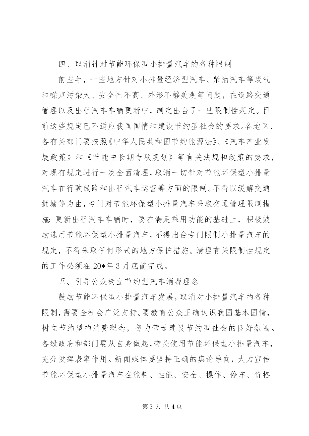 第PAGE\*Arabic\*MERGEFORMAT4页共NUMPAGES\*MERGEFORMAT4页企业环保节能工作意见近年来,随着汽车工业科技水平的不断提高,节能环保型小排量汽车在安全性、动力性和外观等方面都有了很大改善,同时其燃油消耗少、尾气排放低、外形尺寸小、道路和车位占用面积少等优点也日益突出。但在发展节能环保型小排量汽车方面,我国目前缺乏应有的鼓励支持政策,一部分地区还制定出台了一些限制性规定。为贯彻落实《国务院关于做好建设节约型社会近期重点工作的通知》*精神,现就鼓励发展节能环保型小排量汽车提出以下意见:一、充分认识发展节能环保型小排量汽车的重要性目前,节能环保型小排量汽车已成为汽车发展的主流和消费者关注的热点。美国、日本、欧洲等发达国家和地区节能环保型小排量汽车比例已占70%以上。我国节能环保型小排量汽车正日益受到消费者的喜爱,增长迅速,但比例仍然偏低。积极发展节能环保型小排量汽车,符合我国能源供给实际和大众消费水平,是建设节约型社会的重要措施,不仅有利于缓解能源紧张状况,保护环境,而且有利于培育我国汽车工业自主品牌,提高国际竞争力,对于促进汽车产业可持续发展,落实国家能源发展战略,加快建设资源节约型、环境友好型社会,具有重要意义。各地区、各部门要把鼓励节能环保型小排量汽车发展作为一项重要工作,积极采取有效措施,切实抓紧抓好。二、制定鼓励节能环保型小排量汽车发展的产业政策要按照国家《产业结构调整指导目录》,积极鼓励低油耗、低排放、小排量、小型化、高动力性汽车的生产和投资。加大节能环保型小排量汽车及其先进发动机(汽油机升功率大于50kw,柴油机升功率大于40kw)技术研究开发和产业化的支持力度。鼓励开发、生产柴油轿车和微型车,以及使用醇醚燃料、天然气、混合燃料、氢燃料等新型燃料的汽车。积极推动《乘用车燃料消耗量限值》国家标准的实施,从源头上控制高耗油汽车的发展。进一步完善节能环保型小排量汽车的技术标准,不断提高其安全、节能、环保等性能。严格执行《中华人民共和国道路交通安全法》等有关法律法规,加强汽车的定期检验,确保节能环保型小排量汽车的安全使用。三、制定鼓励节能环保型小排量汽车消费的政策措施有关部门要加快制定有关政策措施,引导、鼓励消费者购买和使用低能耗、低污染、小排量、新能源、新动力汽车。制定和完善鼓励节能环保型小排量汽车消费的税费政策。加快石油产品价格市场化改革进程,逐步建立能够体现市场供求关系和资源稀缺程度的价格形成机制,引导消费者节约用油。研究制定汽车燃油经济性标准,建立汽车能效标识制度。对节能环保型小排量汽车停车收费给予适当优惠。各地区要结合实际,积极制定具体措施,为节能环保型小排量汽车的消费和使用创造良好的环境。四、取消针对节能环保型小排量汽车的各种限制前些年,一些地方针对小排量经济型汽车、柴油汽车等废气和噪声污染大、安全性不高、外形不够美观等问题,在道路交通管理以及出租汽车车辆更新中,制定出台了一些限制性规定。目前这些规定已不适应我国国情和建设节约型社会的要求。各地区、各有关部门要按照《中华人民共和国节约能源法》、《汽车产业发展政策》和《节能中长期专项规划》等有关法规和政策的要求,对现有规定进行一次全面清理,取消一切针对节能环保型小排量汽车在行驶线路和出租汽车运营等方面的限制。不得以缓解交通拥堵等为由,专门对节能环保型小排量汽车采取交通管理限制措施;更新出租汽车车辆时,要在满足乘用功能的基础上,积极鼓励选用节能环保型小排量汽车,不得出台专门限制小排量汽车的规定,不得采取任何形式的地方保护措施。清理有关限制性规定的工作必须在20*年3月底前完成。五、引导公众树立节约型汽车消费理念鼓励节能环保型小排量汽车发展,取消对小排量汽车的各种限制,需要全社会广泛支持。要教育公众正确认识我国基本国情,树立节约型的消费理念,努力营造建设节约型社会的良好氛围。各级政府和部门要从自身做起,带头使用节能环保型小排量汽车,充分发挥表率作用。新闻媒体要坚持正确的舆论导向,大力宣传节能环保型小排量汽车在能耗、性能、安全、操作、停车、价格等方面的优点,树立节能环保型小排量汽车的良好信誉,鼓励消费者优先购买节能环保型小排量汽车。六、加强领导和督促检查有关部门要按照职责分工,明确责任和任务,尽快出台有关政策措施,各省、自治区、直辖市人民政府要结合本地区实际抓好落实。当前,各地要明确牵头部门,严明纪律,加强监督检查,突出抓好取消针对节能环保型小排量汽车的各种限制等工作并确保按期完成。有关进展情况要及时报国务院,同时抄送发展改革委。发展改革委要会同有关部门组织一次专项督查,加强督促和指导。