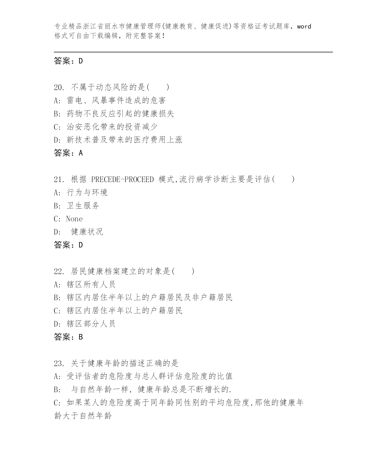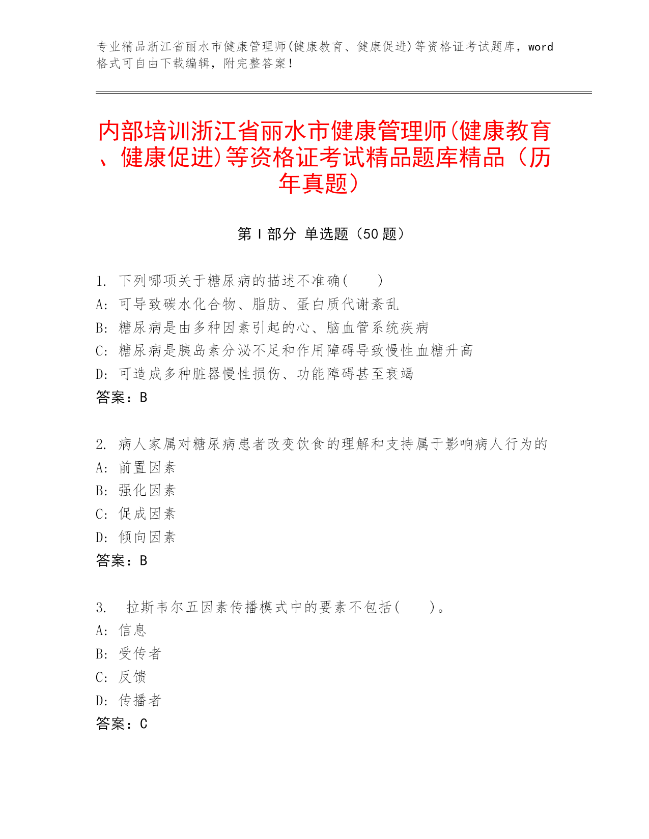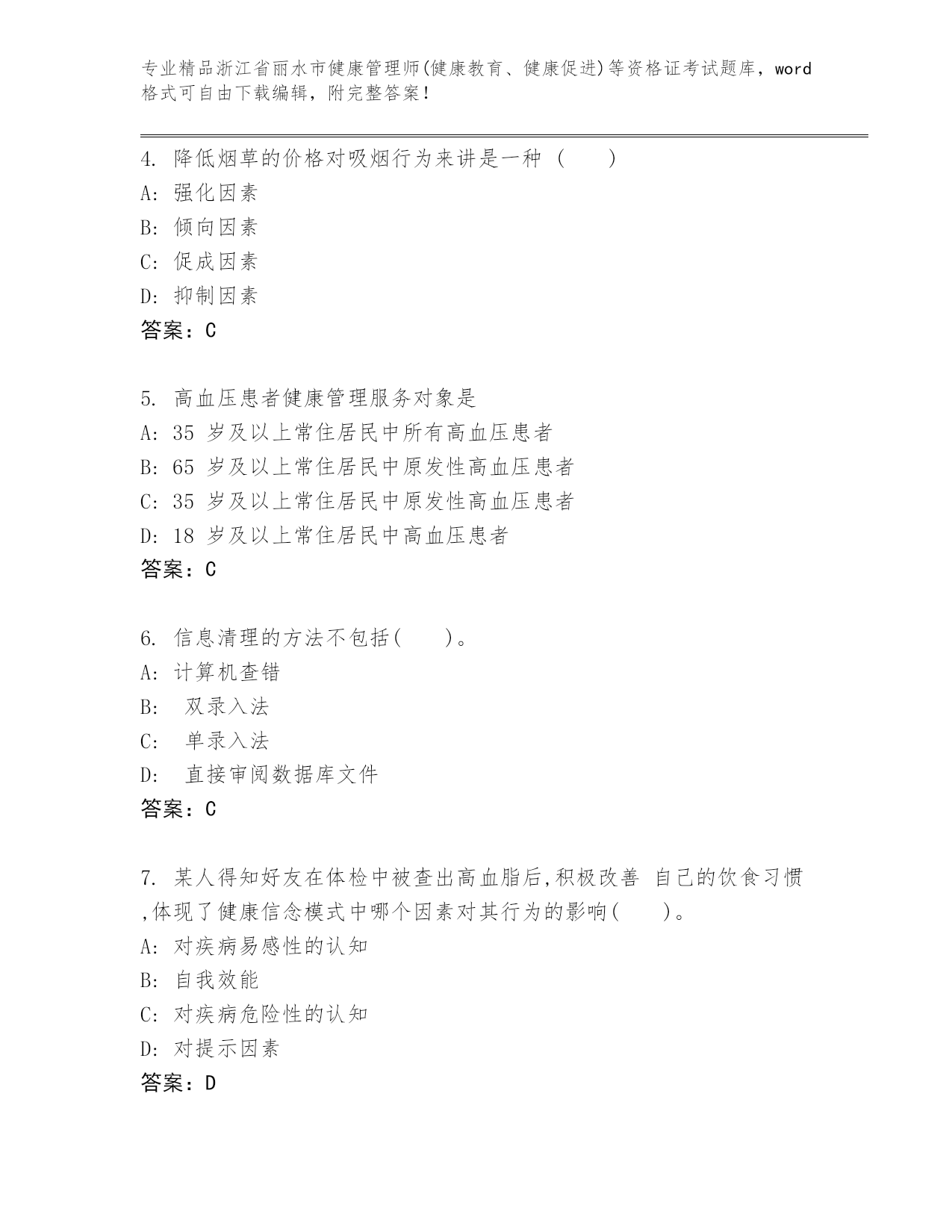 内部培训浙江省丽水市健康管理师(健康教育、健康促进)等资格证考试精品题库精品(历年真题)