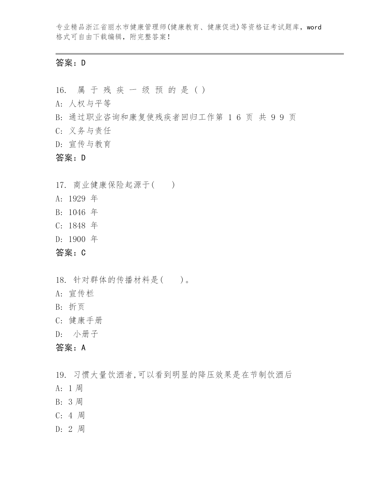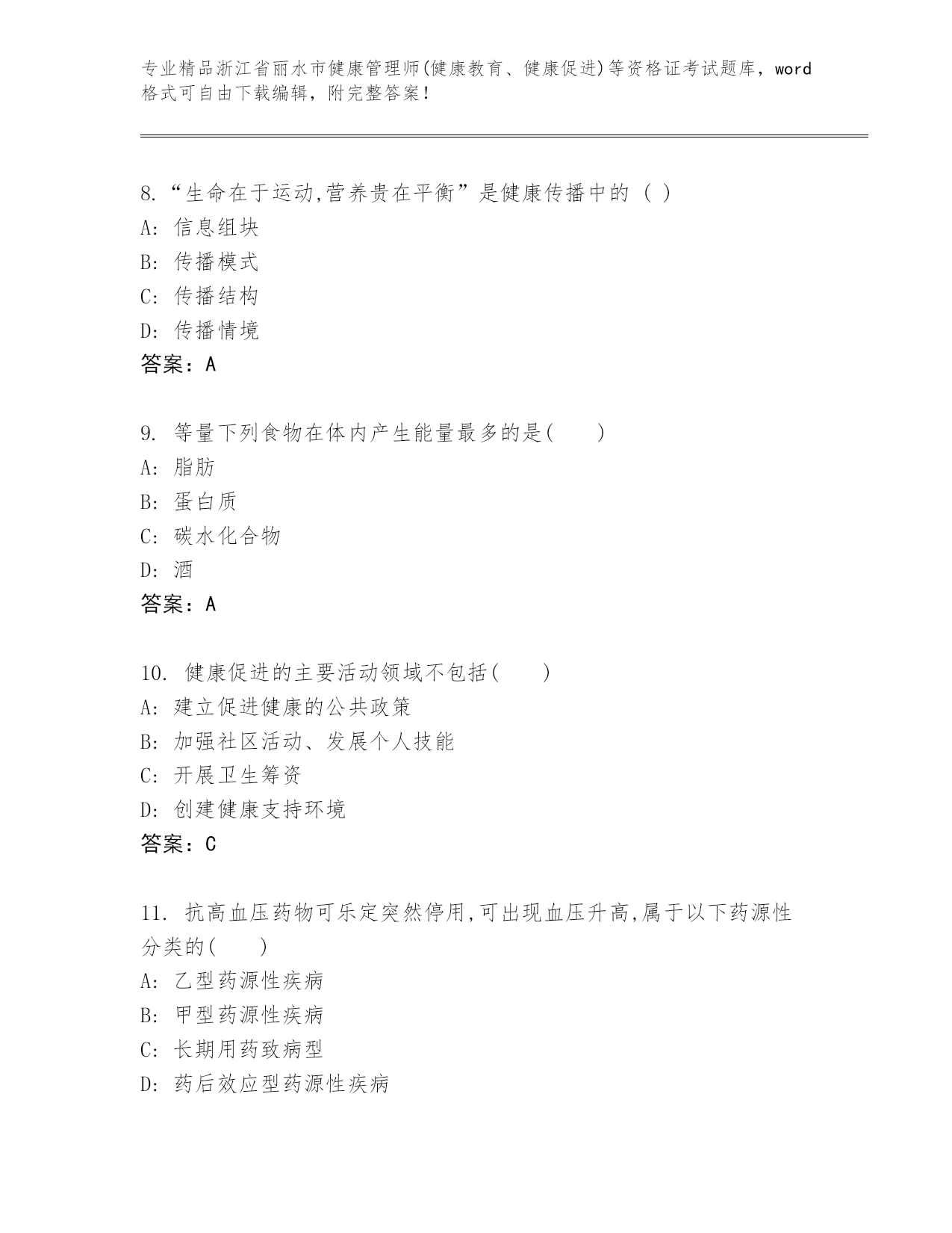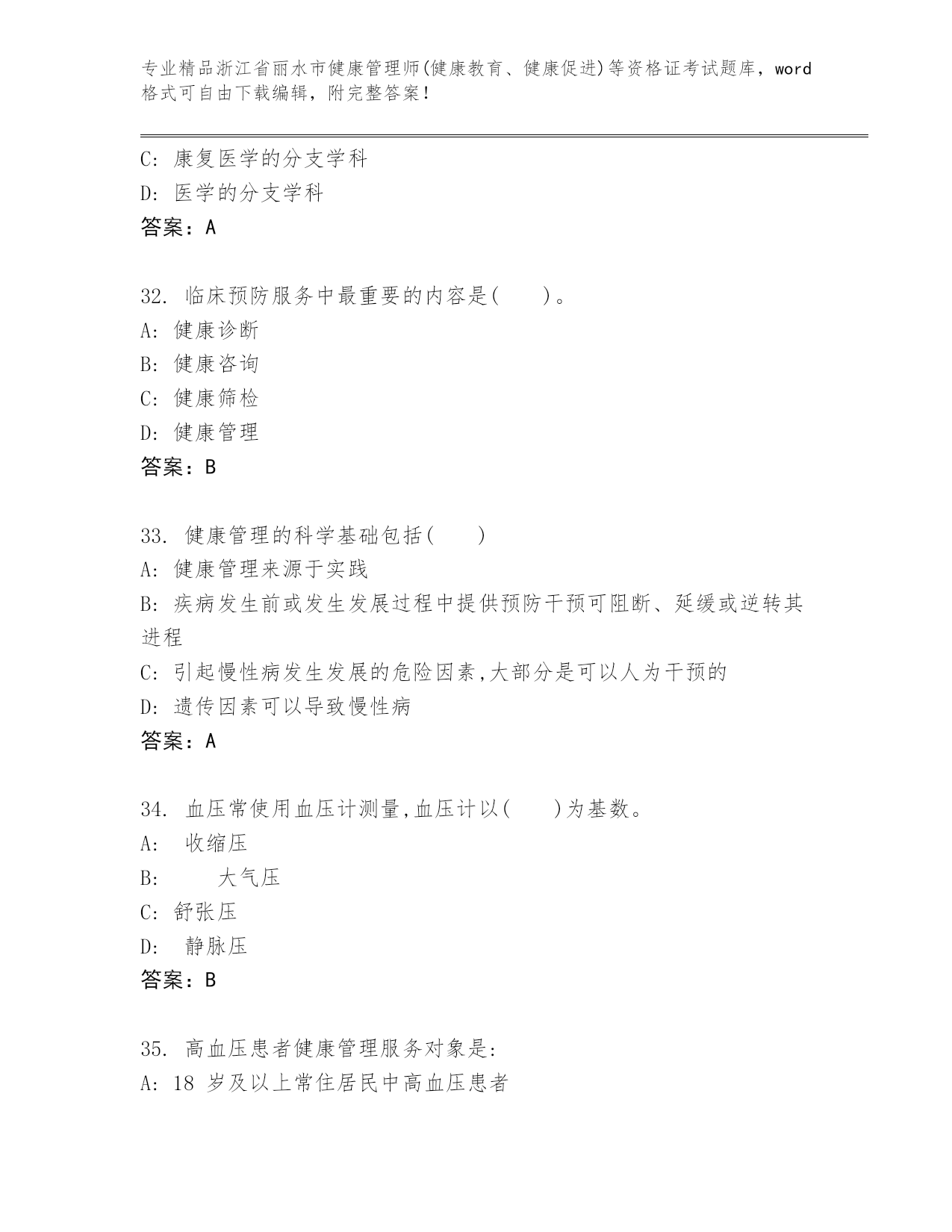 内部培训浙江省丽水市健康管理师(健康教育、健康促进)等资格证考试精品题库精品(历年真题)
