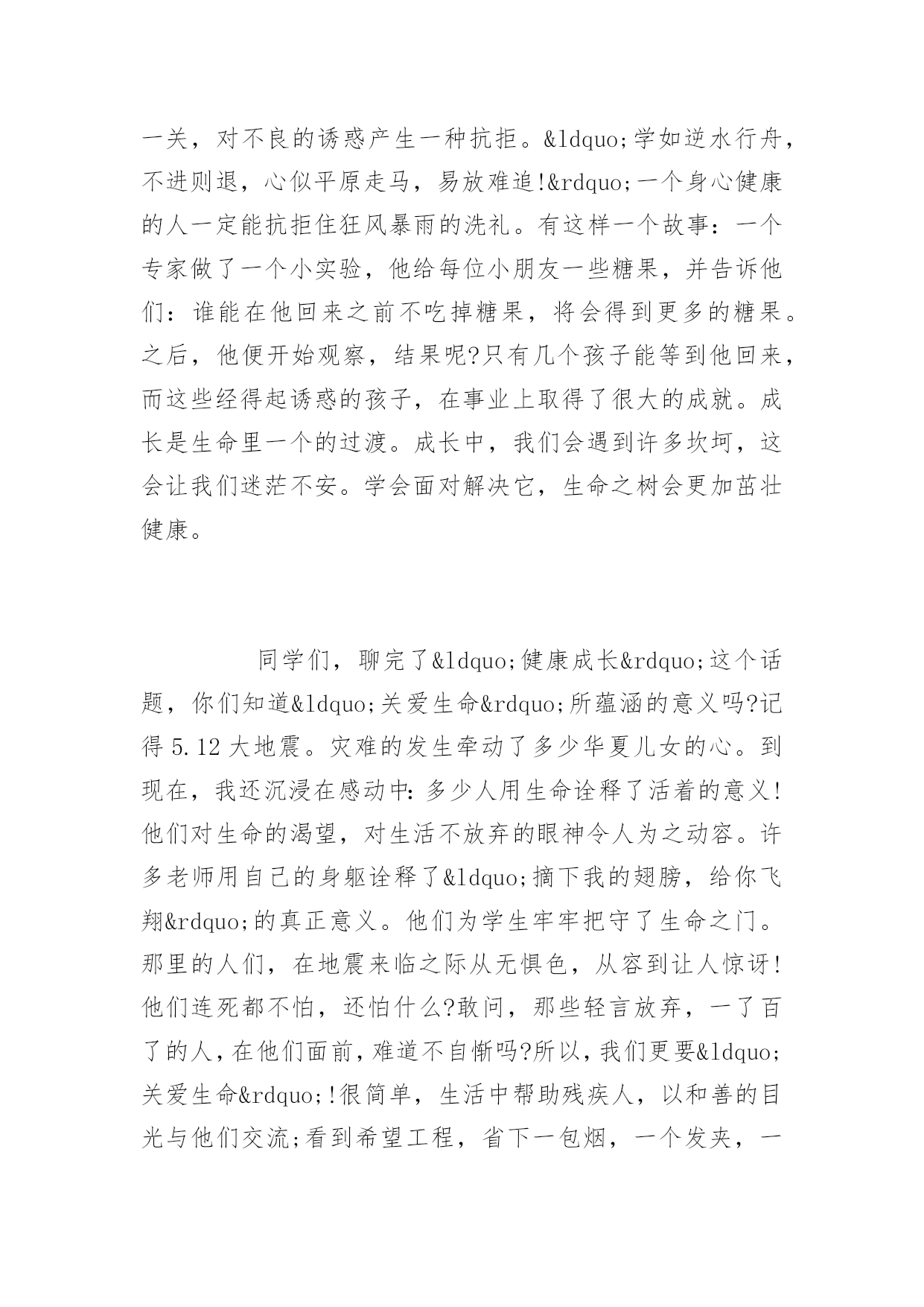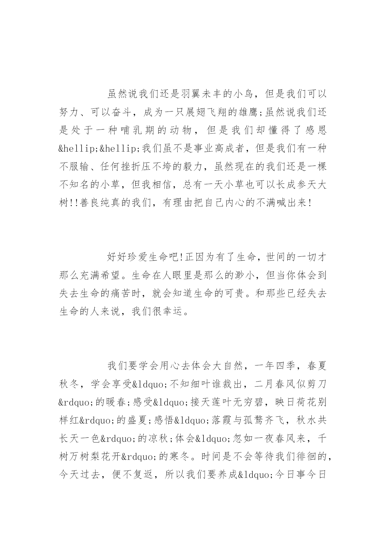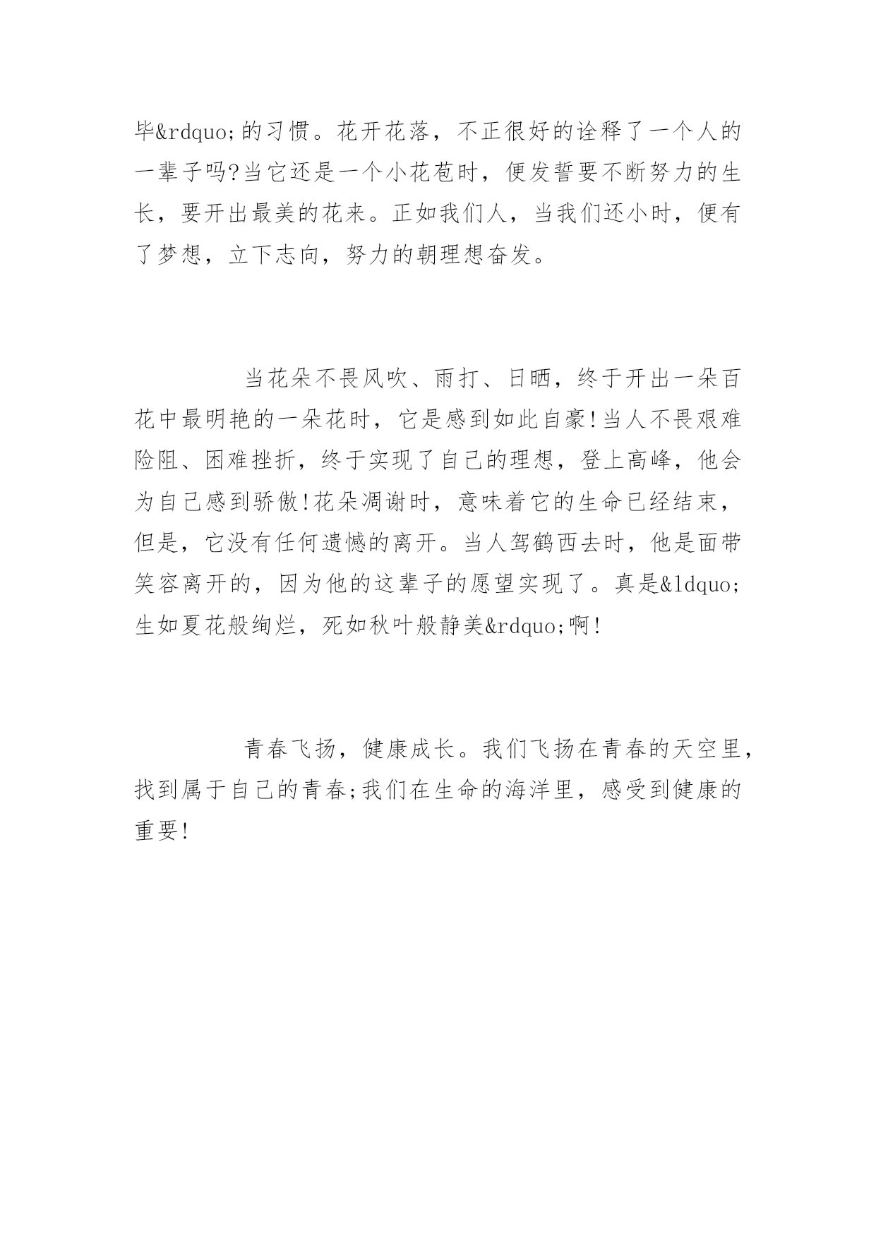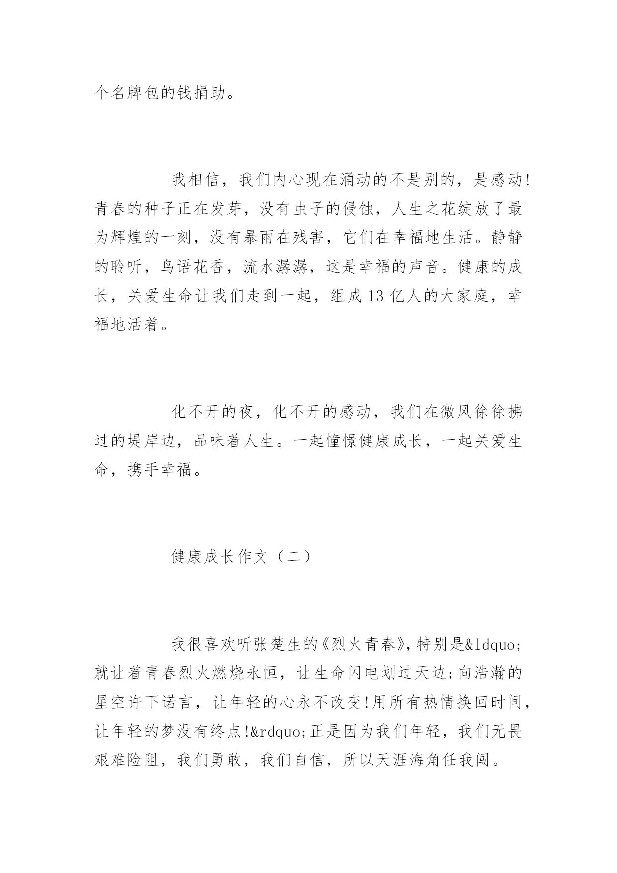健康成长作文健康成长作文(一)阳光和雨露将泥土中的花蕊催发;雏鹰在妈妈的庇佑下振翅翱翔。听见了吗?新生的生命在抽穗拔芽;降生的新生命在咿呀学语……抬头凝视,我成长的天空正愈发晴朗了;低头沉思,我的生命像洗净了一般澄澈。我所经历的春夏秋冬,在父母、老师、他人无言的关爱下,萌发了内心成长的青春之芽。我似曾感觉,令人憧憬的健康成长之旅已经启程。但在我们穿越人生之海中有许多不良诱惑阻挠我们前行,使人迷惑的漩涡,海浪和风暴出现了!只要稍不留神就会陷进去,我们就会被摧垮。所以,我们要学会武装自己,闯过这一关,对不良的诱惑产生一种抗拒。“学如逆水行舟,不进则退,心似平原走马,易放难追!”一个身心健康的人一定能抗拒住狂风暴雨的洗礼。有这样一个故事:一个专家做了一个小实验,他给每位小朋友一些糖果,并告诉他们:谁能在他回来之前不吃掉糖果,将会得到更多的糖果。之后,他便开始观察,结果呢?只有几个孩子能等到他回来,而这些经得起诱惑的孩子,在事业上取得了很大的成就。成长是生命里一个的过渡。成长中,我们会遇到许多坎坷,这会让我们迷茫不安。学会面对解决它,生命之树会更加茁壮健康。同学们,聊完了“健康成长”这个话题,你们知道“关爱生命”所蕴涵的意义吗?记得5.12大地震。灾难的发生牵动了多少华夏儿女的心。到现在,我还沉浸在感动中:多少人用生命诠释了活着的意义!他们对生命的渴望,对生活不放弃的眼神令人为之动容。许多老师用自己的身躯诠释了“摘下我的翅膀,给你飞翔”的真正意义。他们为学生牢牢把守了生命之门。那里的人们,在地震来临之际从无惧色,从容到让人惊讶!他们连死都不怕,还怕什么?敢问,那些轻言放弃,一了百了的人,在他们面前,难道不自惭吗?所以,我们更要“关爱生命”!很简单,生活中帮助残疾人,以和善的目光与他们交流;看到希望工程,省下一包烟,一个发夹,一个名牌包的钱捐助。我相信,我们内心现在涌动的不是别的,是感动!青春的种子正在发芽,没有虫子的侵蚀,人生之花绽放了最为辉煌的一刻,没有暴雨在残害,它们在幸福地生活。静静的聆听,鸟语花香,流水潺潺,这是幸福的声音。健康的成长,关爱生命让我们走到一起,组成13亿人的大家庭,幸福地活着。化不开的夜,化不开的感动,我们在微风徐徐拂过的堤岸边,品味着人生。一起憧憬健康成长,一起关爱生命,携手幸福。健康成长作文(二)我很喜欢听张楚生的《烈火青春》,特别是“就让着青春烈火燃烧永恒,让生命闪电划过天边;向浩瀚的星空许下诺言,让年轻的心永不改变!用所有热情换回时间,让年轻的梦没有终点!”正是因为我们年轻,我们无畏艰难险阻,我们勇敢,我们自信,所以天涯海角任我闯。虽然说我们还是羽翼未丰的小鸟,但是我们可以努力、可以奋斗,成为一只展翅飞翔的雄鹰;虽然说我们还是处于一种哺乳期的动物,但是我们却懂得了感恩……我们虽不是事业高成者,但是我们有一种不服输、任何挫折压不垮的毅力,虽然现在的我们还是一棵不知名的小草,但我相信,总有一天小草也可以长成参天大树!!善良纯真的我们,有理由把自己内心的不满喊出来!好好珍爱生命吧!正因为有了生命,世间的一切才那么充满希望。生命在人眼里是那么的渺小,但当你体会到失去生命的痛苦时,就会知道生命的可贵。和那些已经失去生命的人来说,我们很幸运。我们要学会用心去体会大自然,一年四季,春夏秋冬,学会享受“不知细叶谁裁出,二月春风似剪刀”的暖春;感受“接天莲叶无穷碧,映日荷花别样红”的盛夏;感悟“落霞与孤鹜齐飞,秋水共长天一色”的凉秋;体会“忽如一夜春风来,千树万树梨花开”的寒冬。时间是不会等待我们徘徊的,今天过去,便不复返,所以我们要养成“今日事今日毕”的习惯。花开花落,不正很好的诠释了一个人的一辈子吗?当它还是一个小花苞时,便发誓要不断努力的生长,要开出最美的花来。正如我们人,当我们还小时,便有了梦想,立下志向,努力的朝理想奋发。当花朵不畏风吹、雨打、日晒,终于开出一朵百花中最明艳的一朵花时,它是感到如此自豪!当人不畏艰难险阻、困难挫折,终于实现了自己的理想,登上高峰,他会为自己感到骄傲!花朵凋谢时,意味着它的生命已经结束,但是,它没有任何遗憾的离开。当人驾鹤西去时,他是面带笑容离开的,因为他的这辈子的愿望实现了。真是“生如夏花般绚烂,死如秋叶般静美”啊!青春飞扬,健康成长。我们飞扬在青春的天