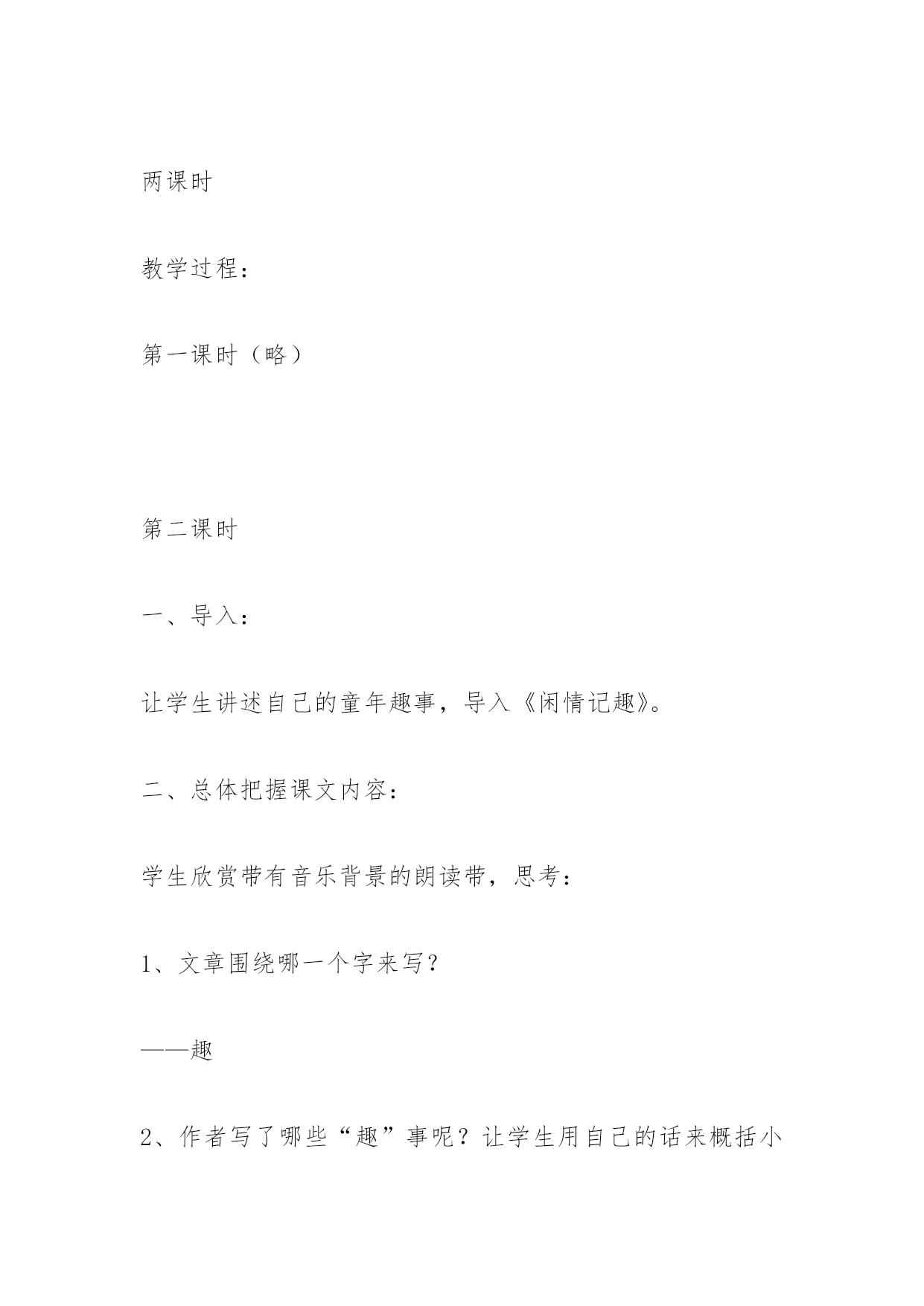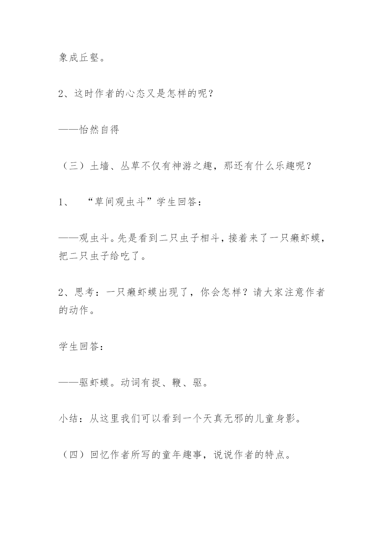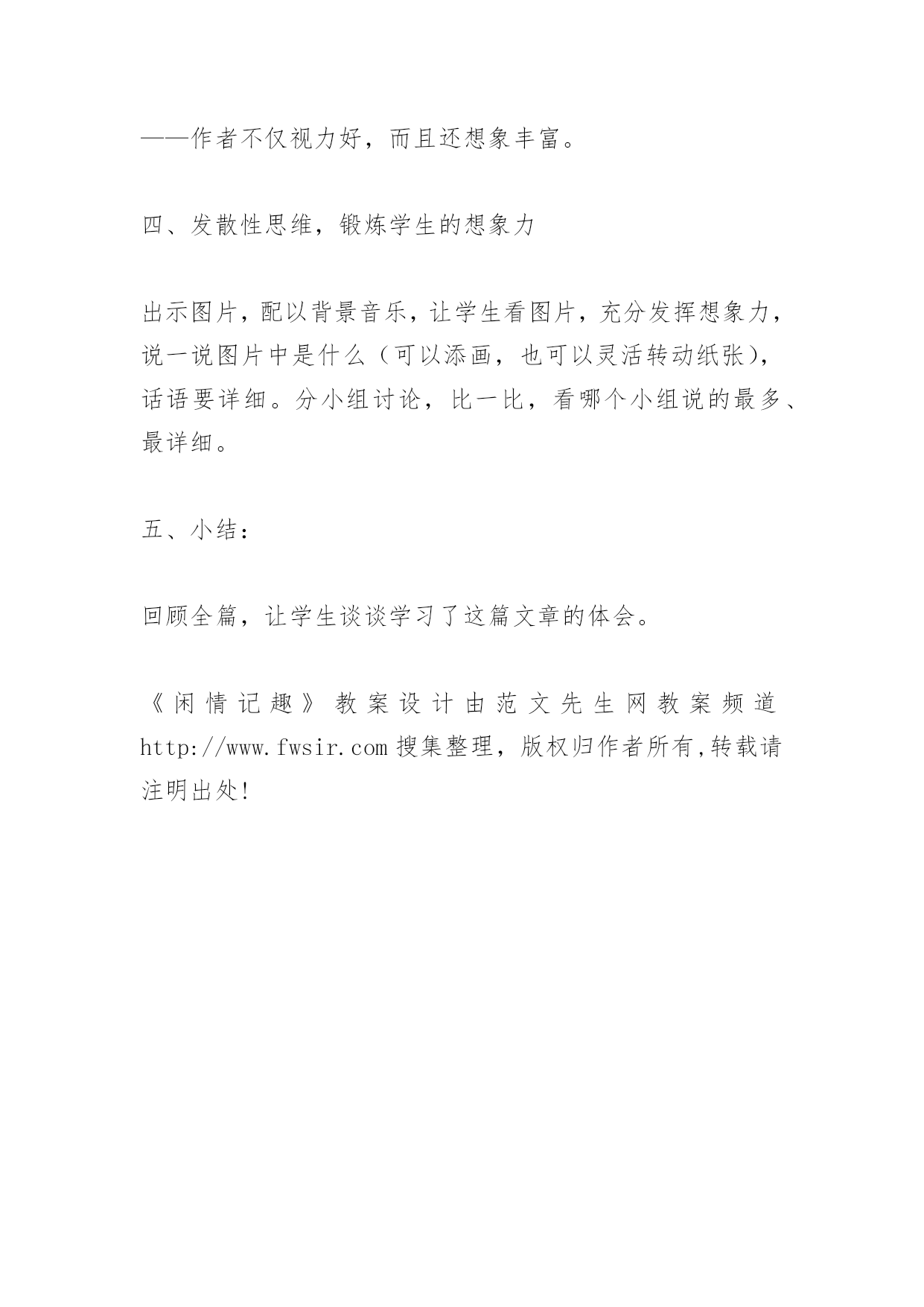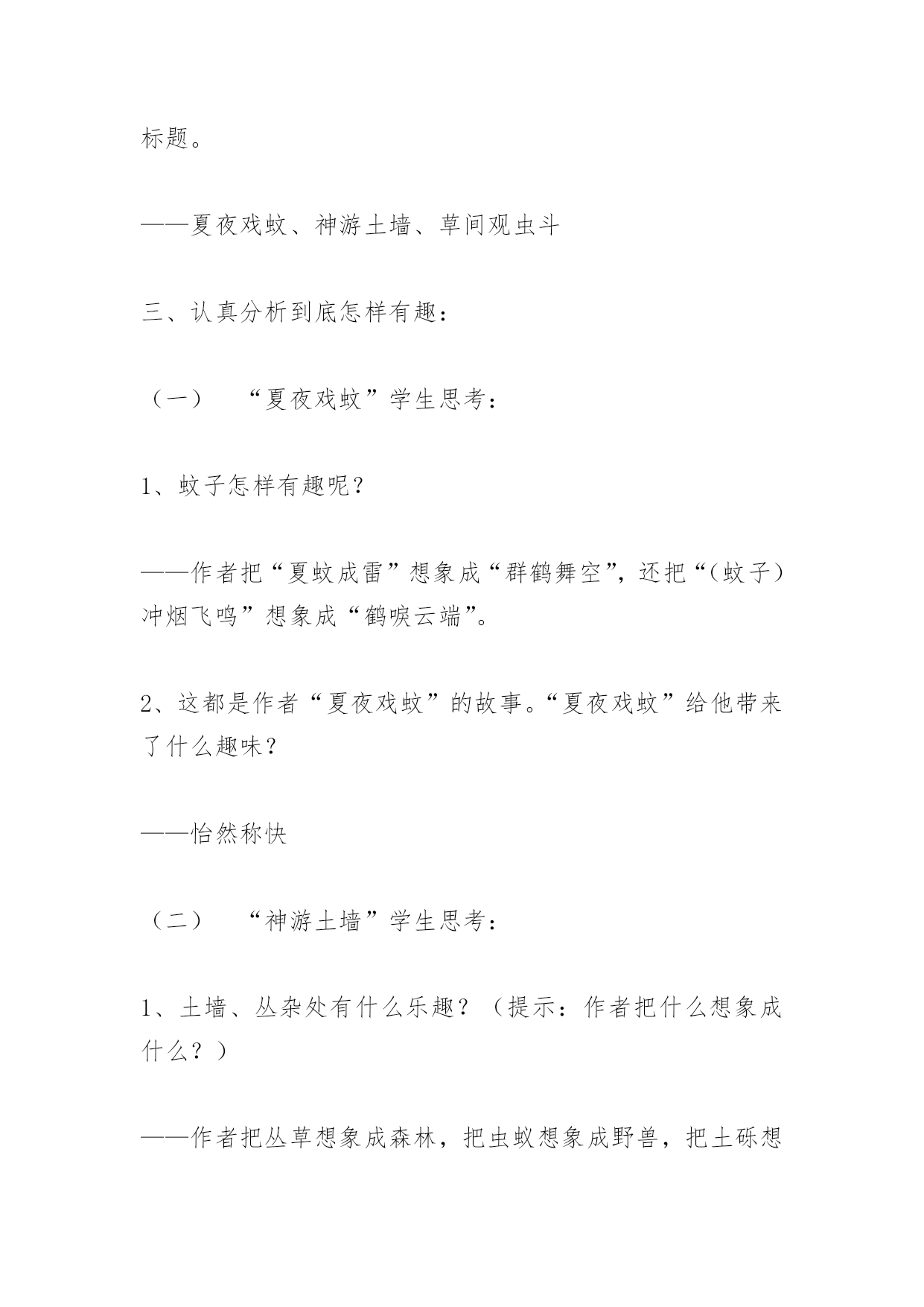 《闲情记趣》设计潜江市王场镇中学熊秀娟教学目标:1、熟读课文,疏通文字,了解文意。2、理解文中的“物外之趣”,学习、发挥创造性想象。教学重点:熟读课文,了解文意。教学难点:对“物外之趣”的体味。教学课时:两课时教学过程:第一课时(略)第二课时一、导入:让学生讲述自己的童年趣事,导入《闲情记趣》。二、总体把握课文内容:学生欣赏带有音乐背景的朗读带,思考:1、文章围绕哪一个字来写?——趣2、作者写了哪些“趣”事呢?让学生用自己的话来概括小标题。——夏夜戏蚊、神游土墙、草间观虫斗三、认真分析到底怎样有趣:(一)“夏夜戏蚊”学生思考:1、蚊子怎样有趣呢?——作者把“夏蚊成雷”想象成“群鹤舞空”,还把“(蚊子)冲烟飞鸣”想象成“鹤唳云端”。2、这都是作者“夏夜戏蚊”的故事。“夏夜戏蚊”给他带来了什么趣味?——怡然称快(二)“神游土墙”学生思考:1、土墙、丛杂处有什么乐趣?(提示:作者把什么想象成什么?)——作者把丛草想象成森林,把虫蚁想象成野兽,把土砾想象成丘壑。2、这时作者的心态又是怎样的呢?——怡然自得(三)土墙、丛草不仅有神游之趣,那还有什么乐趣呢?1、“草间观虫斗”学生回答:——观虫斗。先是看到二只虫子相斗,接着来了一只癞虾蟆,把二只虫子给吃了。2、思考:一只癞虾蟆出现了,你会怎样?请大家注意作者的动作。学生回答:——驱虾蟆。动词有捉、鞭、驱。小结:从这里我们可以看到一个天真无邪的儿童身影。(四)回忆作者所写的童年趣事,说说作者的特点。——作者不仅视力好,而且还想象丰富。四、发散性思维,锻炼学生的想象力出示图片,配以背景音乐,让学生看图片,充分发挥想象力,说一说图片中是什么(可以添画,也可以灵活转动纸张),话语要详细。分小组讨论,比一比,看哪个小组说的最多、最详细。五、小结:回顾全篇,让学生谈谈学习了这篇文章的体会。《闲情记趣》教案设计由范文先生网教案频道http://www.fwsir.com搜集整理,版权归作者所有,转载请注明出处!