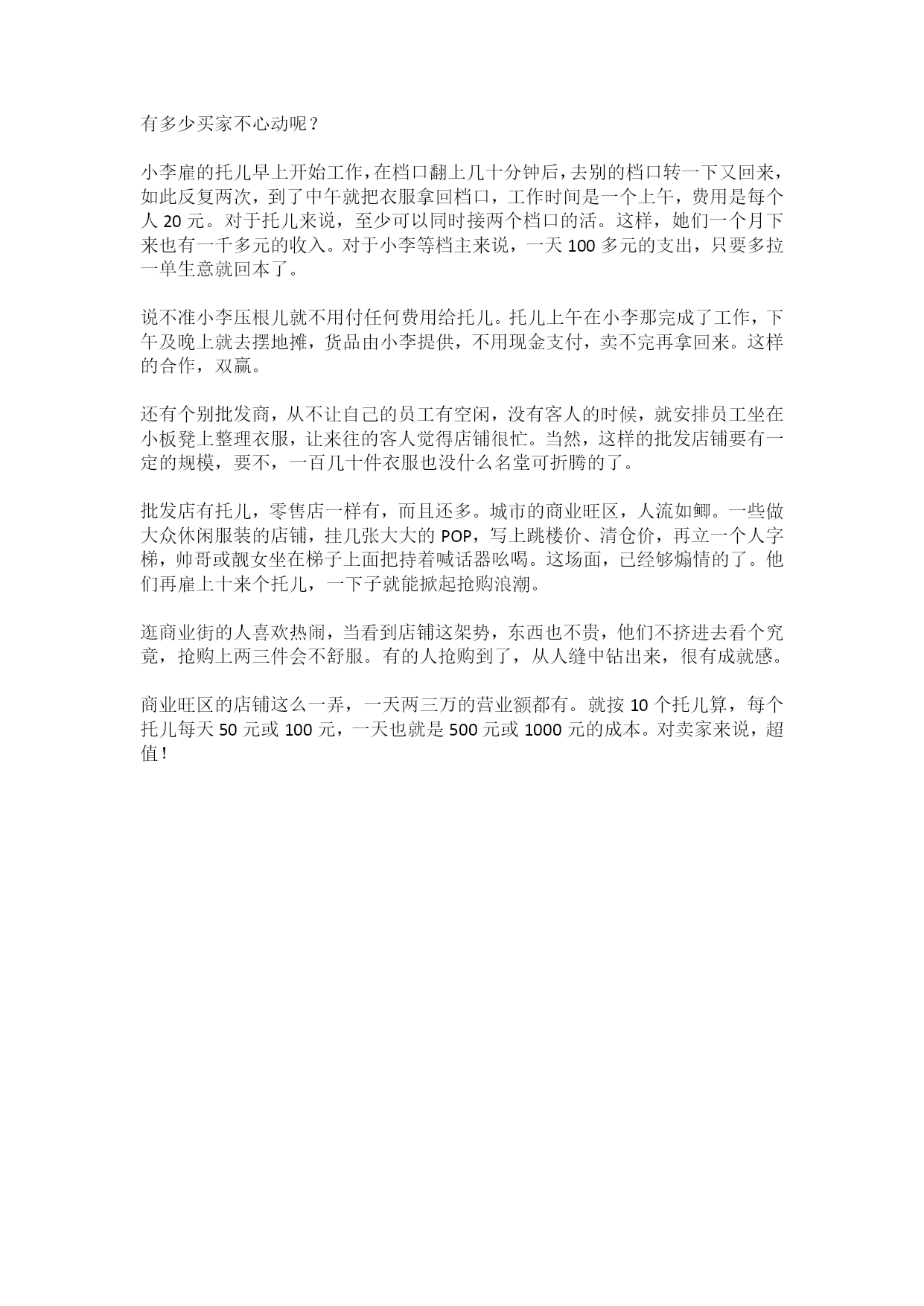 服装经营:实体店刷信誉作者:服装探秘要是去批发市场打货,档主说自己的货全是爆版,买家不会全信,因为那只是档主自己说的。要是档主拿出送货单说今天开单多少,买家也不会相信,因为那也有假的。但是看到一个档口堆放着几个发货的大包,以及有几个人在挑货,又会有多少买家不心动呢?在淘宝店买了衣服,给卖家一个好评,卖家就得到一个信用。信用多的卖家,给买家一种感觉,就是综合实力强,值得信赖。新开的淘宝店,信用从零开始,很难拉得到生意,于是就会想到刷信用。刷信用的店,虽然说是欺骗消费者,给其他店带来不公平的竞争,但确确实实是给自己带来了利益。就算有淘宝网调查后会封店的风险,仍然有不少卖家对刷信用趋之若鹜。淘宝网店刷信用的水平越来越高了,高到淘宝网都没办法查实。最原始的做法是机刷,利用软件自动生成假的IP地址,假的用户名,假的评语,刷信用速度快,但很容易被查出来。接着就是互刷,你刷我的我刷你的,两人互刷,或者是你刷我的我刷他的他刷你的,多角互刷。这种刷法,一查IP地址和用户名,也很容易被查出来。现在,流行的是平台刷,只要花钱,而且按照流程走,没几个月就可以安全地刷到一个皇冠卖家。平台刷具体的操作是,店家向平台交纳保证金,然后在平台发布任务,刷客接受任务,向店家购买商品,并用支付宝付账给店主。平台刷规定刷客不能执行同一个店家两次任务,实物交易必须有一个等待期才能发好评等,同时又有成千上万人参与执行任务,因此安全性接近百分之百。网店刷信用有封店的危险,实体店刷信用则不存在任何风险了。在深圳市海燕服装广场,有一些店门口堆放着几个貌似从国外发货过来的包装箱,橱窗上写着“周一周三周五韩国到货”的字样;在其他批发市场,有的店门口常年堆放着几个大包,上面写着各地的发货地址……这些手法,跟淘宝店刷信用有些异曲同工之处。小李在某市的服装城里有一个批发档口,卖低端的女装,从深圳、广州等地拿货。小李的货品很普通,档口的位置也有点偏,但生意还过得去。因为小李雇了几个大姐,在每天早上做生意的时候,拿着几个黑色大袋子,到她的档口挑衣服。要是去批发市场打货,档主说自己的货全是爆版,买家不会全信,因为那只是档主自己说的。要是档主拿出送货单说今天开单多少,买家也不会相信,因为那也有假的。但是看到一个档口堆放着几个发货的大包,以及有几个人在挑货,又会有多少买家不心动呢?小李雇的托儿早上开始工作,在档口翻上几十分钟后,去别的档口转一下又回来,如此反复两次,到了中午就把衣服拿回档口,工作时间是一个上午,费用是每个人20元。对于托儿来说,至少可以同时接两个档口的活。这样,她们一个月下来也有一千多元的收入。对于小李等档主来说,一天100多元的支出,只要多拉一单生意就回本了。说不准小李压根儿就不用付任何费用给托儿。托儿上午在小李那完成了工作,下午及晚上就去摆地摊,货品由小李提供,不用现金支付,卖不完再拿回来。这样的合作,双赢。还有个别批发商,从不让自己的员工有空闲,没有客人的时候,就安排员工坐在小板凳上整理衣服,让来往的客人觉得店铺很忙。当然,这样的批发店铺要有一定的规模,要不,一百几十件衣服也没什么名堂可折腾的了。批发店有托儿,零售店一样有,而且还多。城市的商业旺区,人流如鲫。一些做大众休闲服装的店铺,挂几张大大的POP,写上跳楼价、清仓价,再立一个人字梯,帅哥或靓女坐在梯子上面把持着喊话器吆喝。这场面,已经够煽情的了。他们再雇上十来个托儿,一下子就能掀起抢购浪潮。逛商业街的人喜欢热闹,当看到店铺这架势,东西也不贵,他们不挤进去看个究竟,抢购上两三件会不舒服。有的人抢购到了,从人缝中钻出来,很有成就感。商业旺区的店铺这么一弄,一天两三万的营业额都有。就按10个托儿算,每个托儿每天50元或100元,一天也就是500元或1000元的成本。对卖家来说,超值!