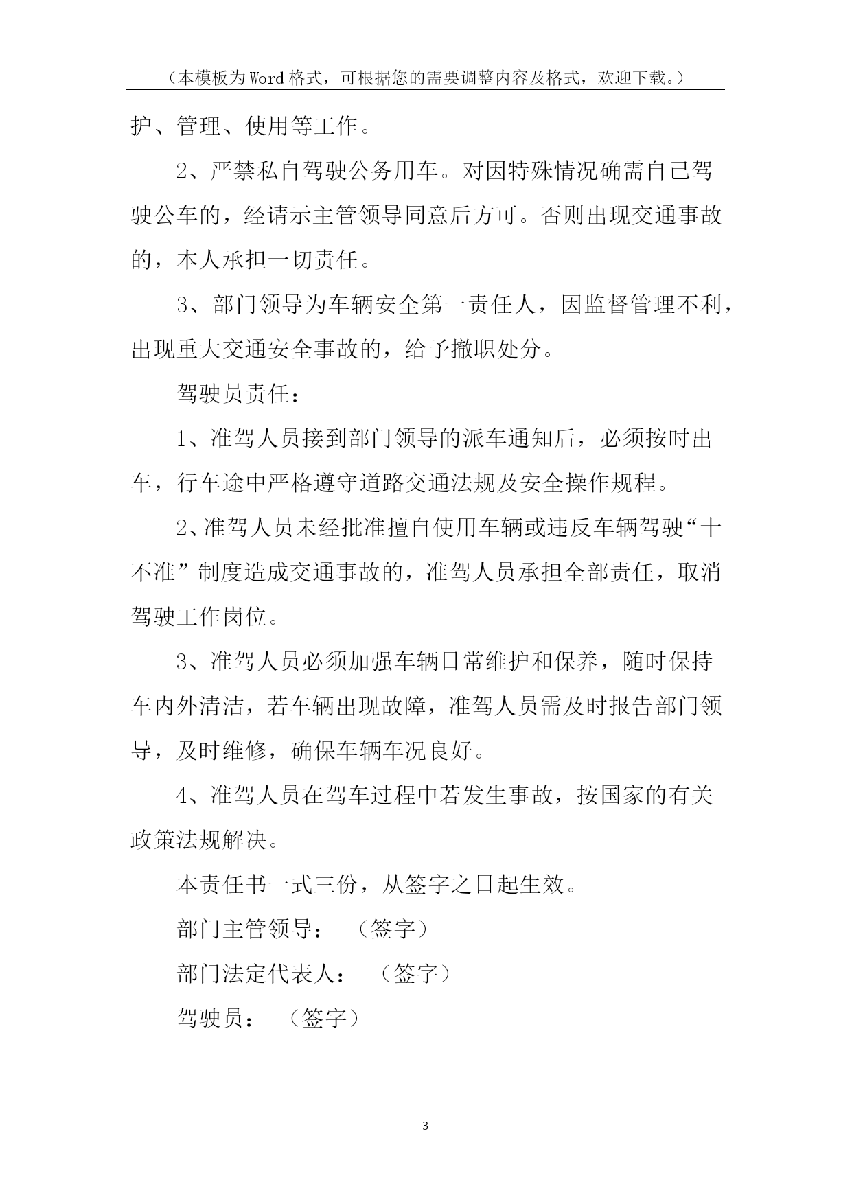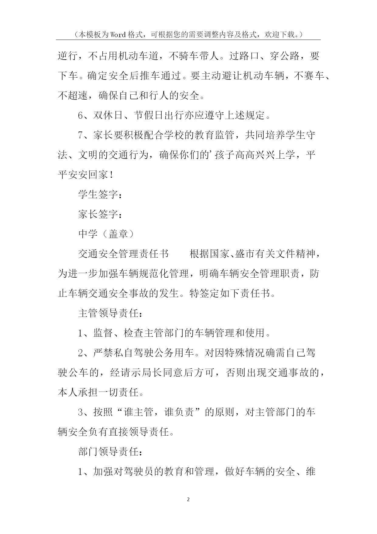 (本模板为Word格式,可根据您的需要调整内容及格式,欢迎下载。)PAGE\*MERGEFORMAT3交通安全管理责任书交通安全管理责任书为进一步加强学生交通安全管理,增强学校、学生和学生家长的交通安全意识,保证学生上学放学的路途安全,依据道路交通法规,特制定学生道路交通规则,并与家长签订安全责任书。1、学生上、放学时间:早上7:50到校,11:50放学;下午春秋冬季13:50到校,17:30放学;夏季14:00到校,17:40分放学。希望家长掌握好上、放学时间,防止孩子过早出门和过晚回家。2、学生骑车或步行上学放学的同学一律靠道路右边,需要横穿马路的,必须按信号灯或从斑马线穿过,不得在公路上玩耍、嬉戏、追逐等。3、接送学生的家长不得进入校园,使用的允许上路的各种交通工具必须停靠在大门主体道两边,不得挤占主体道和堵在校门口。4、上学放学乘车的同学要求一律坐公交车,下车时一定要看清前后左右,在确定无车辆通过时快速穿过公路。放学乘车的学生要站在公路边以外等候,排队上车。5、骑自行车的学生一定要遵守交通法规,不抢行、不逆行,不占用机动车道,不骑车带人。过路口、穿公路,要下车。确定安全后推车通过。要主动避让机动车辆,不赛车、不超速,确保自己和行人的安全。6、双休日、节假日出行亦应遵守上述规定。7、家长要积极配合学校的教育监管,共同培养学生守法、文明的交通行为,确保你们的'孩子高高兴兴上学,平平安安回家!学生签字:家长签字:中学(盖章)交通安全管理责任书根据国家、盛市有关文件精神,为进一步加强车辆规范化管理,明确车辆安全管理职责,防止车辆交通安全事故的发生。特签定如下责任书。主管领导责任:1、监督、检查主管部门的车辆管理和使用。2、严禁私自驾驶公务用车。对因特殊情况确需自己驾驶公车的,经请示局长同意后方可,否则出现交通事故的,本人承担一切责任。3、按照“谁主管,谁负责”的原则,对主管部门的车辆安全负有直接领导责任。部门领导责任:1、加强对驾驶员的教育和管理,做好车辆的安全、维护、管理、使用等工作。2、严禁私自驾驶公务用车。对因特殊情况确需自己驾驶公车的,经请示主管领导同意后方可。否则出现交通事故的,本人承担一切责任。3、部门领导为车辆安全第一责任人,因监督管理不利,出现重大交通安全事故的,给予撤职处分。驾驶员责任:1、准驾人员接到部门领导的派车通知后,必须按时出车,行车途中严格遵守道路交通法规及安全操作规程。2、准驾人员未经批准擅自使用车辆或违反车辆驾驶“十不准”制度造成交通事故的,准驾人员承担全部责任,取消驾驶工作岗位。3、准驾人员必须加强车辆日常维护和保养,随时保持车内外清洁,若车辆出现故障,准驾人员需及时报告部门领导,及时维修,确保车辆车况良好。4、准驾人员在驾车过程中若发生事故,按国家的有关政策法规解决。本责任书一式三份,从签字之日起生效。部门主管领导:(签字)部门法定代表人:(签字)驾驶员:(签字)