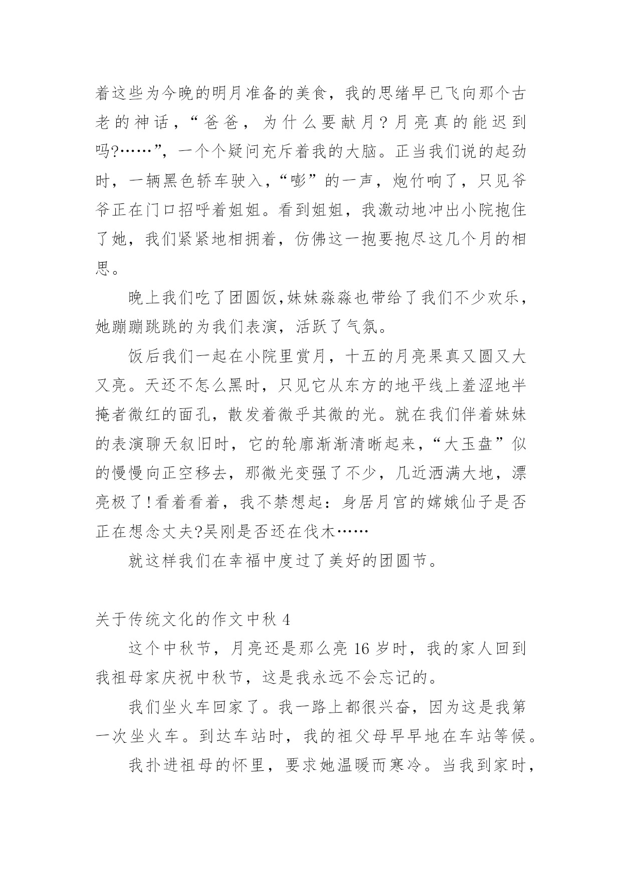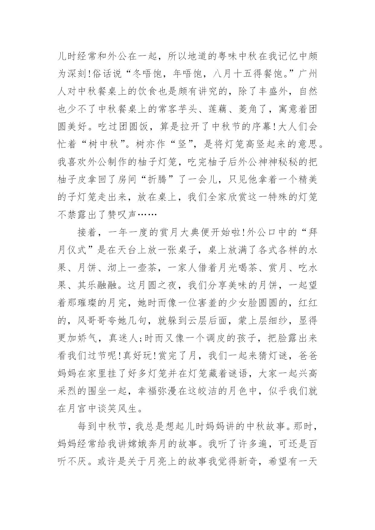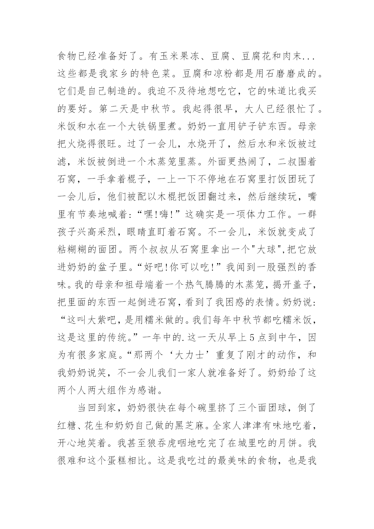 传统文化的作文中秋关于传统文化的作文中秋在日常学习、工作或生活中,大家都经常看到作文的身影吧,作文要求篇章结构完整,一定要避免无结尾作文的出现。怎么写作文才能避免踩雷呢?以下是小编整理的关于传统文化的作文中秋,欢迎大家分享。关于传统文化的作文中秋1今年的中秋节刚刚过去两三天,但也没有什么大事,甚至天公都不作美,一连刮了两天台风,月亮都没有露面,只是偶尔从云缝中漏出一些朦胧的月光来。我们家照样在阳台上点上香烛,摆好瓜果、月饼、毛豆等。那蜡烛的火苗被风吹得“扑扑”跳着,却一直没有灭,待蜡烛烧得差不多了,便在供桌前拜几拜,每人吃个月饼,就算过完了,睡觉去了。至于那些瓜果菜品,是留着的,能吃好几天。这对我兴许是好事,因为我最爱吃的就是毛豆汤了。我们过中秋虽不庄重,也是挺快乐的,大家一起“嘎讪胡”(上海话“聊天”),光是奶奶一个人就能说上许多,都是生活琐事,却有风趣。月亮出来时,我们也是赏赏月,若是又亮又圆又大的月亮,爸爸一定会搬出三角架,咔嚓咔嚓地拍上一阵,妈妈和我便谈关于月亮的故事,奶奶也兴致勃勃地指给我看:“妹妹,那个影子是桂花树,这个小的是嫦娥,那小点儿是那玉兔儿……”。可我怎么看,也看不出个所以然,只是几团黑影罢了。我不由好笑又好气地想:奶奶眼神那么差,怎么能看得出来,多半也是听老一辈说的吧。头天月亮,奶奶大概也就知道这些了,那些嫦娥奔月的故事、牛郎织女的神话,我都是从书上看来的。我自己关于月亮的趣事,也只记得一个了,七八岁的时候,中秋晚上,我和爸爸妈妈去商场回来。路上,我坐在车里对着窗外一排排的路灯,夜空中一片片的轻云发呆。一会儿,月亮出来了,就像一个害羞的小姑娘似的,云朵慢慢移开了,可月亮还朦朦胧胧的,像罩着一层薄雾一样。我看着看着,突然脱口而出:“那是嫦娥在洗澡吧!她怕羞,就躲到云做的浴帘里,洗完了,拉开浴帘,月亮上全是水雾了,所以我们看不清。”爸爸妈妈听了,也抬头看看月亮,然后笑起来,笑得前仰后合。“太有趣了,真有想像力!”“被你这么一说,我还真觉得挺像的呢!”爸爸妈妈都说。我也笑了起来,明朗的笑声充满了整个车箱,不知不觉中我们已到家了。不知不觉中一年年的中秋过去了,一家人在一起团圆的欢乐却永远在我心中。关于传统文化的作文中秋2“海上生明月,天涯共此时。”中秋节是我国的传统佳节,与春节、端午节、清明节并称为中国传统四大节日。“万里清光不可思,中秋赏月正当时。”每年中秋,阖家团圆齐聚一堂品饼赏月,共赏良辰美景!说起我们广东中秋习俗那真是别具一格,满满的仪式感!儿时经常和外公在一起,所以地道的粤味中秋在我记忆中颇为深刻!俗话说“冬唔饱,年唔饱,八月十五得餐饱。”广州人对中秋餐桌上的饮食也是颇有讲究的,除了丰盛外,自然也少不了中秋餐桌上的常客芋头、莲藕、菱角了,寓意着团圆美好。吃过团圆饭,算是拉开了中秋节的序幕!大人们会忙着“树中秋”。树亦作“竖”,是将灯笼高竖起来的意思。我喜欢外公制作的柚子灯笼,吃完柚子后外公神神秘秘的把柚子皮拿回了房间“折腾”了一会儿,只见他拿着一个精美的子灯笼走出来,放在桌上,我们全家欣赏这一特殊的灯笼不禁露出了赞叹声……接着,一年一度的赏月大典便开始啦!外公口中的“拜月仪式”是在天台上放一张桌子,桌上放满了各式各样的水果、月饼、沏上一壶茶,一家人借着月光喝茶、赏月、吃水果、其乐融融。这月圆之夜,我们分享美味的月饼,一起望着那璀璨的月完,她时而像一位害羞的少女脸圆圆的,红红的,风哥哥夸她几句,就躲到云层后面,蒙上层细纱,显得更加娇气,真迷人;时而又像一个调皮的孩子,把脸露出来看我们过节呢!真好玩!赏完了月,我们一起来猜灯谜,爸爸妈妈在家里挂了好多灯笼并在灯笼藏着谜语,大家一起兴高采烈的围坐一起,幸福弥漫在这皎洁的月色中,似乎我们就在月宫中谈笑风生。每到中秋节,我总是想起儿时妈妈讲的中秋故事。那时,妈妈经常给我讲嫦娥奔月的故事。我听了许多遍,可还是百听不厌。或许是关于月亮上的故事我觉得新奇,希望有一天我也能飞上天去,飞到月宫中与嫦娥一起玩,一起看星星。“但愿人长久,千里共婵娟”,中秋节在古代被又称为“团圆节”,花好月圆庆团圆。每年的中秋,一家人在一起总有说不完的故事、聊不完的话题!让这“粤”味中秋又多了一份幸福的味道!关于传统文化的作文中秋3“海上生明月,天涯共此时”,就算相隔天涯也能共同赏月。中秋节,一个幸福、快乐的节日,它使我与两地的亲人在一天里团聚了。太姥姥家在铜川镇。刚到十一点,我就迫不及待地出发了,一想到能见小姨,我兴奋得不得了。下车却不见小姨身影,询问才知,学校只放一天假,不准出校园,心里莫名的有些失落。房子里传出一阵阵香味,老姨正在那里娴熟地撒料、炖肉。炕上坐着许多的亲人,吃着香甜可口的水果,聊着天。这其乐融融的气氛真令人欢喜。太姥姥已年过八十,身体有不舒适是常有的,可今天看起来却神清
