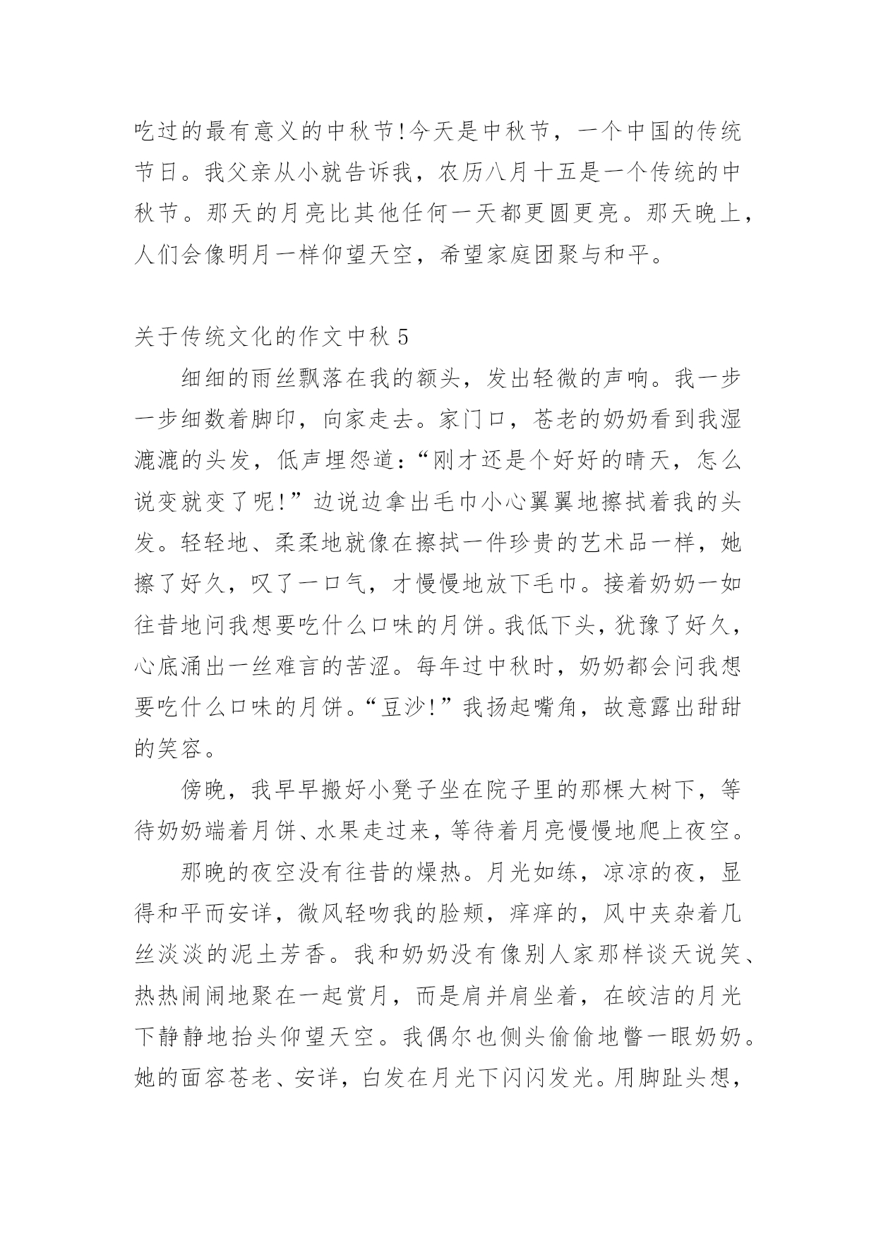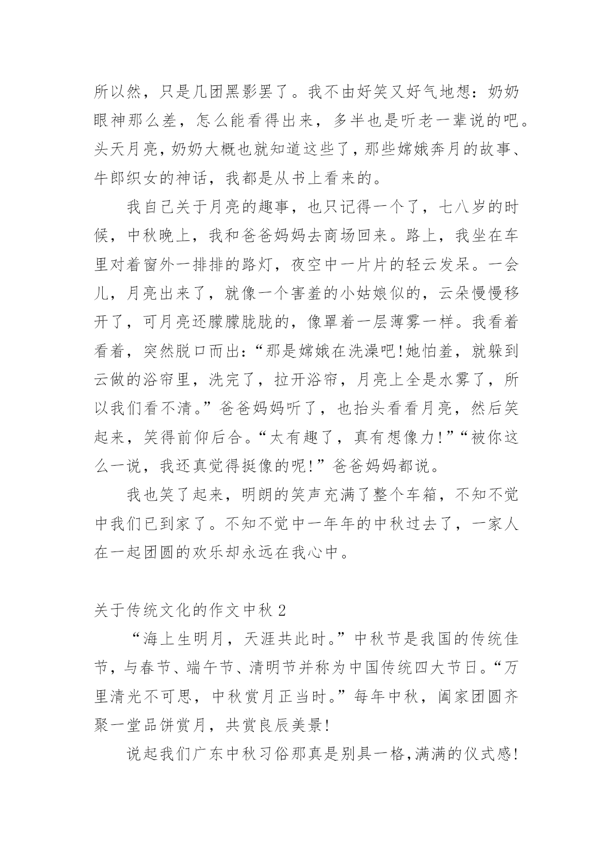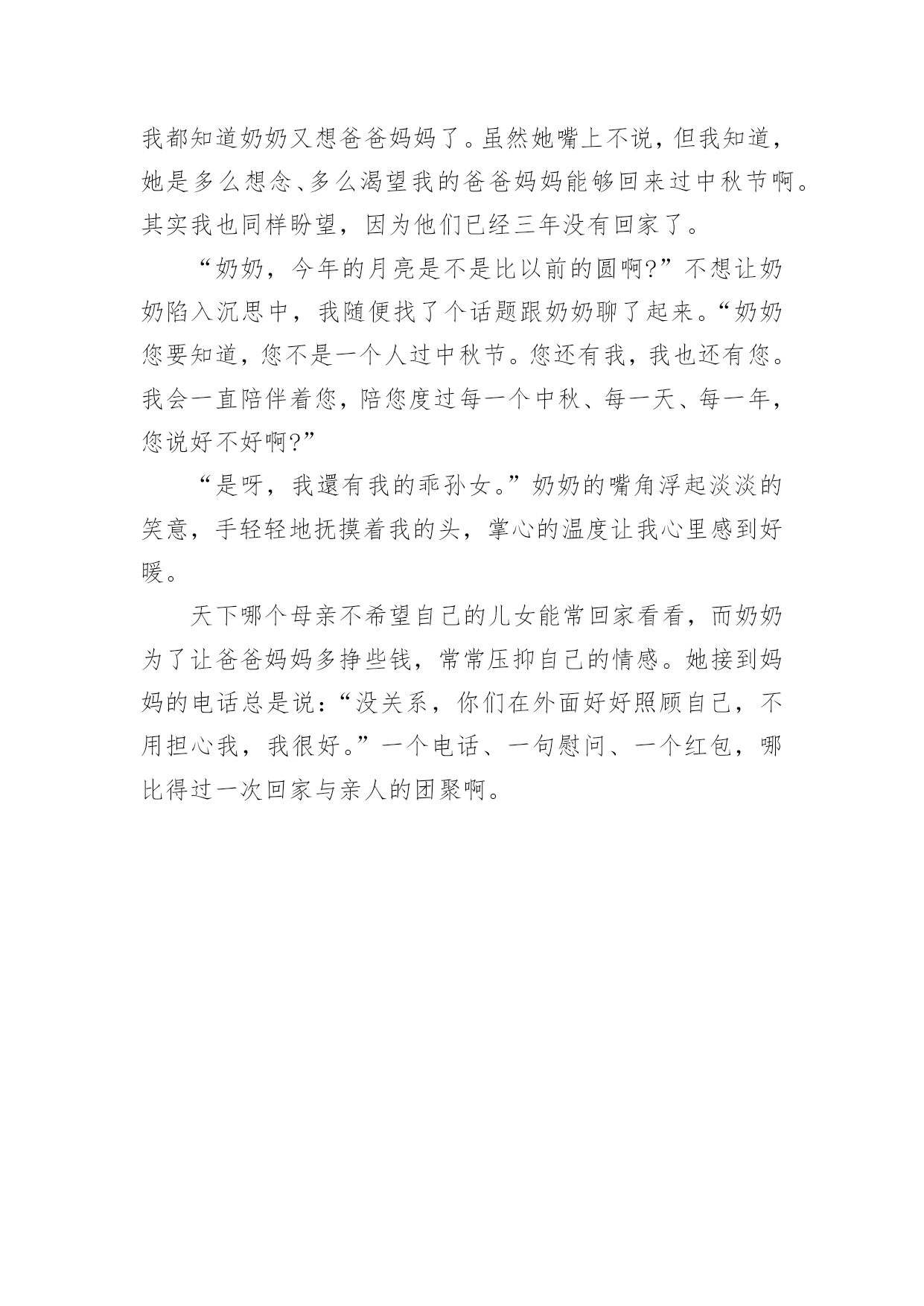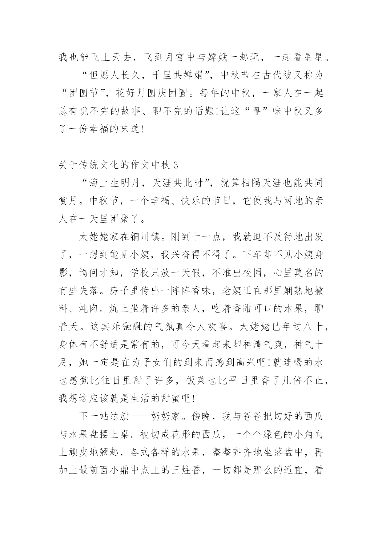 传统文化的作文中秋关于传统文化的作文中秋在日常学习、工作或生活中,大家都经常看到作文的身影吧,作文要求篇章结构完整,一定要避免无结尾作文的出现。怎么写作文才能避免踩雷呢?以下是小编整理的关于传统文化的作文中秋,欢迎大家分享。关于传统文化的作文中秋1今年的中秋节刚刚过去两三天,但也没有什么大事,甚至天公都不作美,一连刮了两天台风,月亮都没有露面,只是偶尔从云缝中漏出一些朦胧的月光来。我们家照样在阳台上点上香烛,摆好瓜果、月饼、毛豆等。那蜡烛的火苗被风吹得“扑扑”跳着,却一直没有灭,待蜡烛烧得差不多了,便在供桌前拜几拜,每人吃个月饼,就算过完了,睡觉去了。至于那些瓜果菜品,是留着的,能吃好几天。这对我兴许是好事,因为我最爱吃的就是毛豆汤了。我们过中秋虽不庄重,也是挺快乐的,大家一起“嘎讪胡”(上海话“聊天”),光是奶奶一个人就能说上许多,都是生活琐事,却有风趣。月亮出来时,我们也是赏赏月,若是又亮又圆又大的月亮,爸爸一定会搬出三角架,咔嚓咔嚓地拍上一阵,妈妈和我便谈关于月亮的故事,奶奶也兴致勃勃地指给我看:“妹妹,那个影子是桂花树,这个小的是嫦娥,那小点儿是那玉兔儿……”。可我怎么看,也看不出个所以然,只是几团黑影罢了。我不由好笑又好气地想:奶奶眼神那么差,怎么能看得出来,多半也是听老一辈说的吧。头天月亮,奶奶大概也就知道这些了,那些嫦娥奔月的故事、牛郎织女的神话,我都是从书上看来的。我自己关于月亮的趣事,也只记得一个了,七八岁的时候,中秋晚上,我和爸爸妈妈去商场回来。路上,我坐在车里对着窗外一排排的路灯,夜空中一片片的轻云发呆。一会儿,月亮出来了,就像一个害羞的小姑娘似的,云朵慢慢移开了,可月亮还朦朦胧胧的,像罩着一层薄雾一样。我看着看着,突然脱口而出:“那是嫦娥在洗澡吧!她怕羞,就躲到云做的浴帘里,洗完了,拉开浴帘,月亮上全是水雾了,所以我们看不清。”爸爸妈妈听了,也抬头看看月亮,然后笑起来,笑得前仰后合。“太有趣了,真有想像力!”“被你这么一说,我还真觉得挺像的呢!”爸爸妈妈都说。我也笑了起来,明朗的笑声充满了整个车箱,不知不觉中我们已到家了。不知不觉中一年年的中秋过去了,一家人在一起团圆的欢乐却永远在我心中。关于传统文化的作文中秋2“海上生明月,天涯共此时。”中秋节是我国的传统佳节,与春节、端午节、清明节并称为中国传统四大节日。“万里清光不可思,中秋赏月正当时。”每年中秋,阖家团圆齐聚一堂品饼赏月,共赏良辰美景!说起我们广东中秋习俗那真是别具一格,满满的仪式感!儿时经常和外公在一起,所以地道的粤味中秋在我记忆中颇为深刻!俗话说“冬唔饱,年唔饱,八月十五得餐饱。”广州人对中秋餐桌上的饮食也是颇有讲究的,除了丰盛外,自然也少不了中秋餐桌上的常客芋头、莲藕、菱角了,寓意着团圆美好。吃过团圆饭,算是拉开了中秋节的序幕!大人们会忙着“树中秋”。树亦作“竖”,是将灯笼高竖起来的意思。我喜欢外公制作的柚子灯笼,吃完柚子后外公神神秘秘的把柚子皮拿回了房间“折腾”了一会儿,只见他拿着一个精美的子灯笼走出来,放在桌上,我们全家欣赏这一特殊的灯笼不禁露出了赞叹声……接着,一年一度的赏月大典便开始啦!外公口中的“拜月仪式”是在天台上放一张桌子,桌上放满了各式各样的水果、月饼、沏上一壶茶,一家人借着月光喝茶、赏月、吃水果、其乐融融。这月圆之夜,我们分享美味的月饼,一起望着那璀璨的月完,她时而像一位害羞的少女脸圆圆的,红红的,风哥哥夸她几句,就躲到云层后面,蒙上层细纱,显得更加娇气,真迷人;时而又像一个调皮的孩子,把脸露出来看我们过节呢!真好玩!赏完了月,我们一起来猜灯谜,爸爸妈妈在家里挂了好多灯笼并在灯笼藏着谜语,大家一起兴高采烈的围坐一起,幸福弥漫在这皎洁的月色中,似乎我们就在月宫中谈笑风生。每到中秋节,我总是想起儿时妈妈讲的中秋故事。那时,妈妈经常给我讲嫦娥奔月的故事。我听了许多遍,可还是百听不厌。或许是关于月亮上的故事我觉得新奇,希望有一天我也能飞上天去,飞到月宫中与嫦娥一起玩,一起看星星。“但愿人长久,千里共婵娟”,中秋节在古代被又称为“团圆节”,花好月圆庆团圆。每年的中秋,一家人在一起总有说不完的故事、聊不完的话题!让这“粤”味中秋又多了一份幸福的味道!关于传统文化的作文中秋3“海上生明月,天涯共此时”,就算相隔天涯也能共同赏月。中秋节,一个幸福、快乐的节日,它使我与两地的亲人在一天里团聚了。太姥姥家在铜川镇。刚到十一点,我就迫不及待地出发了,一想到能见小姨,我兴奋得不得了。下车却不见小姨身影,询问才知,学校只放一天假,不准出校园,心里莫名的有些失落。房子里传出一阵阵香味,老姨正在那里娴熟地撒料、炖肉。炕上坐着许多的亲人,吃着香甜可口的水果,聊着天。这其乐融融的气氛真令人欢喜。太姥姥已年过八十,身体有不舒适是常有的,可今天看起来却神清