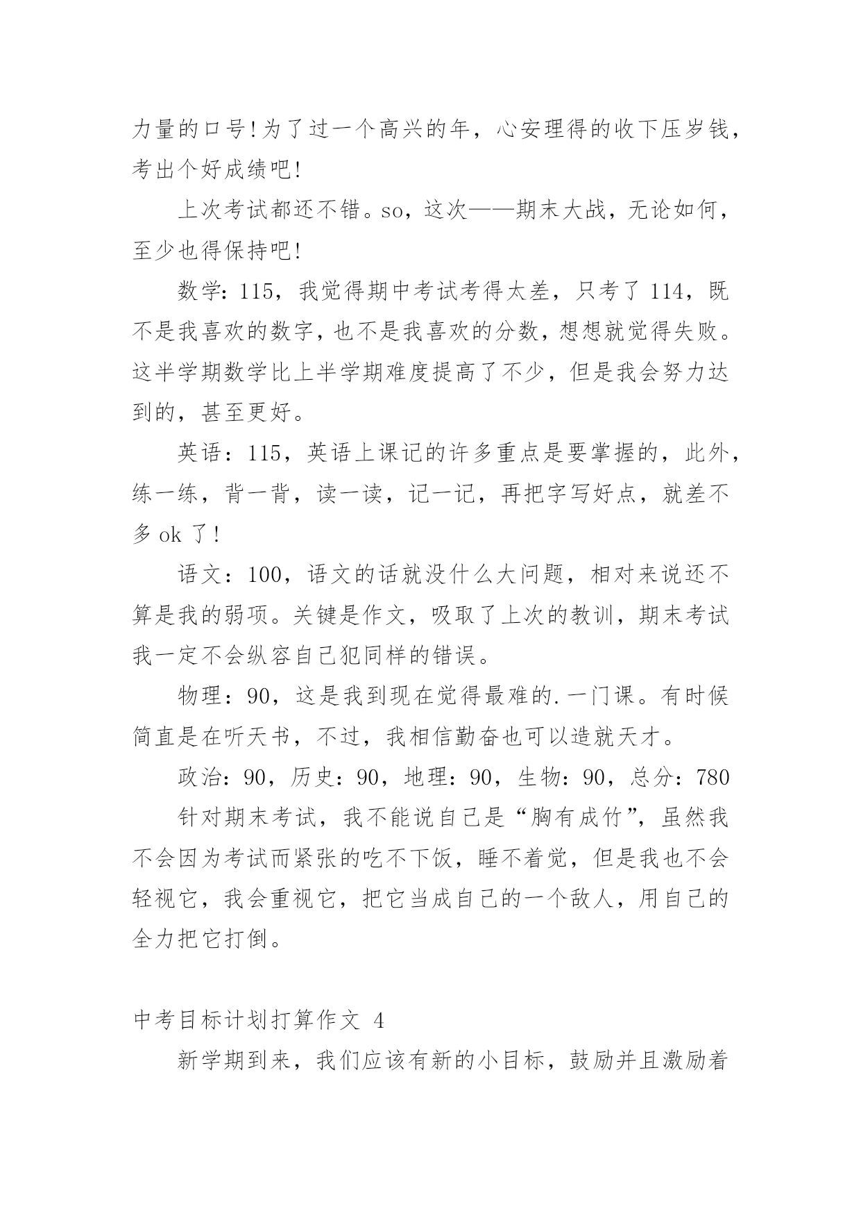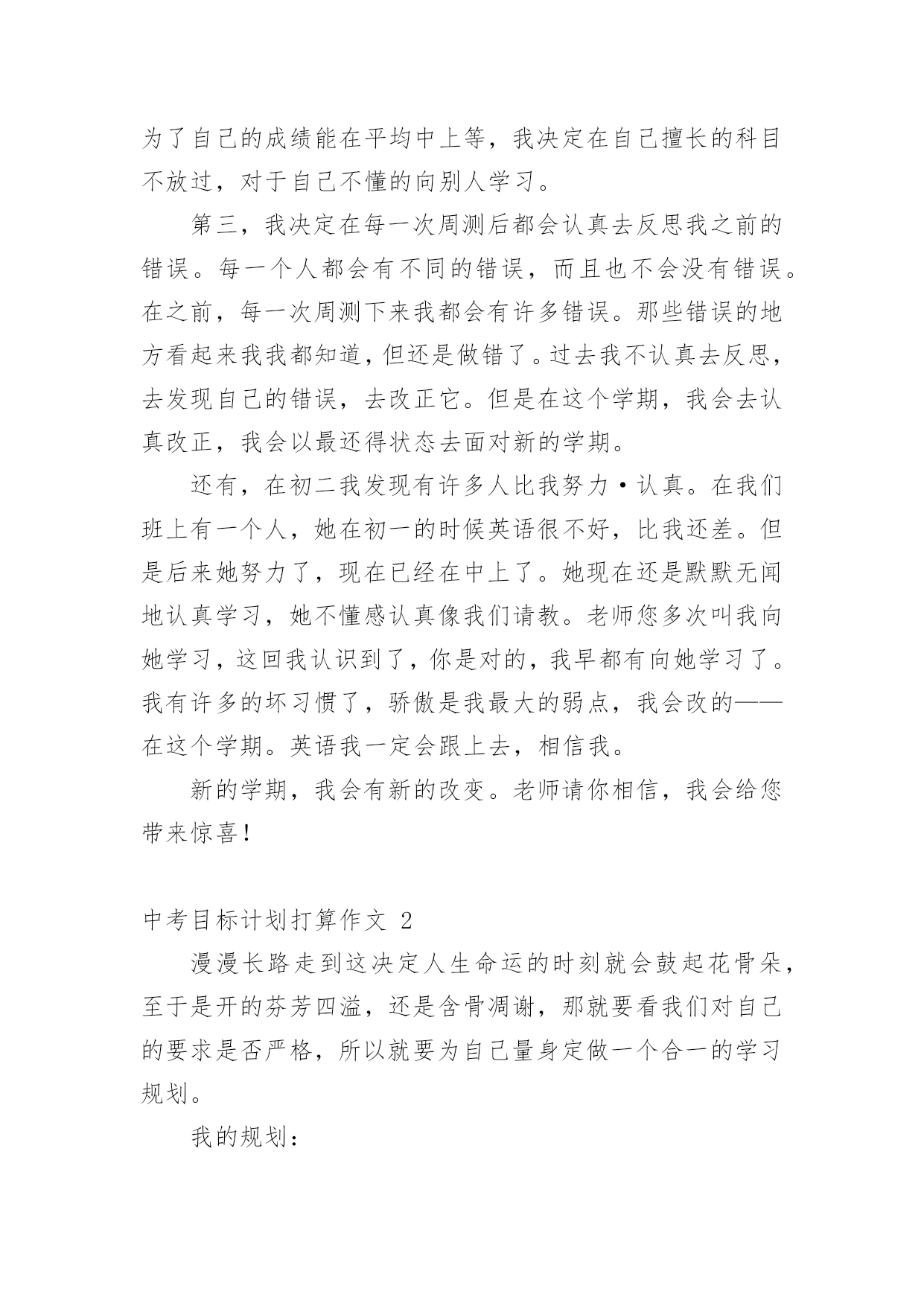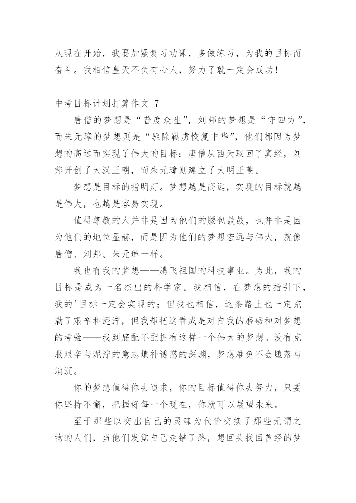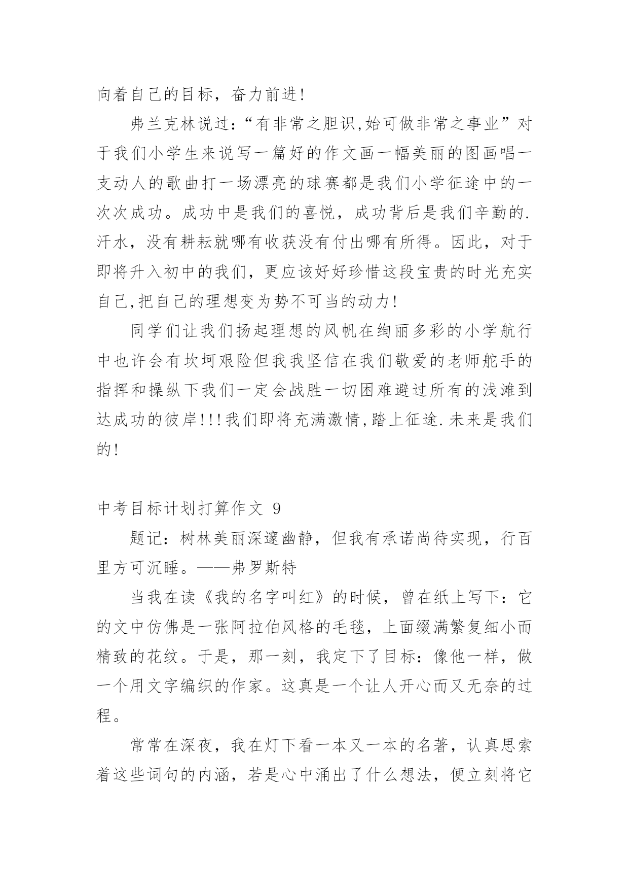 中考目标计划打算作文中考目标计划打算作文(精选15篇)在学习、工作、生活中,大家或多或少都会接触过作文吧,作文是人们把记忆中所存储的有关知识、经验和思想用书面形式表达出来的记叙方式。你所见过的作文是什么样的呢?下面是小编精心整理的中考目标计划打算作文,仅供参考,欢迎大家阅读。中考目标计划打算作文1马上就要开学了,开学后我就是初三的学生了。初三的到来,好像自己马上就要上战场了。自己慢慢地有一点危机感了,害怕同学超越自己。为了能在初三学的好一点,我决定现在就想好新学期的打算。第一,我决定学会放弃。在前两个学期里,我经常去上网、看小说、睡觉,对于老师布置的作业也不认真完成。对于这些流失的时间,我不能挽回,对于初三我一定要把握。初三我要学会放弃,放弃了我也可能失去很多东西。但是我不怕,放弃了会让我更认真点。那些东西以后来做也一样,何必就要现在呢?我对自己说。第二,我决定抓不足。在我的.成绩中是不平均的,分数高的和分数低的相差几十分。之前的两个学期我的思想还不够成熟,想法还比较简单。现在我不之前那想法简单的自己了,我有了自己的目标,自己的想法,我的记忆也更好了。为了自己的成绩能在平均中上等,我决定在自己擅长的科目不放过,对于自己不懂的向别人学习。第三,我决定在每一次周测后都会认真去反思我之前的错误。每一个人都会有不同的错误,而且也不会没有错误。在之前,每一次周测下来我都会有许多错误。那些错误的地方看起来我我都知道,但还是做错了。过去我不认真去反思,去发现自己的错误,去改正它。但是在这个学期,我会去认真改正,我会以最还得状态去面对新的学期。还有,在初二我发现有许多人比我努力·认真。在我们班上有一个人,她在初一的时候英语很不好,比我还差。但是后来她努力了,现在已经在中上了。她现在还是默默无闻地认真学习,她不懂感认真像我们请教。老师您多次叫我向她学习,这回我认识到了,你是对的,我早都有向她学习了。我有许多的坏习惯了,骄傲是我最大的弱点,我会改的——在这个学期。英语我一定会跟上去,相信我。新的学期,我会有新的改变。老师请你相信,我会给您带来惊喜!中考目标计划打算作文2漫漫长路走到这决定人生命运的时刻就会鼓起花骨朵,至于是开的芬芳四溢,还是含骨凋谢,那就要看我们对自己的要求是否严格,所以就要为自己量身定做一个合一的学习规划。我的规划:①初三到了,我们应该把重点放到课本上、课堂里。中考虽然大多数都是课外的,但是处处都有课本上的知识。②从现在开始我决定抓不足,在我的成绩中是不平均的,分数相差很大,所以我从现在就要开始努力。③决定在每一次考试后都反省自己之前犯的错误。我们学校会提前开学,开始接触新的科目——化学,我自己也知道,要在有限的时间里,熟悉这门课程是非常不容易的,需要大量的时间和精力去奋斗。这学期的.到来,我要进行的第一个是复习之前的东西、查缺补漏,拓展提高应对至关重要的期末考试。初中这两年来,最大的改变无疑就是初二下半学期,从这时,我们渐渐接受了中考带来的紧张气氛,也慢慢接受了逐渐增大的压力。在家长和老师的教导中,我们开始明白中考时决定人生的重要关卡。在初三来临之际,为了赶上其他同学的步伐,我们必须笨鸟先飞,追求卓越,所以在这个暑假我们一定要努力,备战中考。现在这个时候,我还在家里奋发图强,希望成绩能够好转。中考目标计划打算作文3在离期末考试不到2个月了,一个学期的尽头也越来越近了。所谓目标,当然就是督促作用,激励作用,给自己信心、力量的口号!为了过一个高兴的年,心安理得的收下压岁钱,考出个好成绩吧!上次考试都还不错。so,这次——期末大战,无论如何,至少也得保持吧!数学:115,我觉得期中考试考得太差,只考了114,既不是我喜欢的数字,也不是我喜欢的分数,想想就觉得失败。这半学期数学比上半学期难度提高了不少,但是我会努力达到的,甚至更好。英语:115,英语上课记的许多重点是要掌握的,此外,练一练,背一背,读一读,记一记,再把字写好点,就差不多ok了!语文:100,语文的话就没什么大问题,相对来说还不算是我的弱项。关键是作文,吸取了上次的教训,期末考试我一定不会纵容自己犯同样的错误。物理:90,这是我到现在觉得最难的.一门课。有时候简直是在听天书,不过,我相信勤奋也可以造就天才。政治:90,历史:90,地理:90,生物:90,总分:780针对期末考试,我不能说自己是“胸有成竹”,虽然我不会因为考试而紧张的吃不下饭,睡不着觉,但是我也不会轻视它,我会重视它,把它当成自己的一个敌人,用自己的全力把它打倒。中考目标计划打算作文4新学期到来,我们应该有新的小目标,鼓励并且激励着自己。试问:上个学期的小目标,你完成了吗?我们开始为新的学期定一个目标吧。定目标是为了我们能更好的分清自己需要改掉什么,去加强什么。为了能更好地发展完善自己,自己弱的一项要